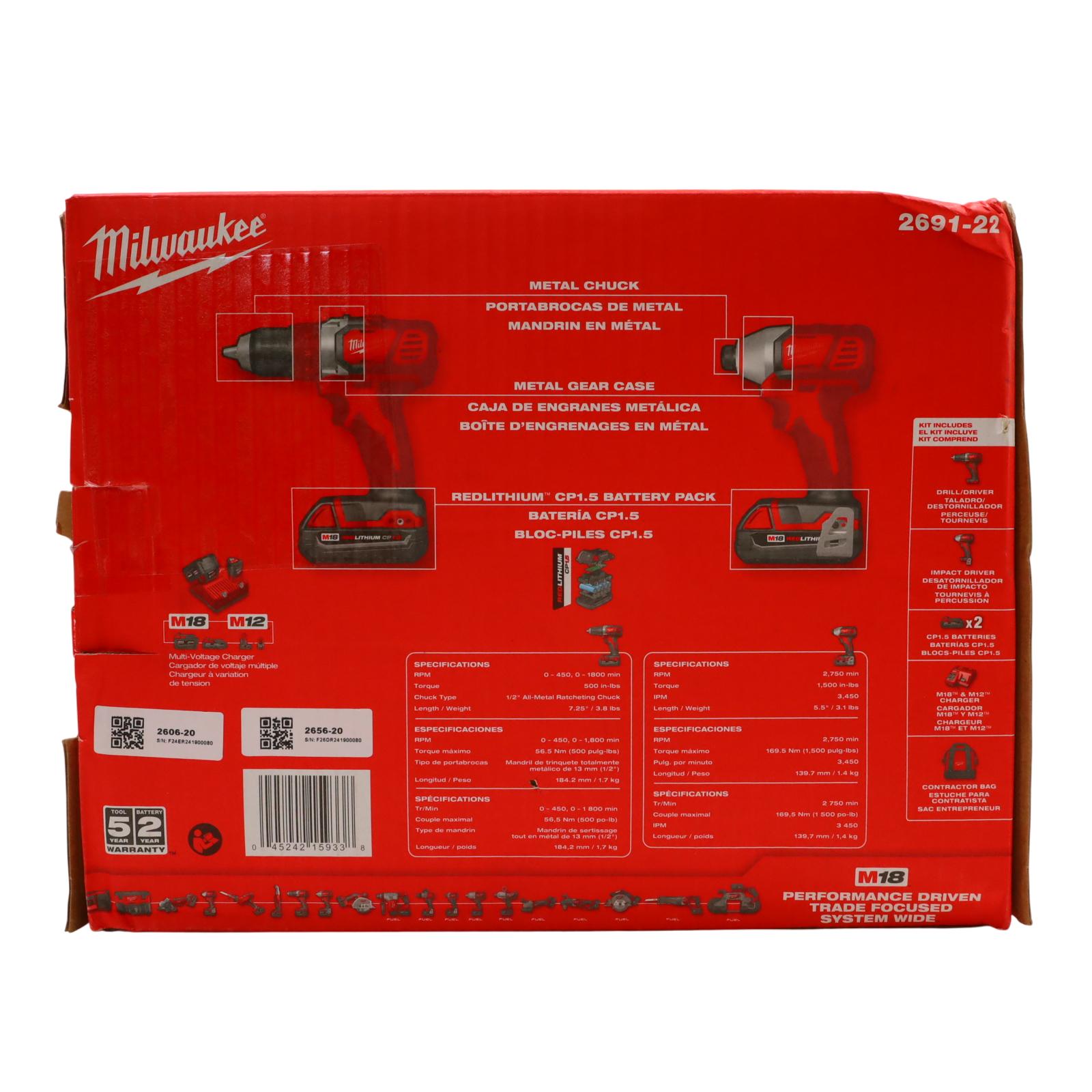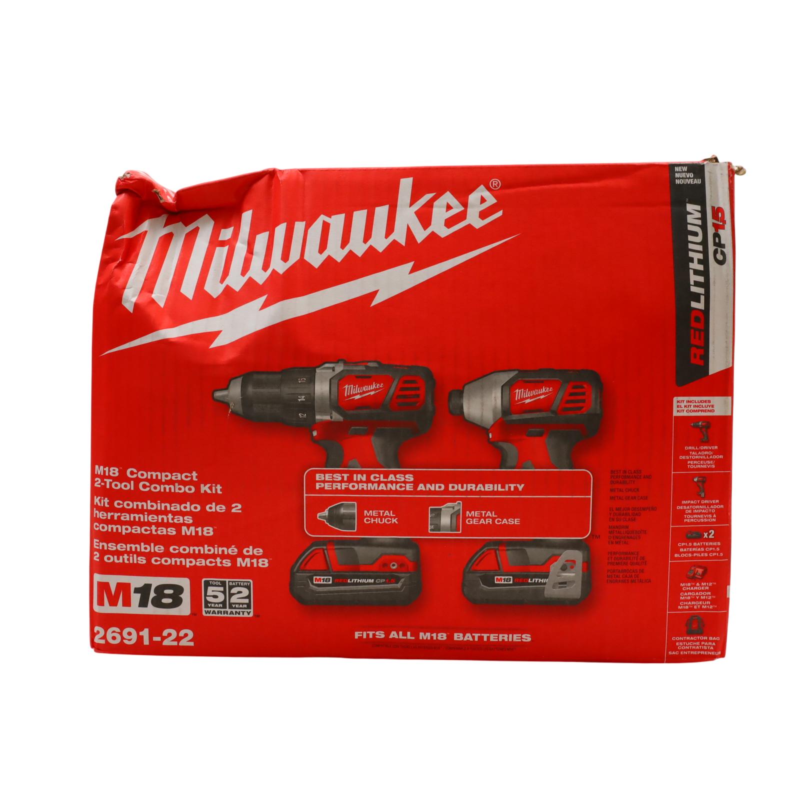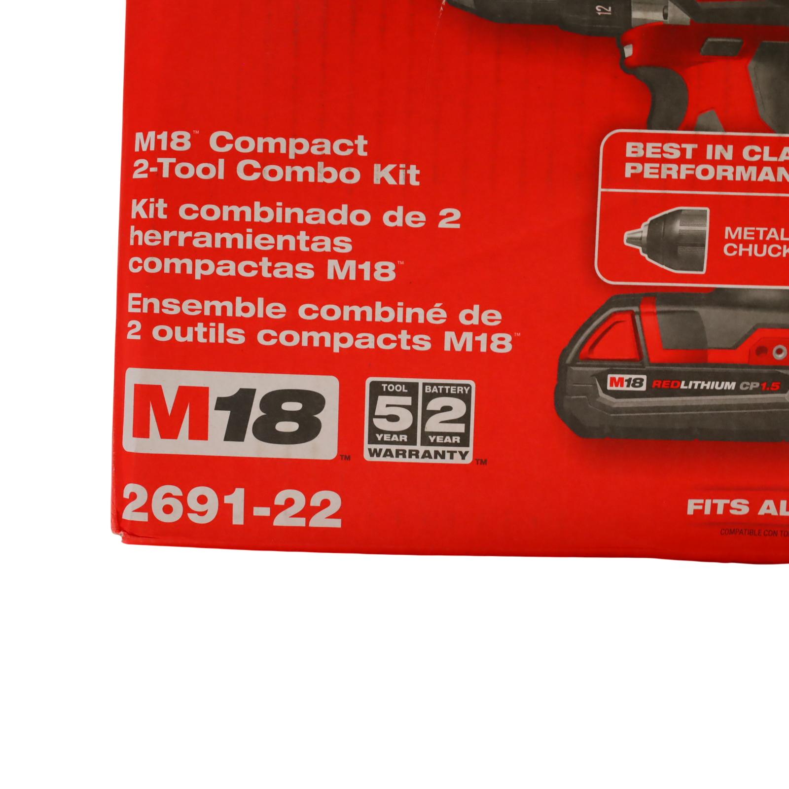 Includes the M18 Compact Drill/Driver (2606-20) and the M18 1/4 in. Hex Impact Driver (2656-20), designed to deliver an efficient blend of power, weight, and performance. The 1/2 in. drill/driver offers 500 in./lbs. of torque and variable speeds of 0-400 RPM and 0-1800 RPM, while the 1/4 in. hex impact driver achieves up to 2,750 RPM, 3,450 IPM, and 1,500 in./lbs. of torque.