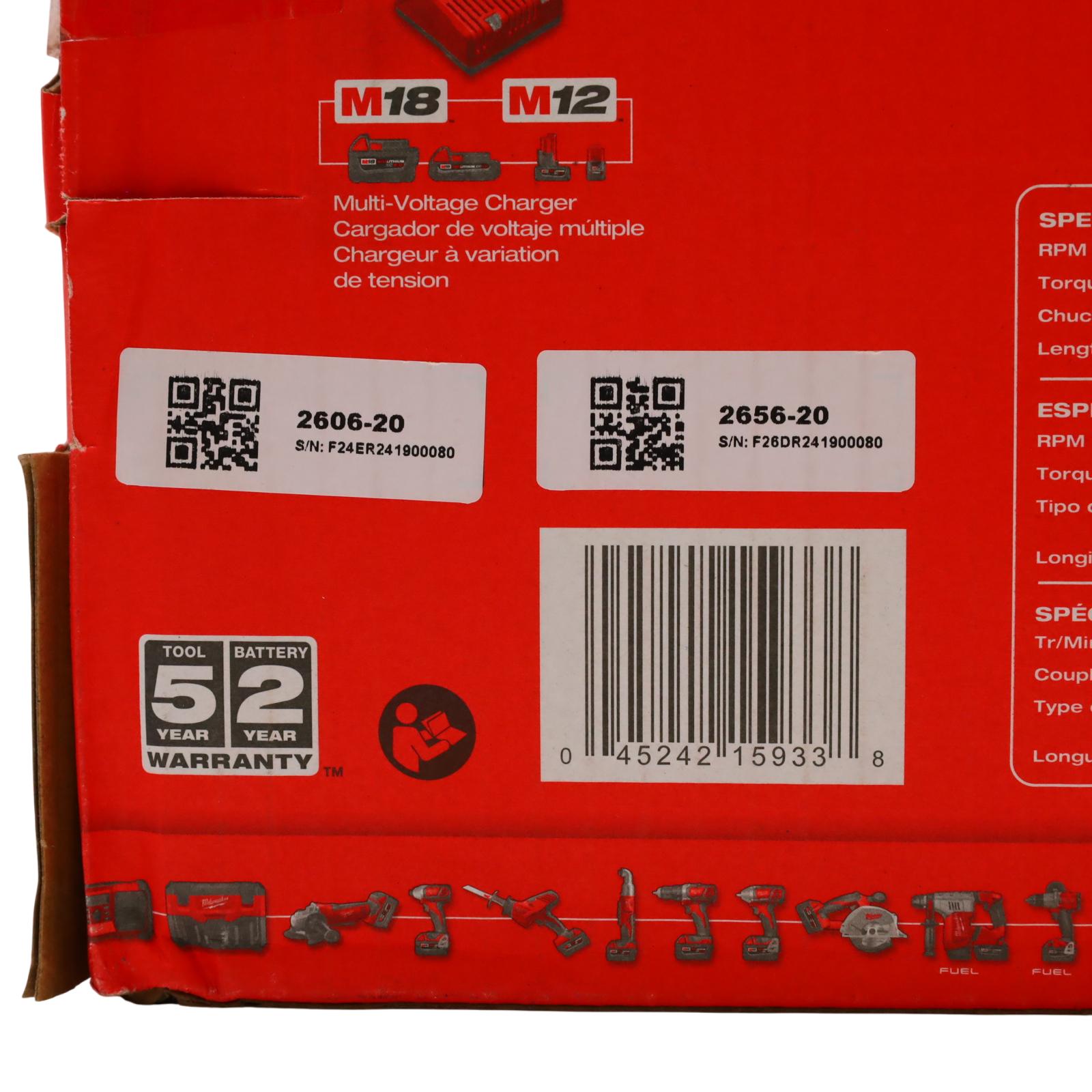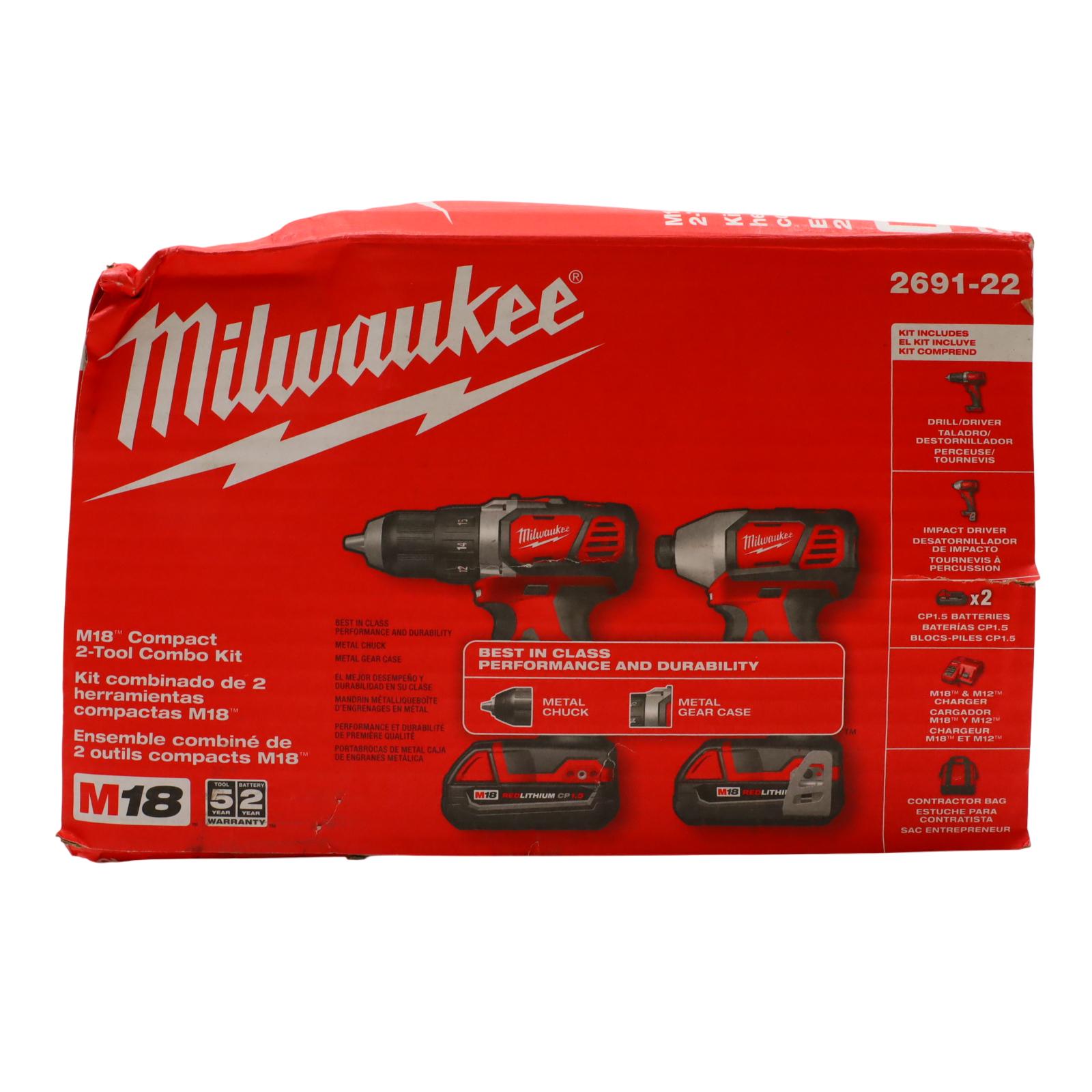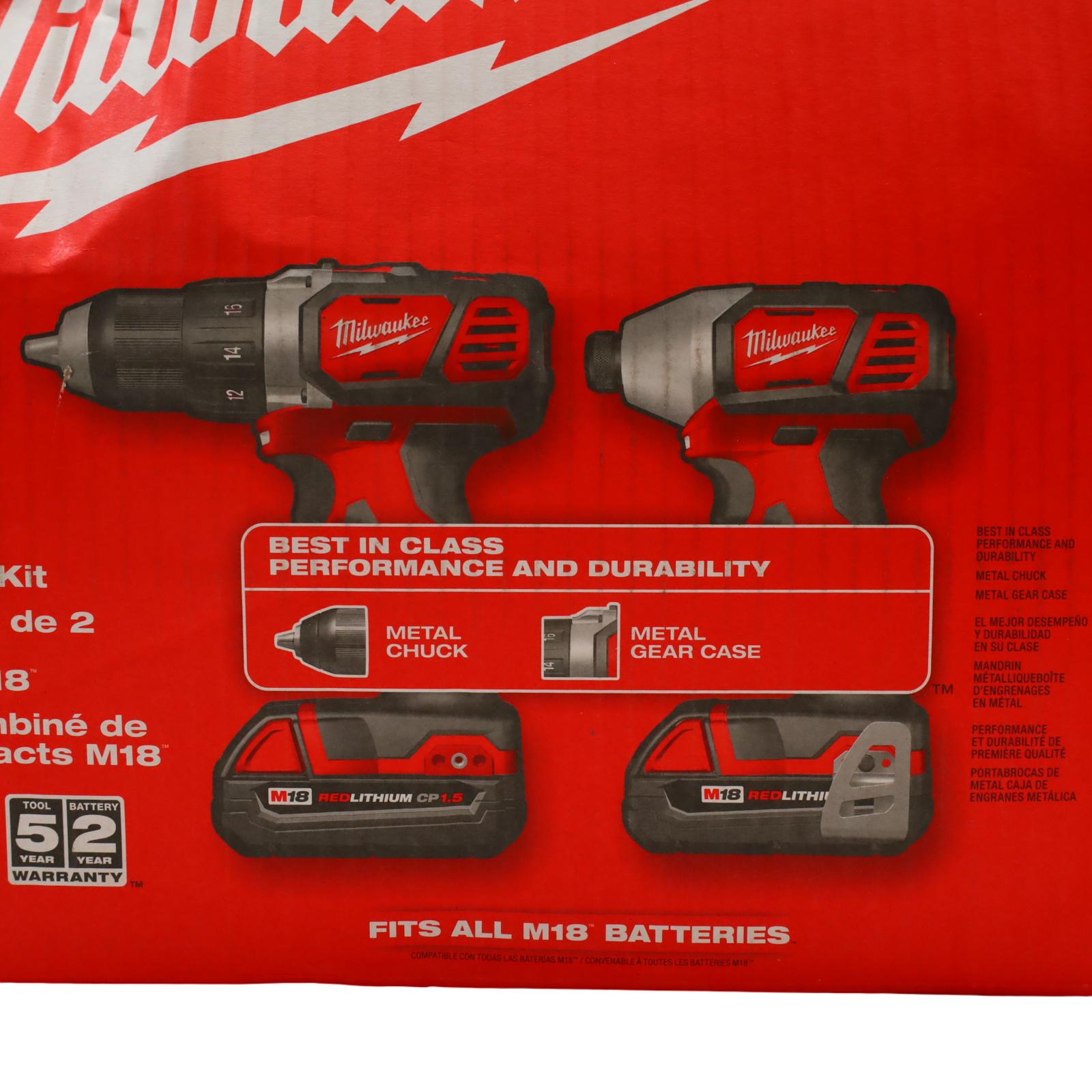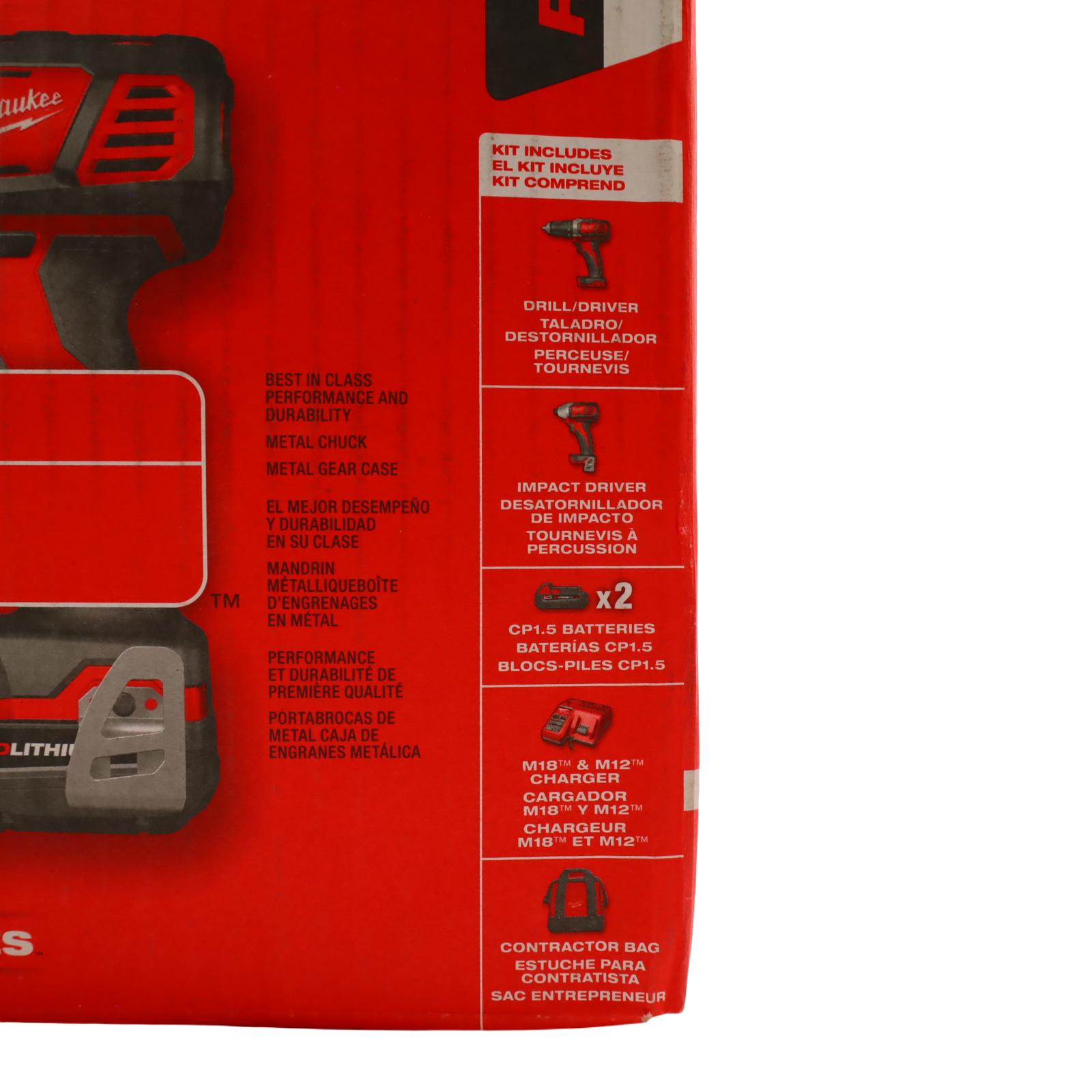 Includes the M18 Compact Drill/Driver (2606-20) and the M18 1/4 in. Hex Impact Driver (2656-20), designed to deliver an efficient blend of power, weight, and performance. The 1/2 in. drill/driver offers 500 in./lbs. of torque and variable speeds of 0-400 RPM and 0-1800 RPM, while the 1/4 in. hex impact driver achieves up to 2,750 RPM, 3,450 IPM, and 1,500 in./lbs. of torque.