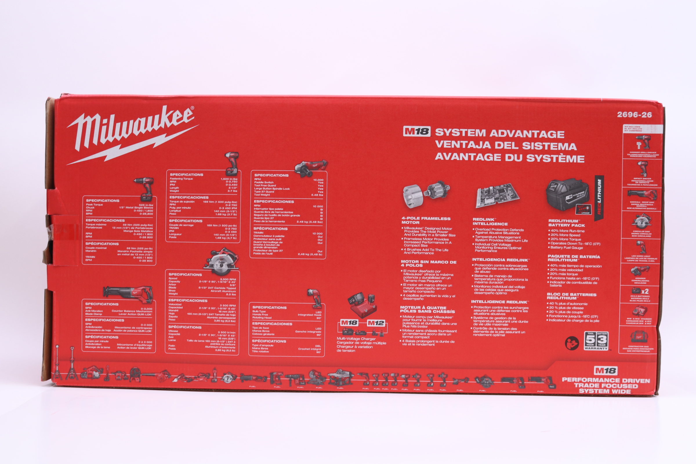 Has all the tools you need to tackle a wide range of drilling, driving, cutting and grinding applications. Featuring patented technologies and electronics, an innovative motor design and superior ergonomics, these tools give you the power, weight and performance to tackle whatever you throw at them. Powered by REDLITHIUM for greater torque and longer run time, this set is durably made to withstand the toughest jobsite wear and tear for years of reliable use.