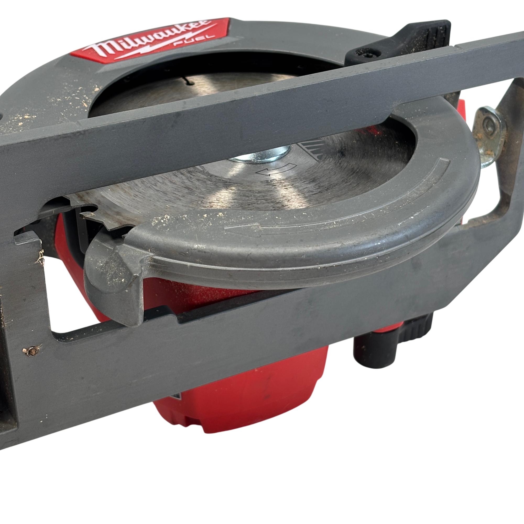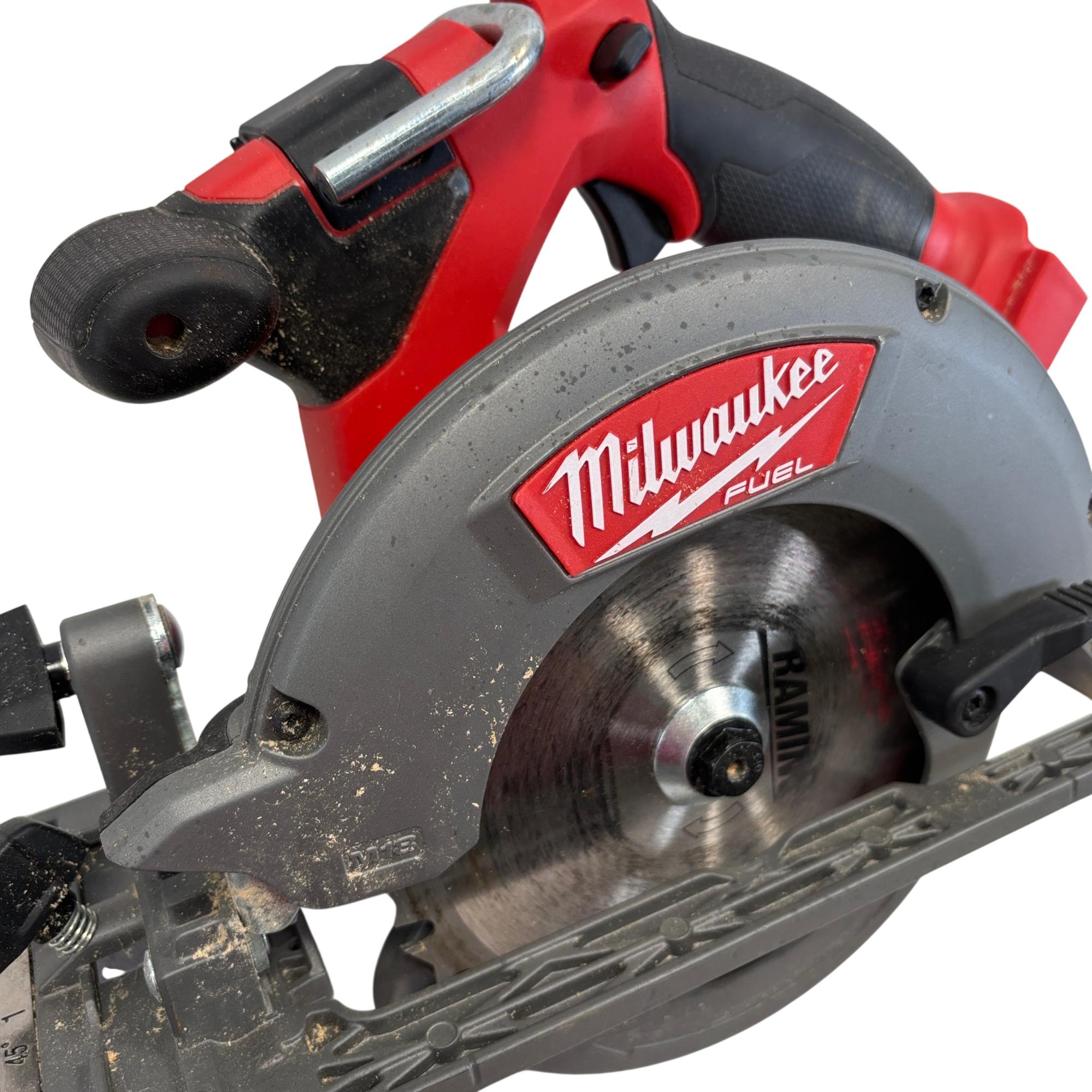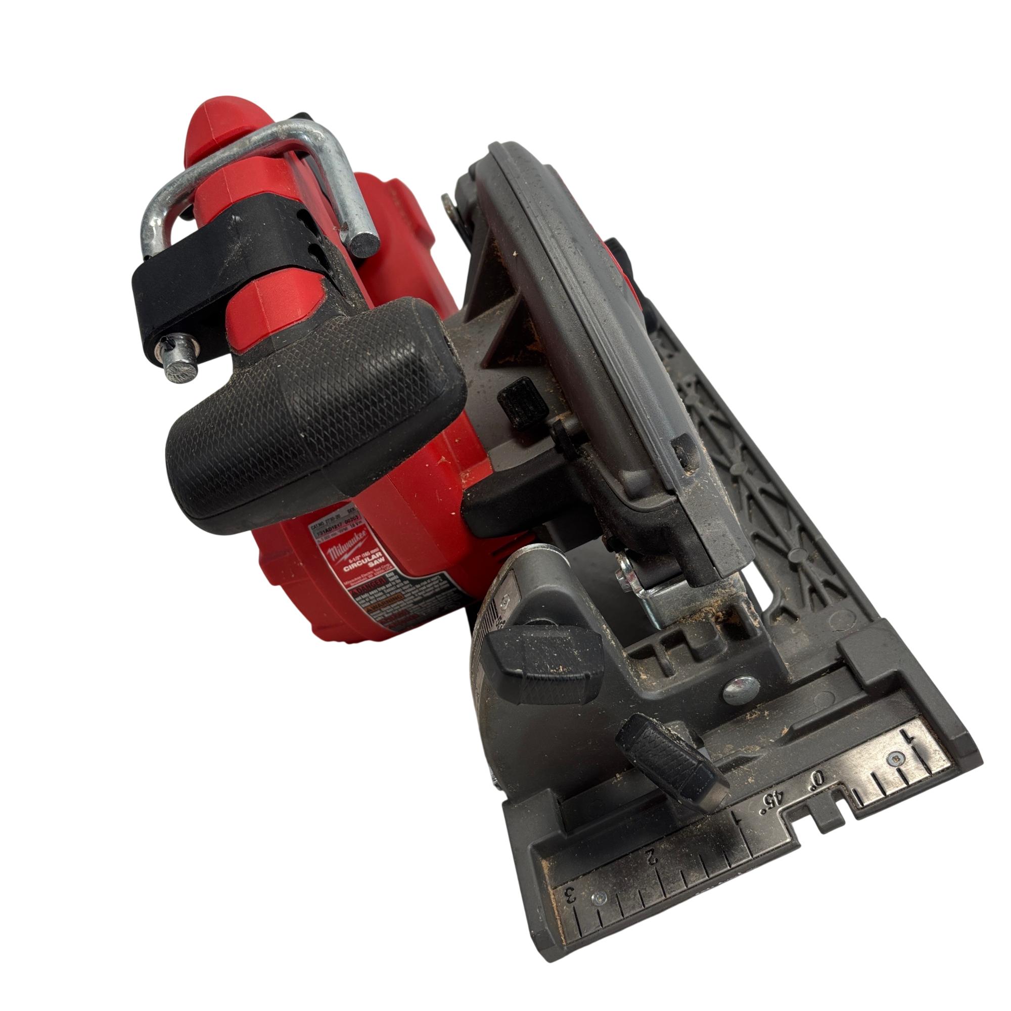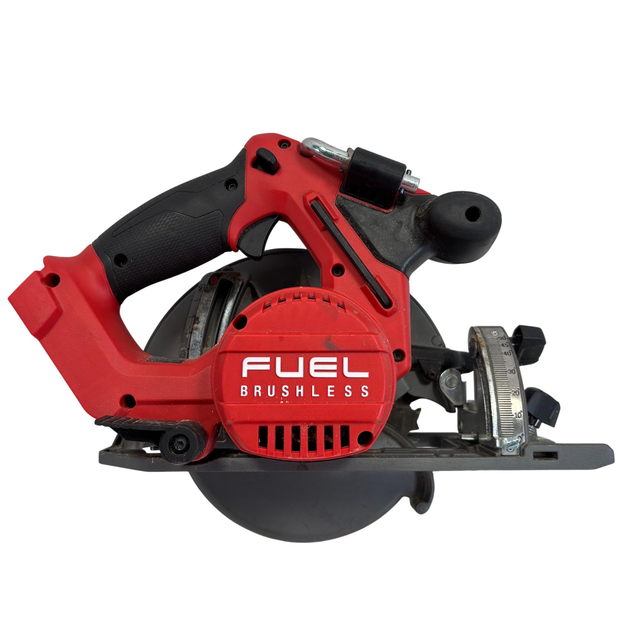Milwaukee M18 FUEL 2730-20 6-1/2 inch Brushless Cordless Circular Saw features a powerful brushless motor designed to deliver high performance and longer tool life. Its ergonomic design with a red and black handle provides comfortable handling and precise cutting for various woodworking and construction applications.