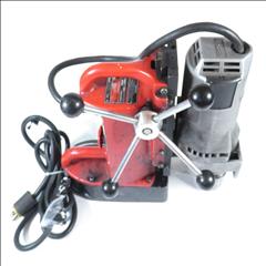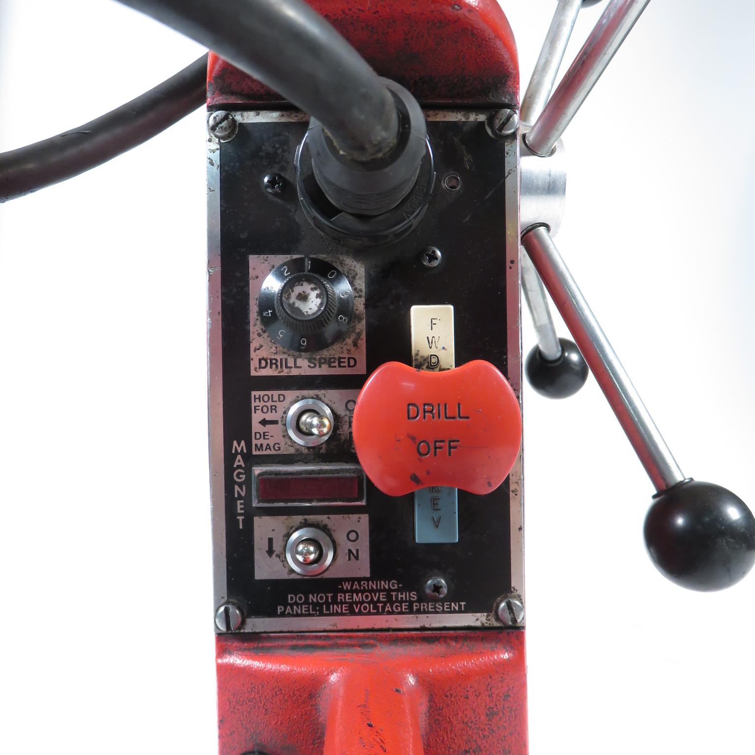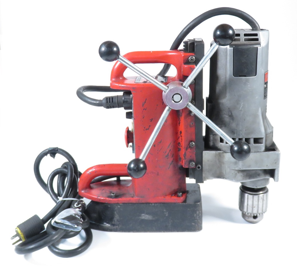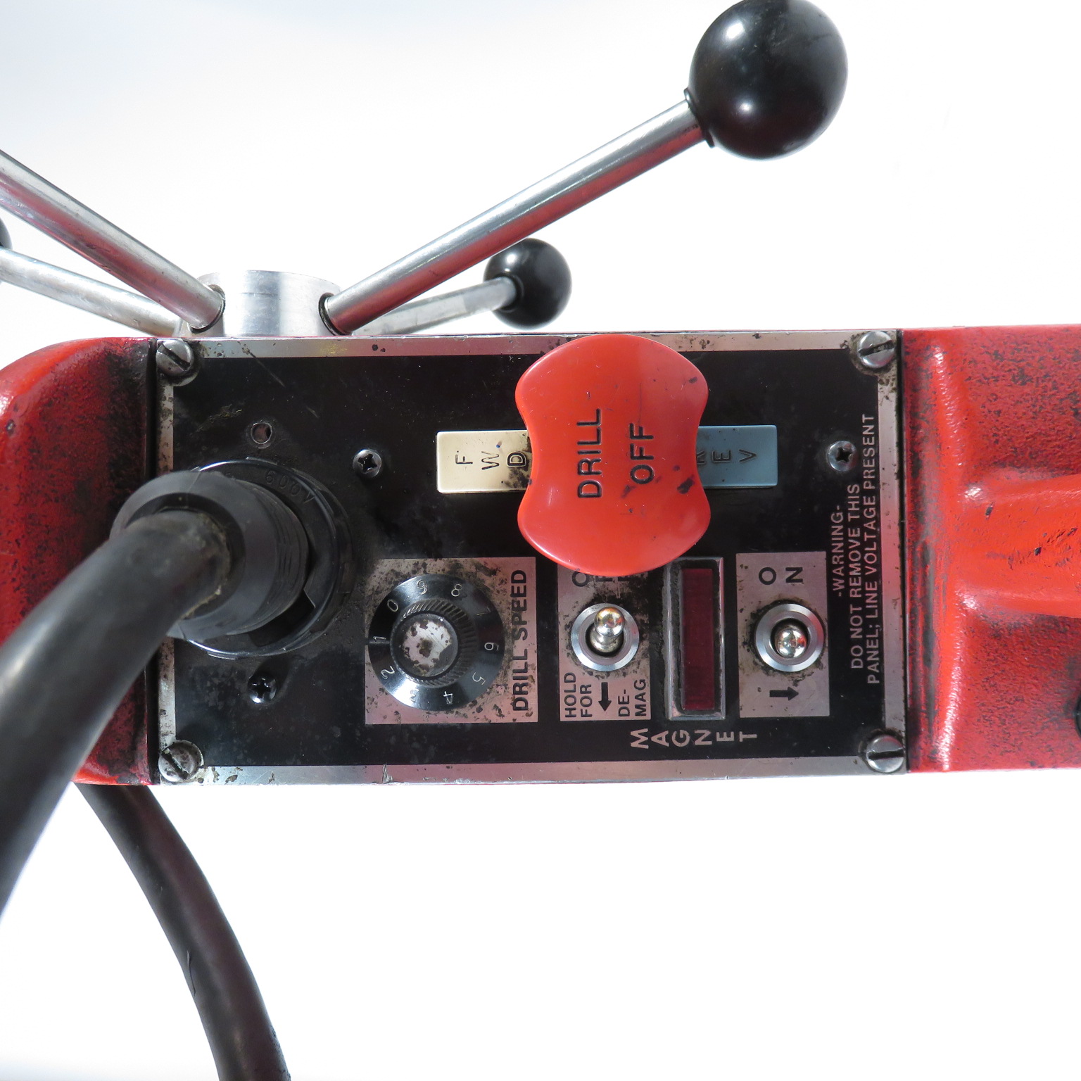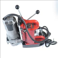 The 4202 electromagnetic variable speed base features solid state electronic switching and a 9 in. drill travel. Feedback speed control maintains speed and a motor/magnet lockout prevents de-mag during operation. For use on any flat ferrous material, 1/2 in. and thicker.