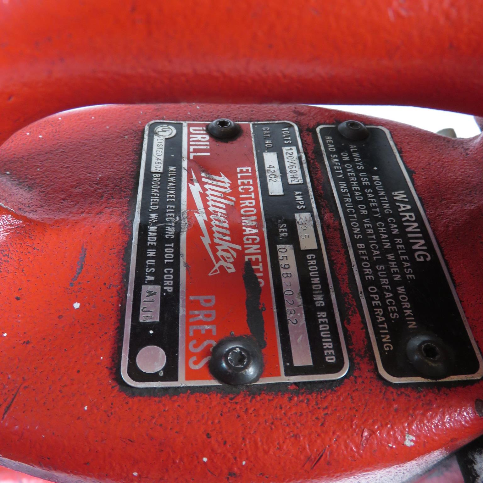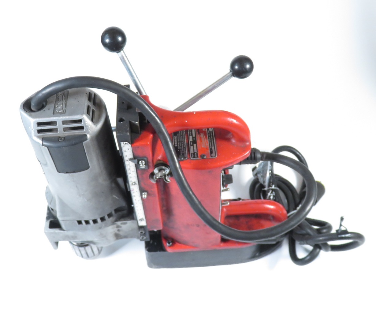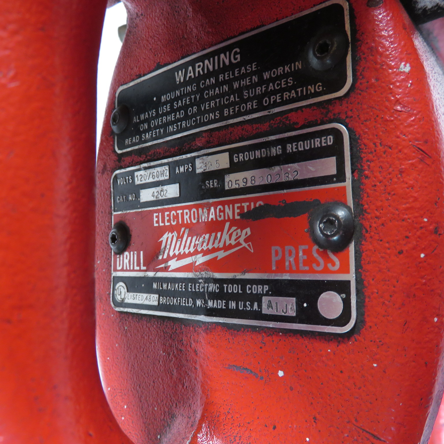 The 4202 electromagnetic variable speed base features solid state electronic switching and a 9 in. drill travel. Feedback speed control maintains speed and a motor/magnet lockout prevents de-mag during operation. For use on any flat ferrous material, 1/2 in. and thicker.
