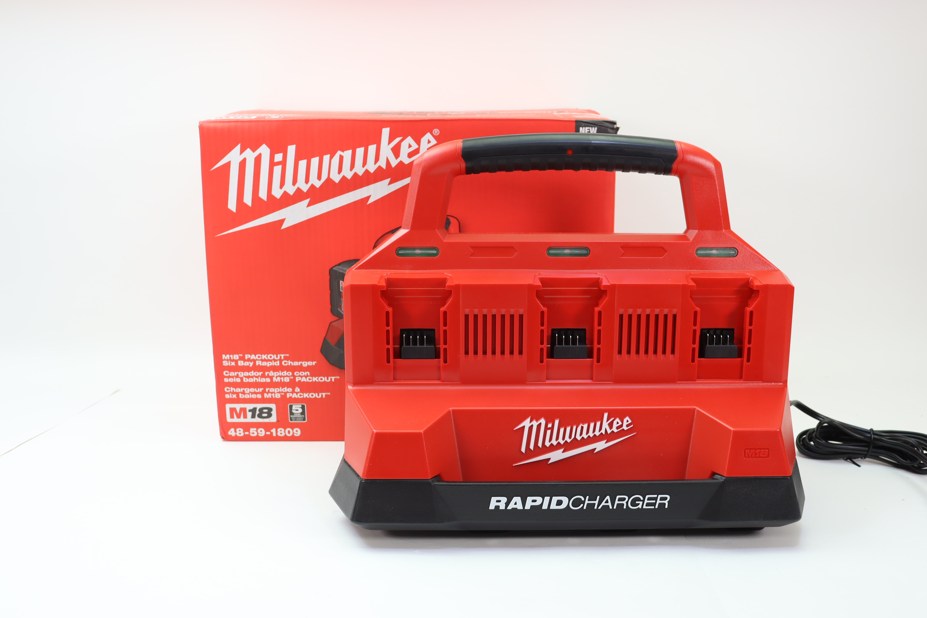 The MILWAUKEE M18 PACKOUT Six Bay RAPID Charger is the first dedicated charging solution compatible with MILWAUKEE PACKOUT modular storage system. This Six Bay RAPID Charger charges two batteries simultaneously, up to 40% faster than other Milwaukee Tool standard rate chargers. Manage six batteries and consolidate your charging experience. Spend less time swapping batteries on the jobsite. This battery charger is optimized for transportation and storage on and off the jobsite. Integrate this charger into your PACKOUTâ„¢ modular storage system, and experience unmatched charging portability. Bring this charger with you, either on your PACKOUT stack or by utilizing the convenient carrying handle. The Milwaukee M18 PACKOUT Six Bay RAPID Charger includes (1) USB-A port, allowing users to charge small personal electronics such as phones, tablets, and headlights. Store your personal electronics on either side of the charger with storage caddies. The M18 PACKOUT Six Bay RAPID Charger provides users with REDUCED DOWNTIME, & UNMATCHED PORTABILITY.