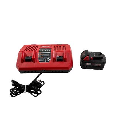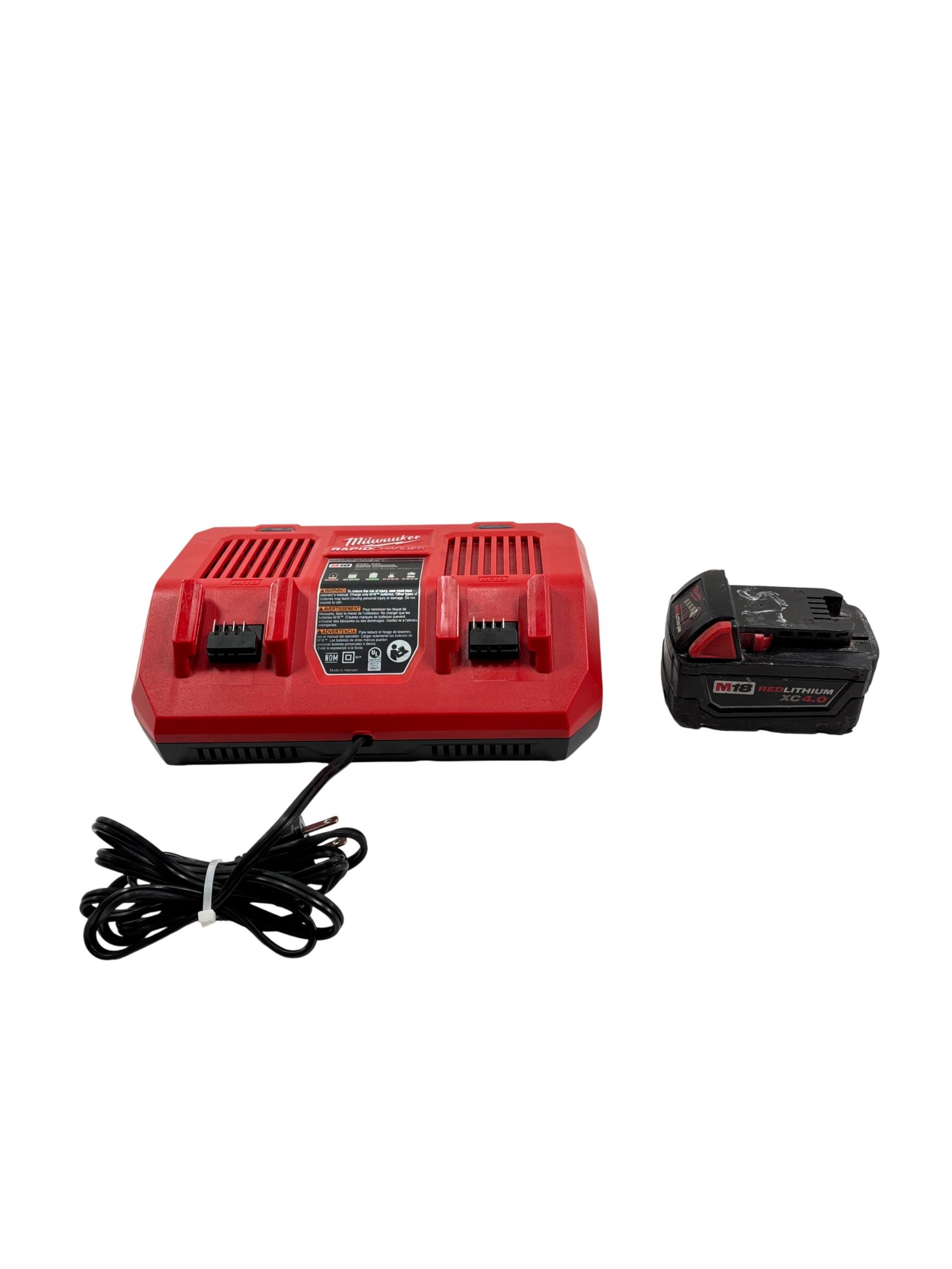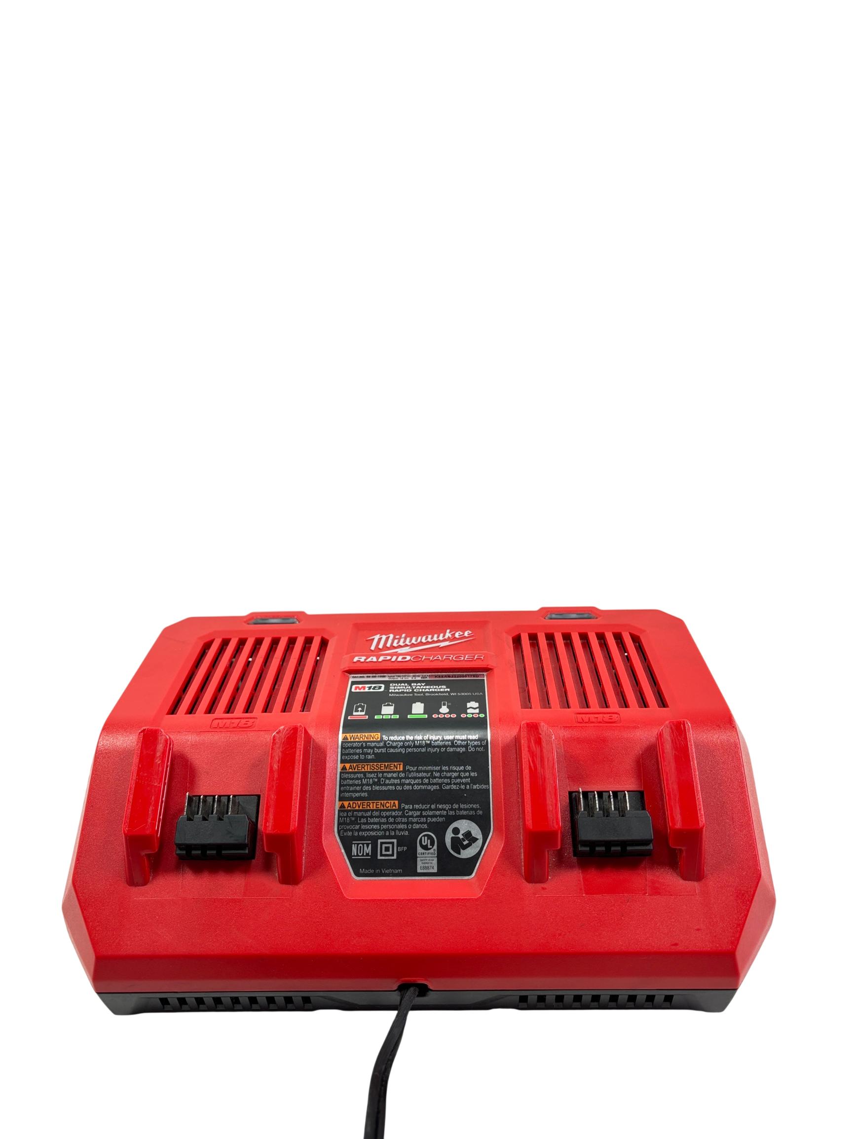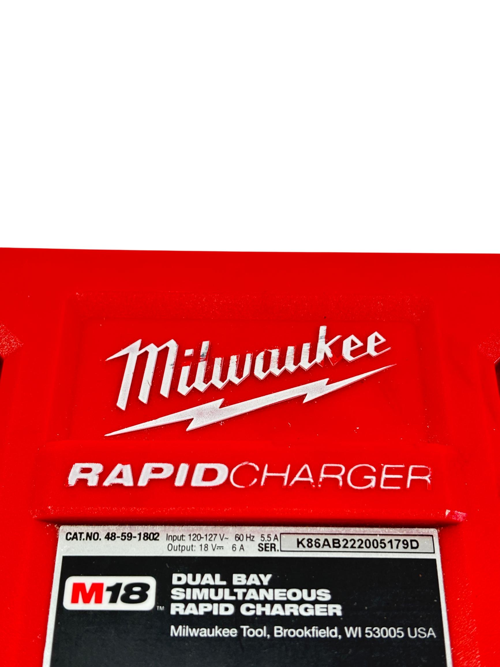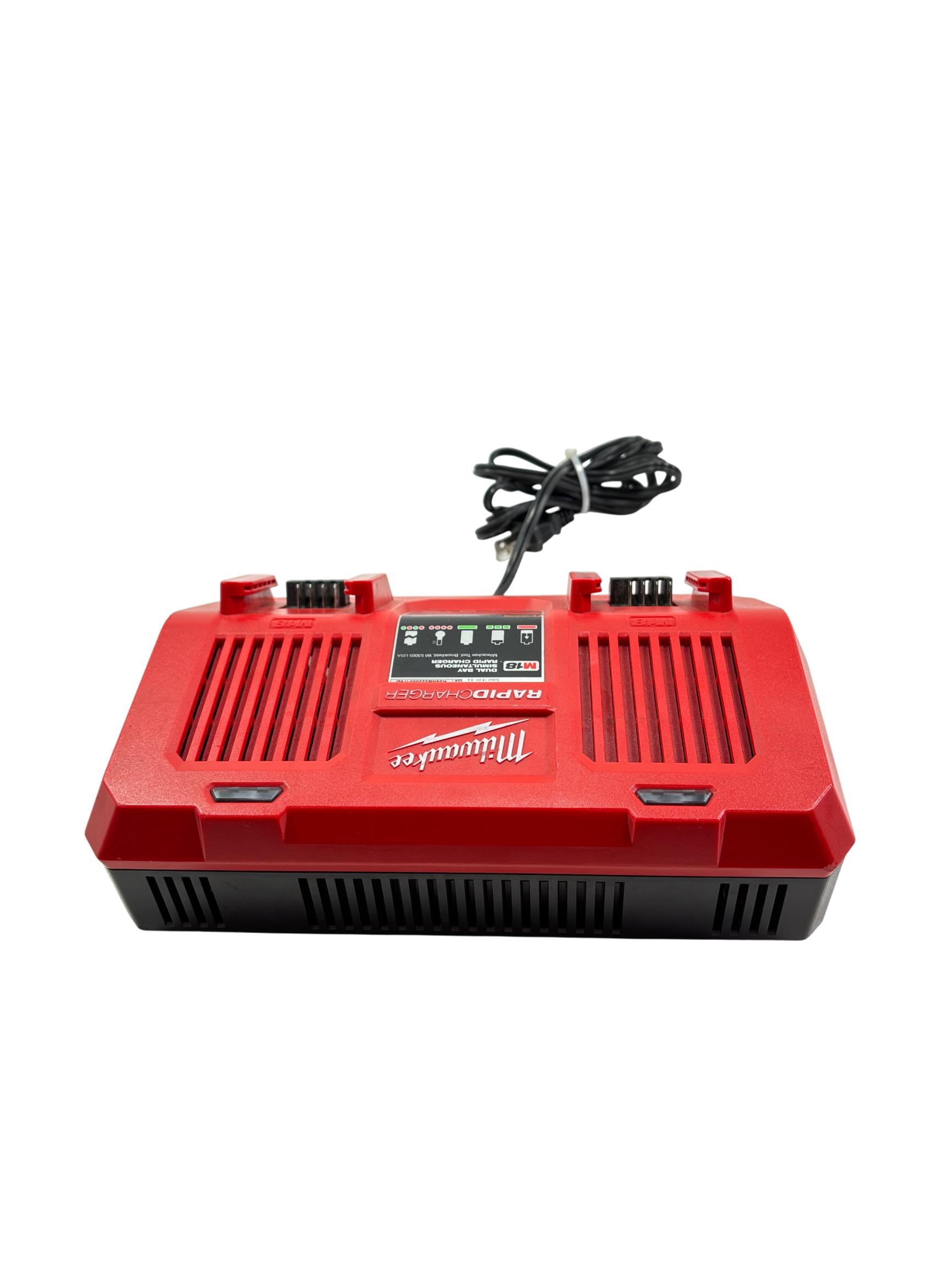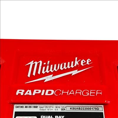 Milwaukee M18 48-59-1802 Dual Bay Rapid Battery Charger with M18 REDLITHIUM XC 4.0 Ah Battery offers fast and efficient charging for M18 lithium-ion batteries. Designed with dual bay capability, it enables simultaneous charging of two batteries, optimizing workflow for power tools. The charger features a rugged red and black design built for durability on job sites.