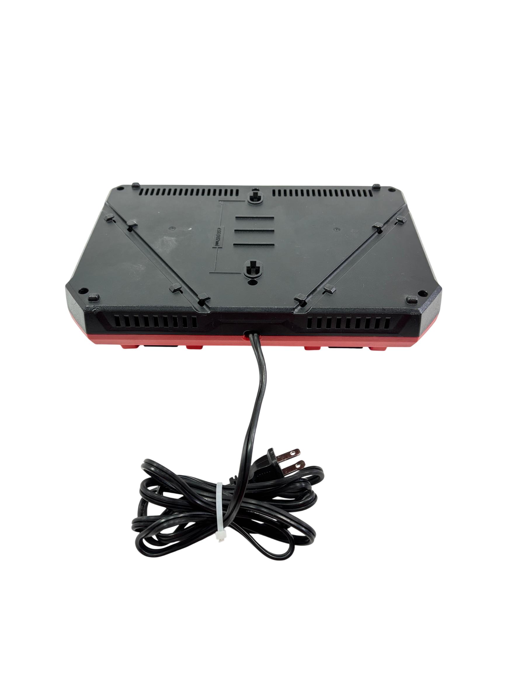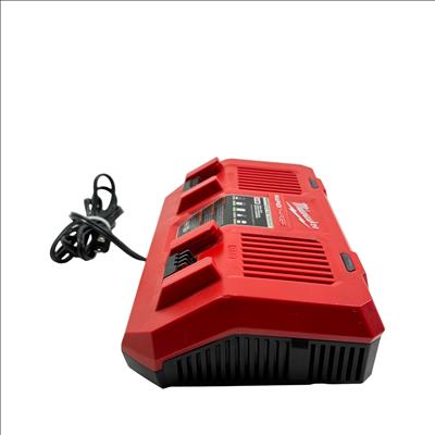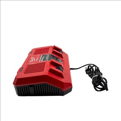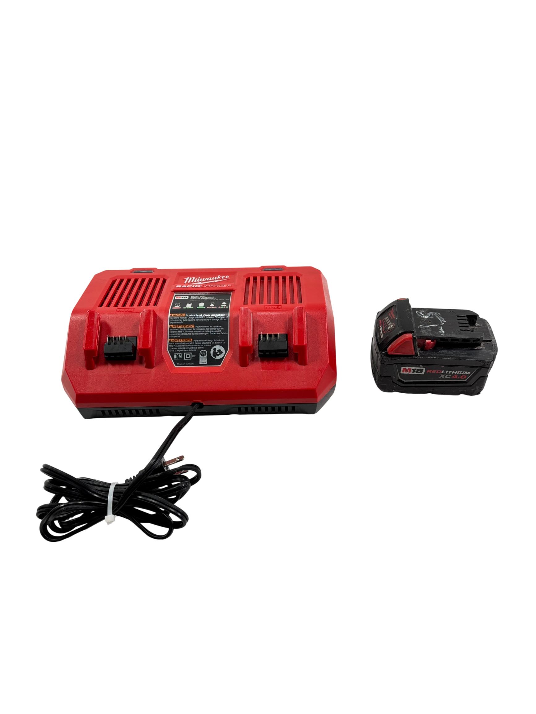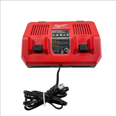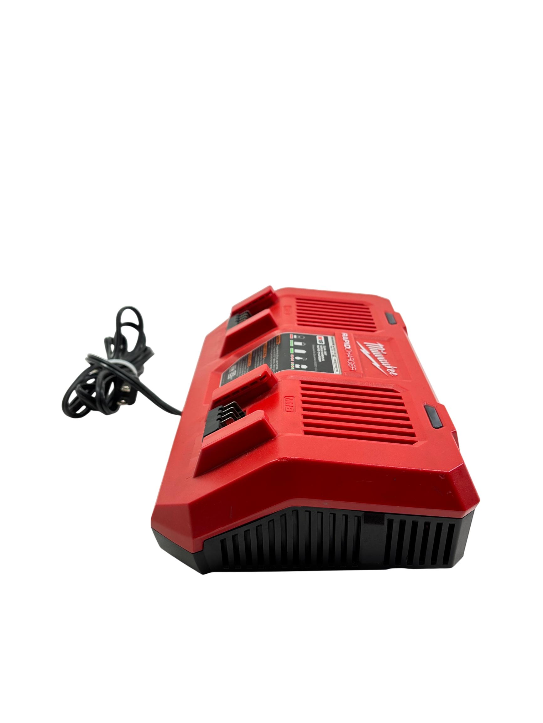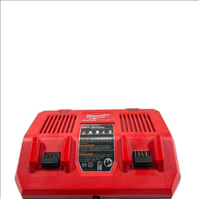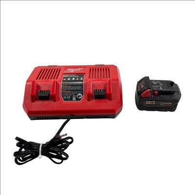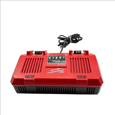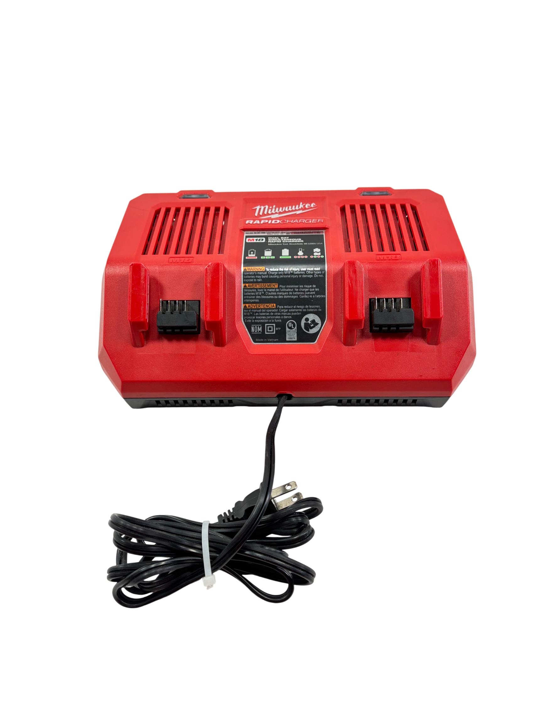 Milwaukee M18 48-59-1802 Dual Bay Rapid Battery Charger with M18 REDLITHIUM XC 4.0 Ah Battery offers fast and efficient charging for M18 lithium-ion batteries. Designed with dual bay capability, it enables simultaneous charging of two batteries, optimizing workflow for power tools. The charger features a rugged red and black design built for durability on job sites.