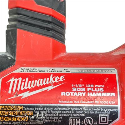 Milwaukee 5268-21 1-1/8" SDS-Plus Rotary Hammer Drill is a powerful corded electric tool designed for heavy-duty drilling and chiseling in concrete and masonry. Featuring an 8-amp motor, this rotary hammer delivers high impact energy for efficient drilling with an SDS-Plus chuck system that allows quick bit changes. Its robust construction and ergonomic design make it suitable for professional construction and renovation projects.