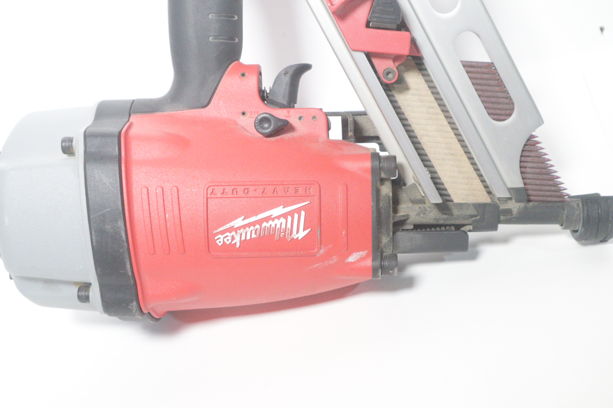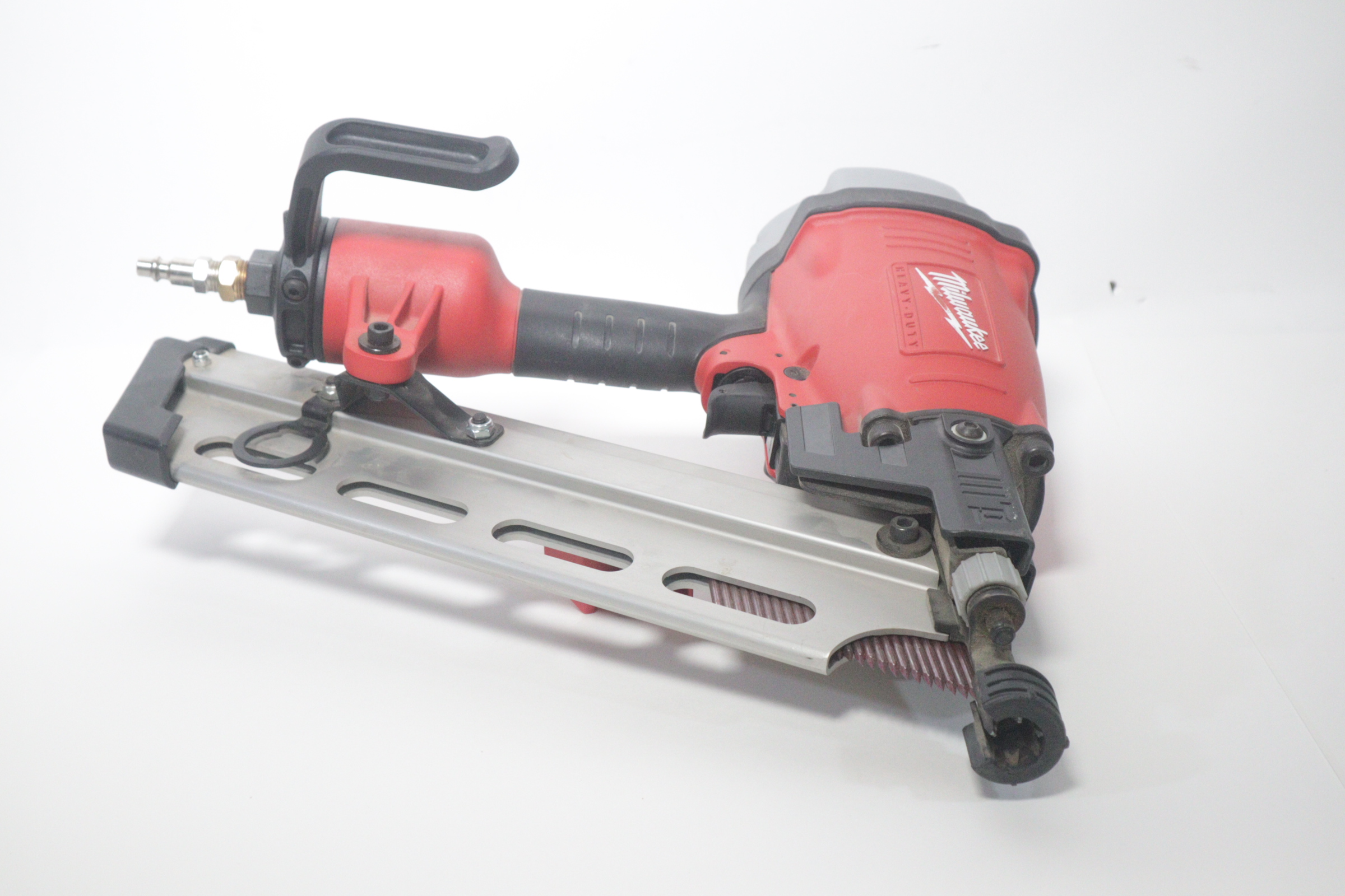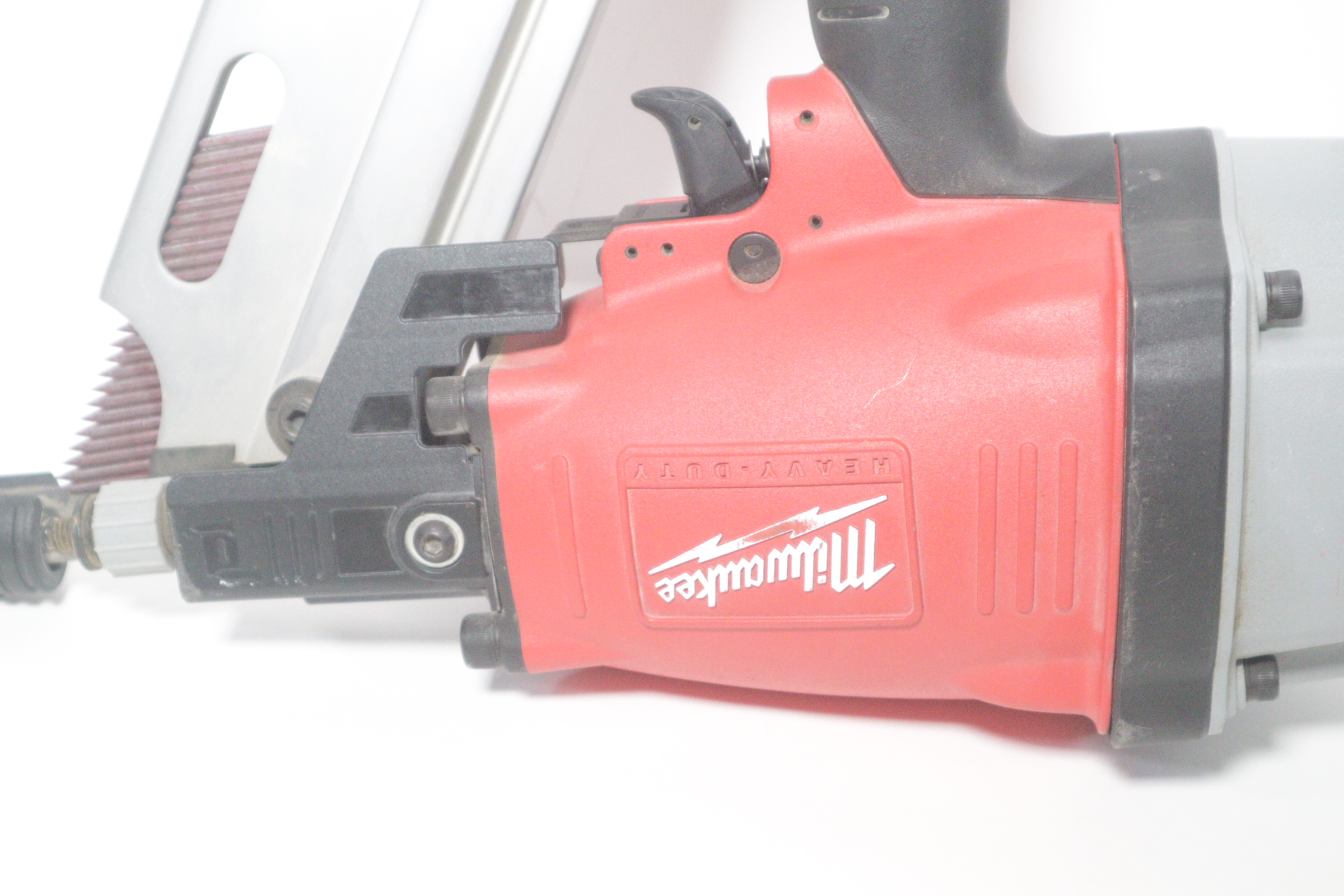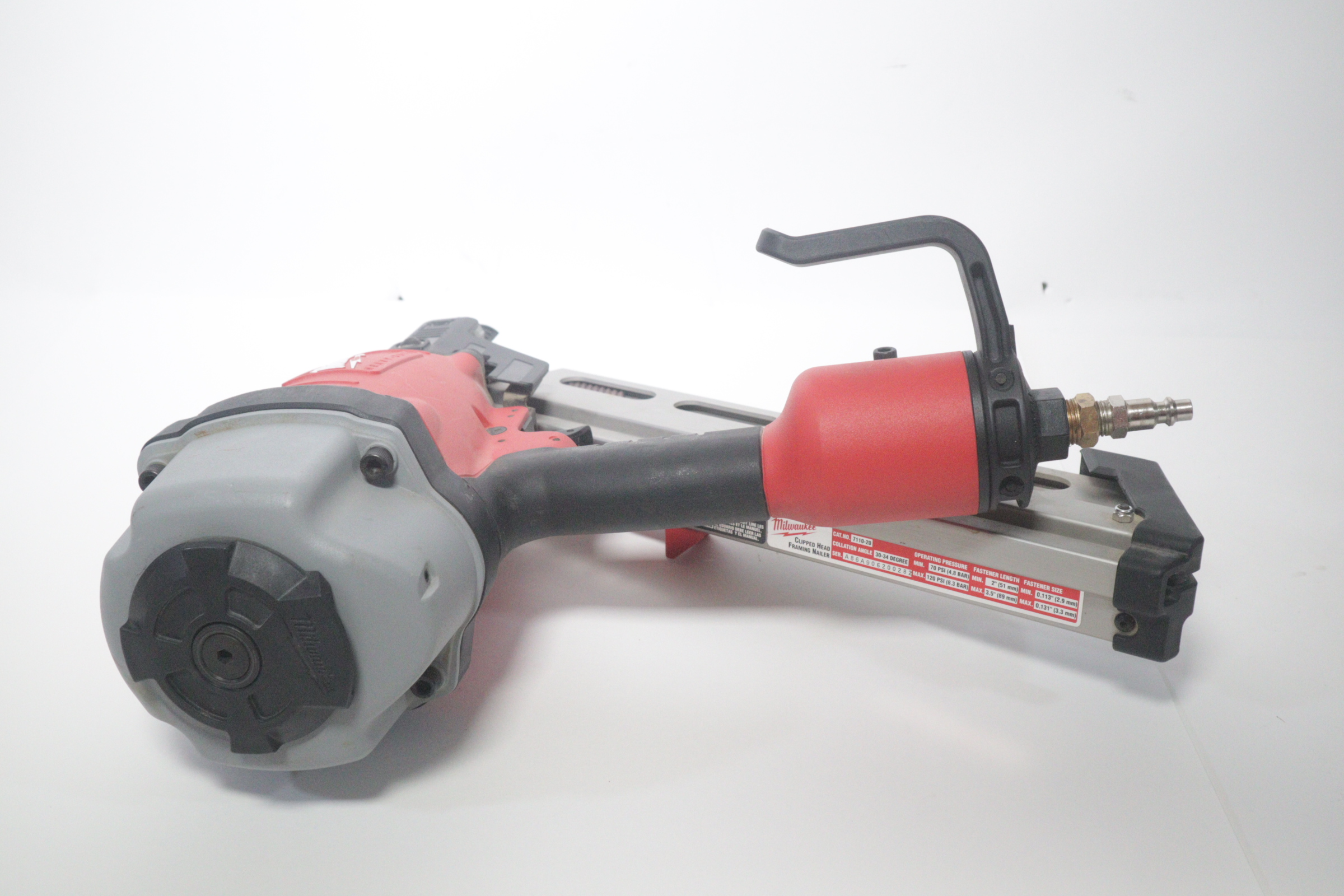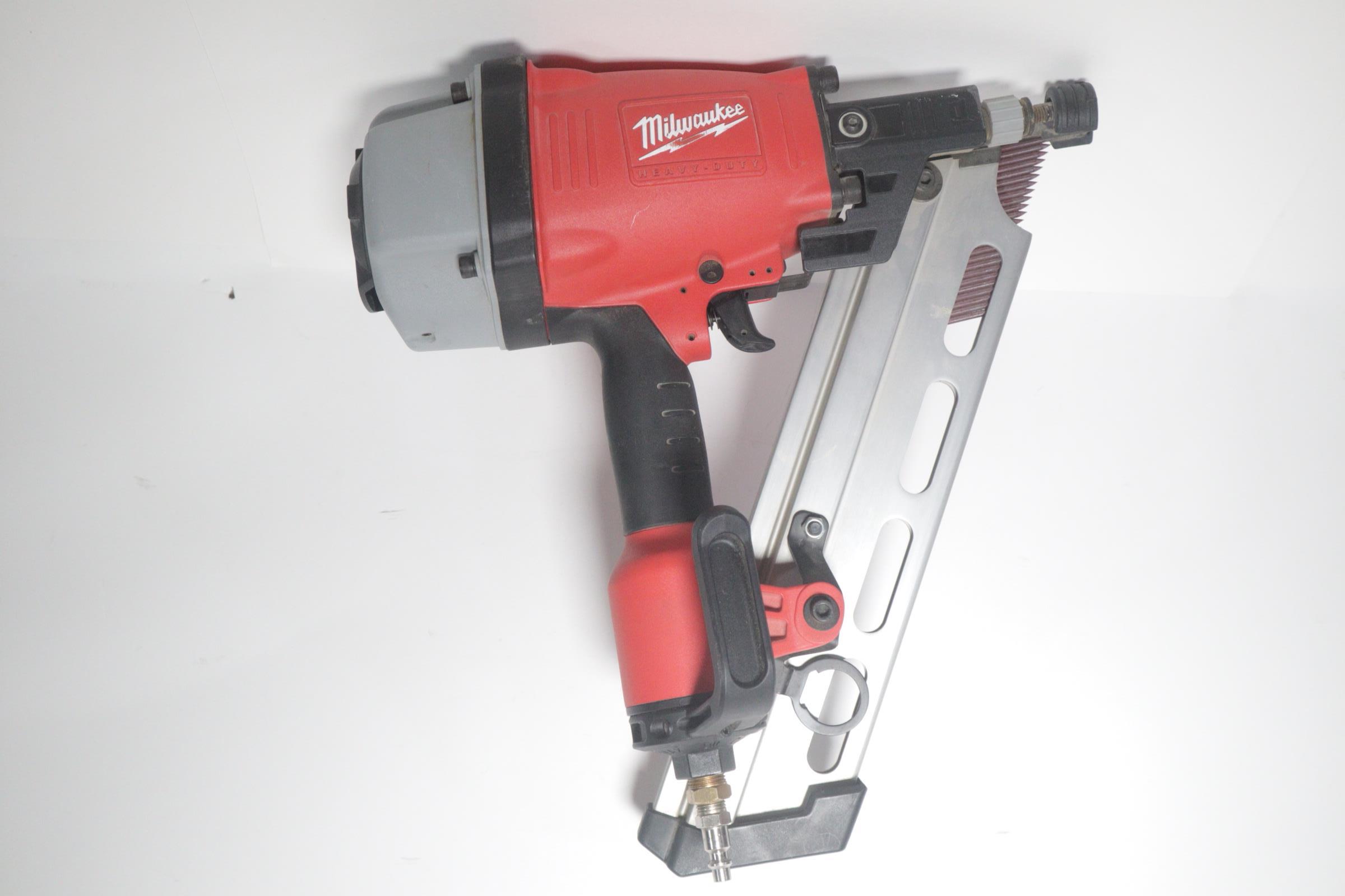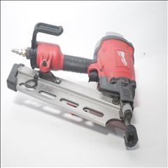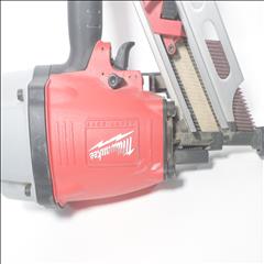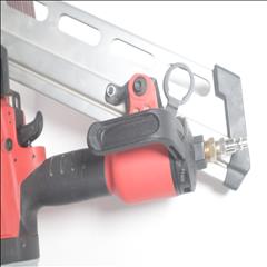 Utilizing an all-magnesium housing, Milwaukee’s 3-1/2” Full Round Head Framing nailer loads 20-22° full round head plastic collated nails 2” to 3-1/2” in length diameters .113” to .148”. Its easy select trigger lets you move quickly from single nail placement to contact actuation for maximum control and application versatility. The easy read and tool free depth of drive lets you quickly adjust the depth setting without having to reset the airline pressure. The self-cleaning air filter extends life and prevents dirt and debris from entering the tool. The adjustable air deflector with muffler directs exhaust away from the work area. A reload indicator lets you reload before firing blanks. The rear-loading magazine with bypass pusher allows smooth and fast reloads. The adjustable rafter hook allows for hanging of the tool in multiple positions and is removable.