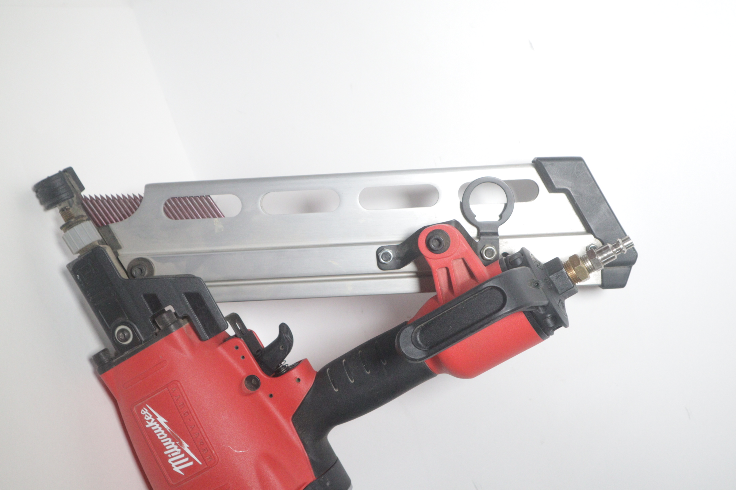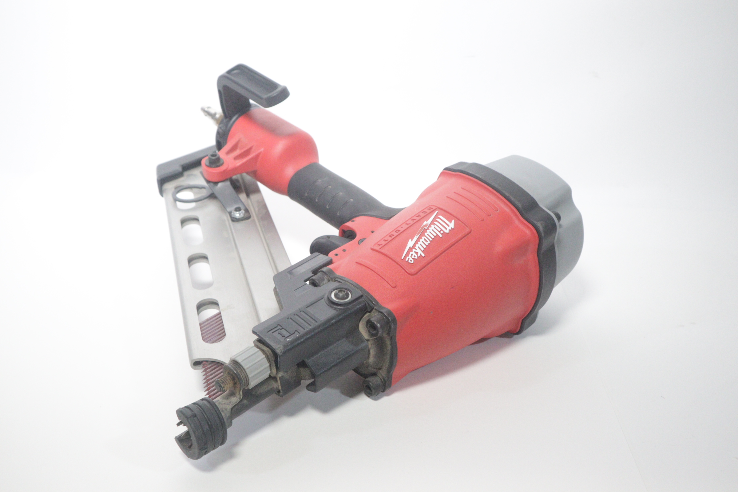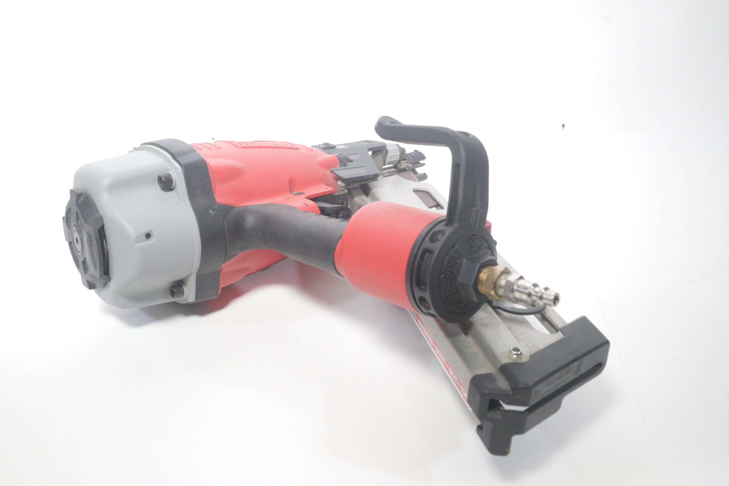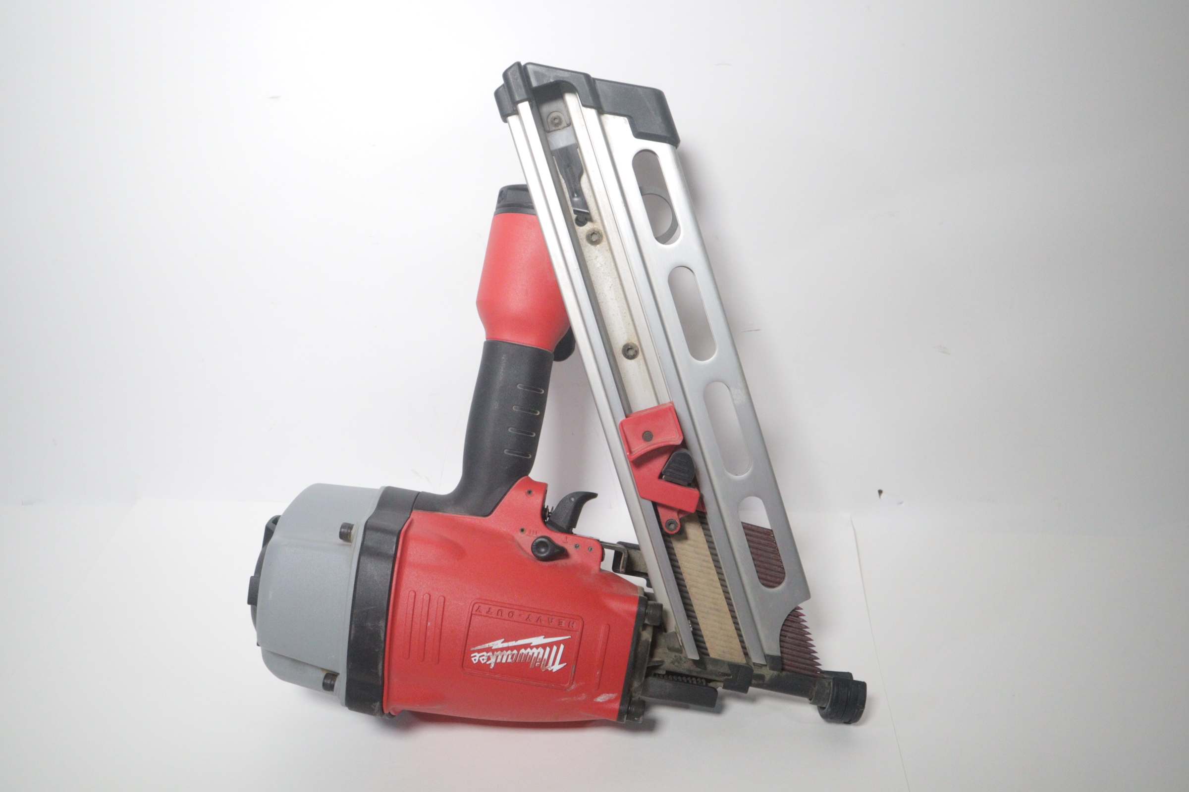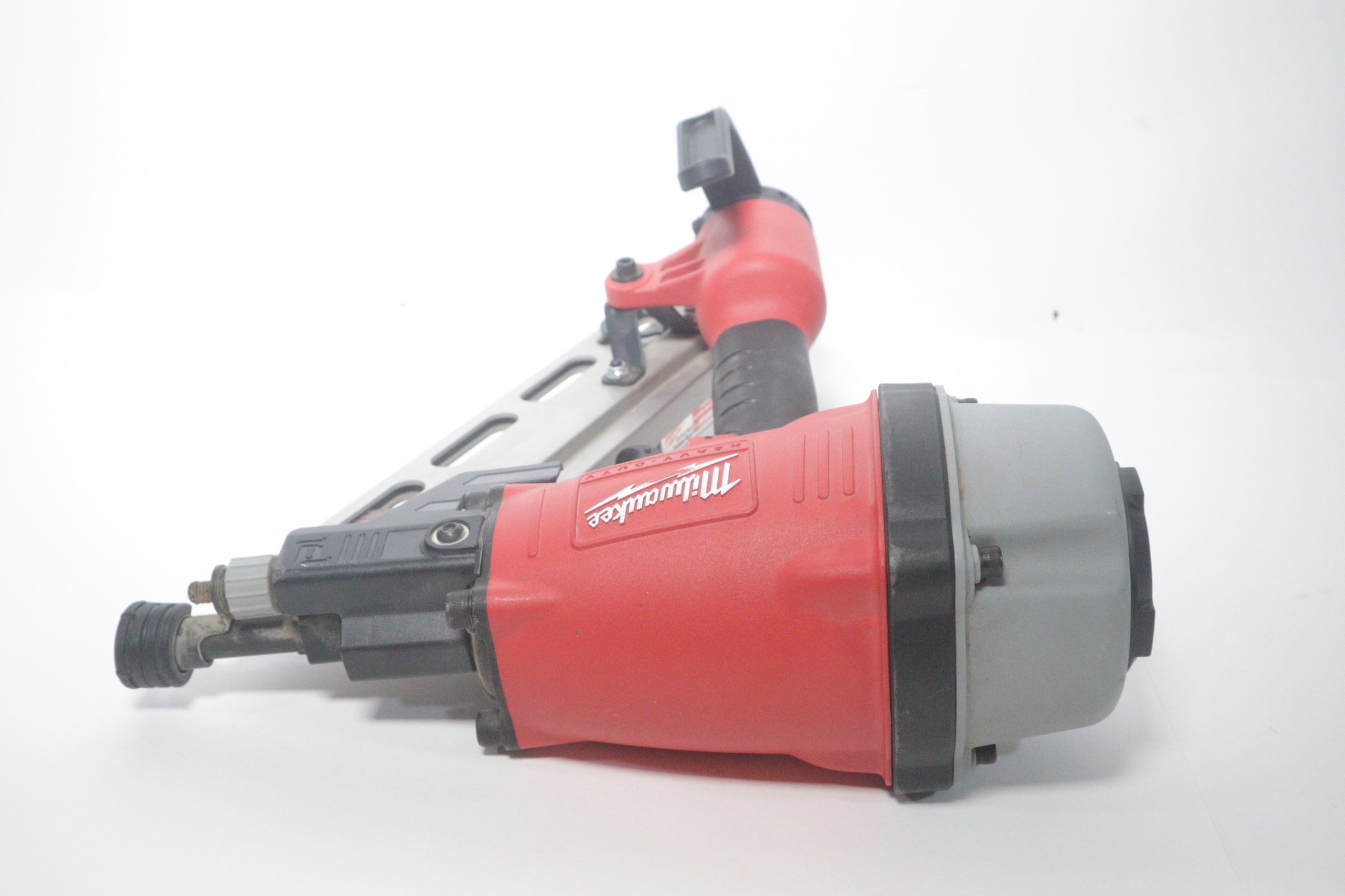 Utilizing an all-magnesium housing, Milwaukee’s 3-1/2” Full Round Head Framing nailer loads 20-22° full round head plastic collated nails 2” to 3-1/2” in length diameters .113” to .148”. Its easy select trigger lets you move quickly from single nail placement to contact actuation for maximum control and application versatility. The easy read and tool free depth of drive lets you quickly adjust the depth setting without having to reset the airline pressure. The self-cleaning air filter extends life and prevents dirt and debris from entering the tool. The adjustable air deflector with muffler directs exhaust away from the work area. A reload indicator lets you reload before firing blanks. The rear-loading magazine with bypass pusher allows smooth and fast reloads. The adjustable rafter hook allows for hanging of the tool in multiple positions and is removable.