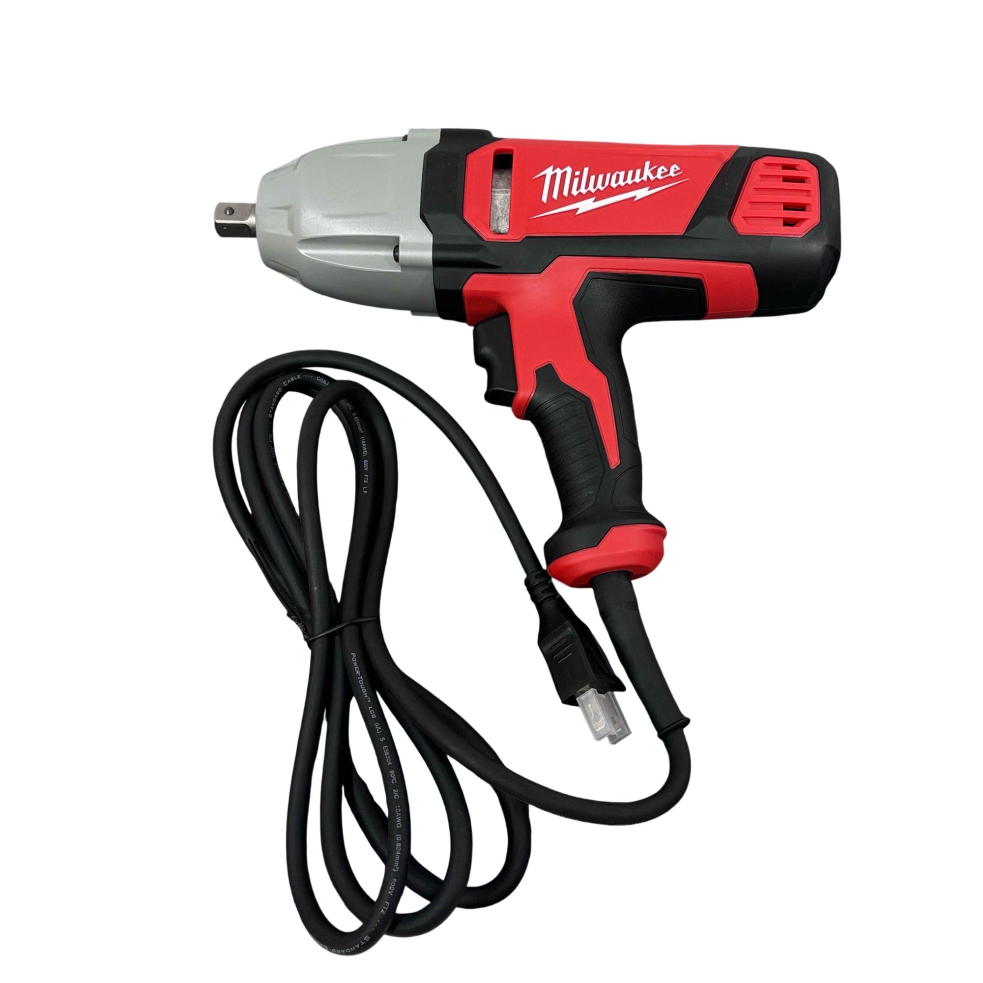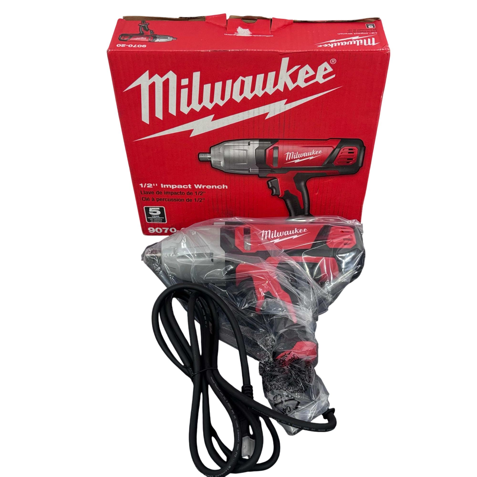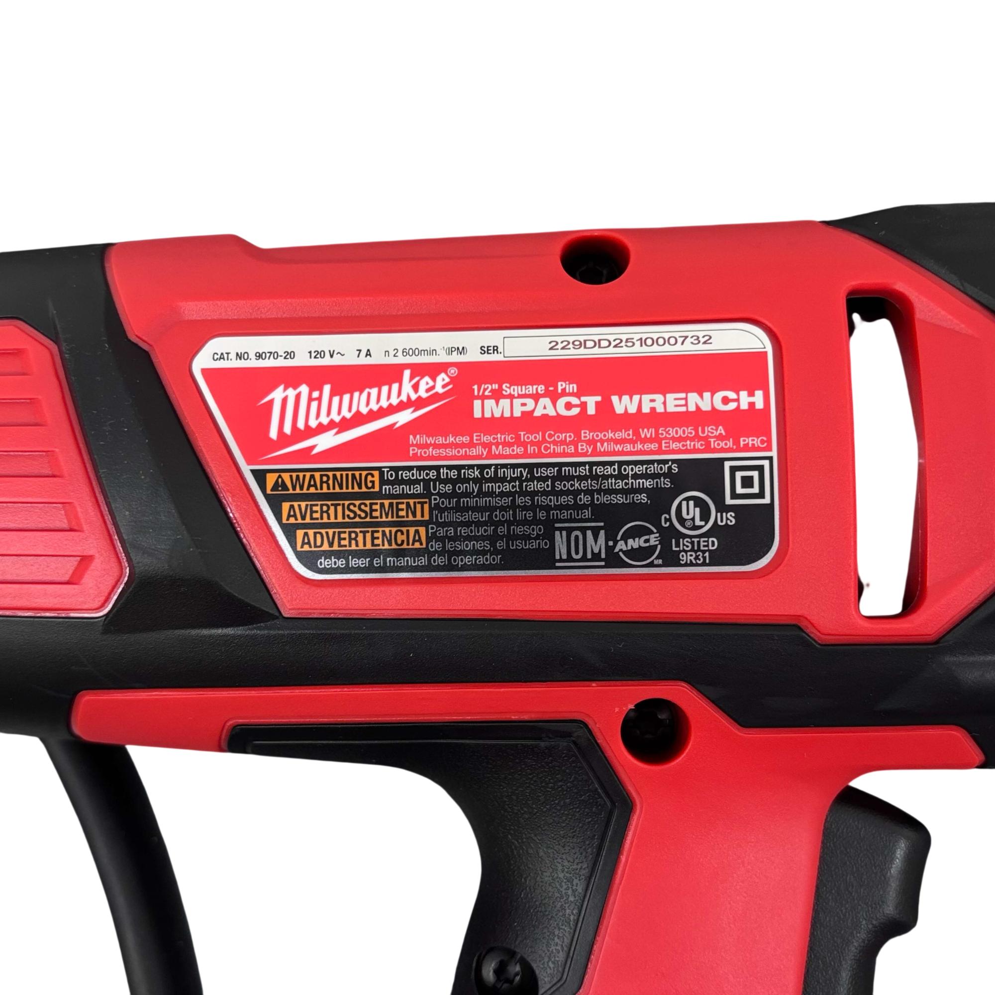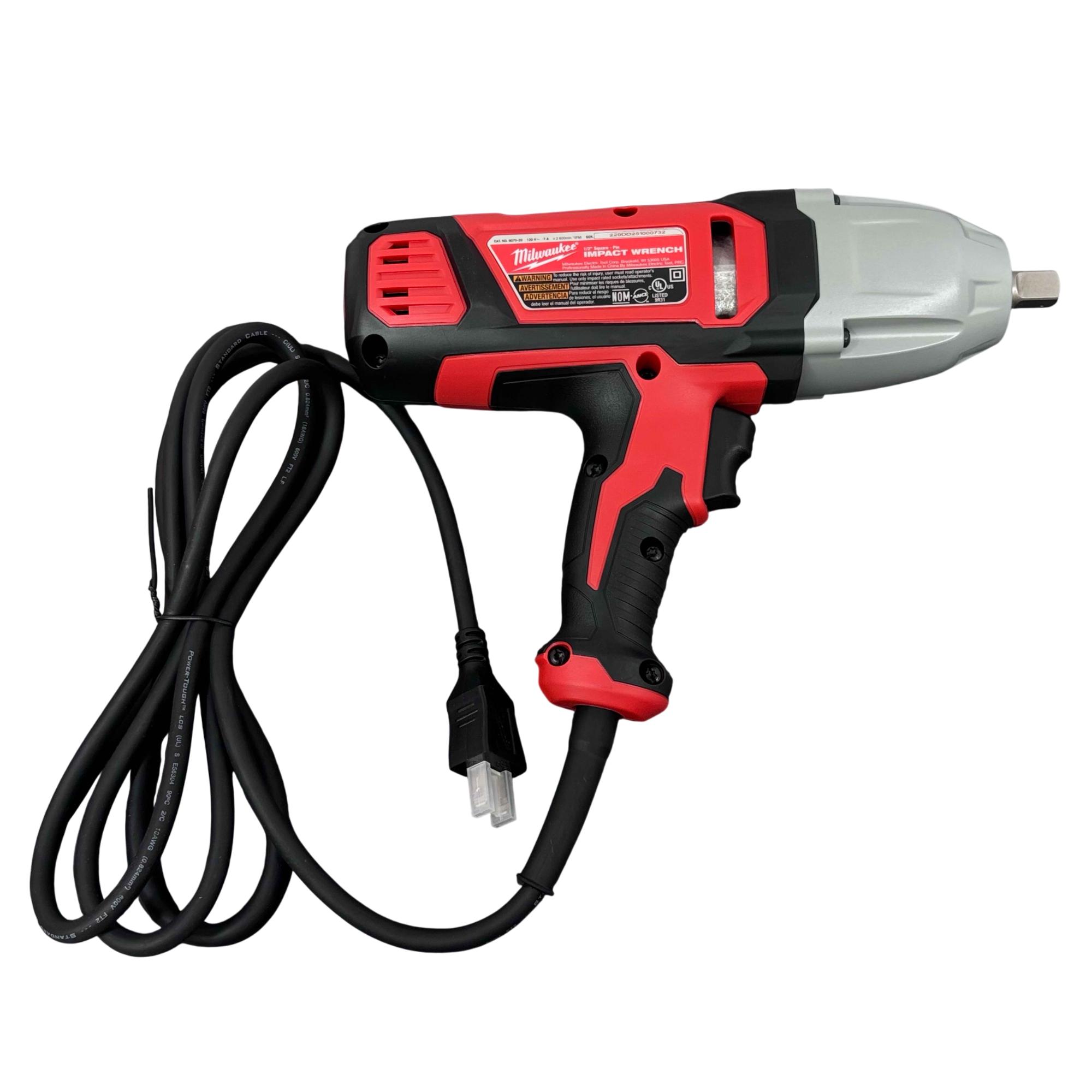 Milwaukee 9070-20 1/2" Electric Impact Wrench delivers robust 7 amp power with a corded design, engineered for heavy-duty fastening and loosening applications. Featuring a rocker switch and a 1/2 inch square drive with detent pin, this impact wrench provides reliable torque control and durability for professional use in construction and mechanical tasks.