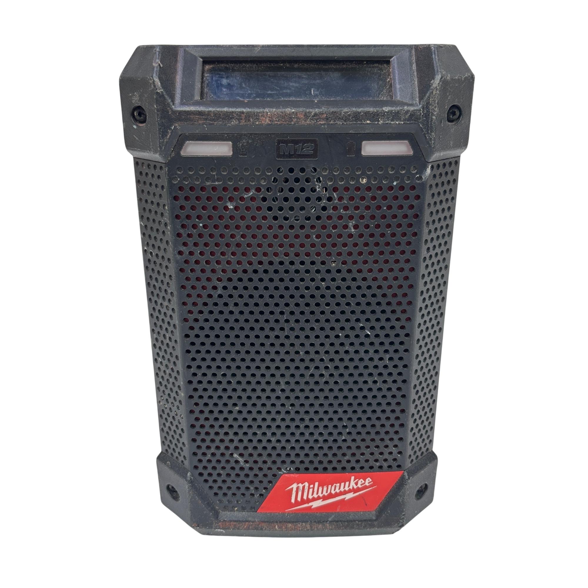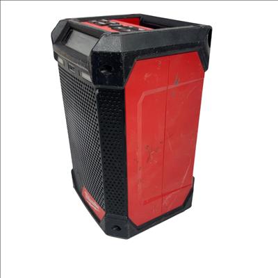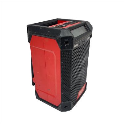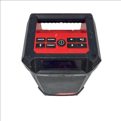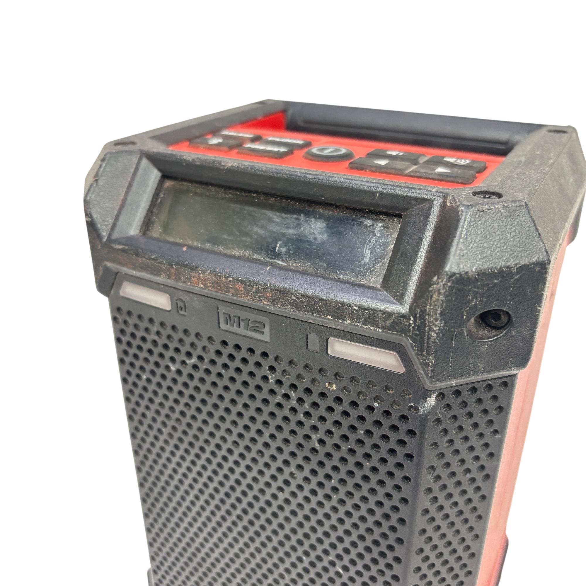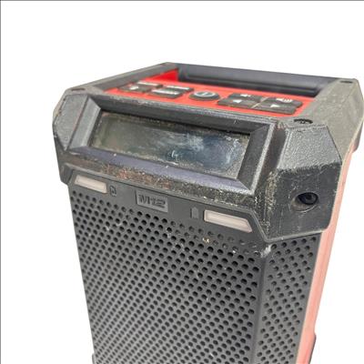 This Milwaukee M12 Cordless Bluetooth/AM/FM Jobsite Radio is a compact and durable radio designed for jobsite use, featuring Bluetooth connectivity for wireless audio streaming and AM/FM radio functionality. Its rugged construction includes a black and red housing with an easy-to-read screen and straightforward controls, making it ideal for tough environments where reliable audio access is needed.