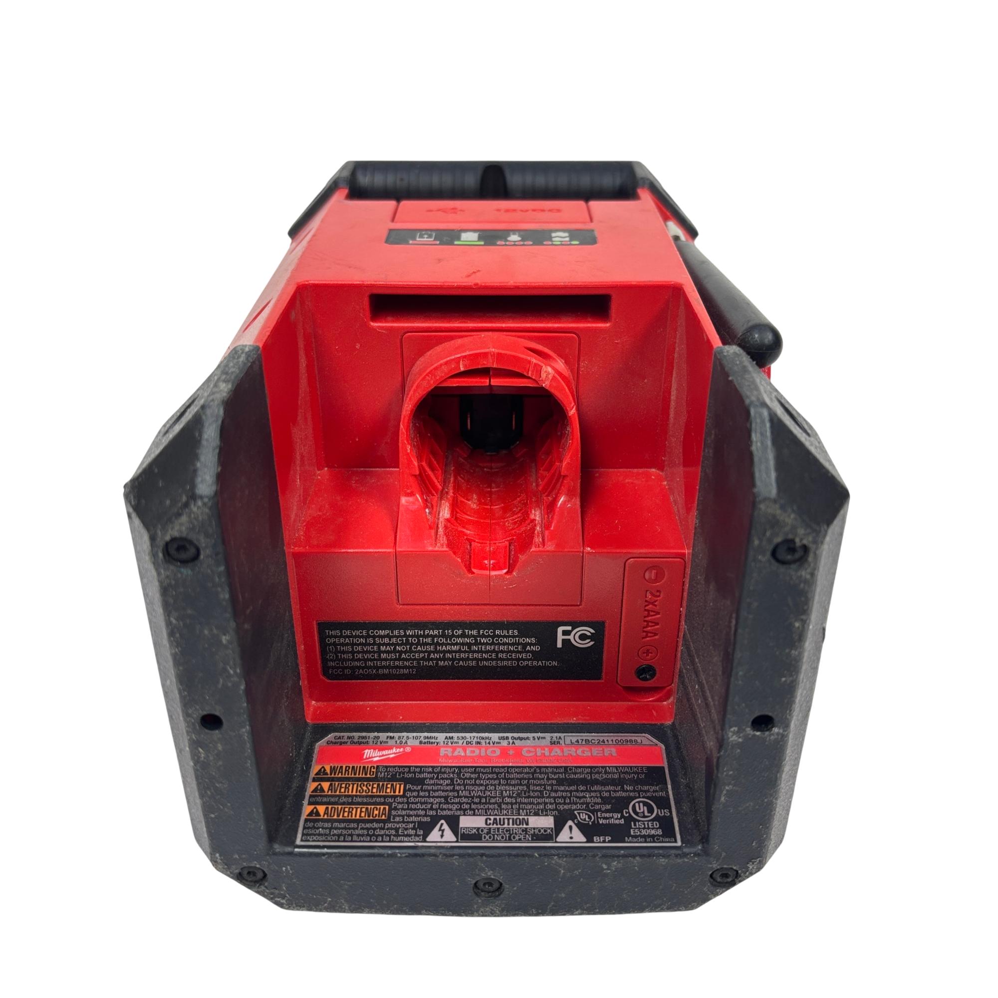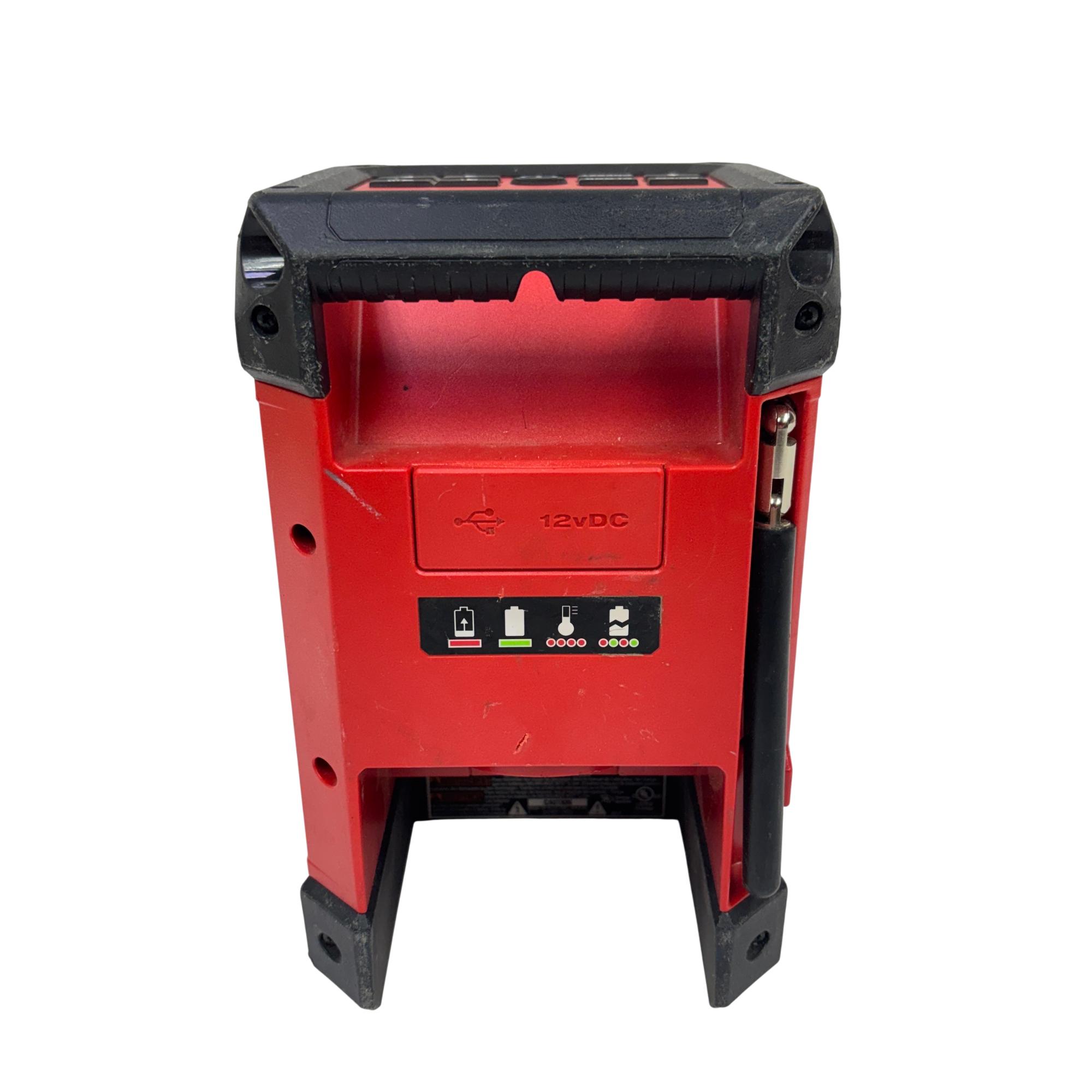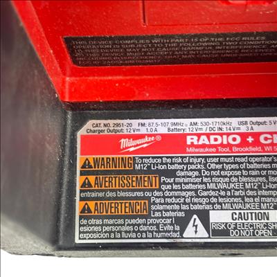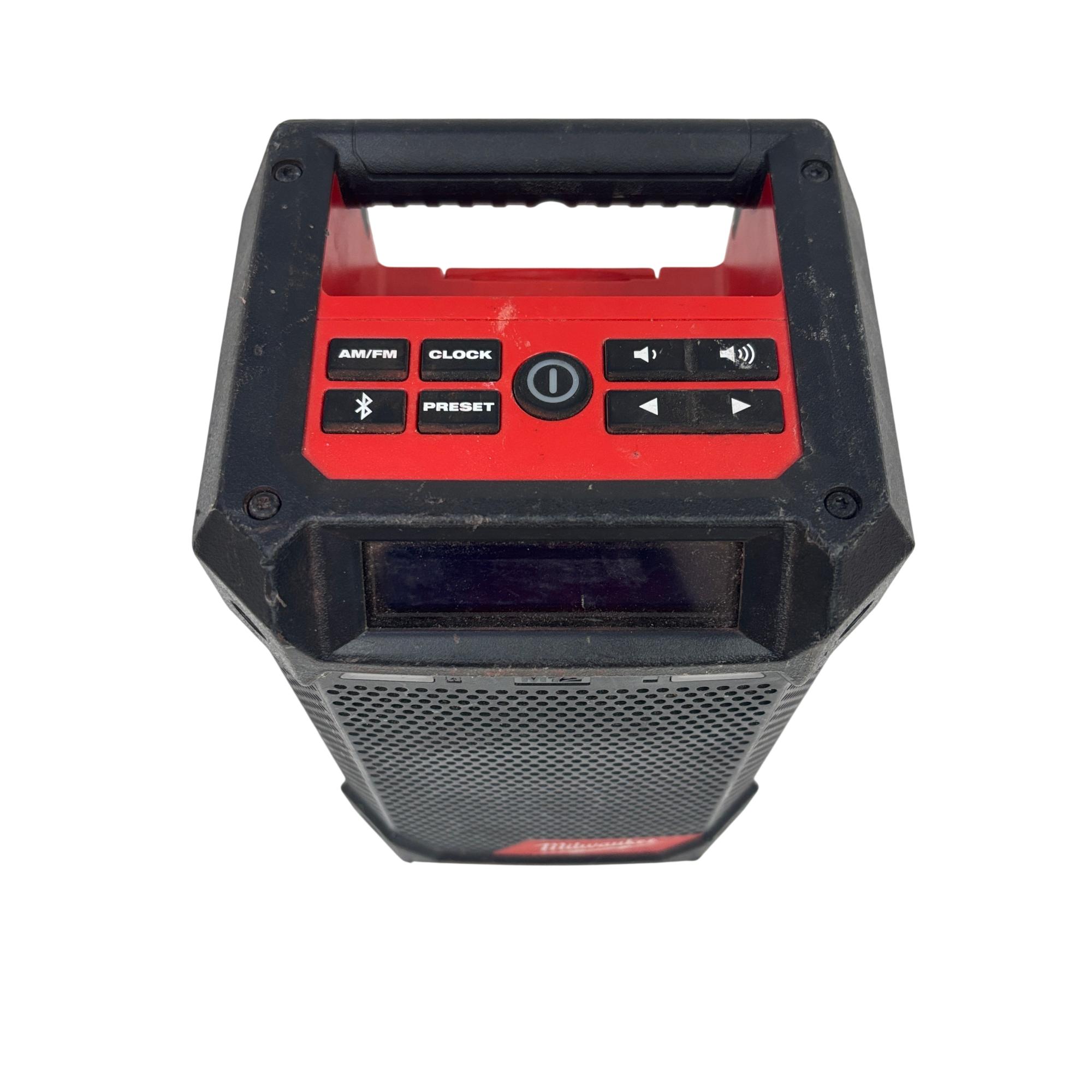 This Milwaukee M12 Cordless Bluetooth/AM/FM Jobsite Radio is a compact and durable radio designed for jobsite use, featuring Bluetooth connectivity for wireless audio streaming and AM/FM radio functionality. Its rugged construction includes a black and red housing with an easy-to-read screen and straightforward controls, making it ideal for tough environments where reliable audio access is needed.