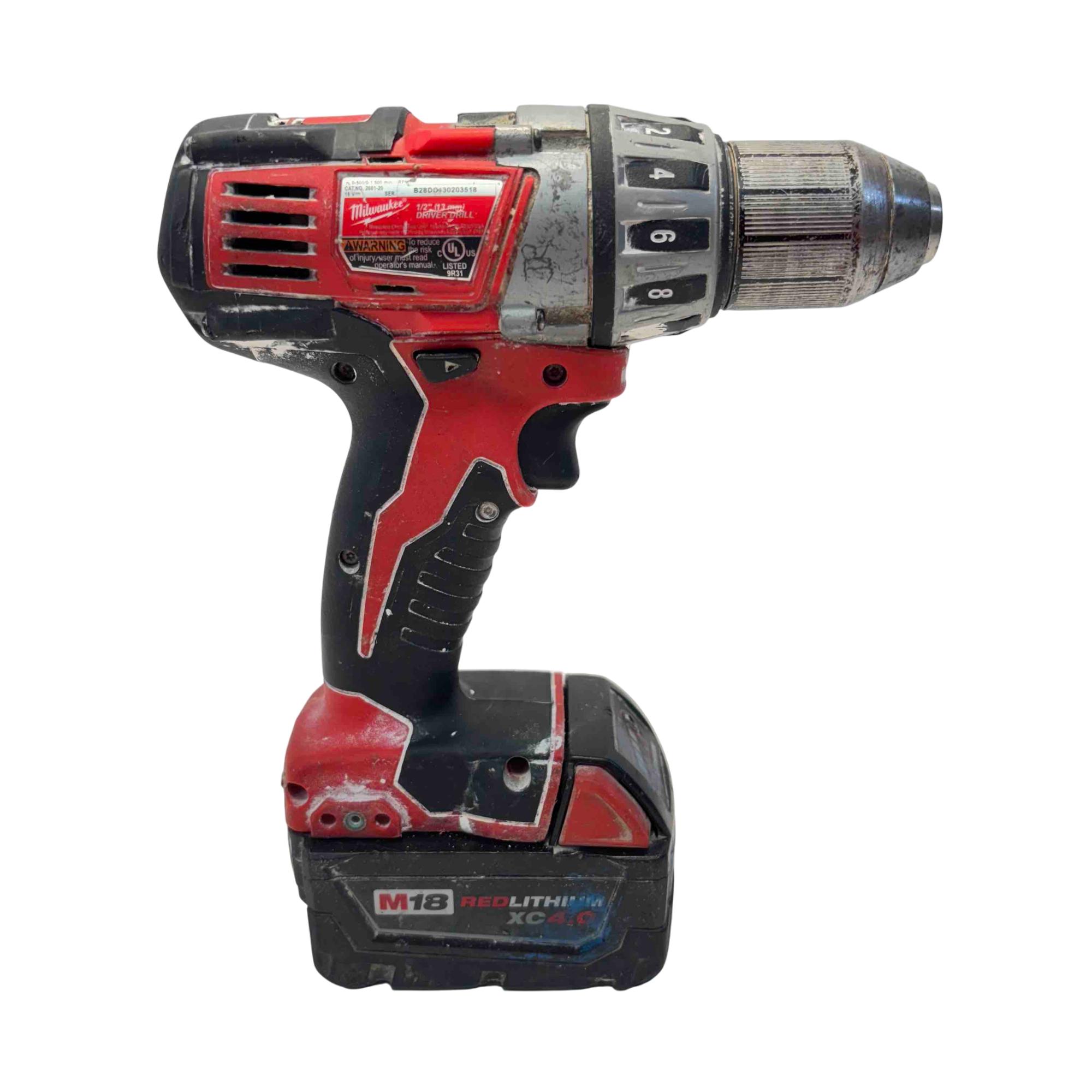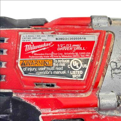 Milwaukee M18 2601-20 18V Cordless 1/2" Drill/Driver with REDLITHIUM XC 4.0 Battery is a high-performance power tool designed for durability and portability. Featuring a 1/2-inch metal chuck and powered by an 18-volt REDLITHIUM XC 4.0 battery, this compact drill delivers reliable torque and long runtime for various drilling and driving applications.
