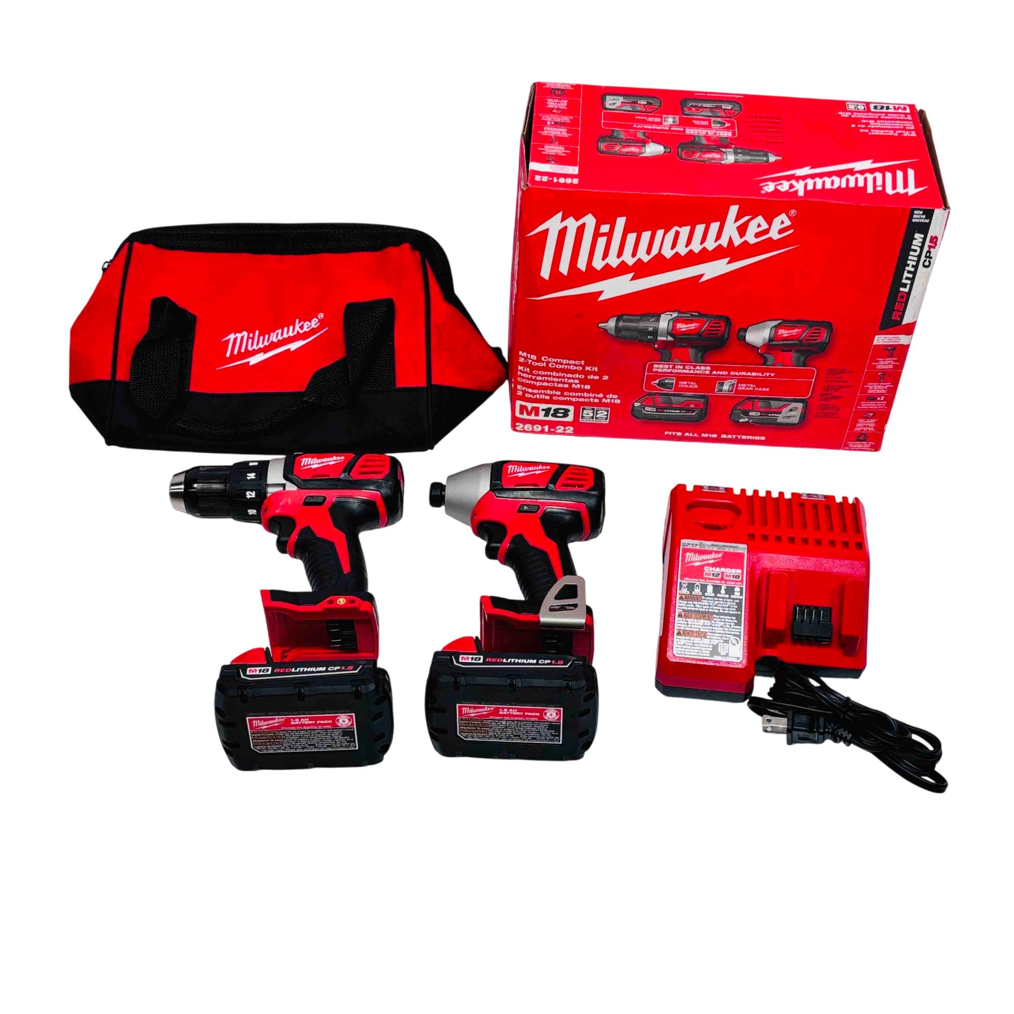Boost your productivity with the Milwaukee M18 2691-22 Compact 2-Tool Combo Kit. This sought-after set includes a powerful 1/2 drill/driver, a 1/4 hex compact impact driver, two long-lasting REDLITHIUM CP1.5 batteries, a versatile M18/M12 multi-voltage charger, and a rugged contractor bag for transport. Trusted Milwaukee quality, designed for maximum durability and performance on any jobsite.