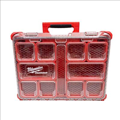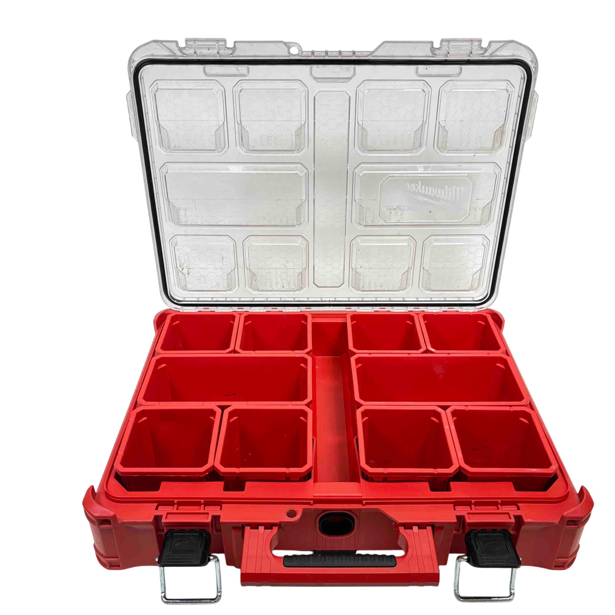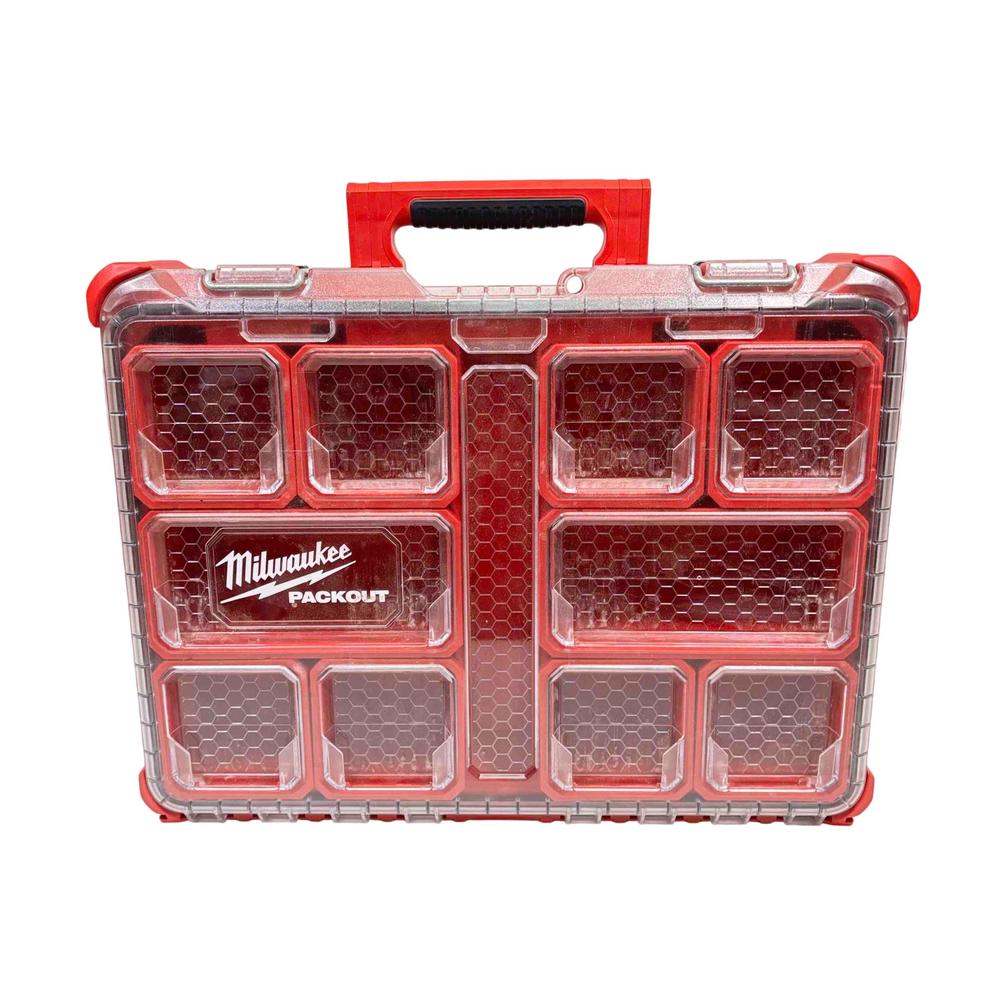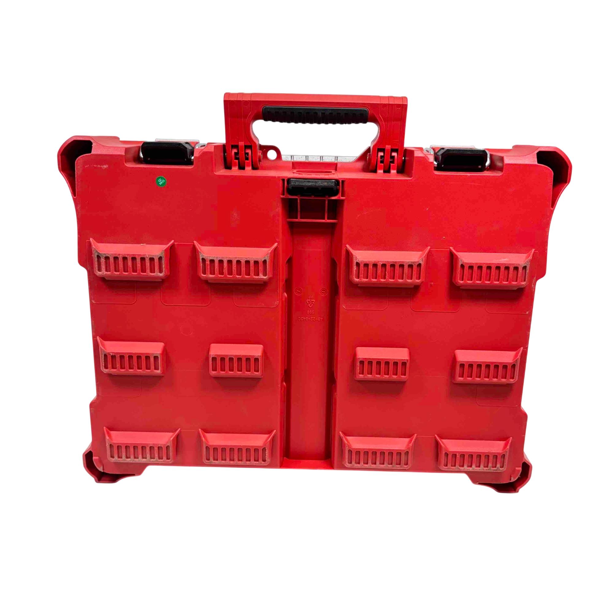 The Milwaukee PACKOUT 10-Bin Organizer, Model 48-22-8430, is a durable and impact-resistant storage solution designed for efficient organization of small parts and accessories. Featuring multiple clear plastic compartments within a robust red case with black handles, it allows easy visibility and access to contents while standing up to tough jobsite environments. This versatile organizer integrates seamlessly with the Milwaukee PACKOUT modular storage system for enhanced portability and customization.