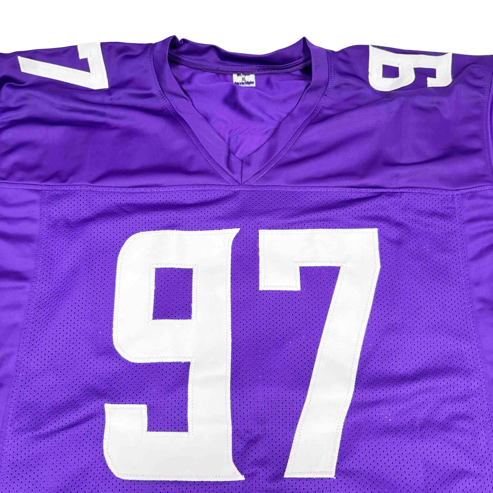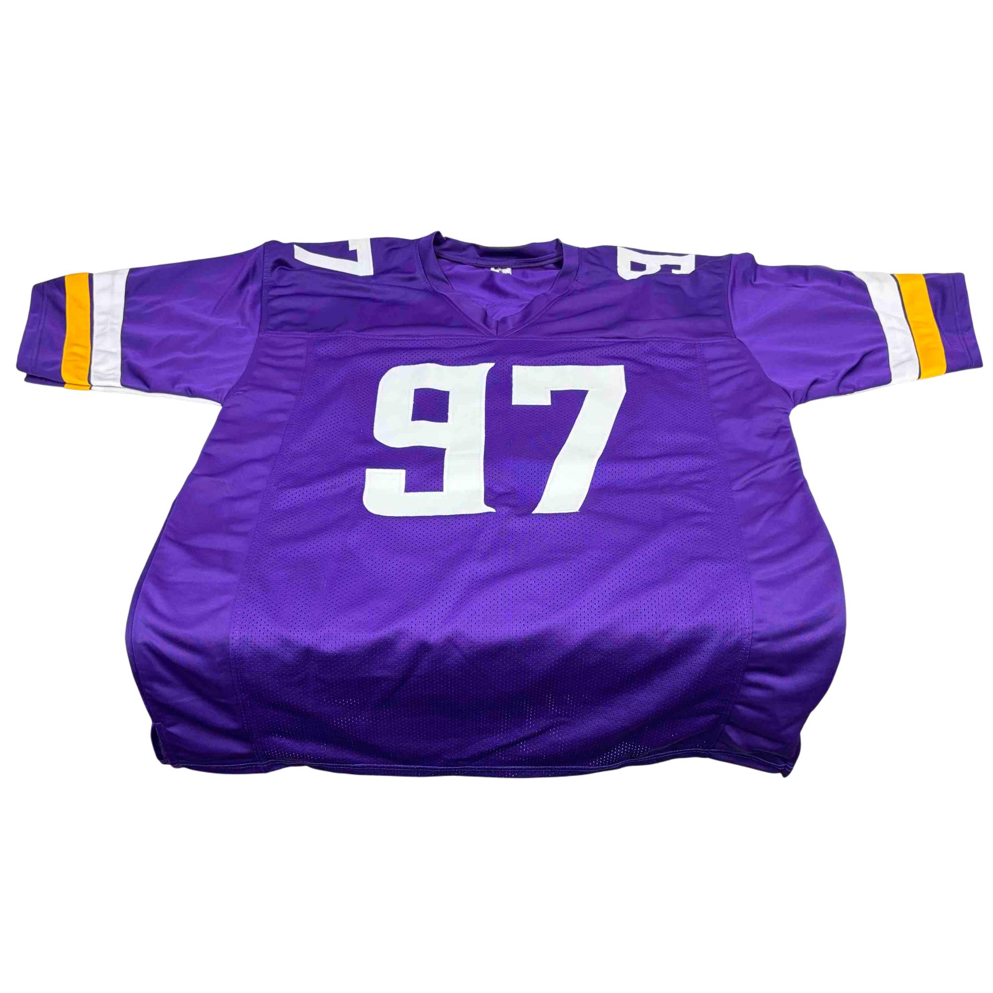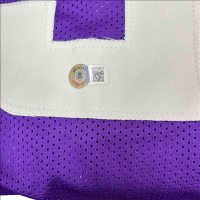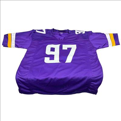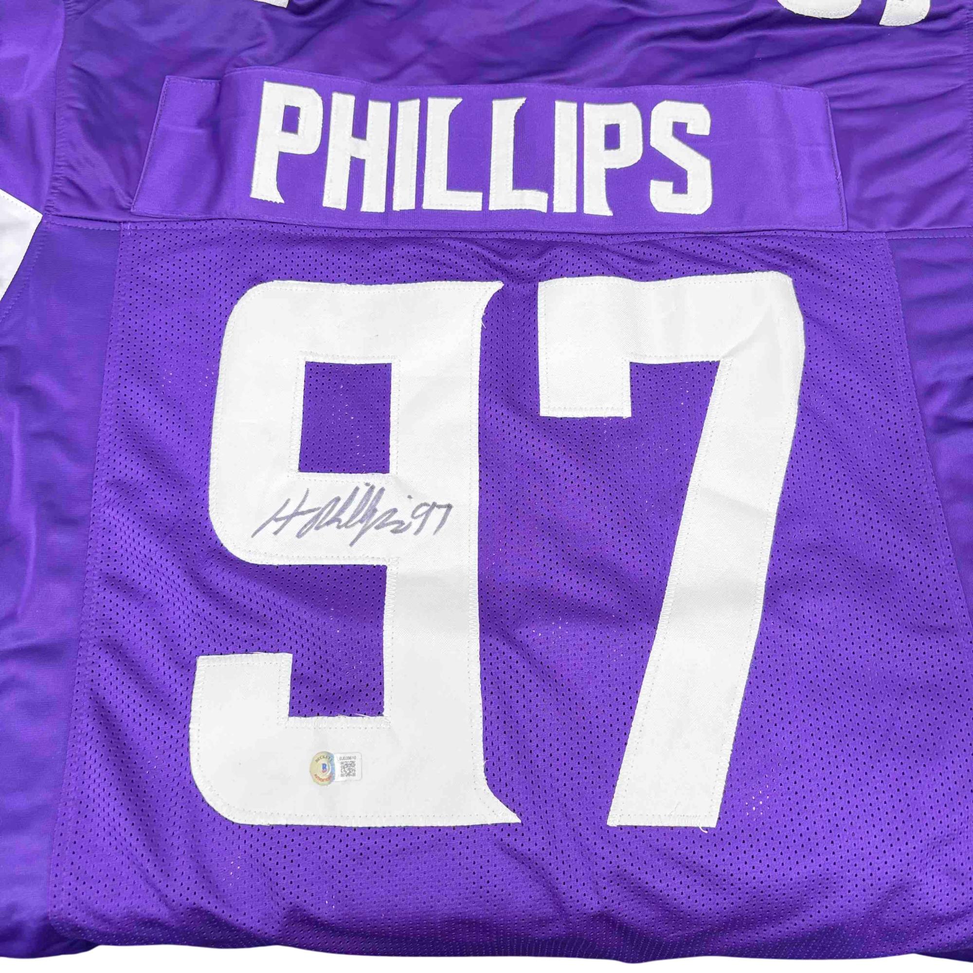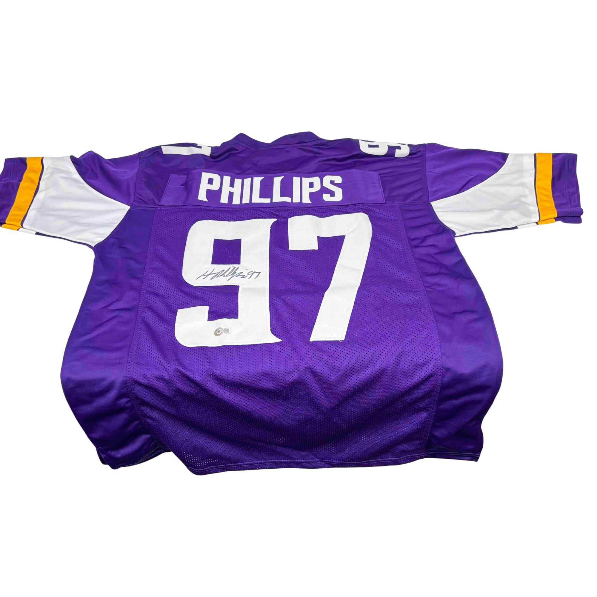 This authentic Minnesota Vikings football jersey, featuring the iconic #97 worn by Harrison Phillips, is a must-have for any true fan. The jersey stands out in vibrant purple with white numerals and classic gold and white sleeve stripes, and comes signed for added value and collectability. Whether you’re displaying it in your sports cave or wearing it to the game, this very lightly used Beckett authenticated jersey is perfect for collectors and Vikings supporters alike.