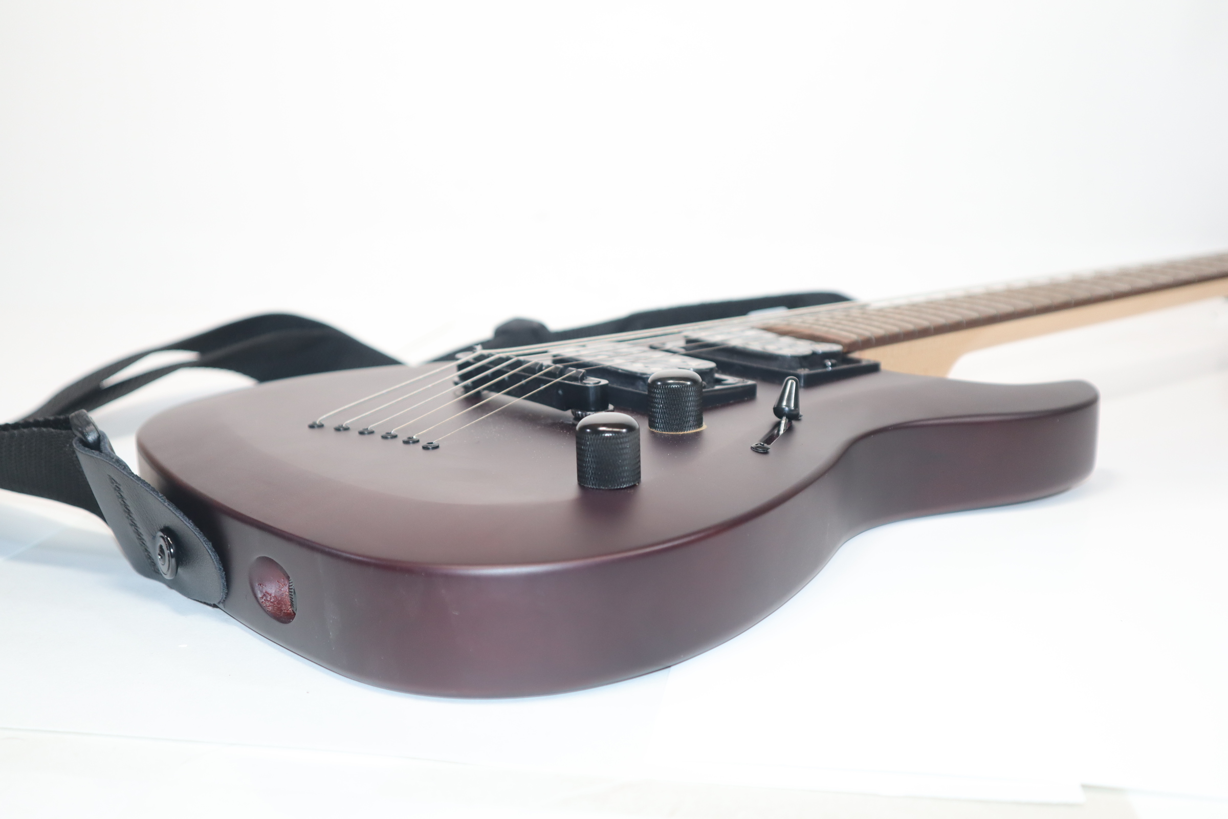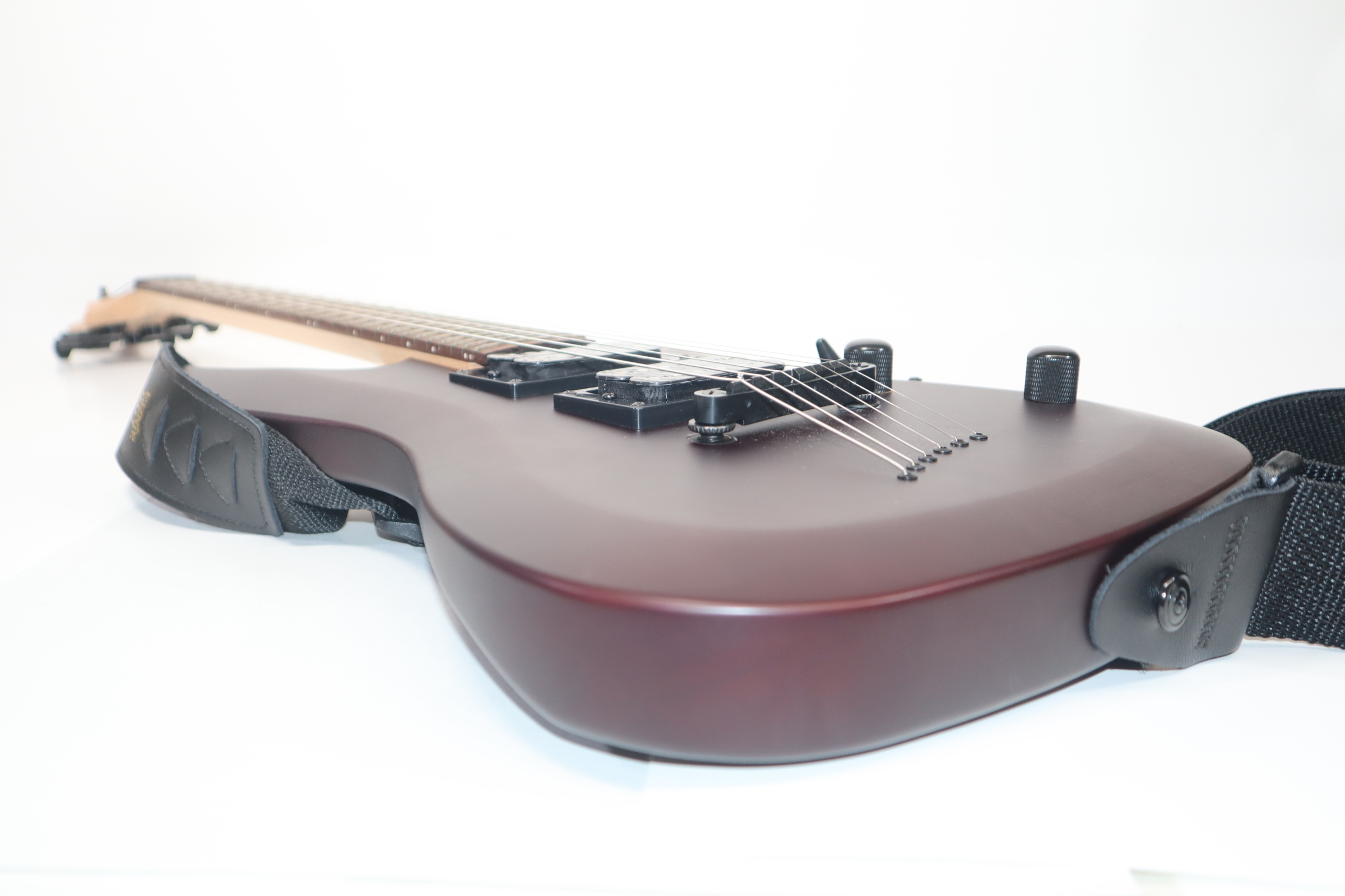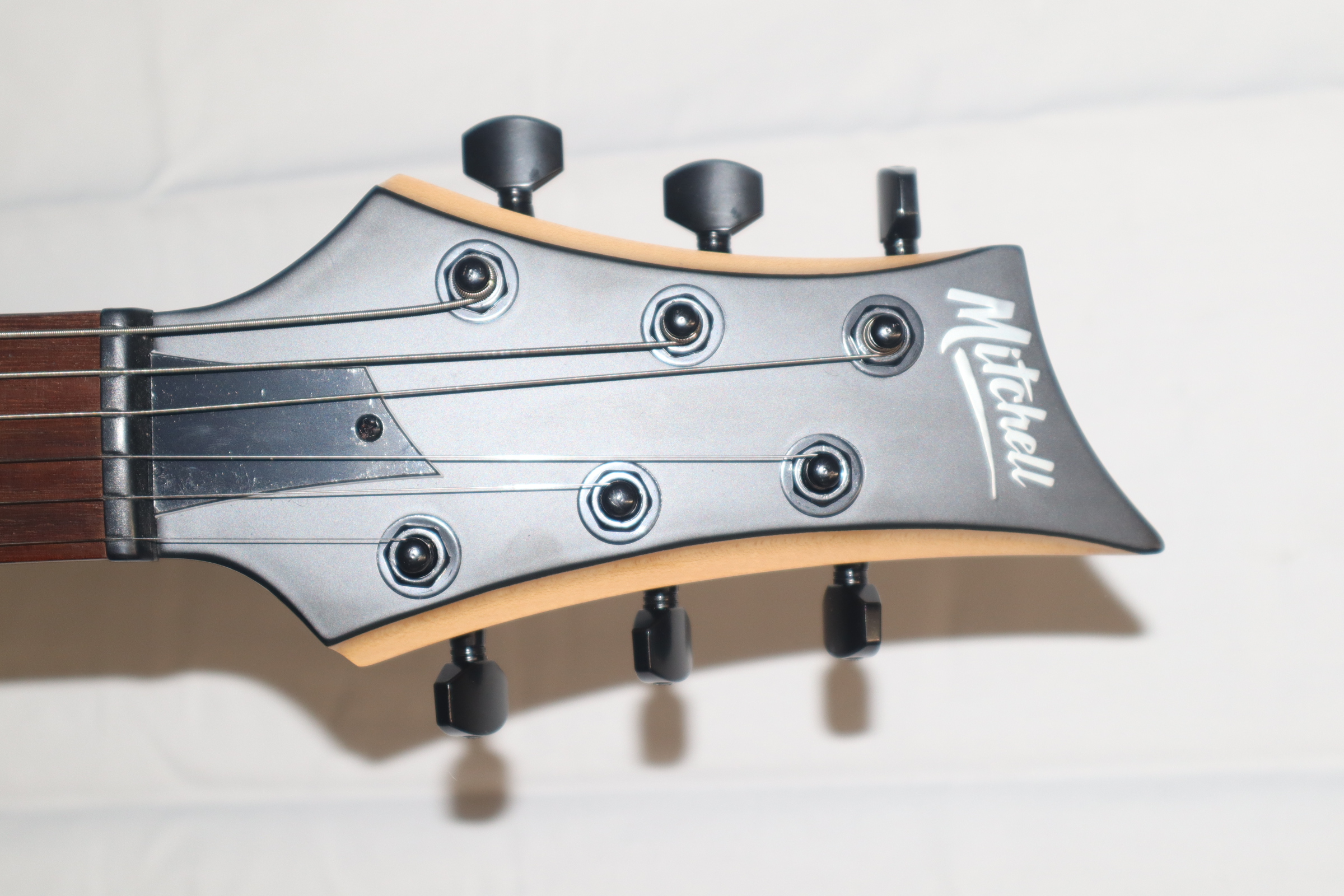 * The Mitchell MM100 features a short-scale double cutaway basswood body and a one-piece maple neck.