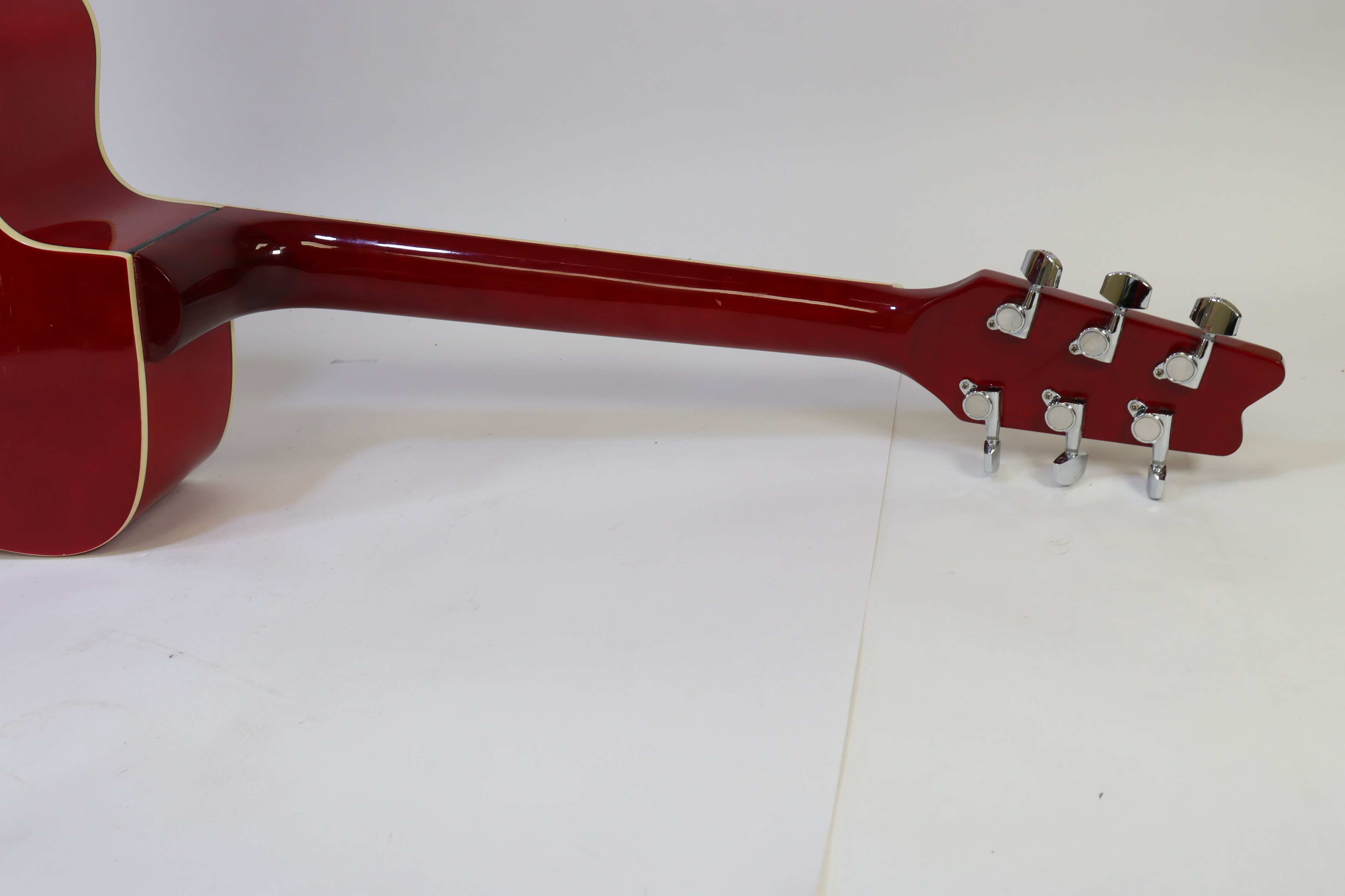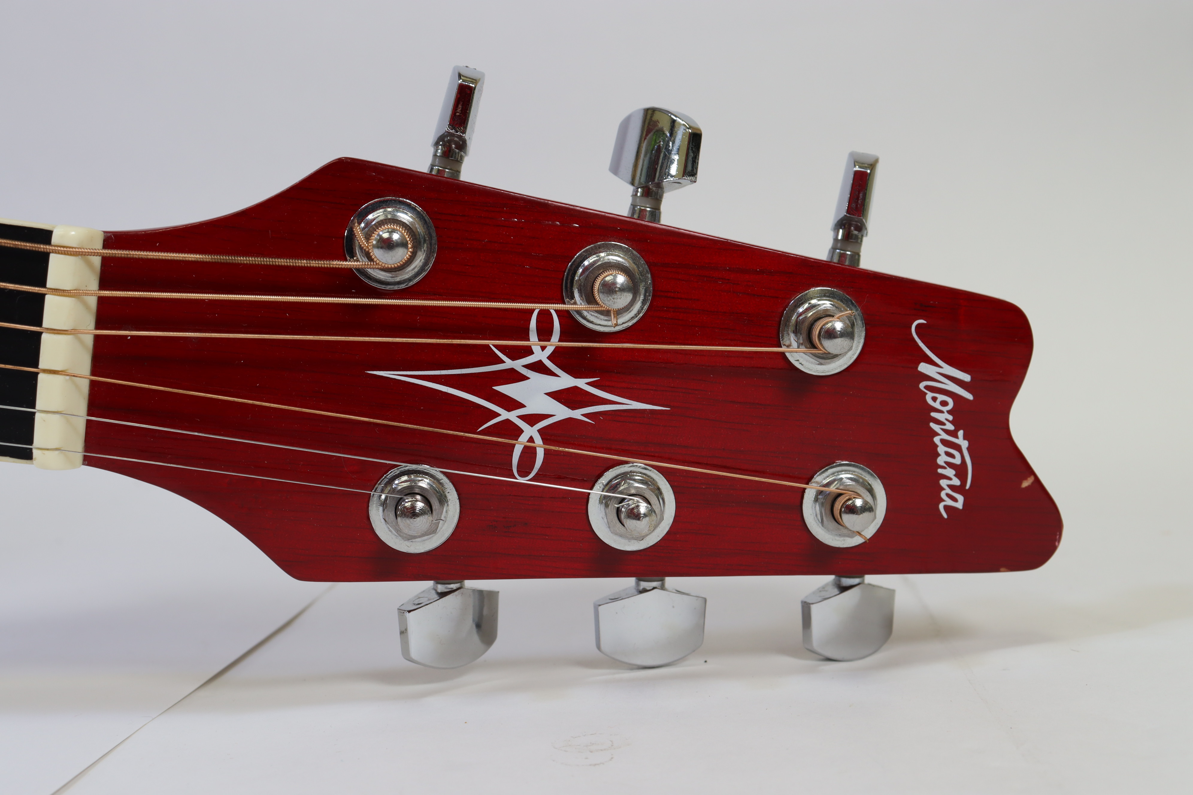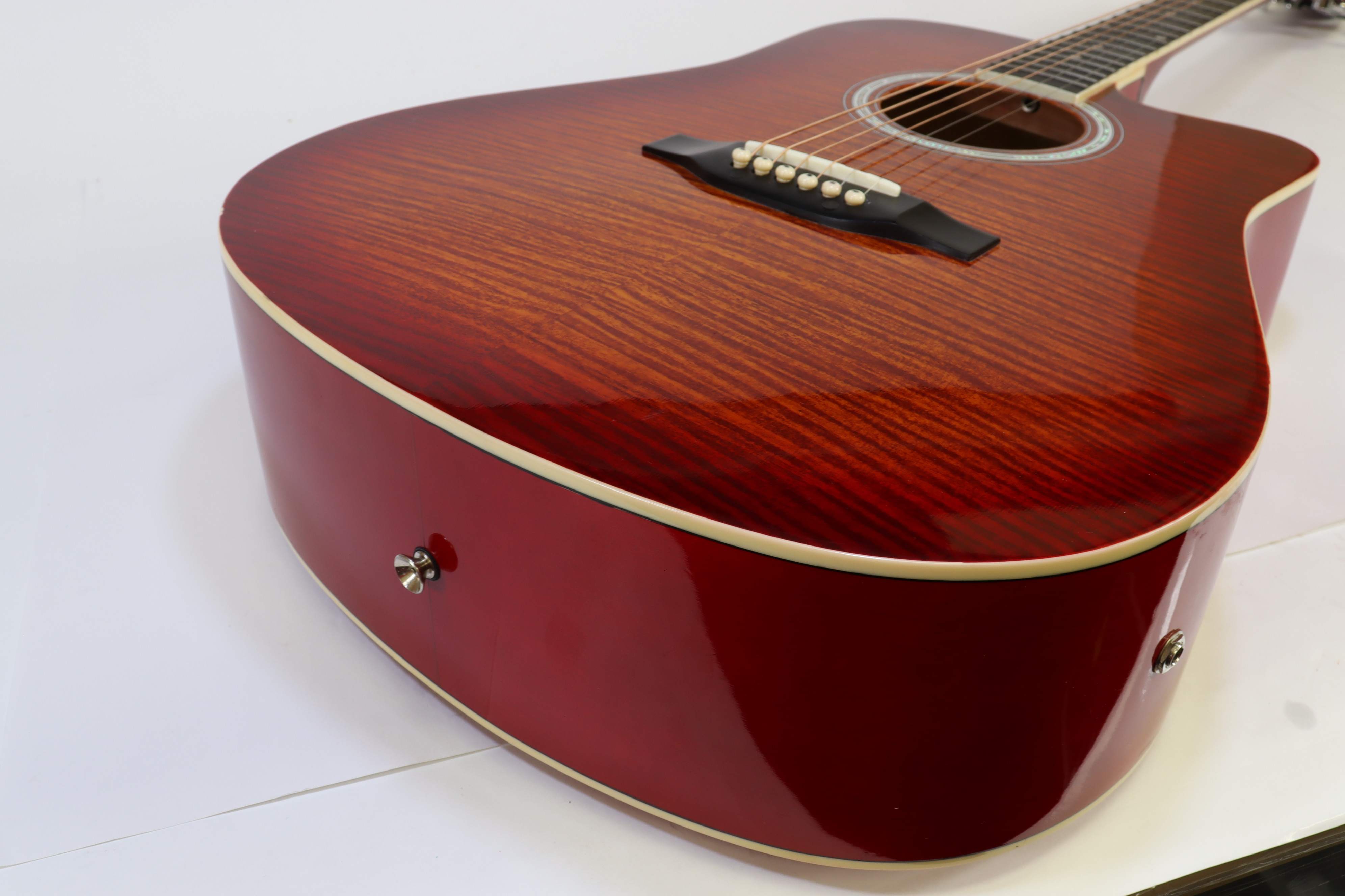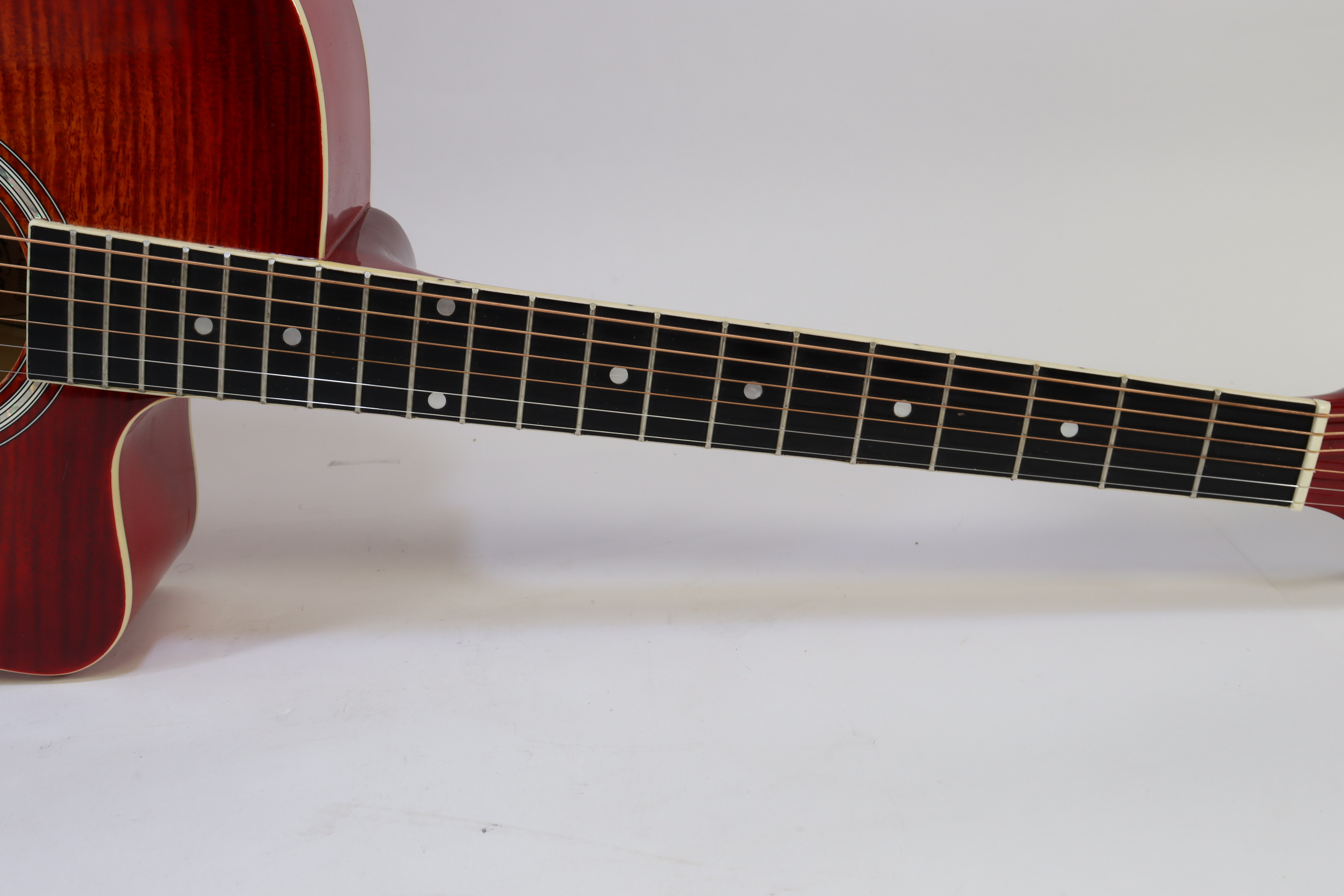 Full Sized Scale - 25.5" Long - Full Ivoriod Neck and Body Binding - Set Nato Mahogany Neck - Nato Mahogany Fingerboard and Bridge - Spruce Top with Cherryburst Laminated Flame - Chrome Diecast gears - Agathis Sides & Back - Passive 2-Band EQ Tone Control