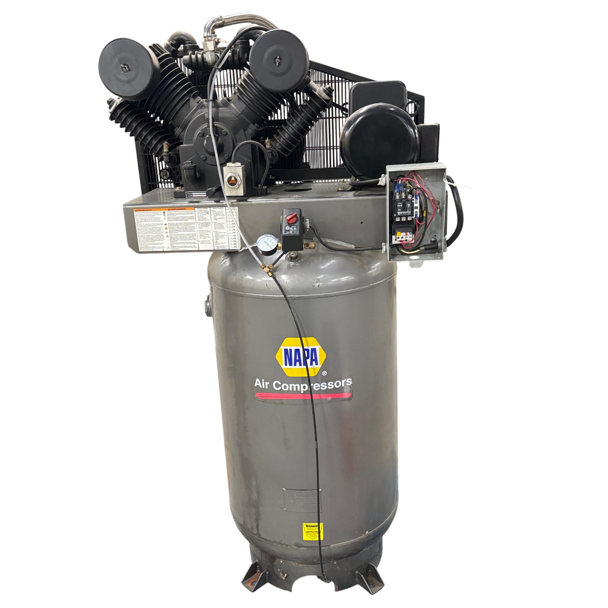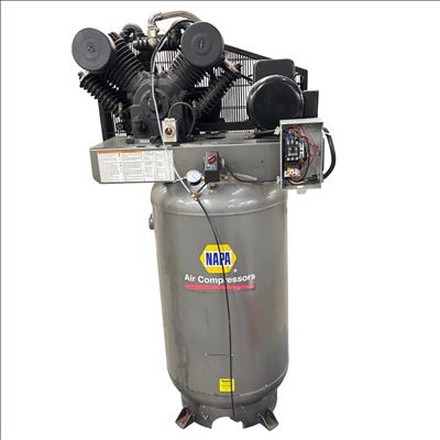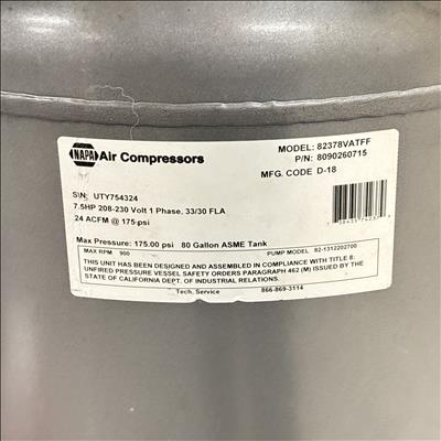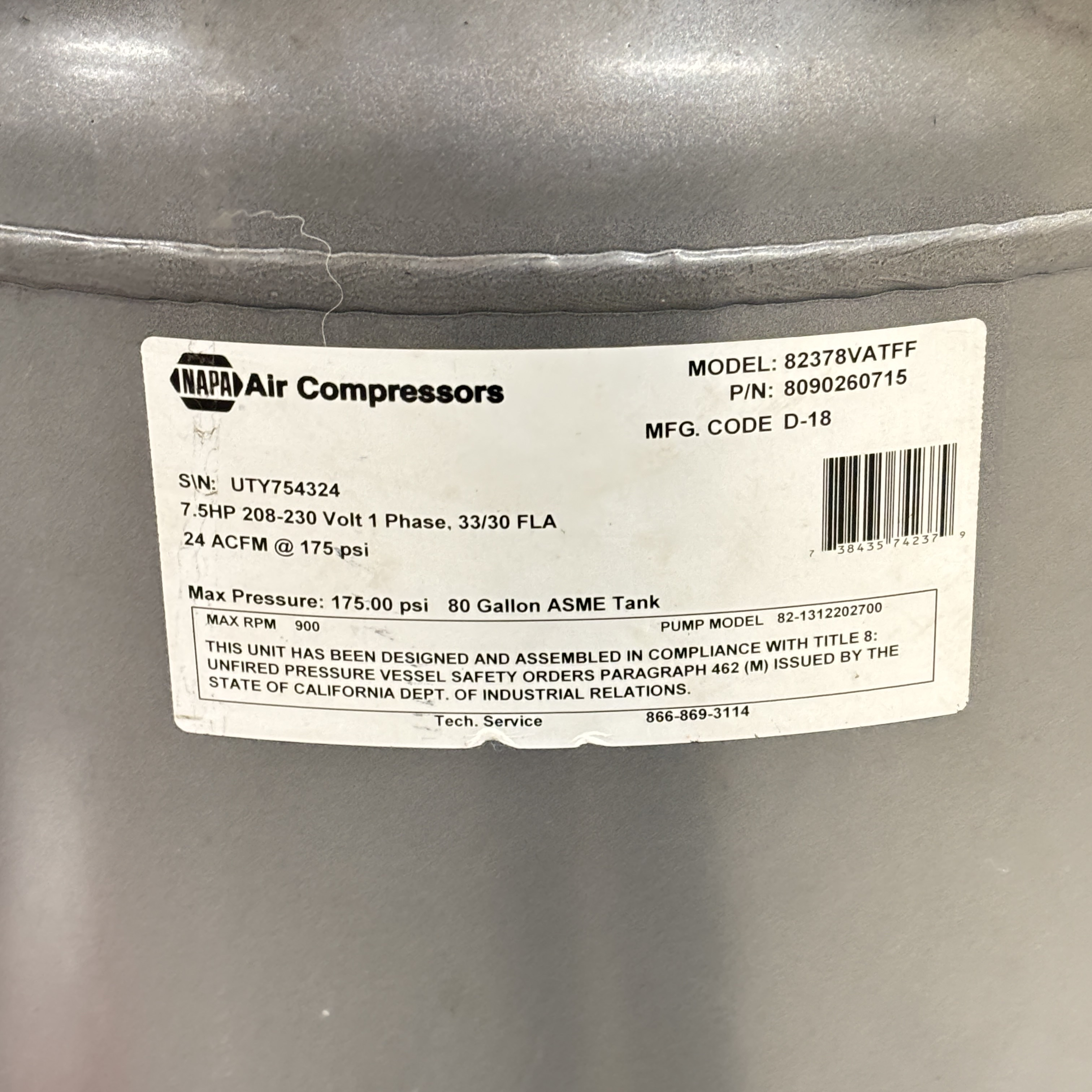 NAPA Air Compressors 80 Gallon 7.5HP Single Phase Air Compressor, Model 82378VATFF features a durable 80-gallon ASME tank and delivers 24 ACFM at 175 psi with a maximum pressure of 175 psi. This industrial-grade unit is powered by a 7.5 horsepower motor running at 208-230 volts single phase, designed for efficient performance in demanding applications. Its robust construction includes a pump model 82-1312202700 and meets California safety standards for unfired pressure vessels.