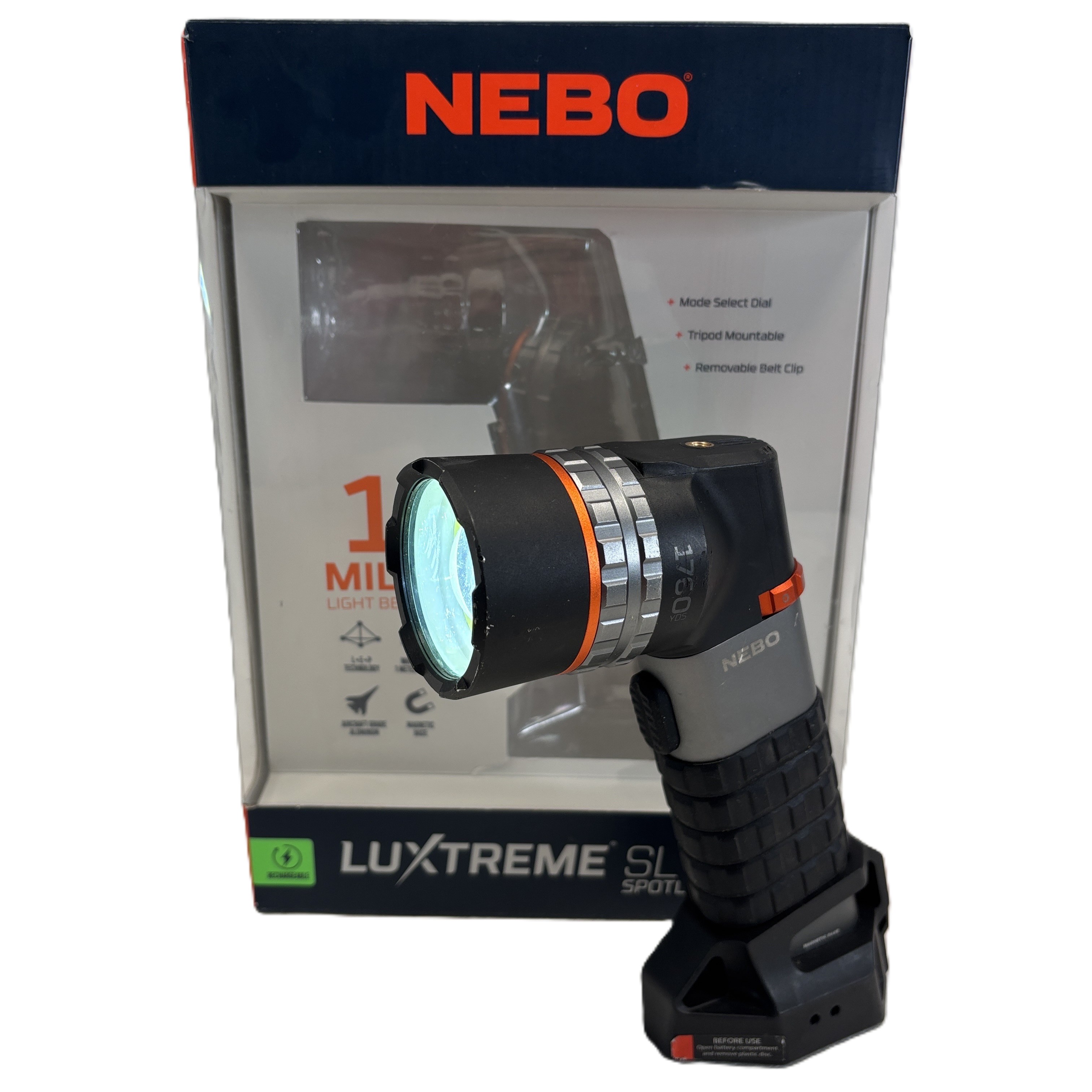 The NEBO LUXTREME SL100 Rechargeable LEP Spotlight Flashlight delivers powerful illumination with its advanced LUXTREME technology, capable of lighting up to 1370 yards. This spotlight features an adjustable focus ring, allowing you to customize the beam from wide flood to focused spot, making it ideal for outdoor activities, work sites, or emergency use. Equipped with a magnetic base and an ergonomic rubber grip, it offers hands-free convenience and comfortable handling. Battery powered and designed for durability, the SL100 is a reliable lighting solution for demanding environments.