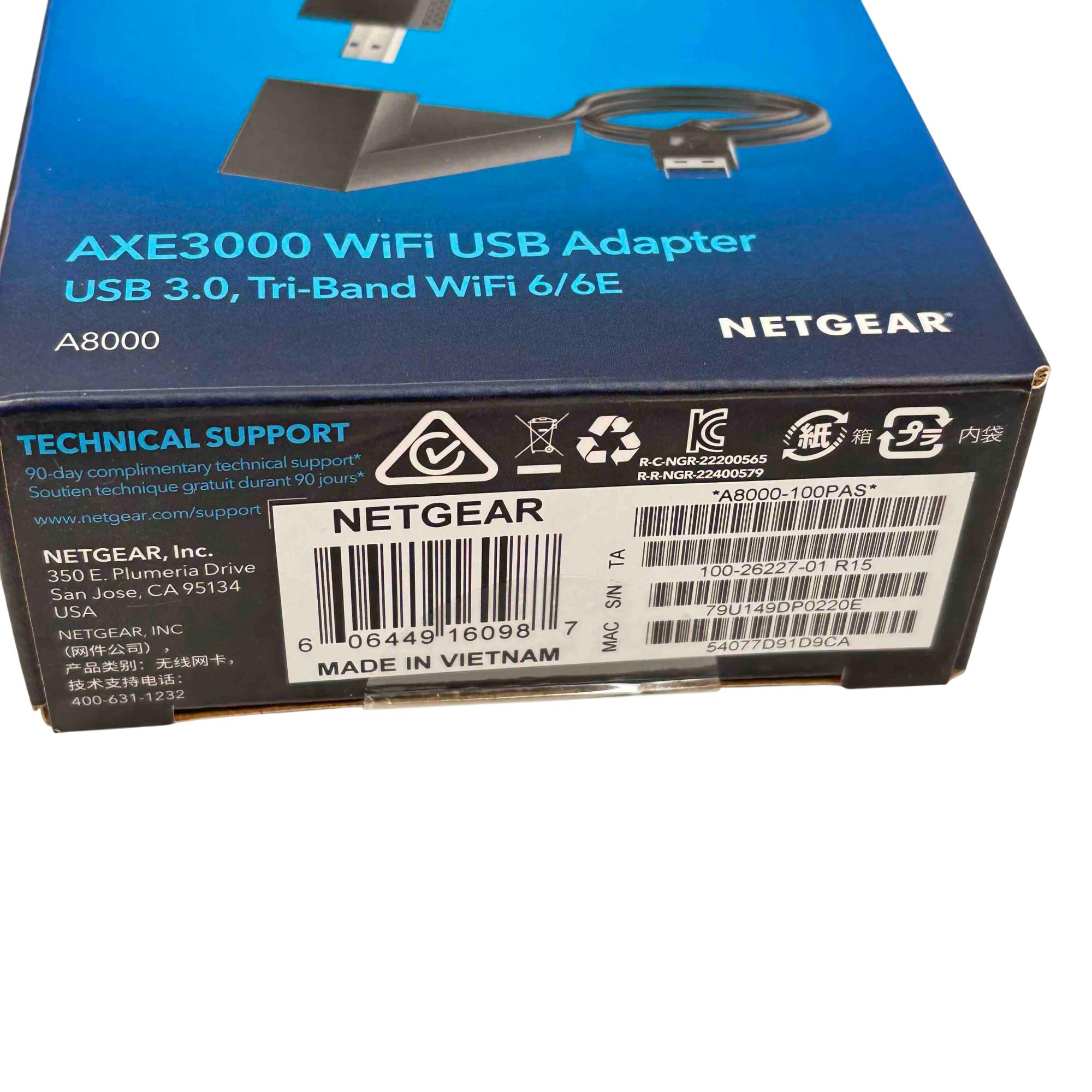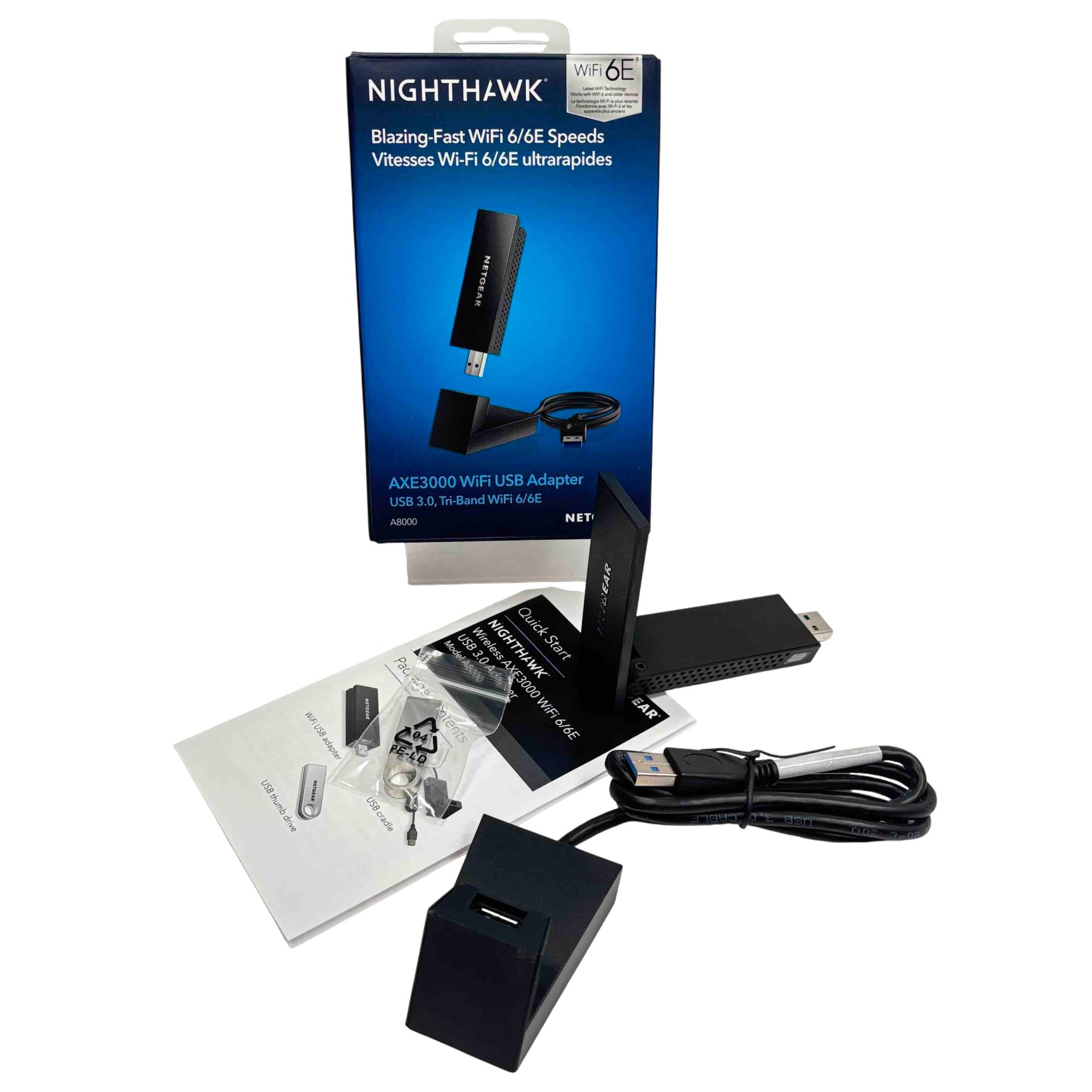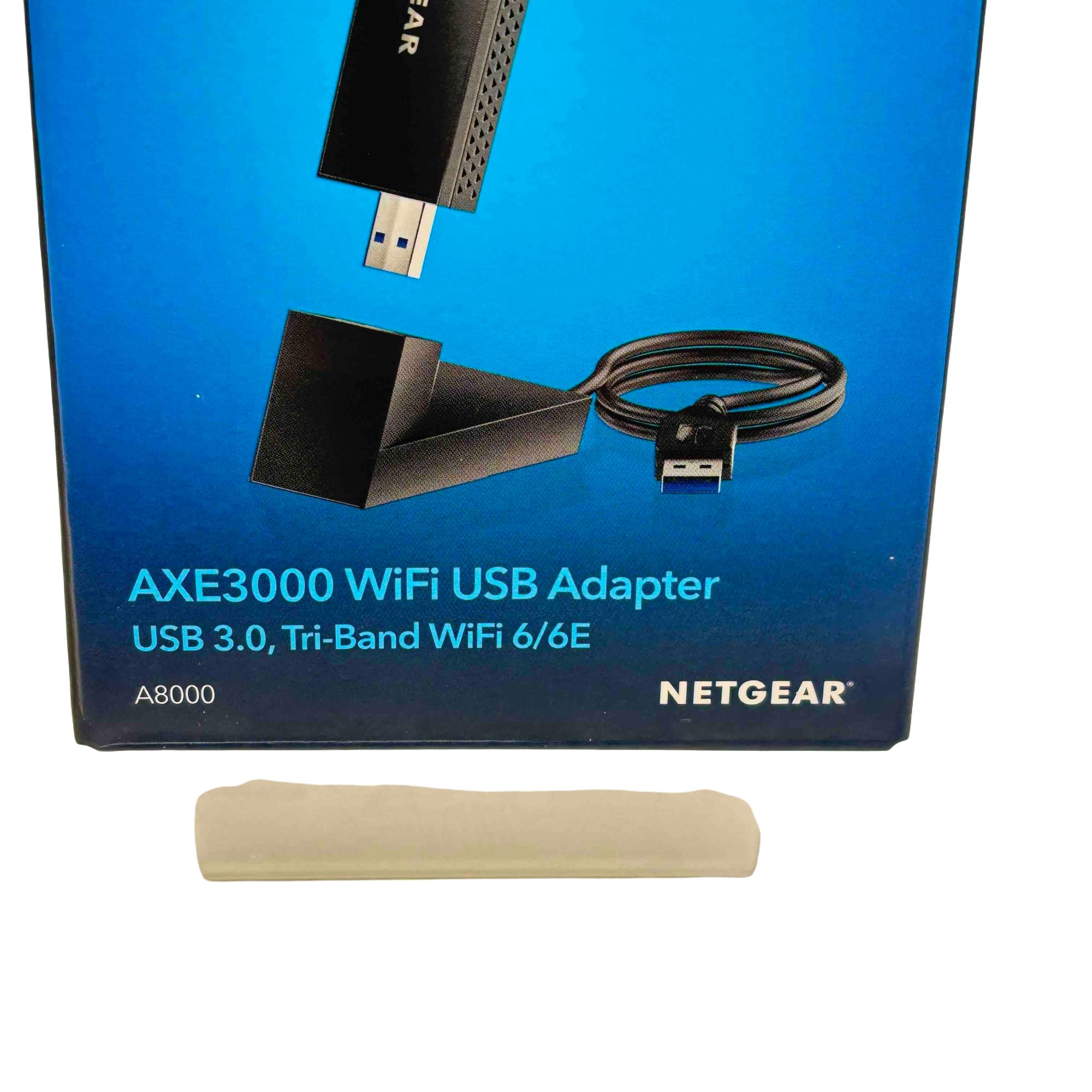 Upgrade your connectivity with the NETGEAR Nighthawk A8000 AXE3000 USB 3.0 Tri-Band WiFi 6E Adapter. Experience blazing-fast WiFi speeds for smoother streaming, seamless video conferencing, and enhanced online gaming. With its advanced WiFi 6E technology and support for the latest WPA3 security protocol, this device ensures you stay at the cutting edge of wireless performance.