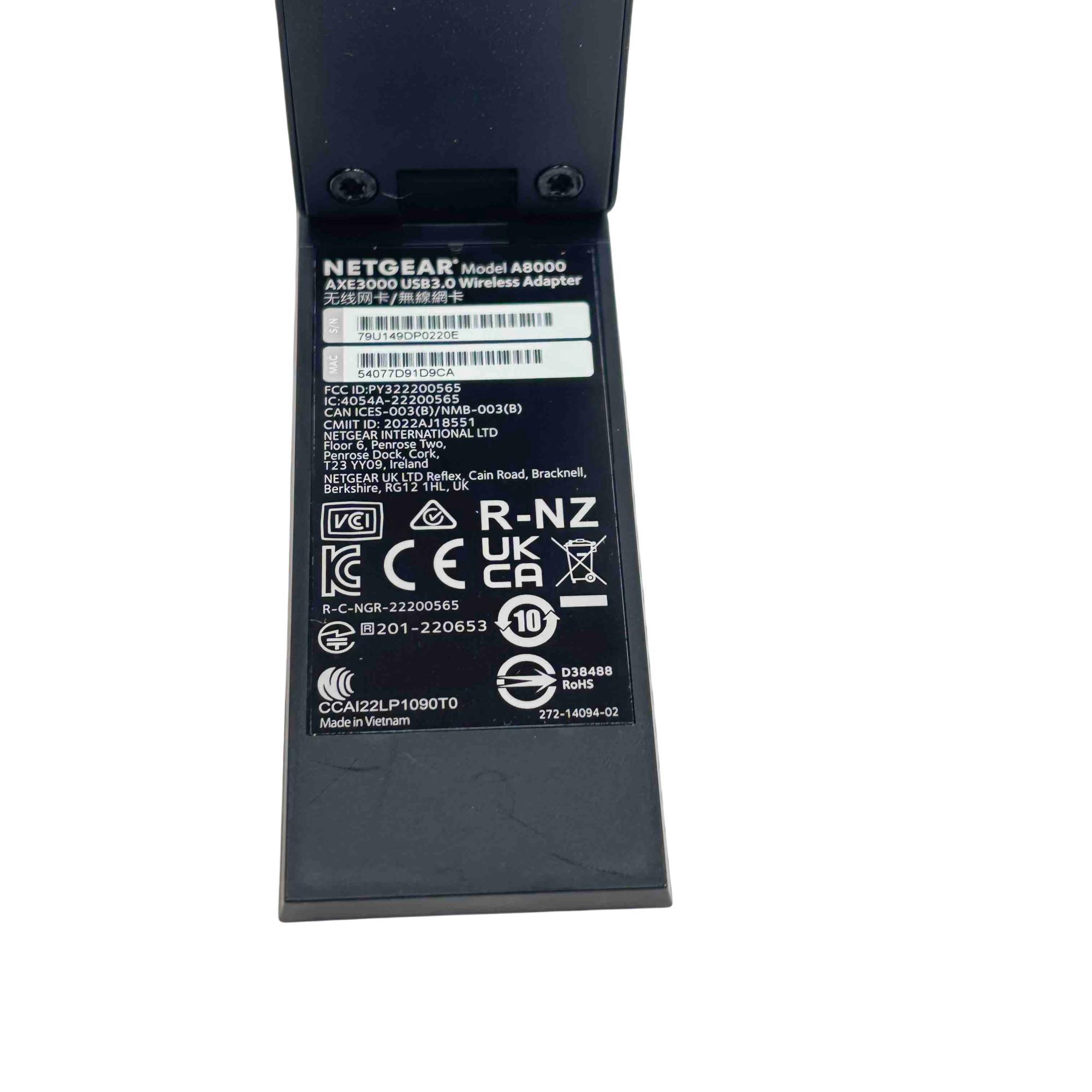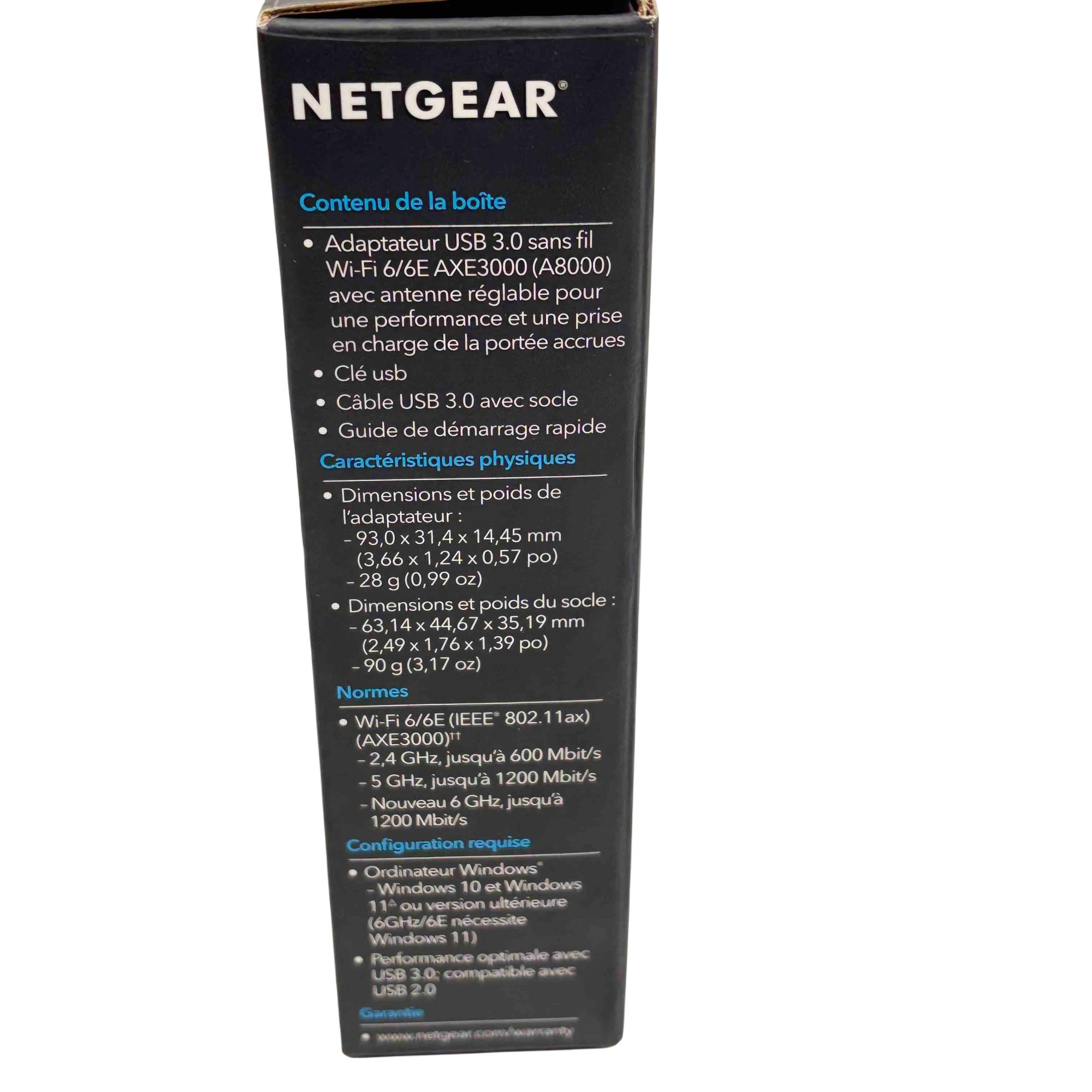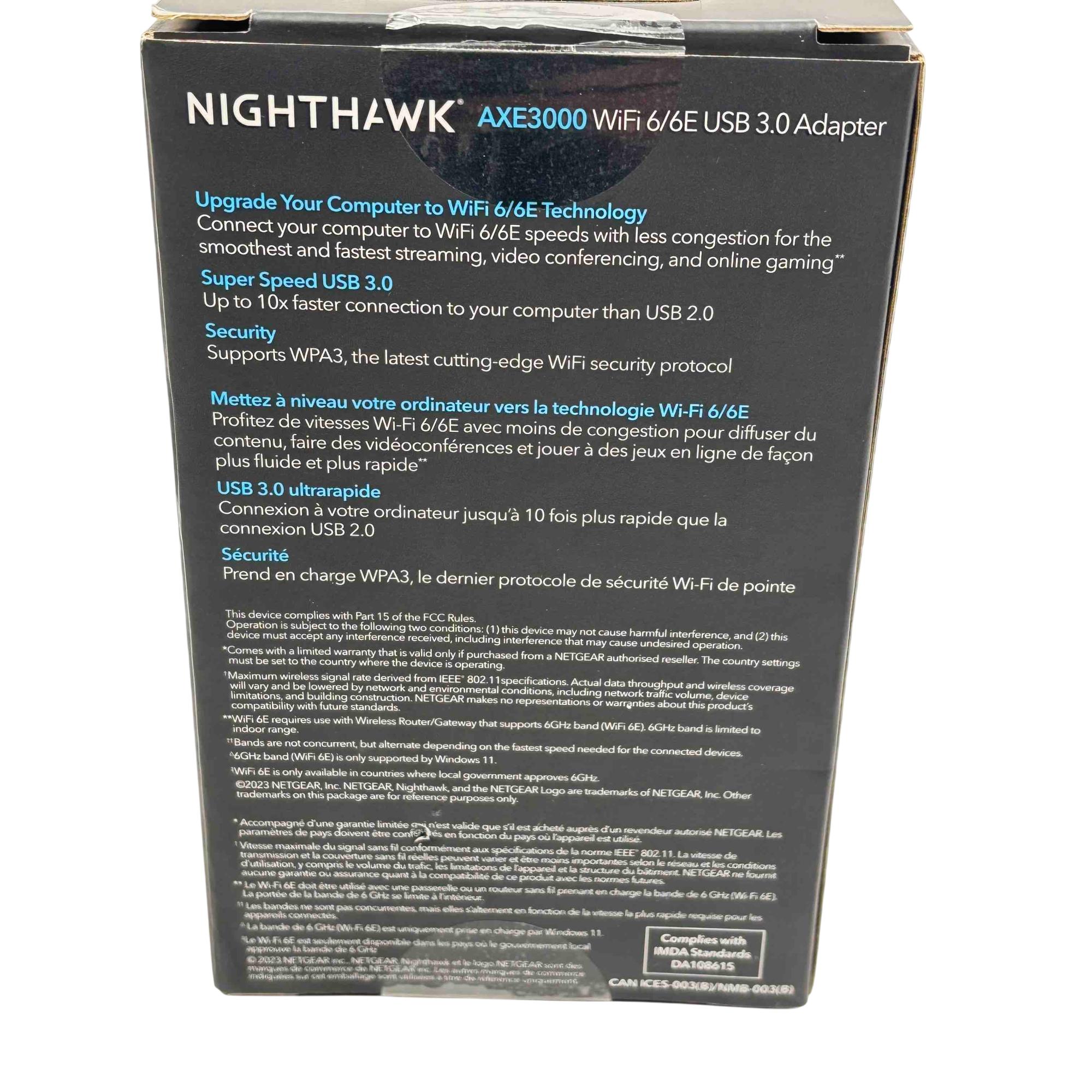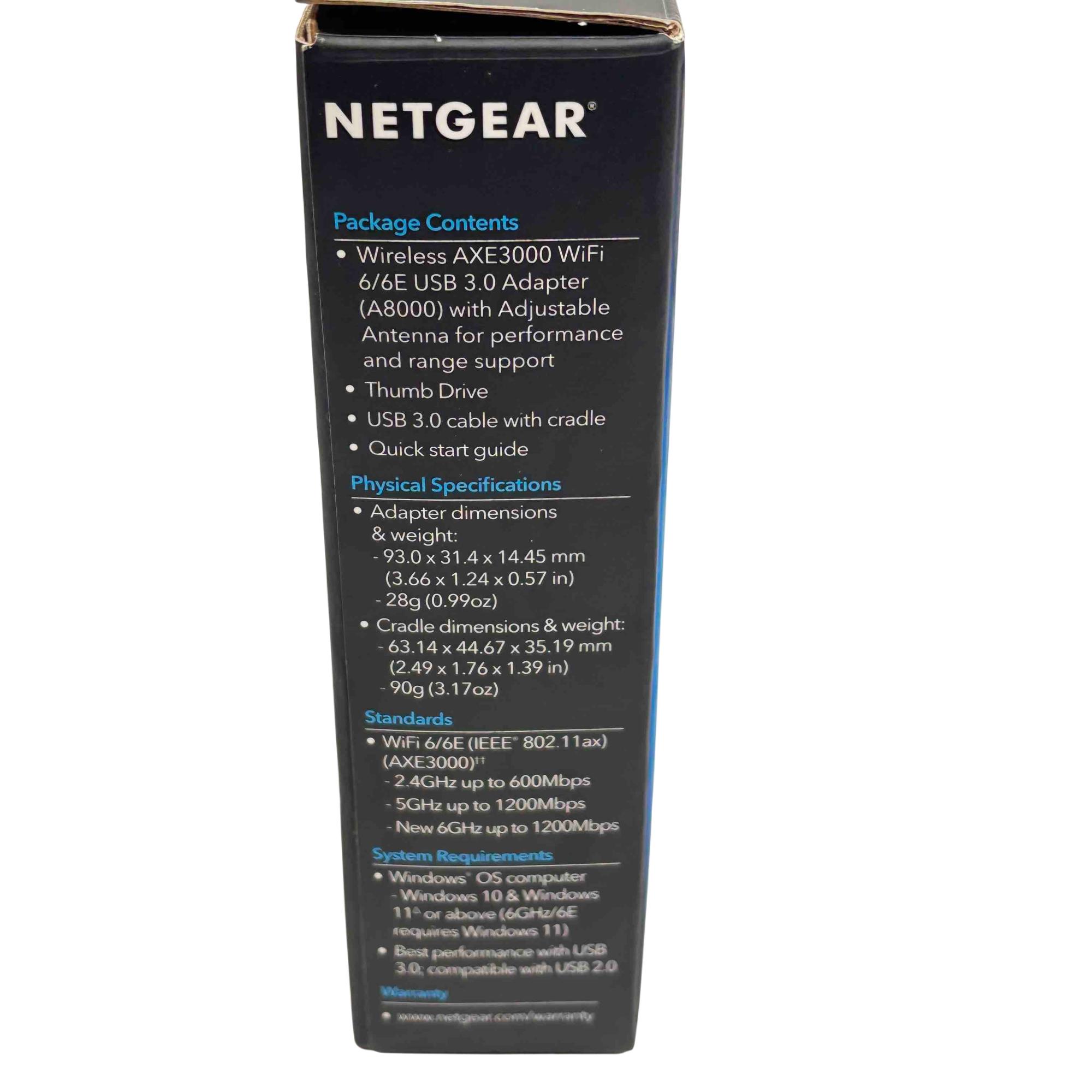 Upgrade your connectivity with the NETGEAR Nighthawk A8000 AXE3000 USB 3.0 Tri-Band WiFi 6E Adapter. Experience blazing-fast WiFi speeds for smoother streaming, seamless video conferencing, and enhanced online gaming. With its advanced WiFi 6E technology and support for the latest WPA3 security protocol, this device ensures you stay at the cutting edge of wireless performance.