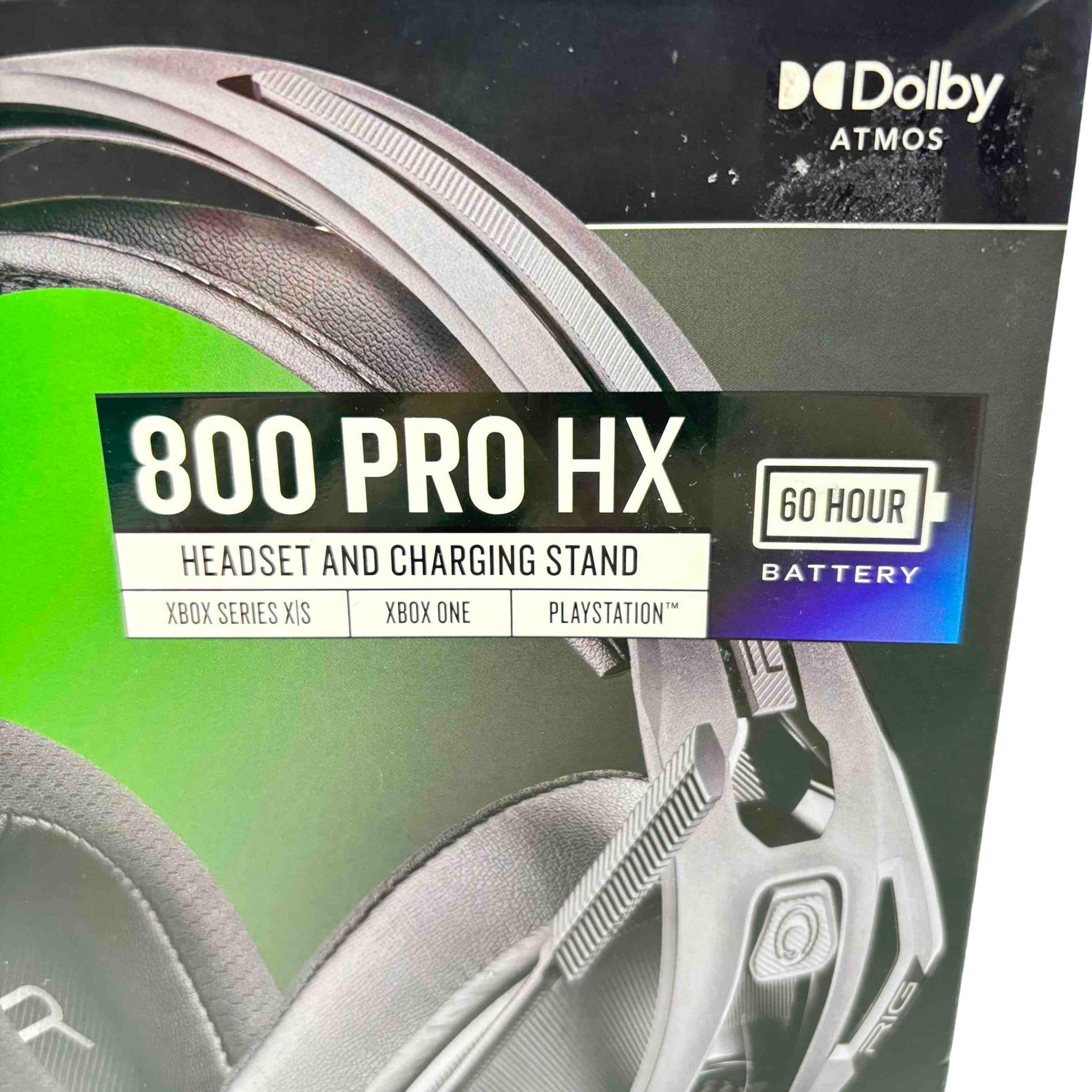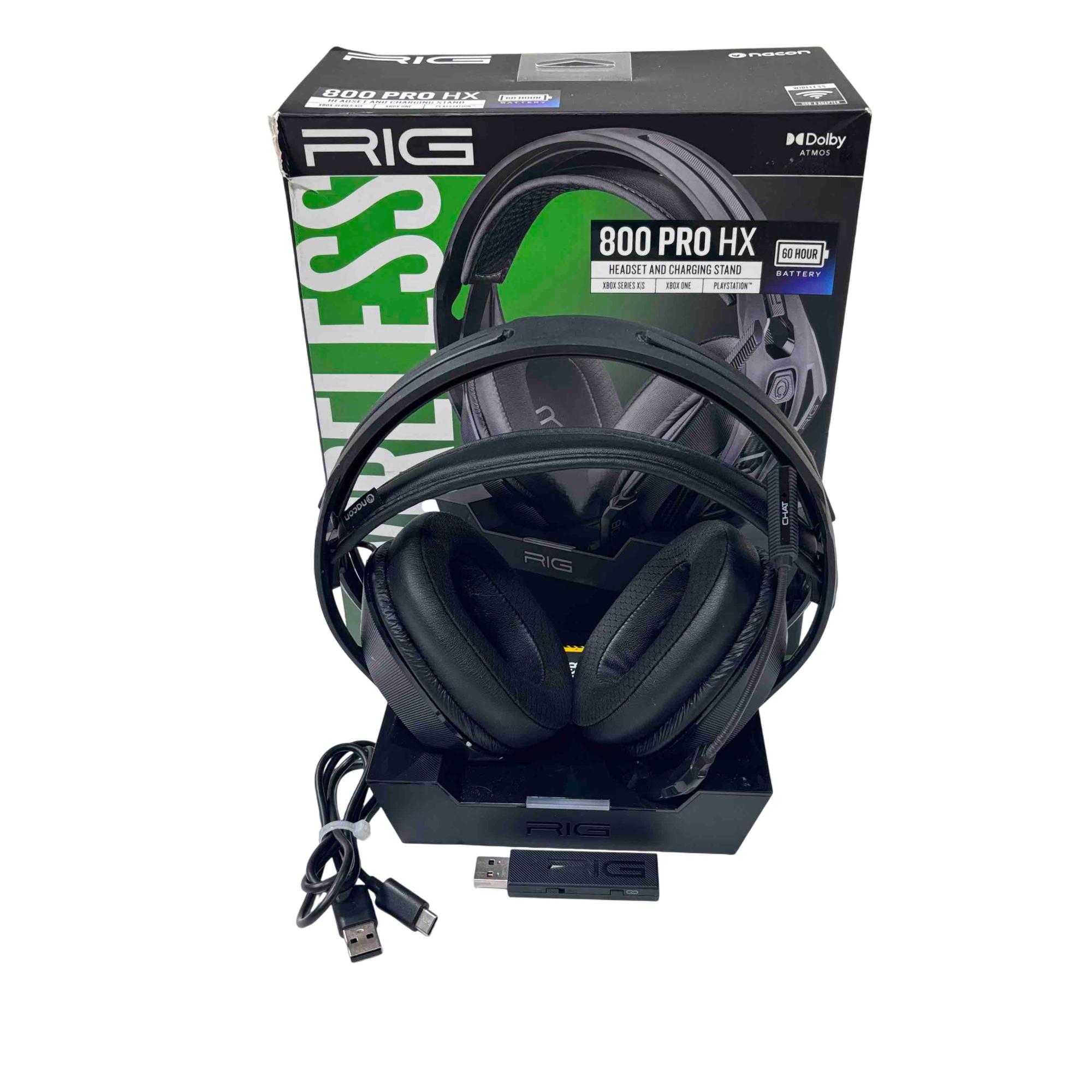 Nacon RIG 800 PRO HX Wireless Gaming Headset with Charging Stand for Xbox Series X|S, Xbox One, PlayStation delivers immersive Dolby Atmos audio with a lightweight, comfortable design. This black wireless headset features a multi-function charging stand and offers up to 60 hours of playtime, making it ideal for extended gaming sessions across multiple platforms.