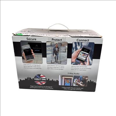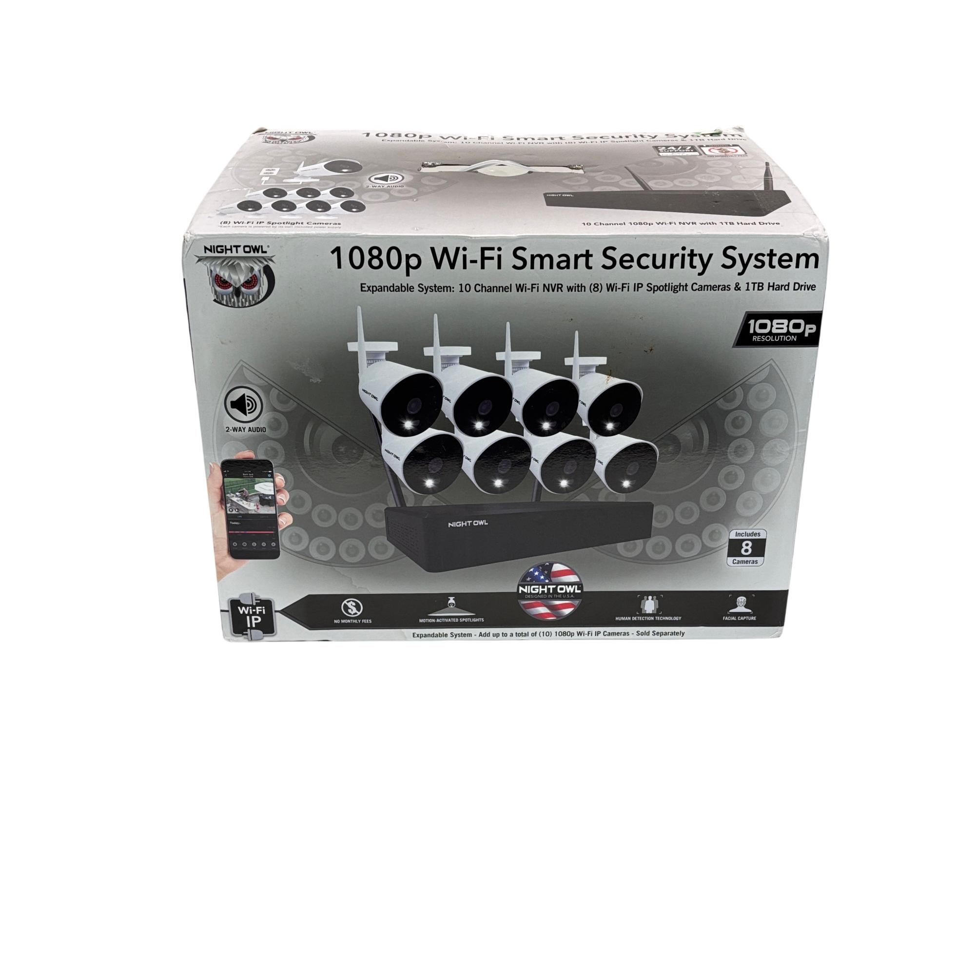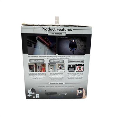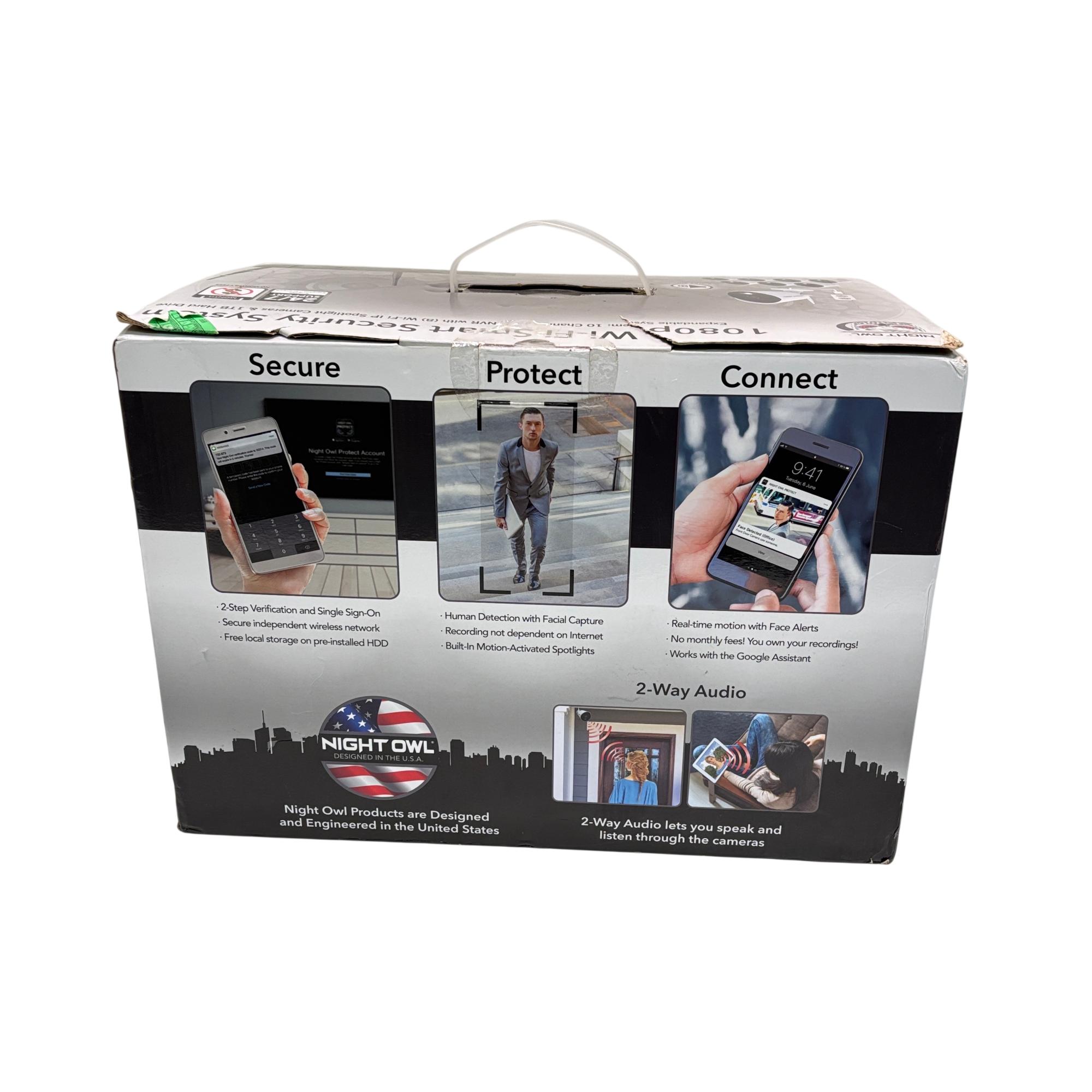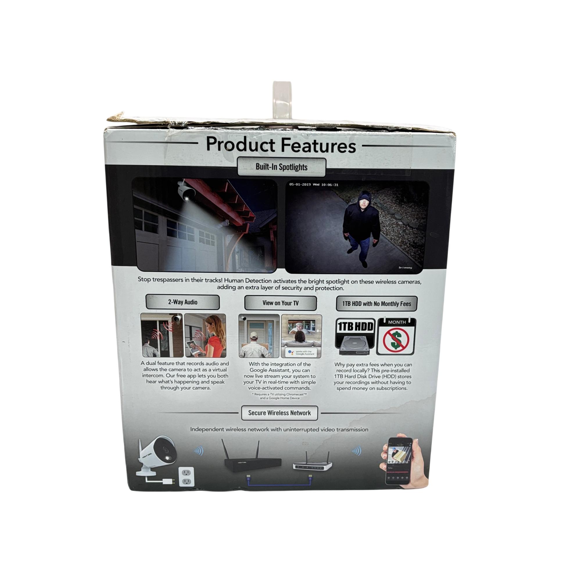 Night Owl 1080p Wi-Fi Smart Security System Model WCM-8PK-WNIP-2LTA-BS-CN4 features an advanced 10-channel NVR capable of supporting up to 10 wireless IP spotlight cameras. This system provides crystal-clear 1080p resolution video with motion-activated spotlights, human detection technology, and two-way audio for comprehensive home or business security. Equipped with a 1TB hard drive, it offers ample storage for continuous or scheduled recording in a scalable and easy-to-install wireless setup.