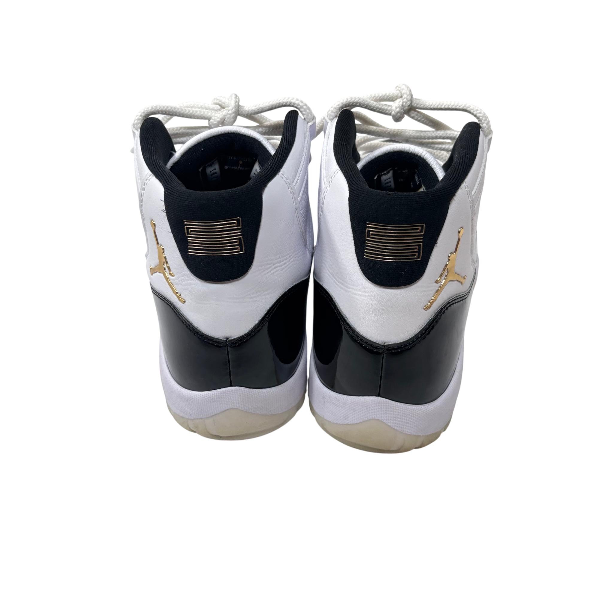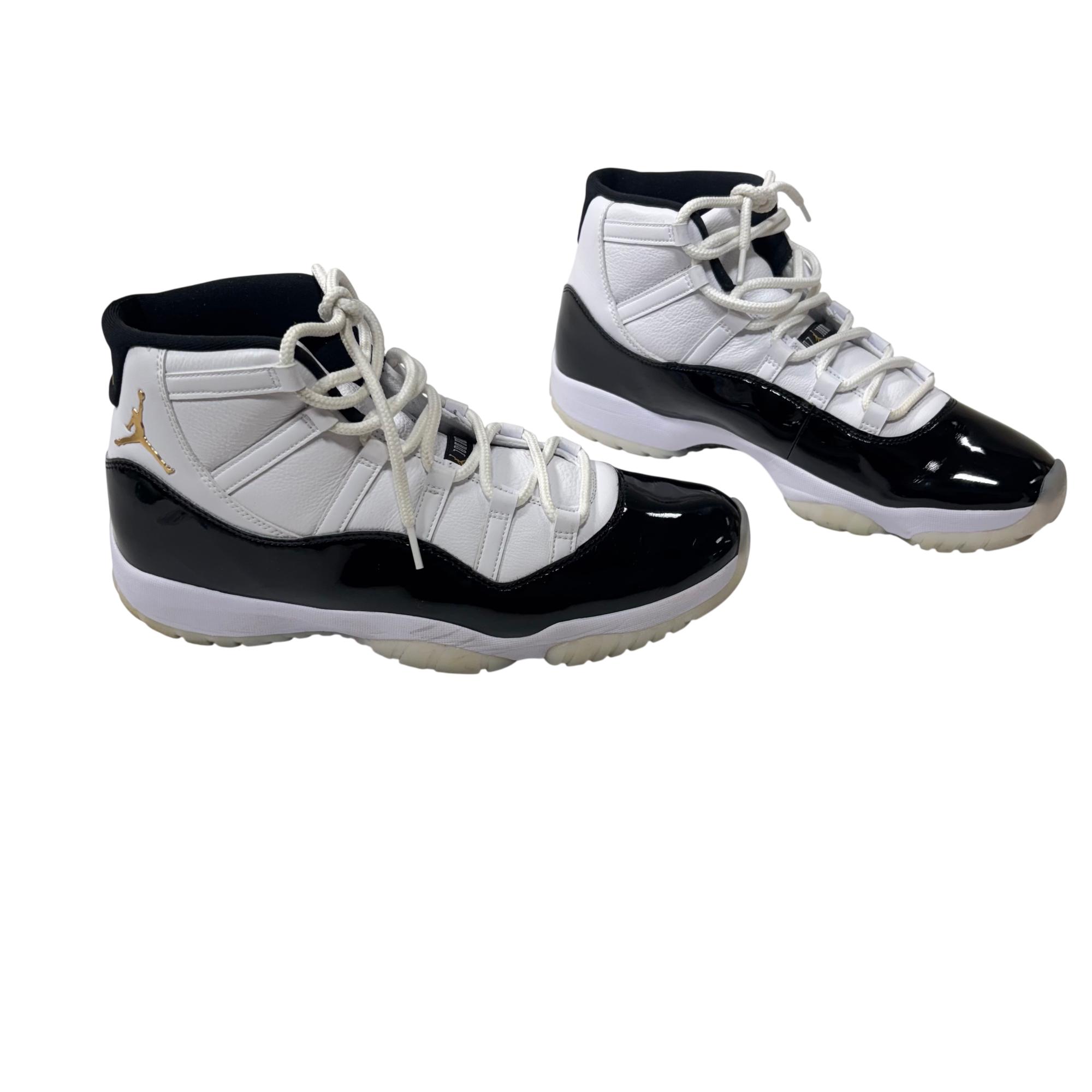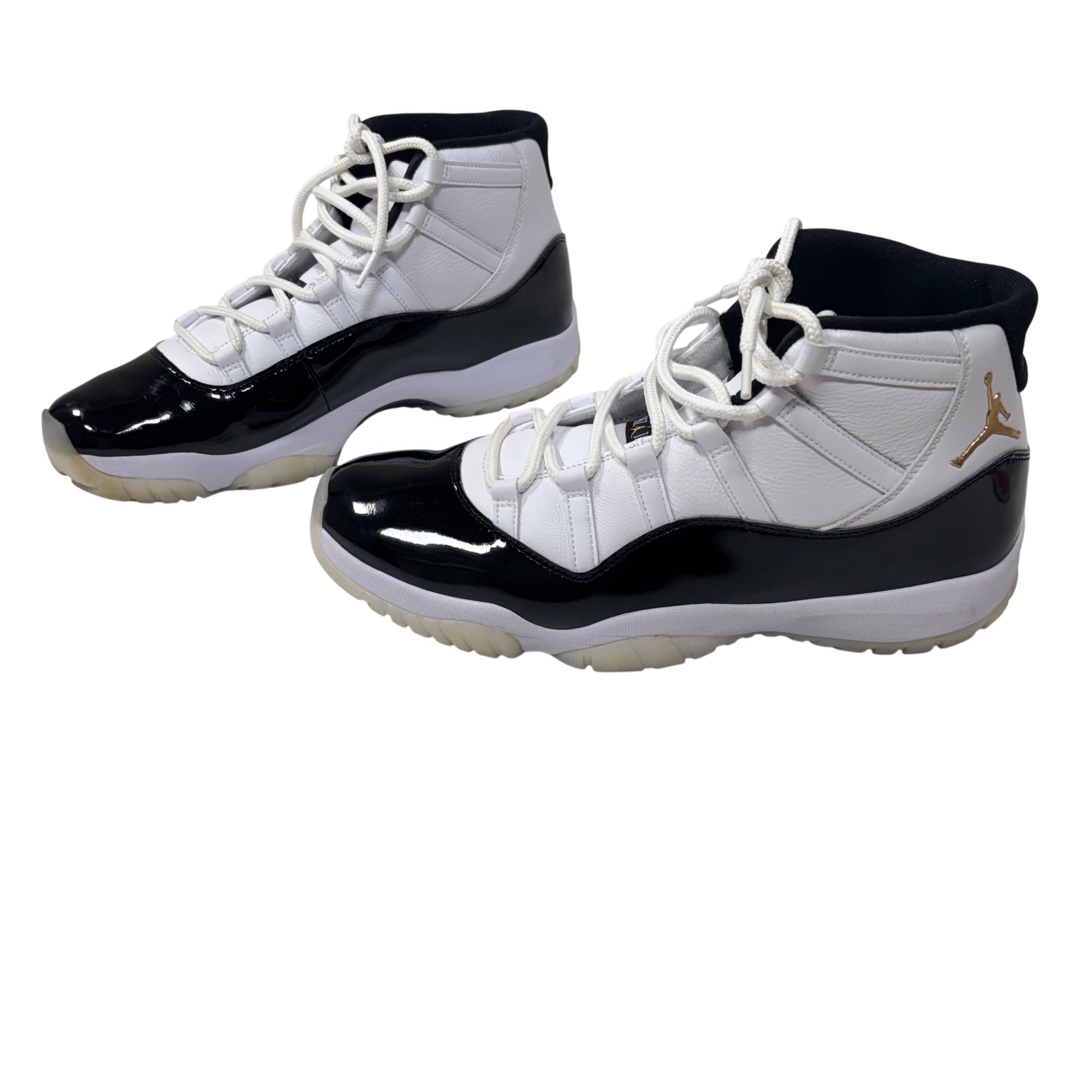 Nike Air Jordan 11 Retro Gratitude DMP CT8012-170 features a striking black and white colorway with premium leather and patent leather overlays. This high-top sneaker showcases a sleek design combined with a glossy finish and gold accents, reflecting its exclusive and commemorative style. Engineered for both performance and streetwear appeal, it stands out as a refined addition to any footwear collection.