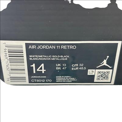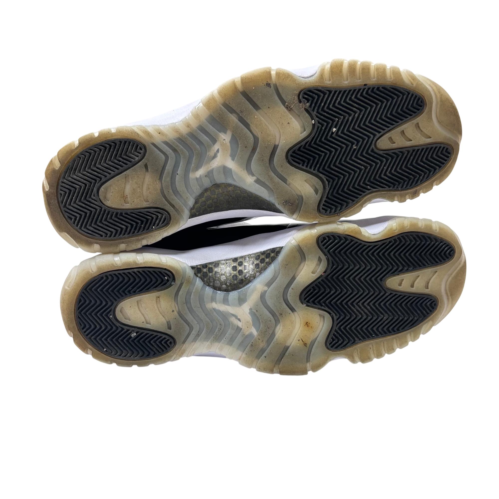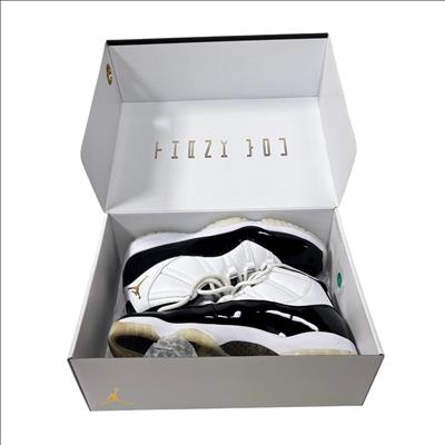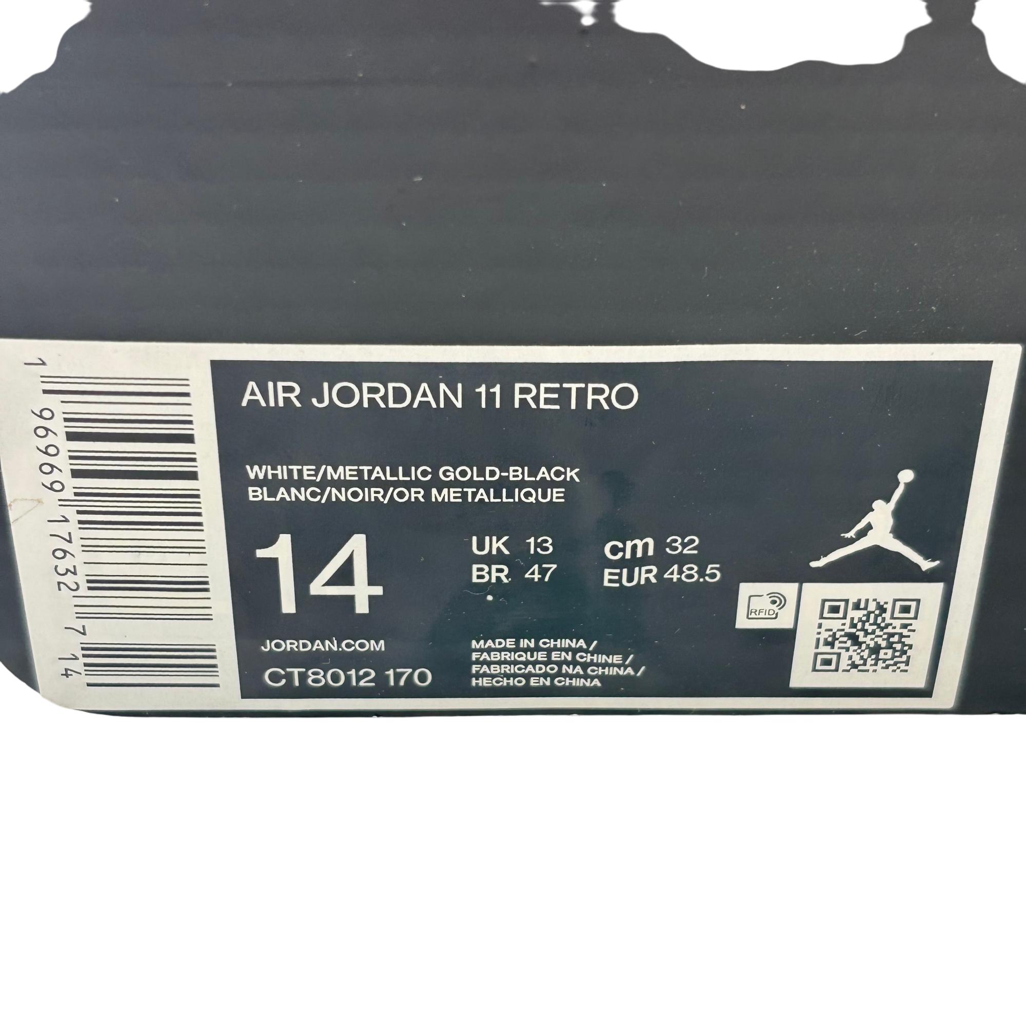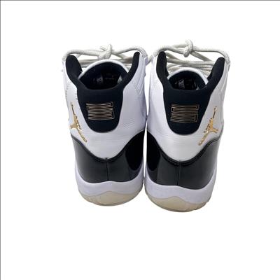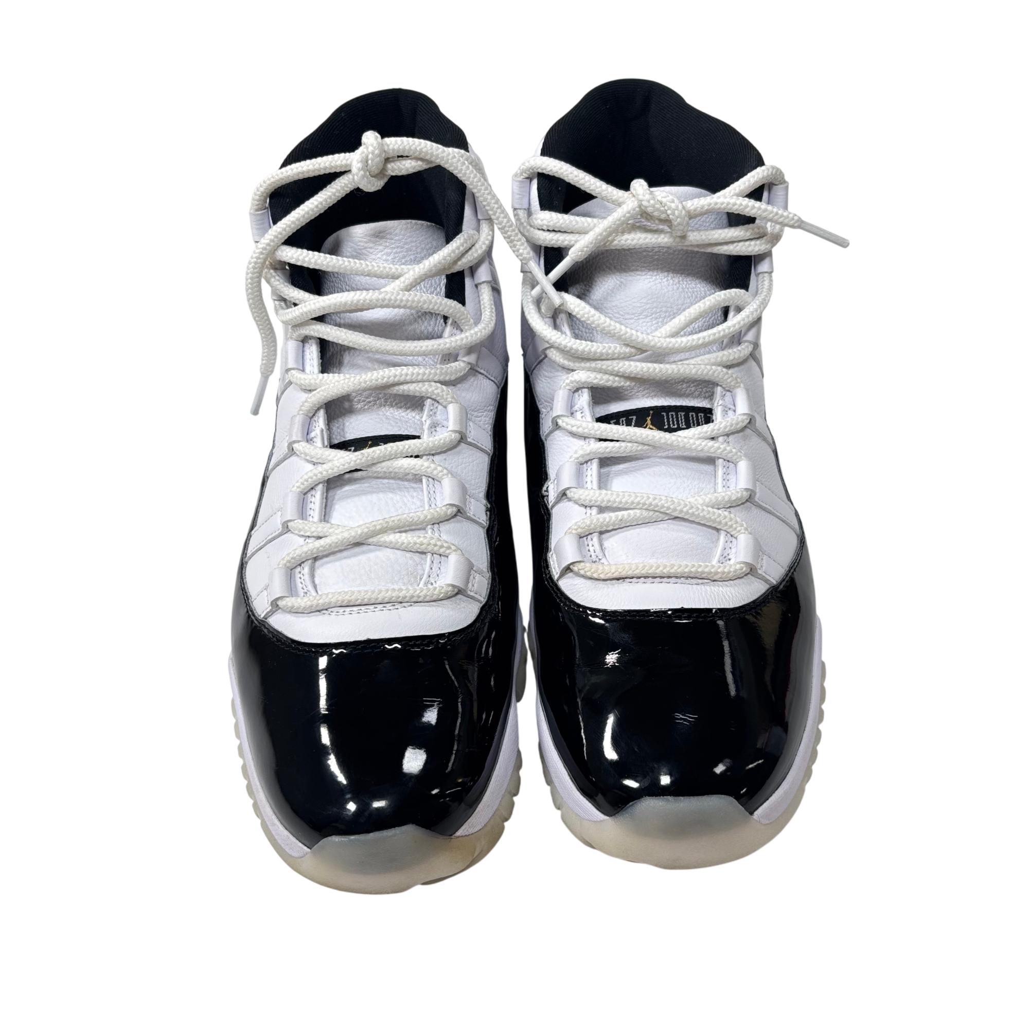 Nike Air Jordan 11 Retro Gratitude DMP CT8012-170 features a striking black and white colorway with premium leather and patent leather overlays. This high-top sneaker showcases a sleek design combined with a glossy finish and gold accents, reflecting its exclusive and commemorative style. Engineered for both performance and streetwear appeal, it stands out as a refined addition to any footwear collection.
