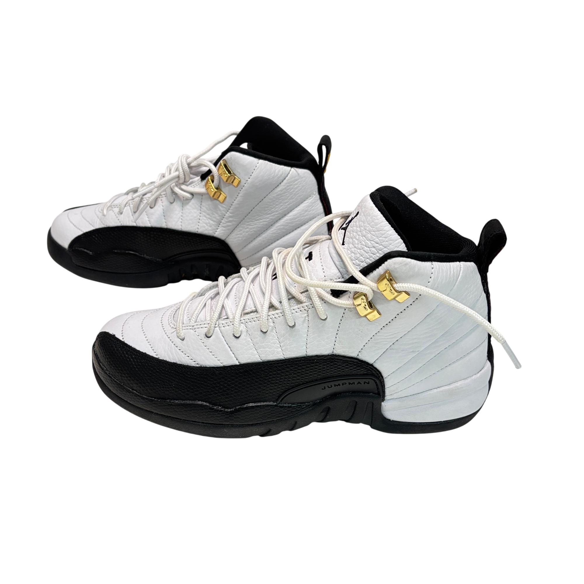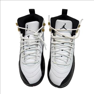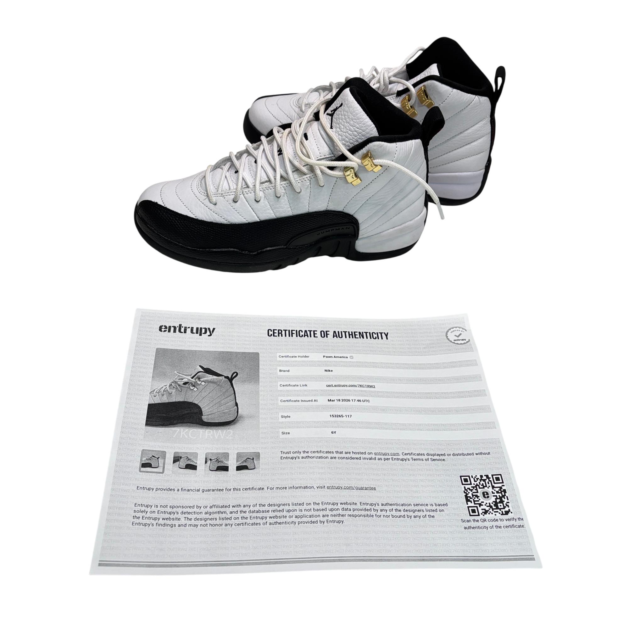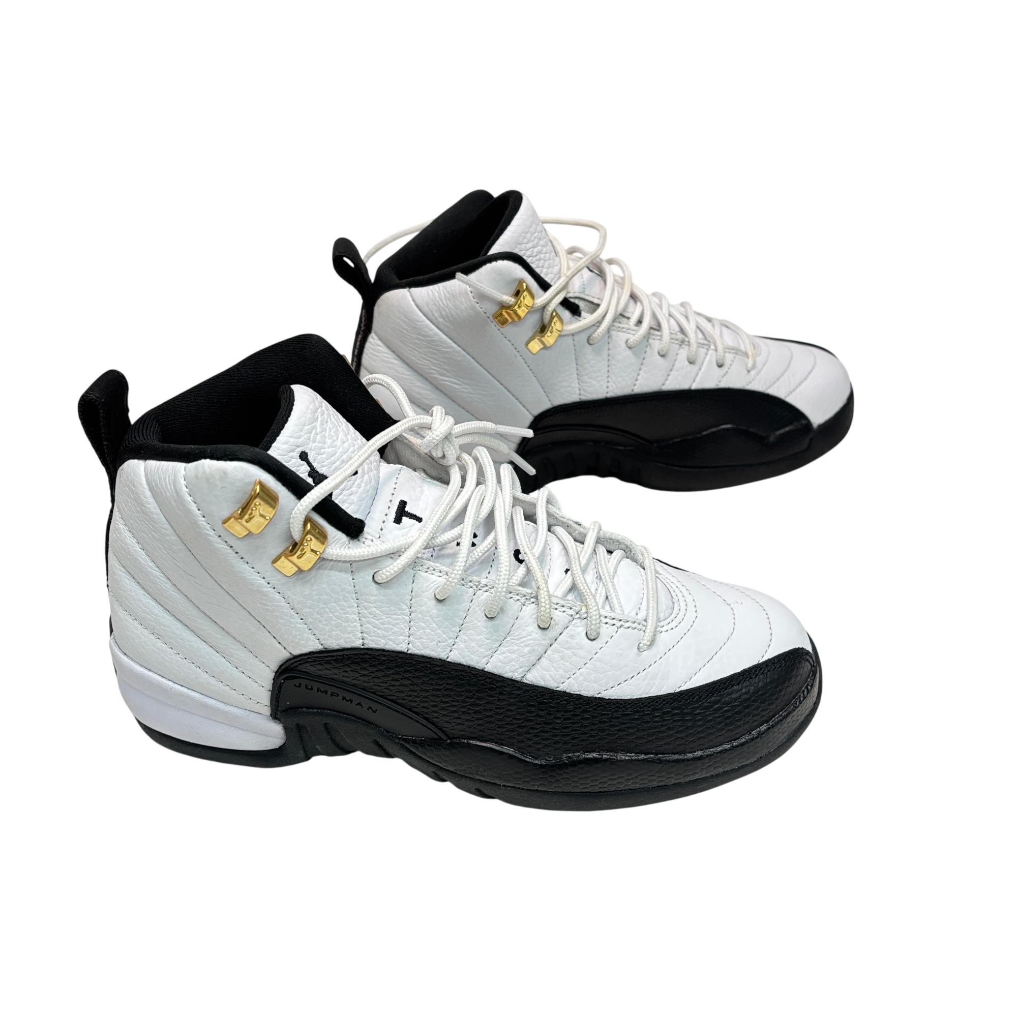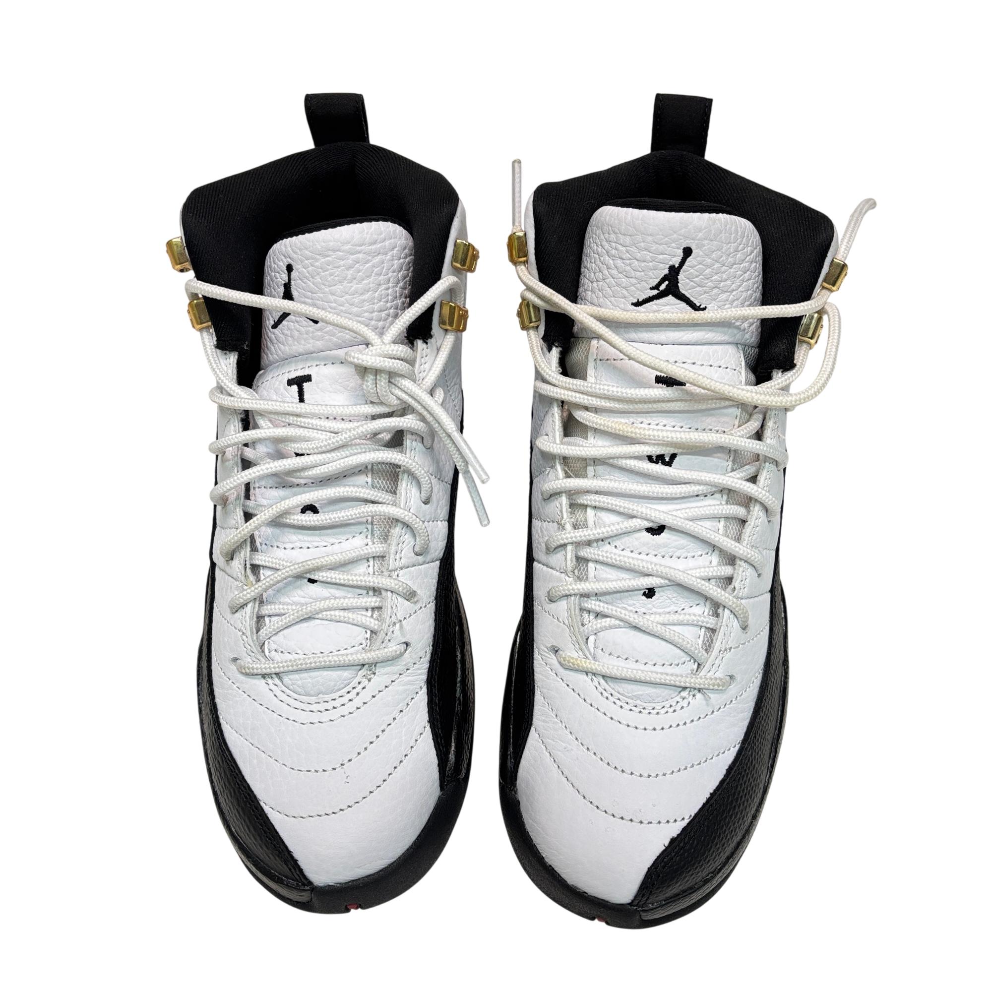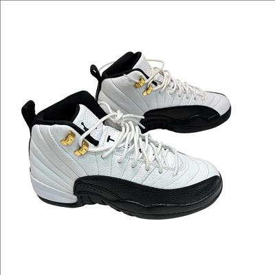 Nike Air Jordan 12 Retro Taxi (Model 153265-117) Size 7Y features a striking white and black colorway that combines classic design with modern athletic performance. This high-top sneaker showcases premium materials and distinct stitching details, making it a standout choice for basketball enthusiasts and sneaker collectors alike.