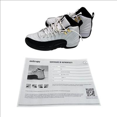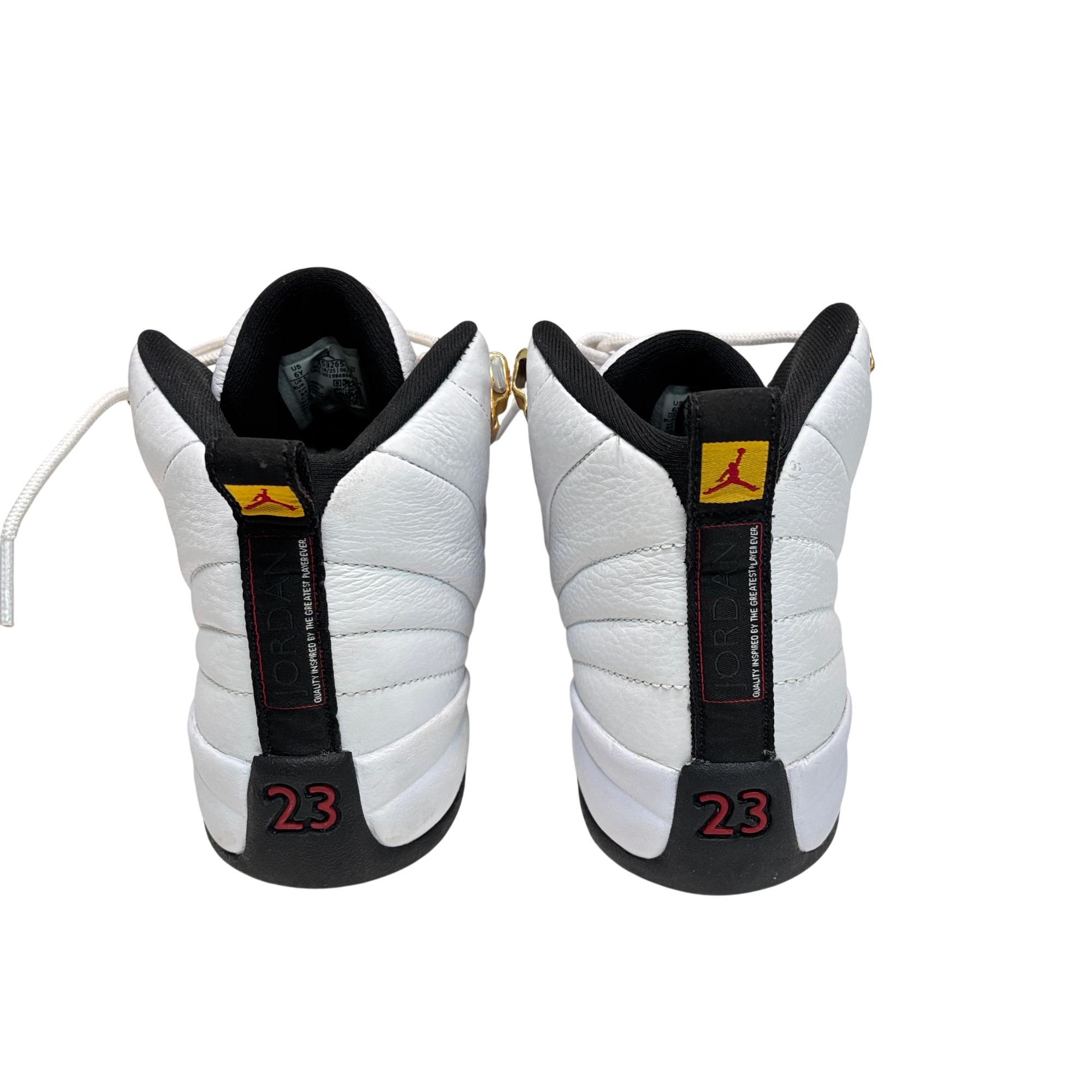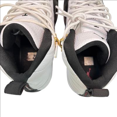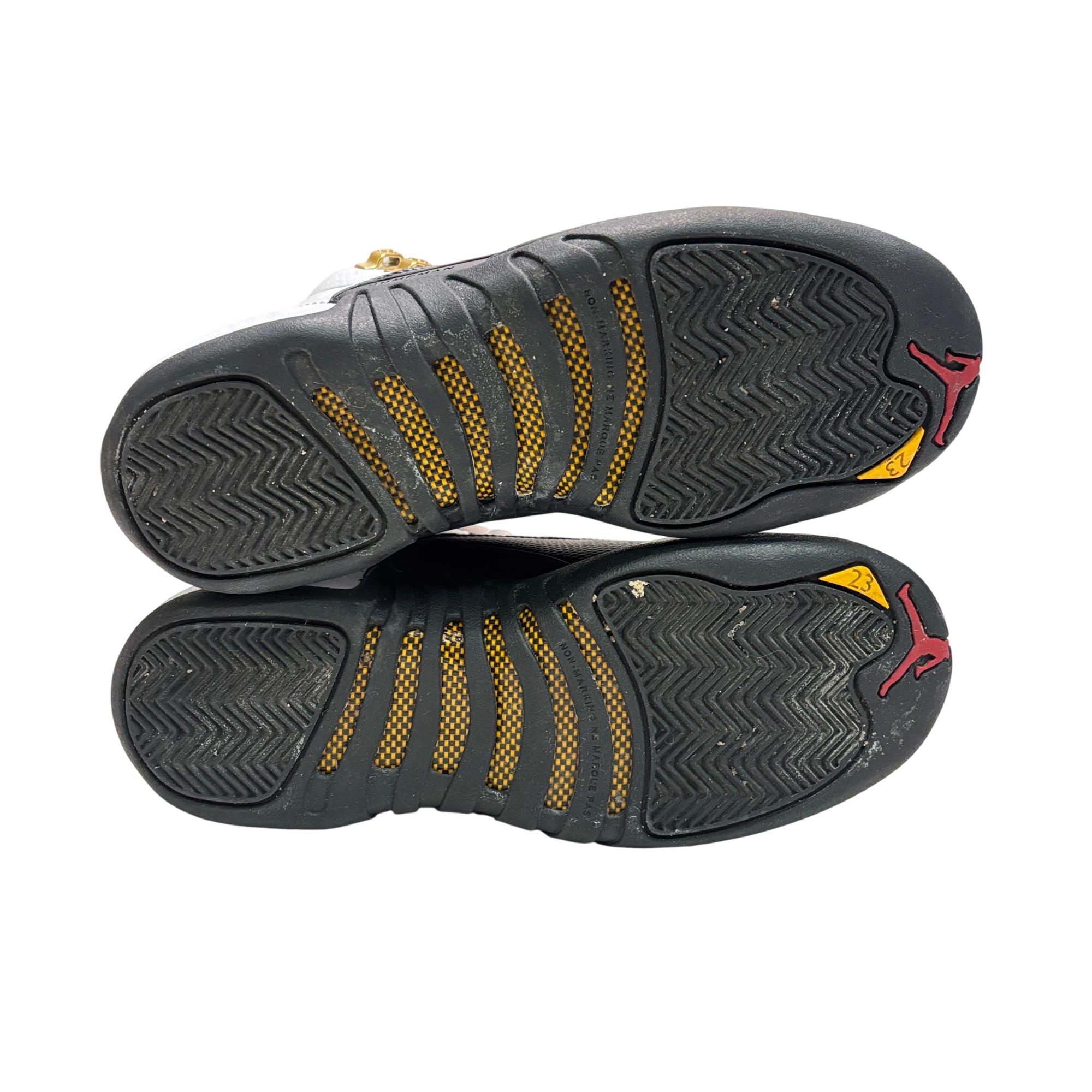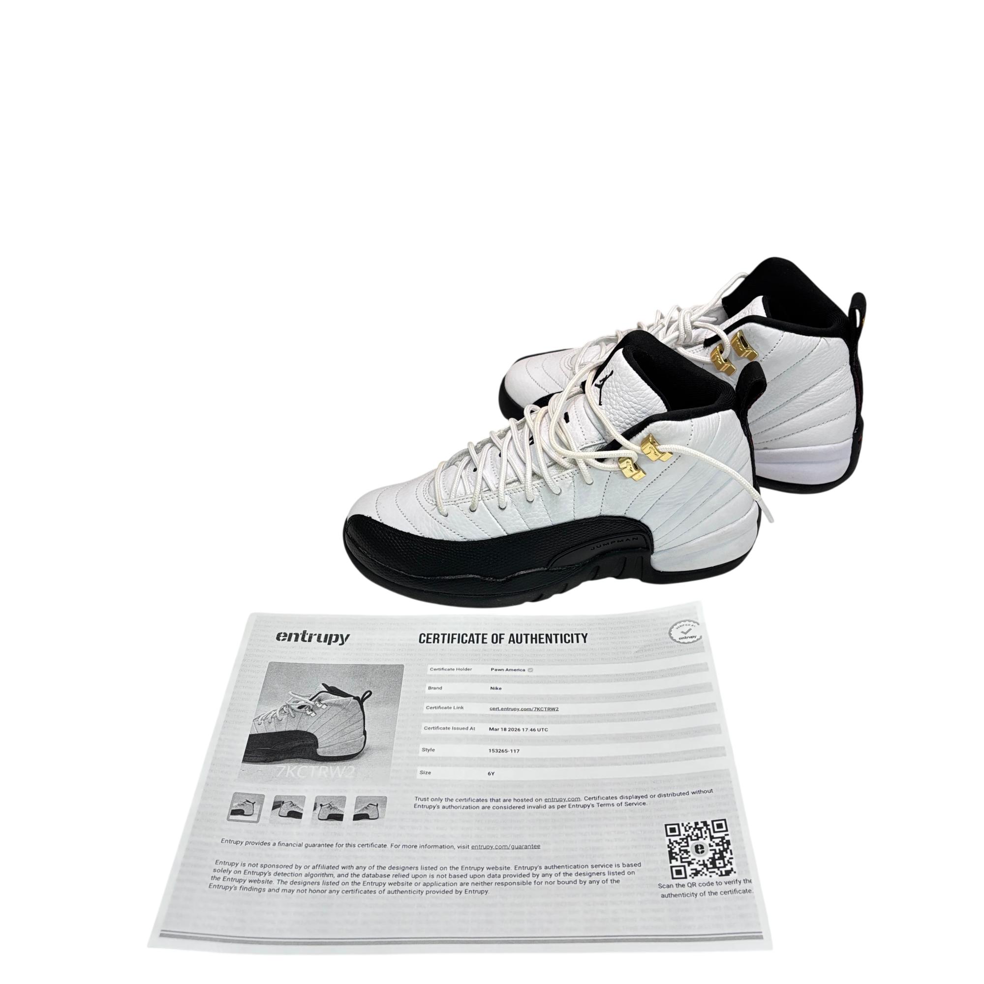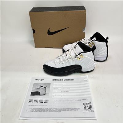 Nike Air Jordan 12 Retro Taxi (Model 153265-117) Size 7Y features a striking white and black colorway that combines classic design with modern athletic performance. This high-top sneaker showcases premium materials and distinct stitching details, making it a standout choice for basketball enthusiasts and sneaker collectors alike.