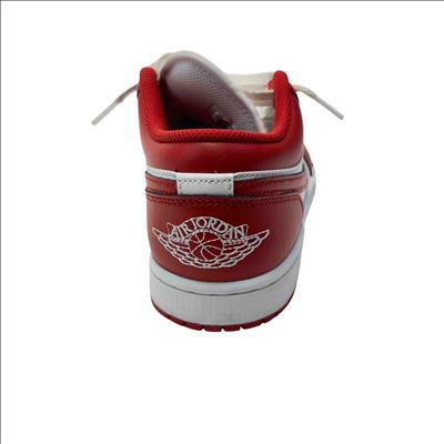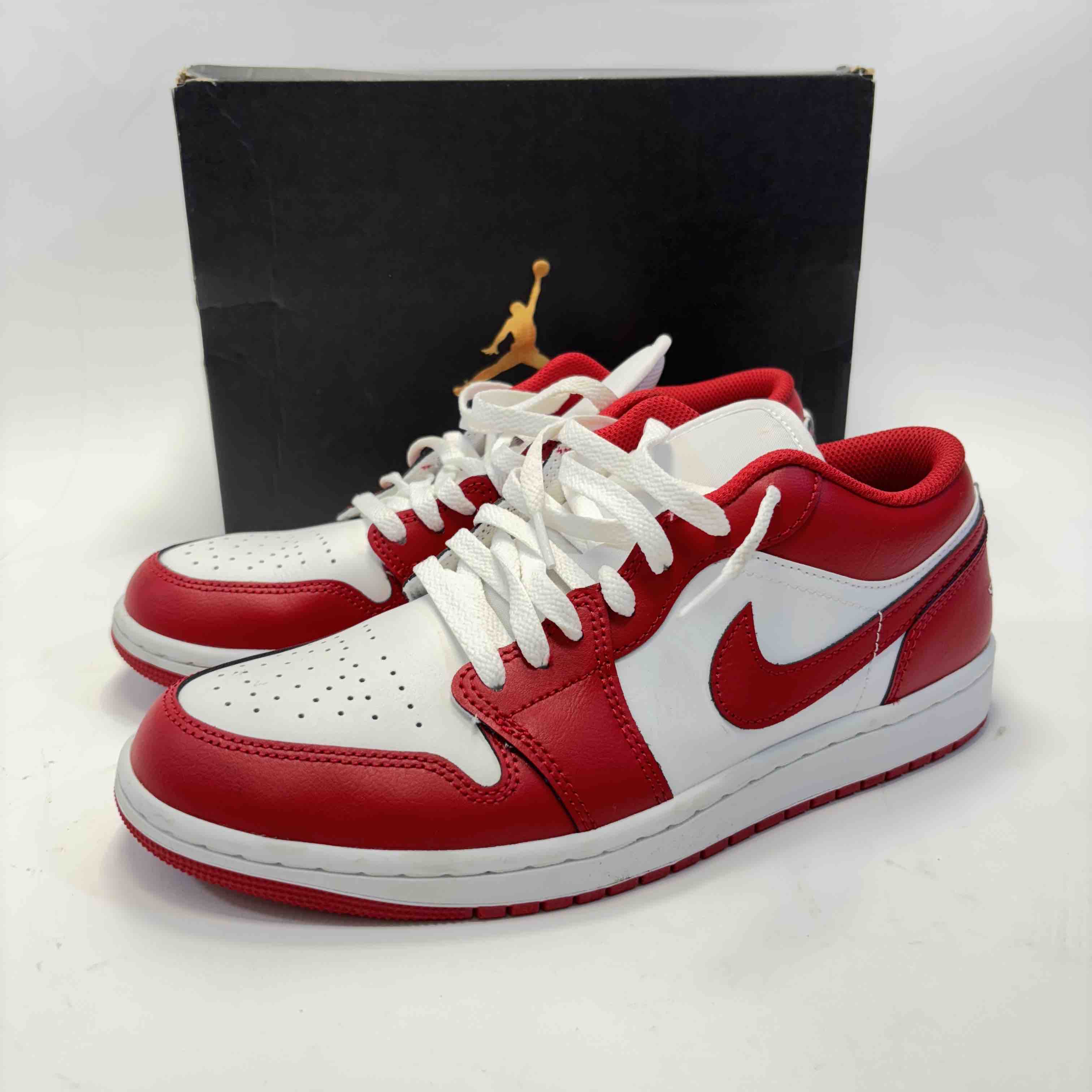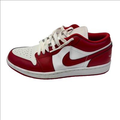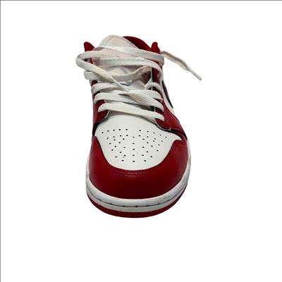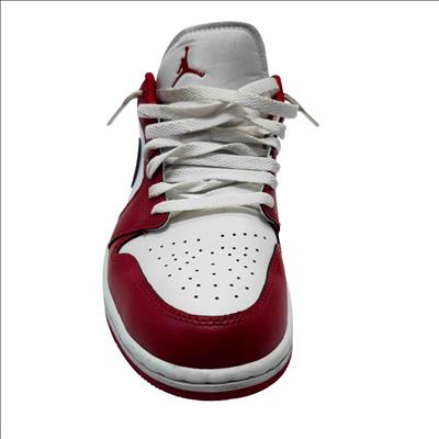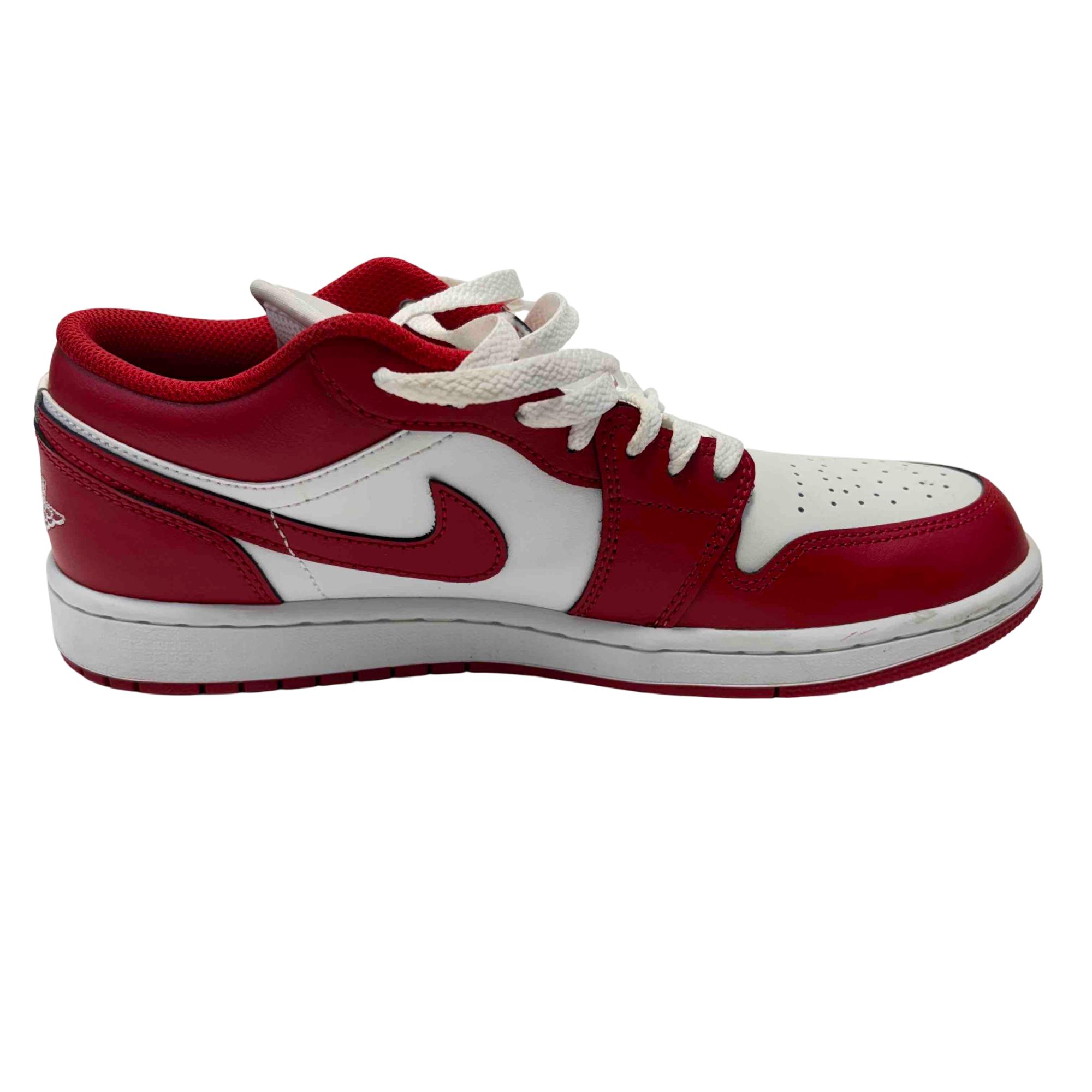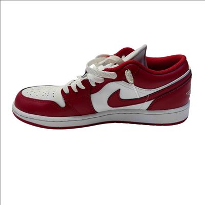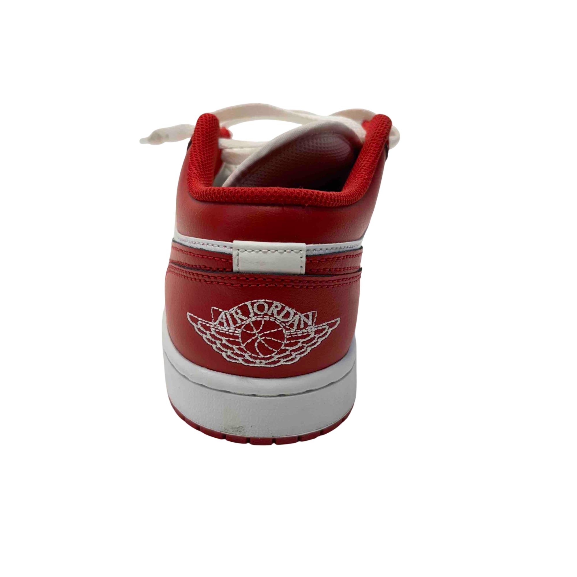 Nike Air Jordan 1 Low Gym Red/White 553558-166 features a classic low-top silhouette with a striking red and white leather upper. These iconic sneakers showcase a durable rubber sole with a circular traction pattern, perfect for basketball and casual wear. Designed for style and performance, they combine vibrant Gym Red accents with clean white tones for a timeless look.
