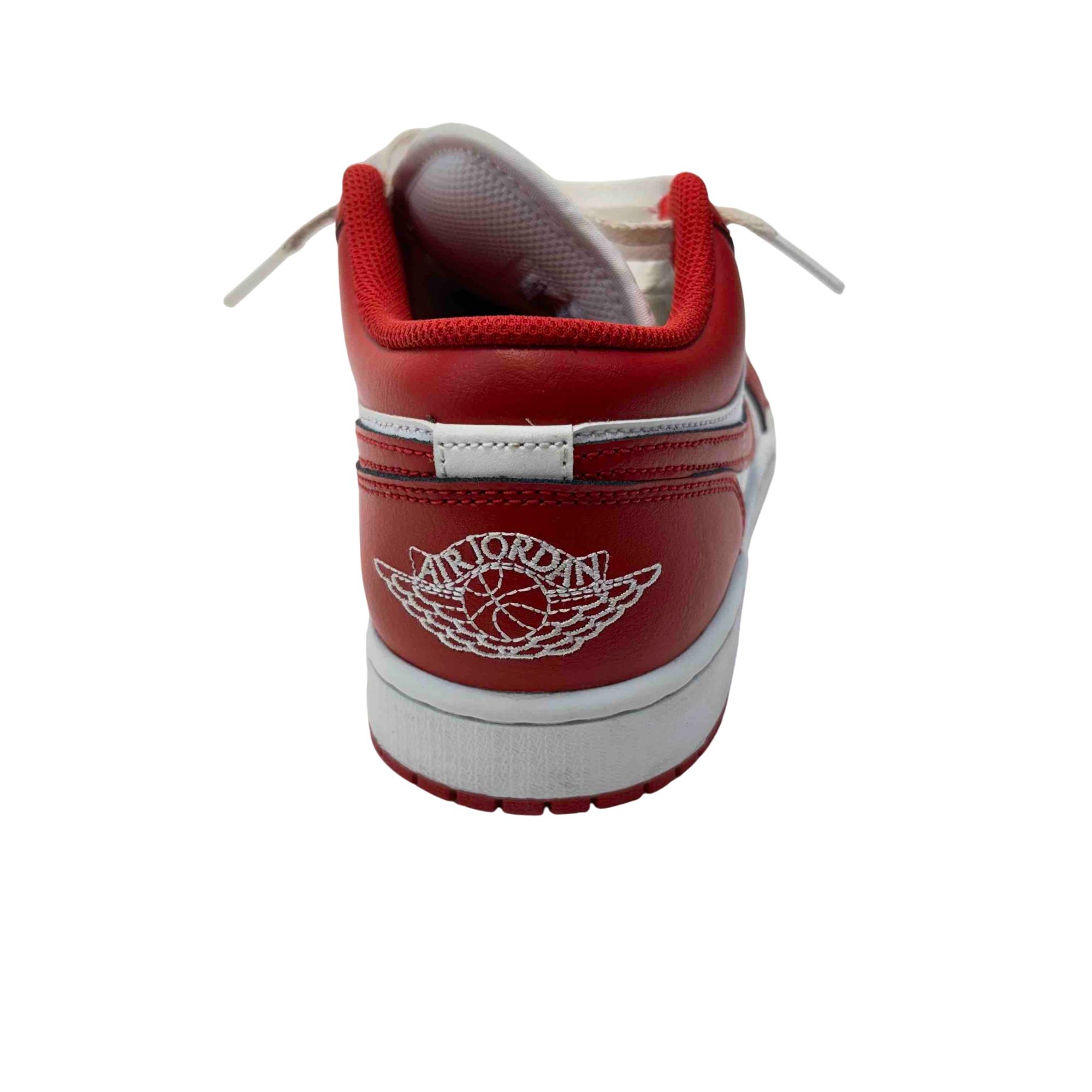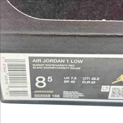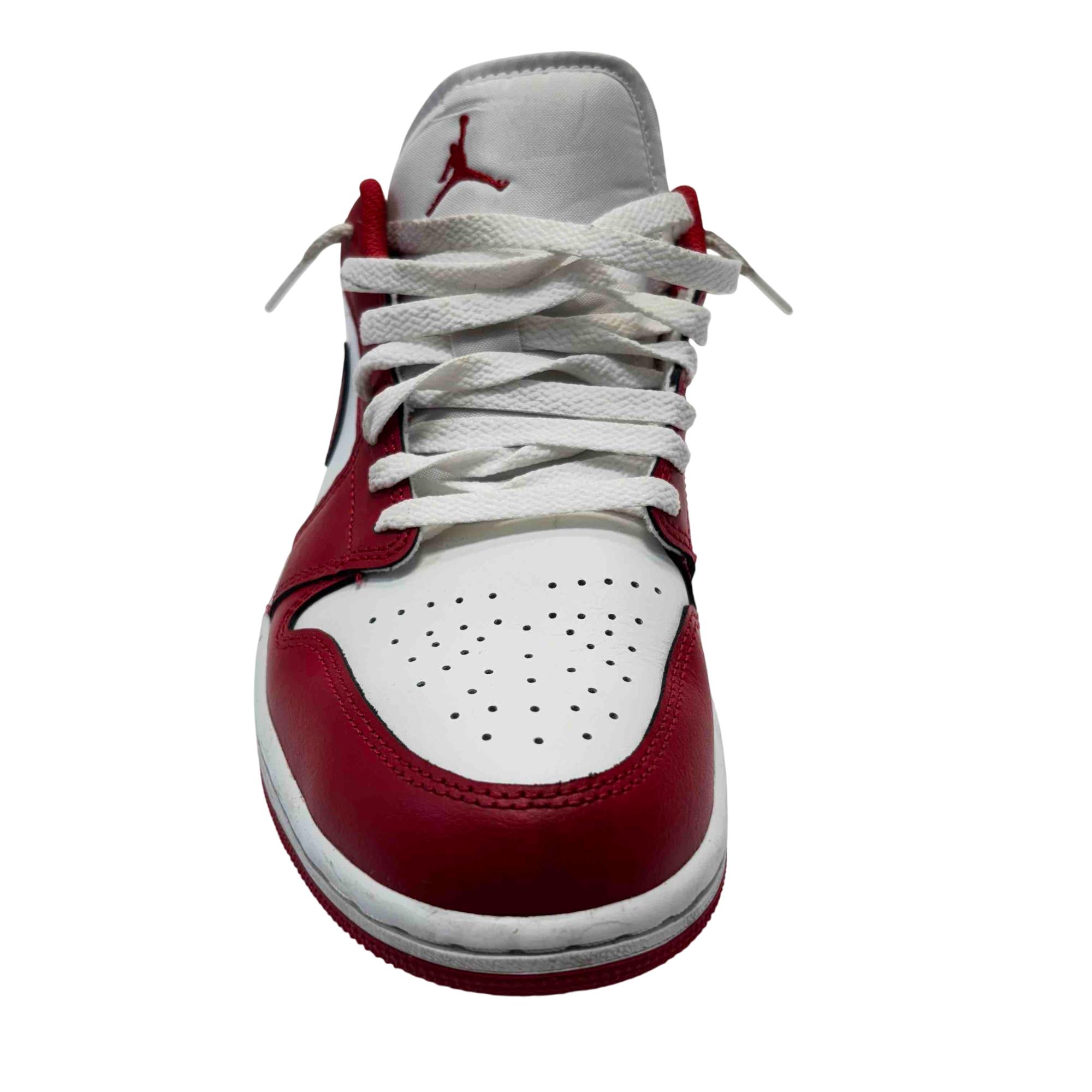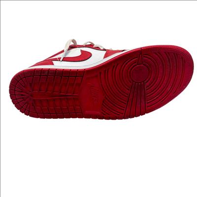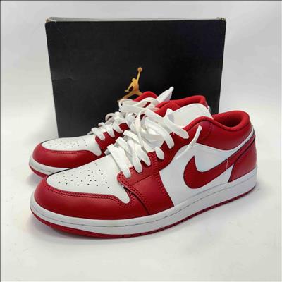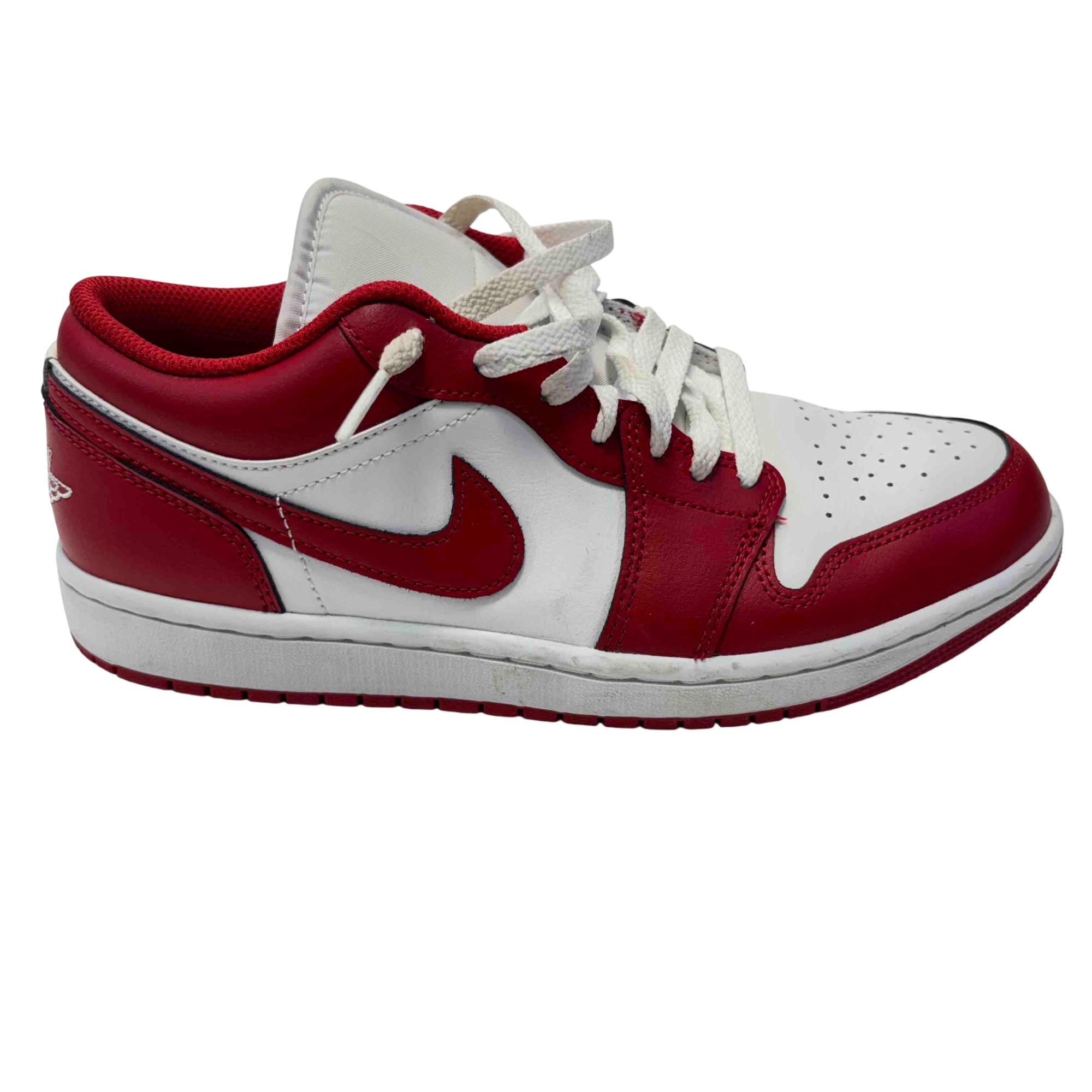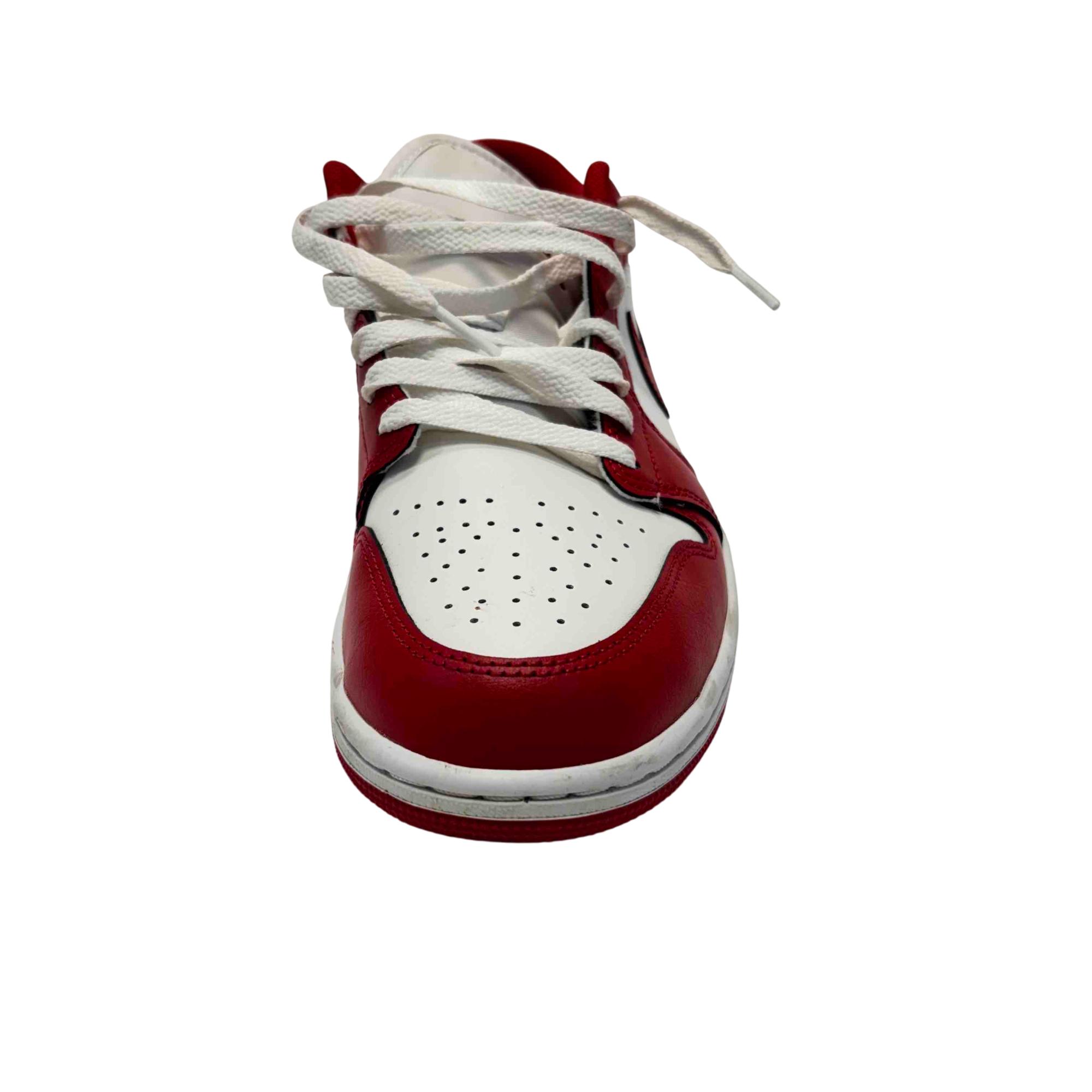 Nike Air Jordan 1 Low Gym Red/White 553558-166 features a classic low-top silhouette with a striking red and white leather upper. These iconic sneakers showcase a durable rubber sole with a circular traction pattern, perfect for basketball and casual wear. Designed for style and performance, they combine vibrant Gym Red accents with clean white tones for a timeless look.