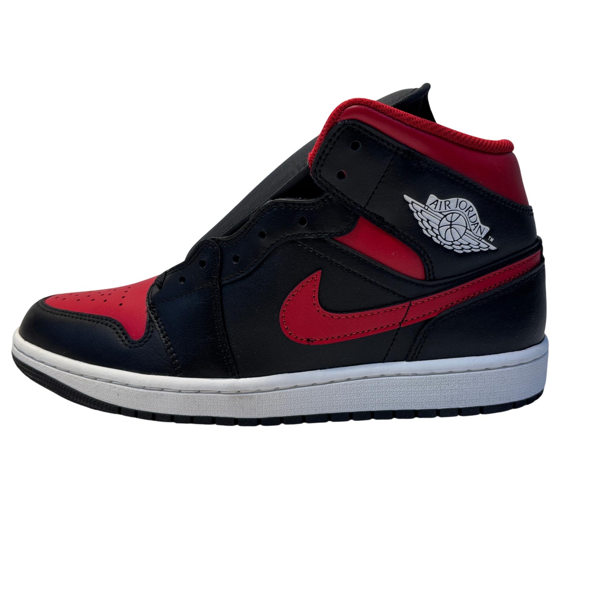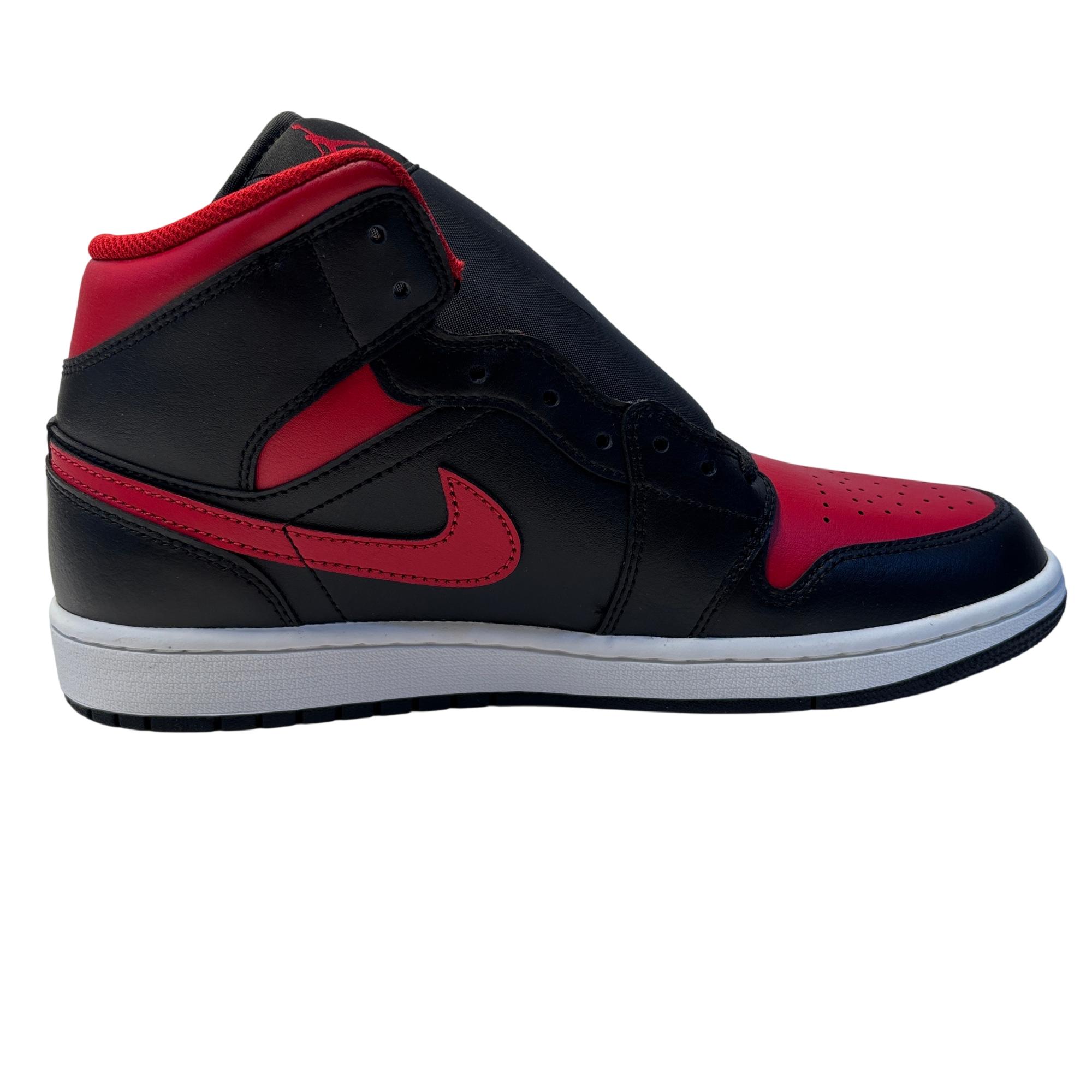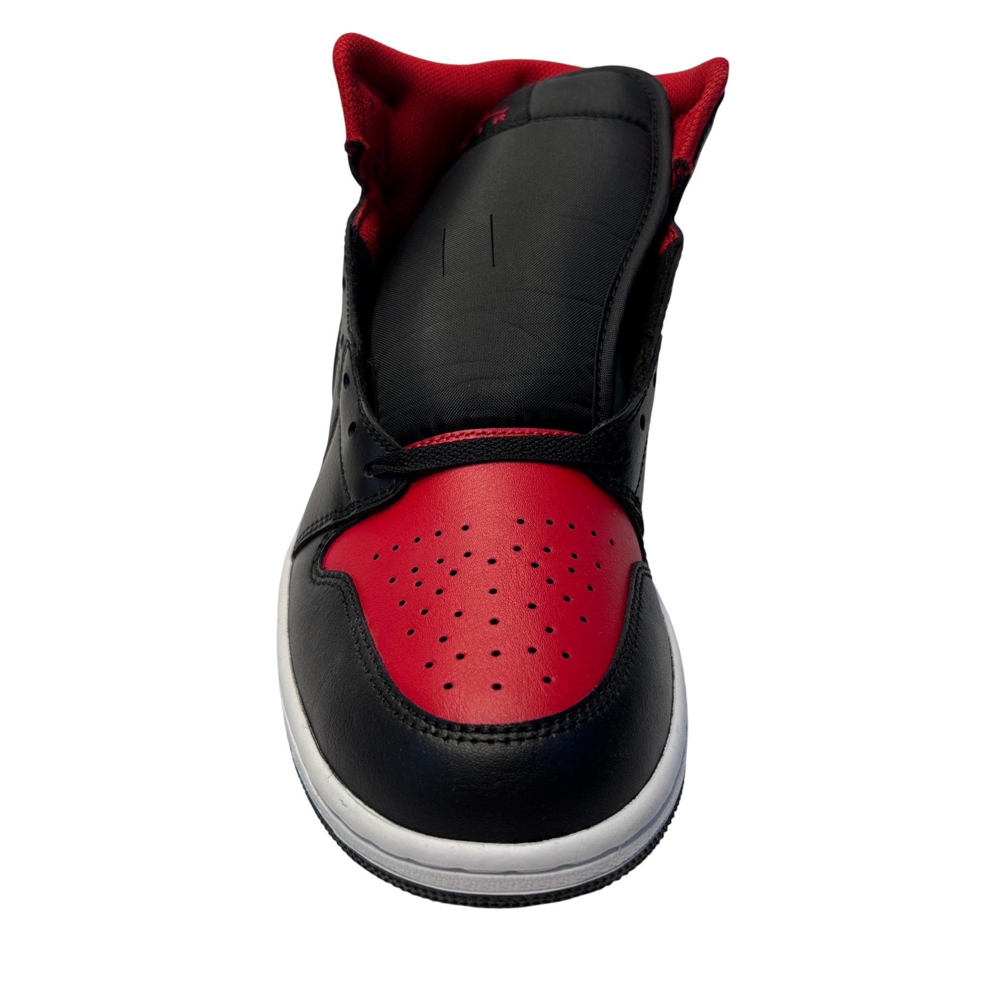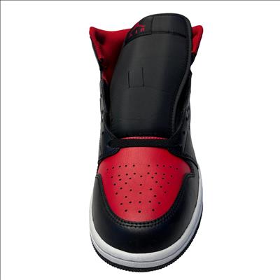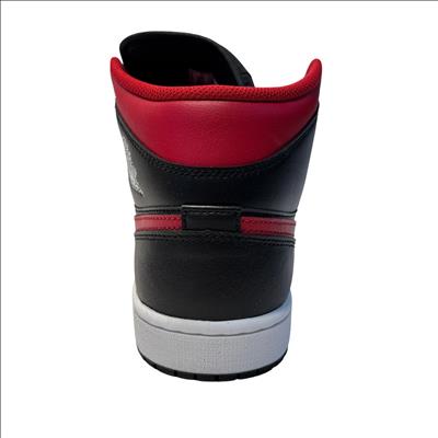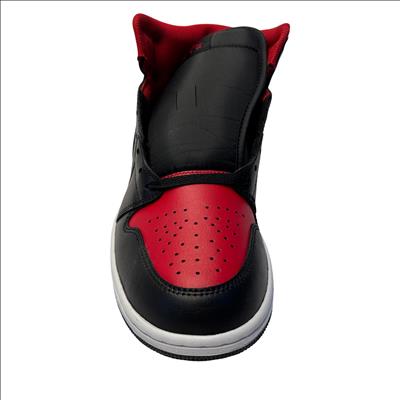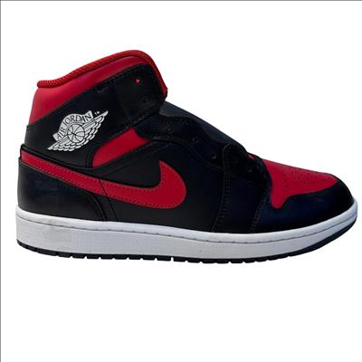 The Nike Air Jordan 1 Mid Bred Twist features a distinctive design that combines red and black leather with subtle white accents, creating a striking contrast. This midsize sneaker offers a classic silhouette with premium materials for durability and style, making it a versatile choice for both casual wear and athletic use.