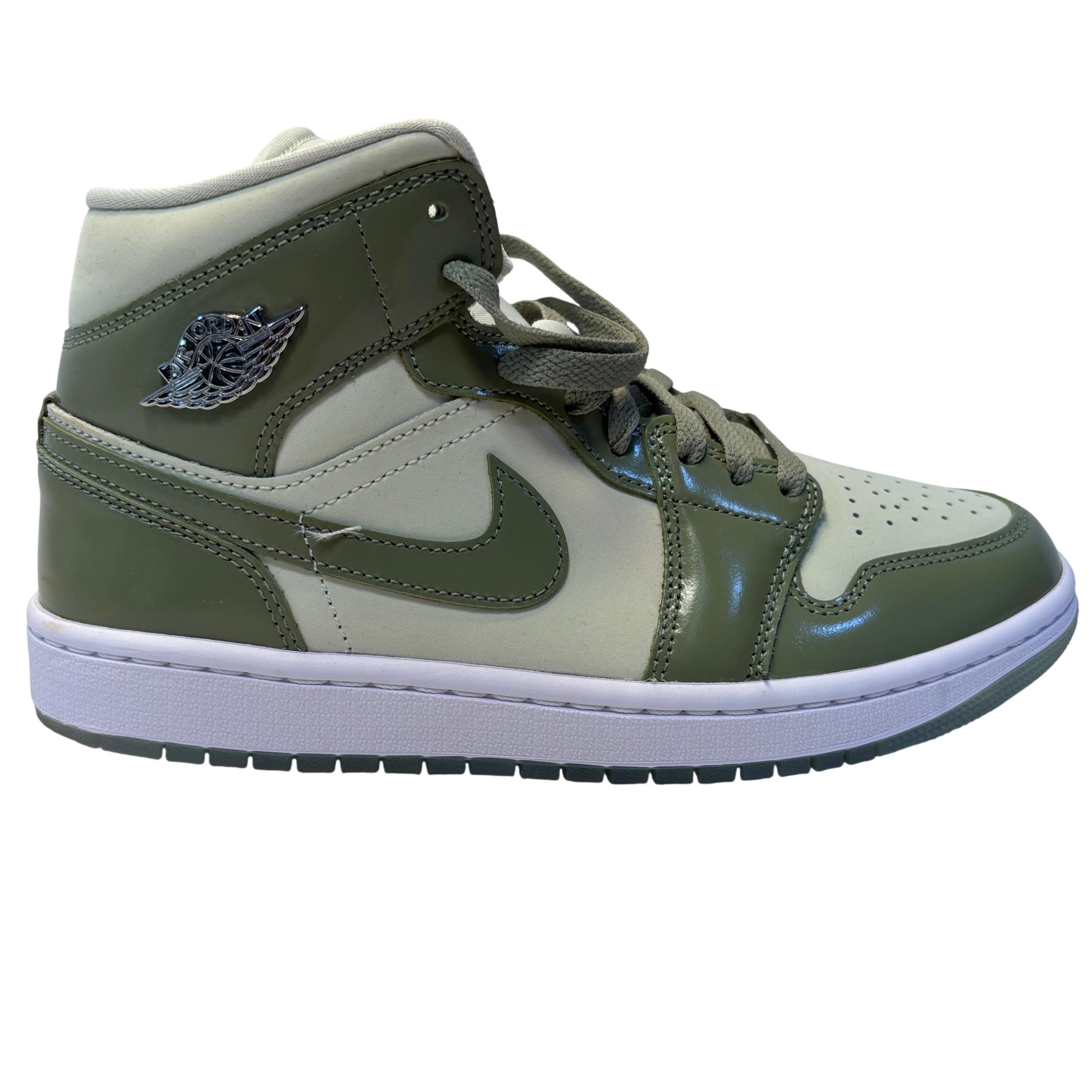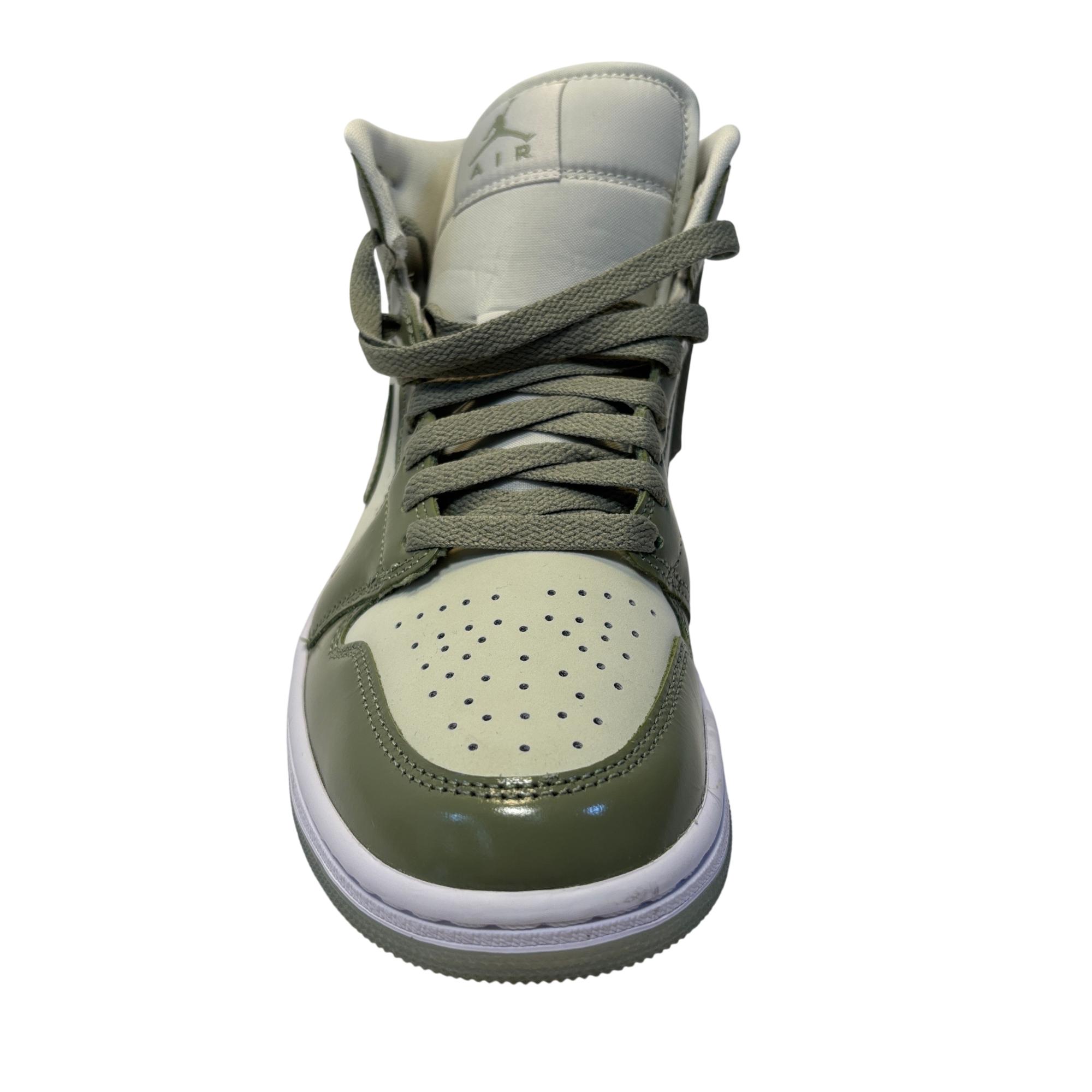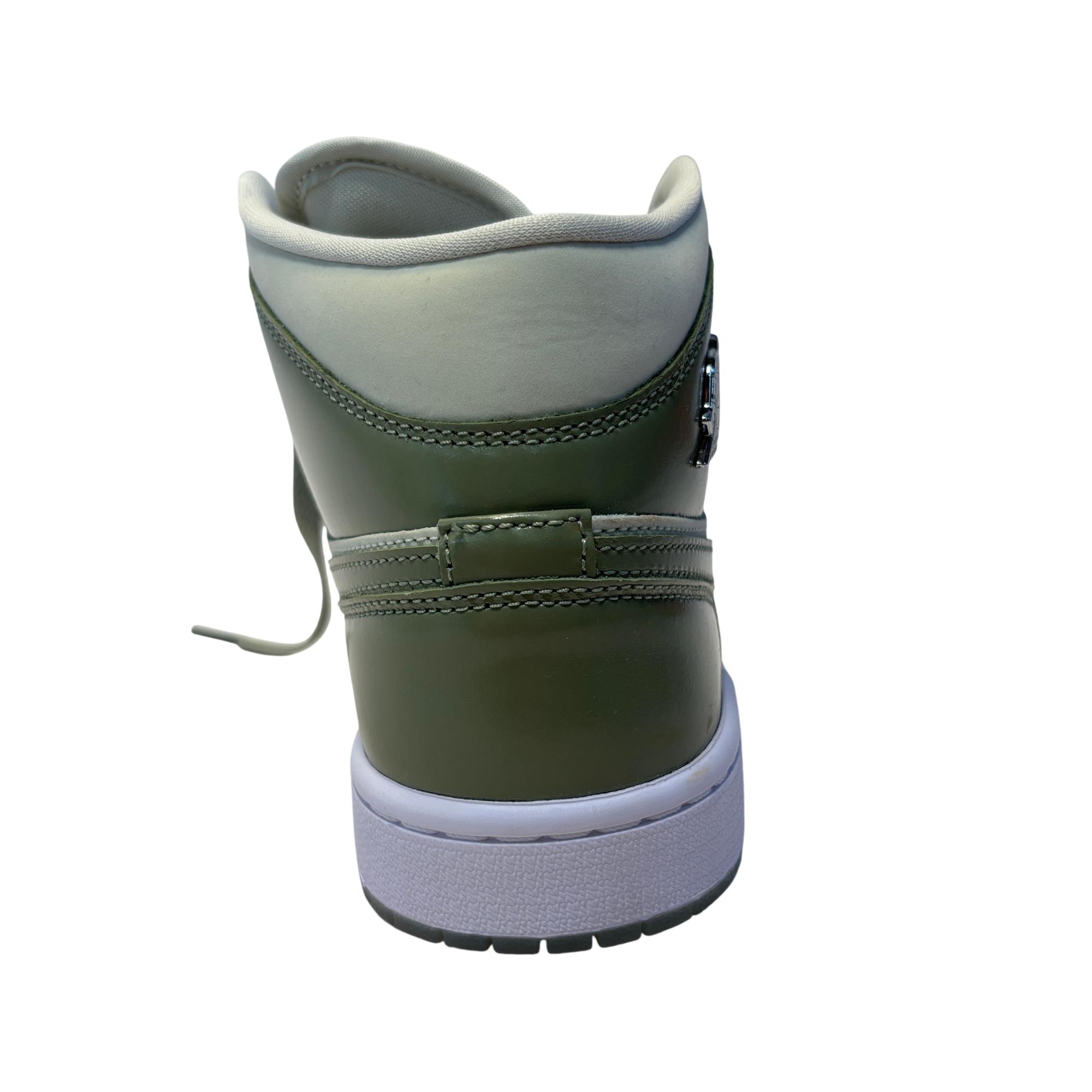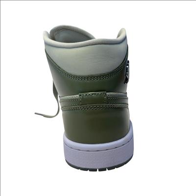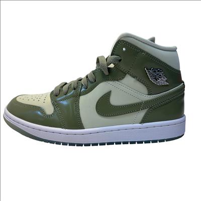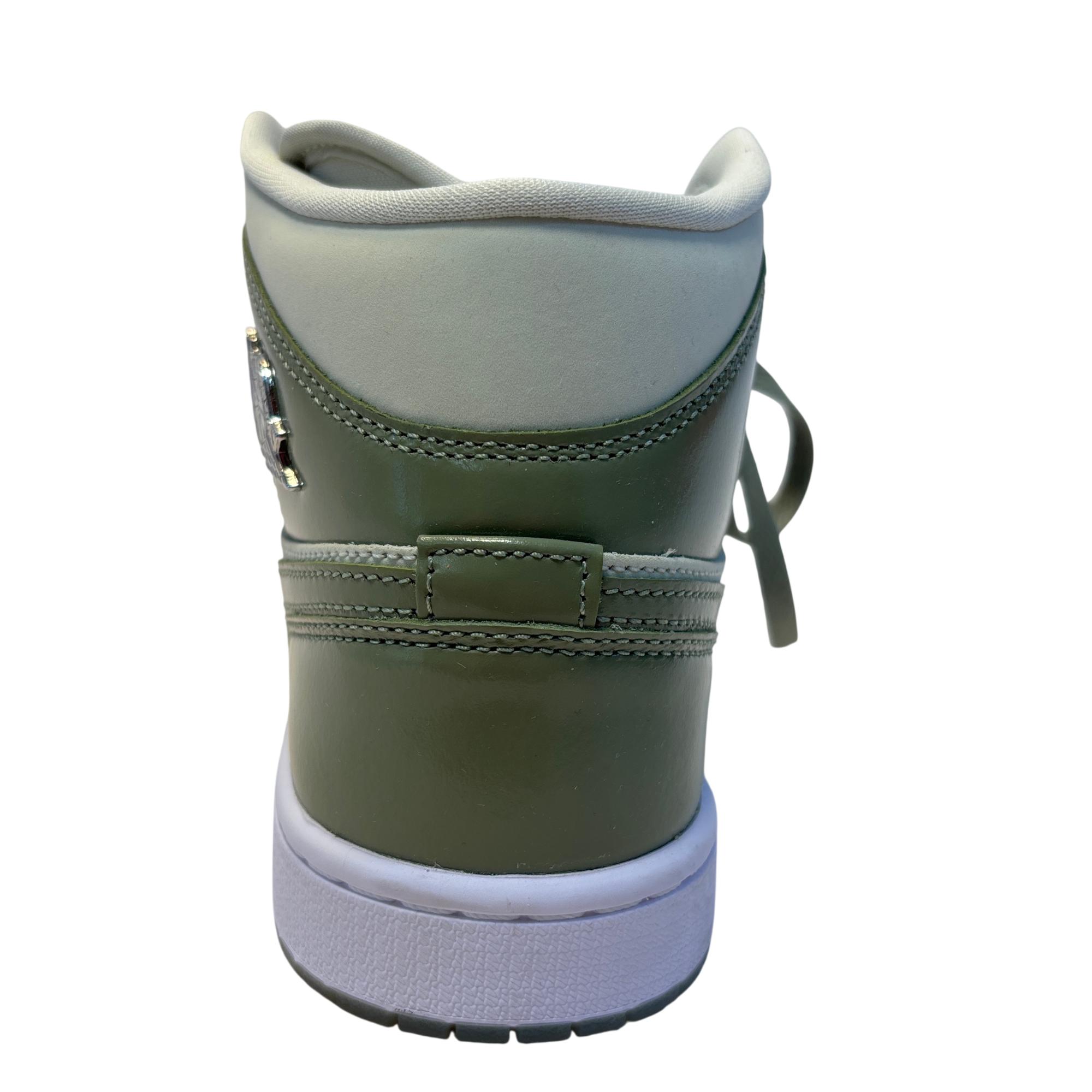 The Nike Air Jordan 1 Mid SE Sea Glass/Oil Green/Metallic Silver features a premium leather upper with a stylish combination of sea glass green, oil green, and metallic silver accents. Designed with a mid-top silhouette, these womens sneakers blend iconic basketball heritage with modern streetwear appeal, making them ideal for both casual and athletic use.