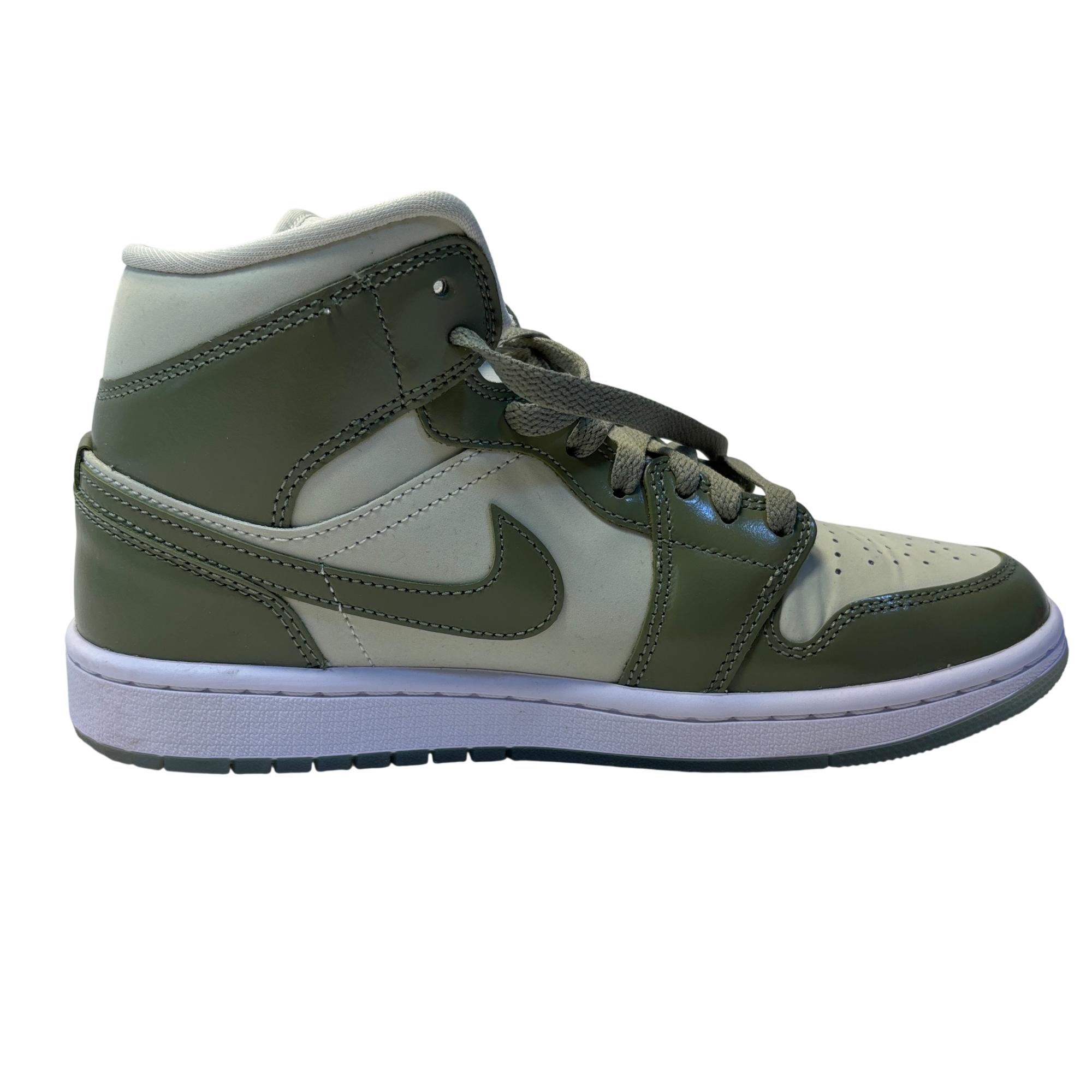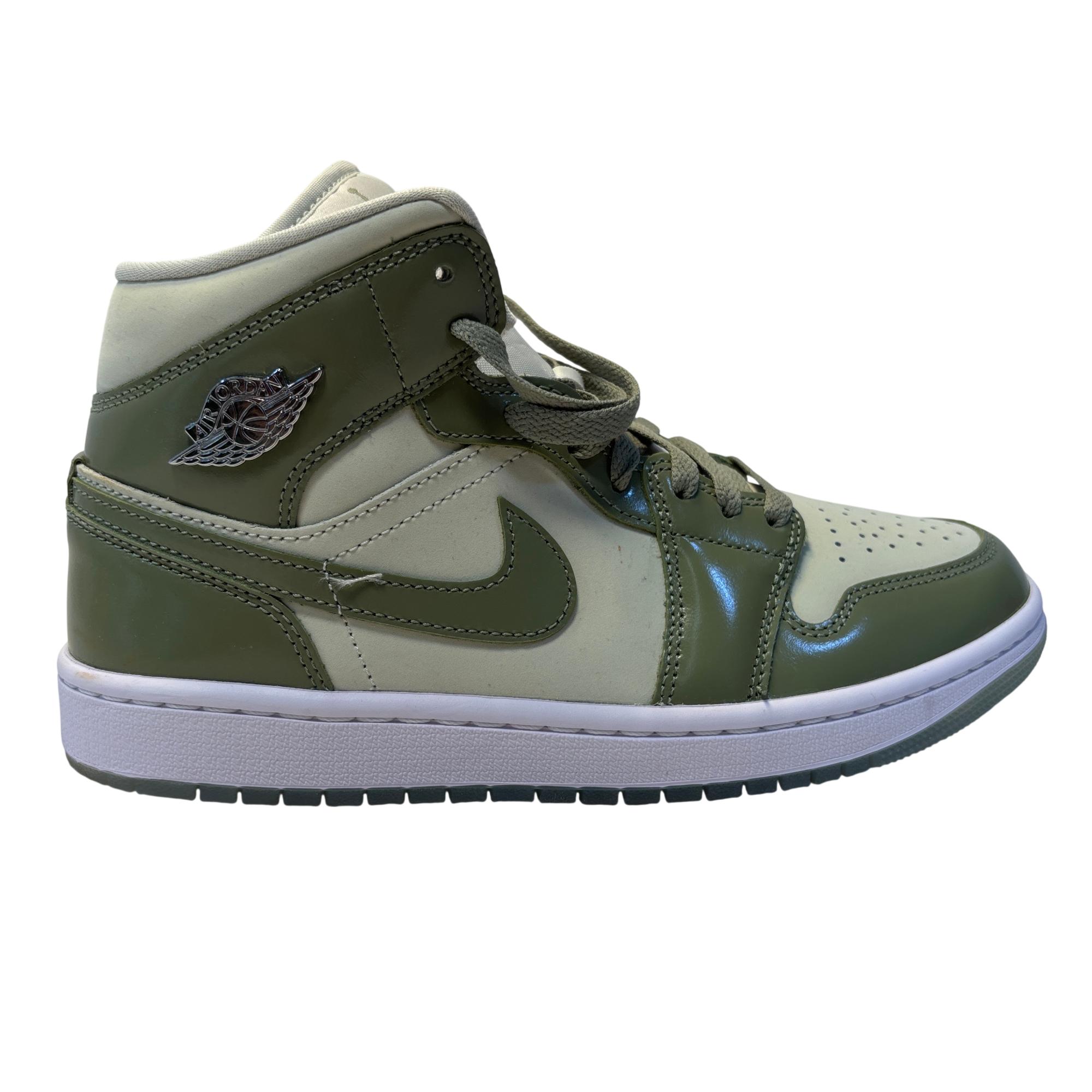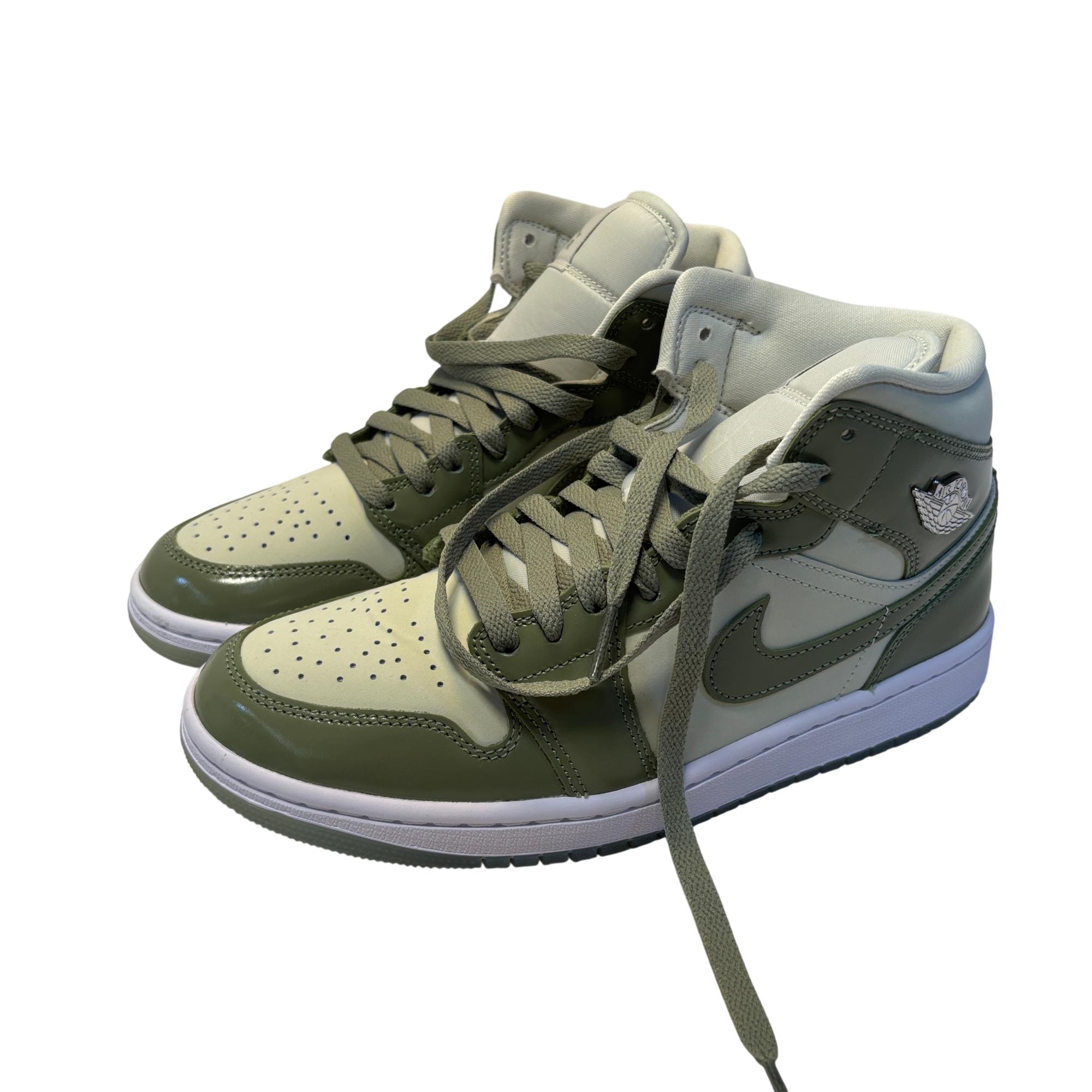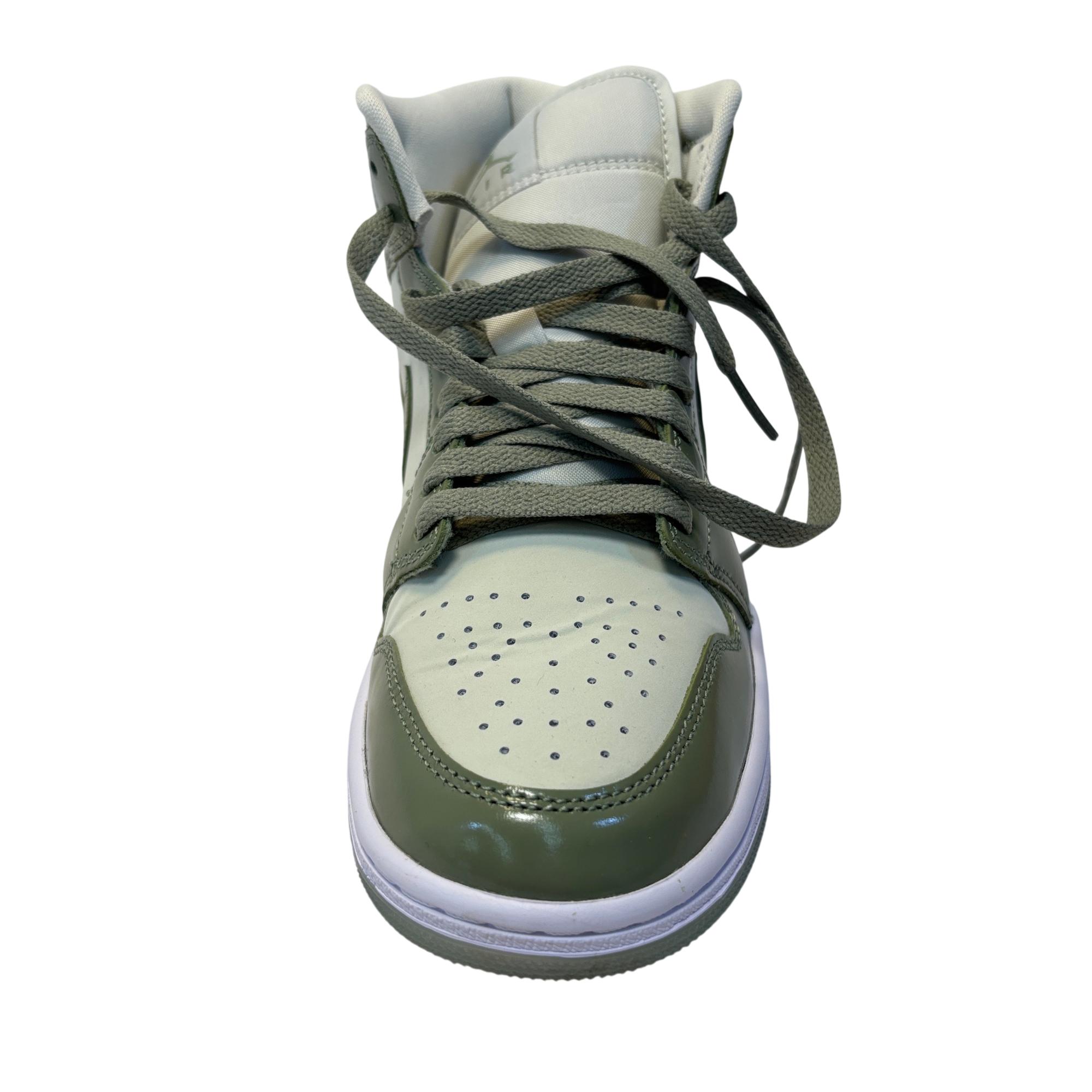 The Nike Air Jordan 1 Mid SE Sea Glass/Oil Green/Metallic Silver features a premium leather upper with a stylish combination of sea glass green, oil green, and metallic silver accents. Designed with a mid-top silhouette, these womens sneakers blend iconic basketball heritage with modern streetwear appeal, making them ideal for both casual and athletic use.