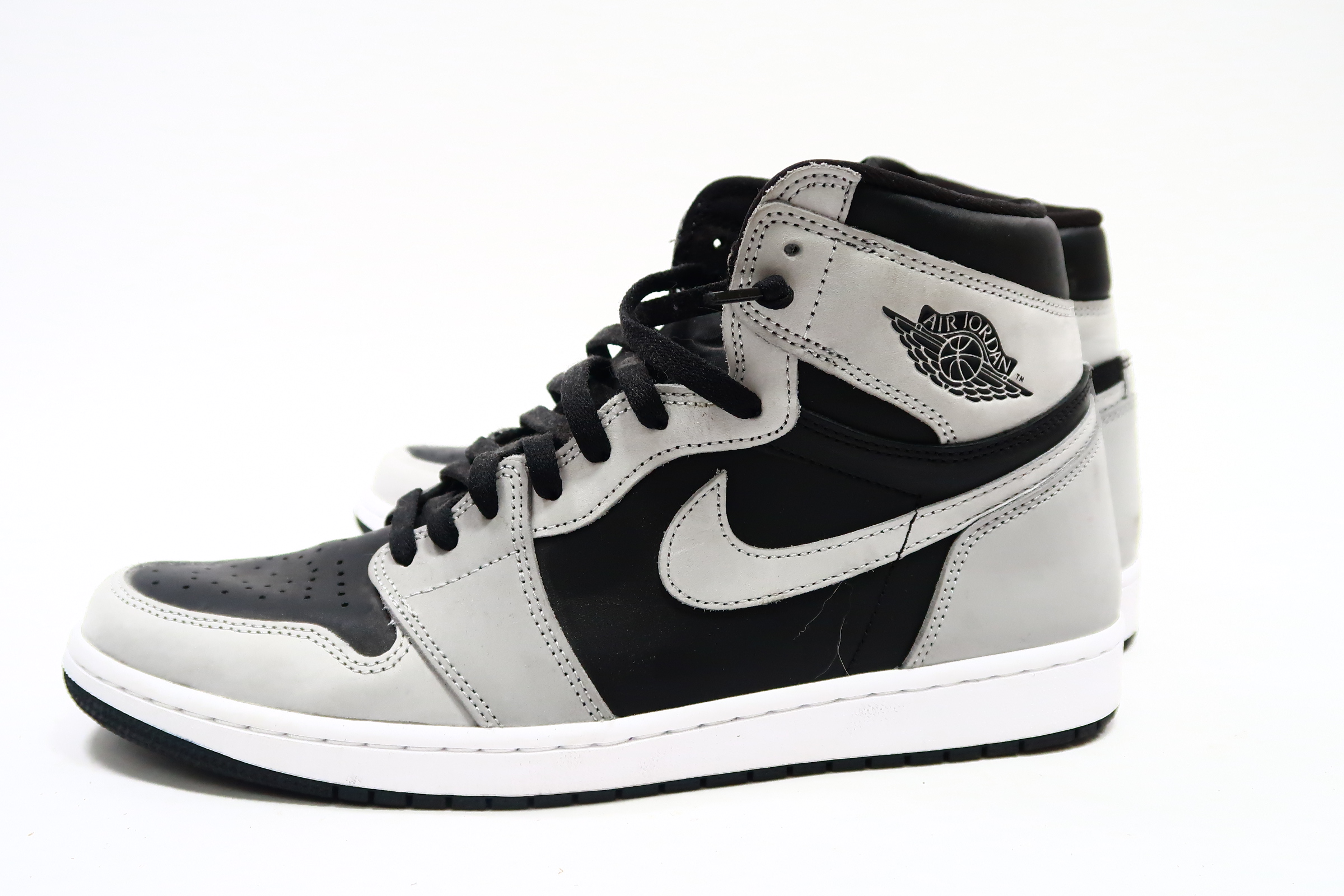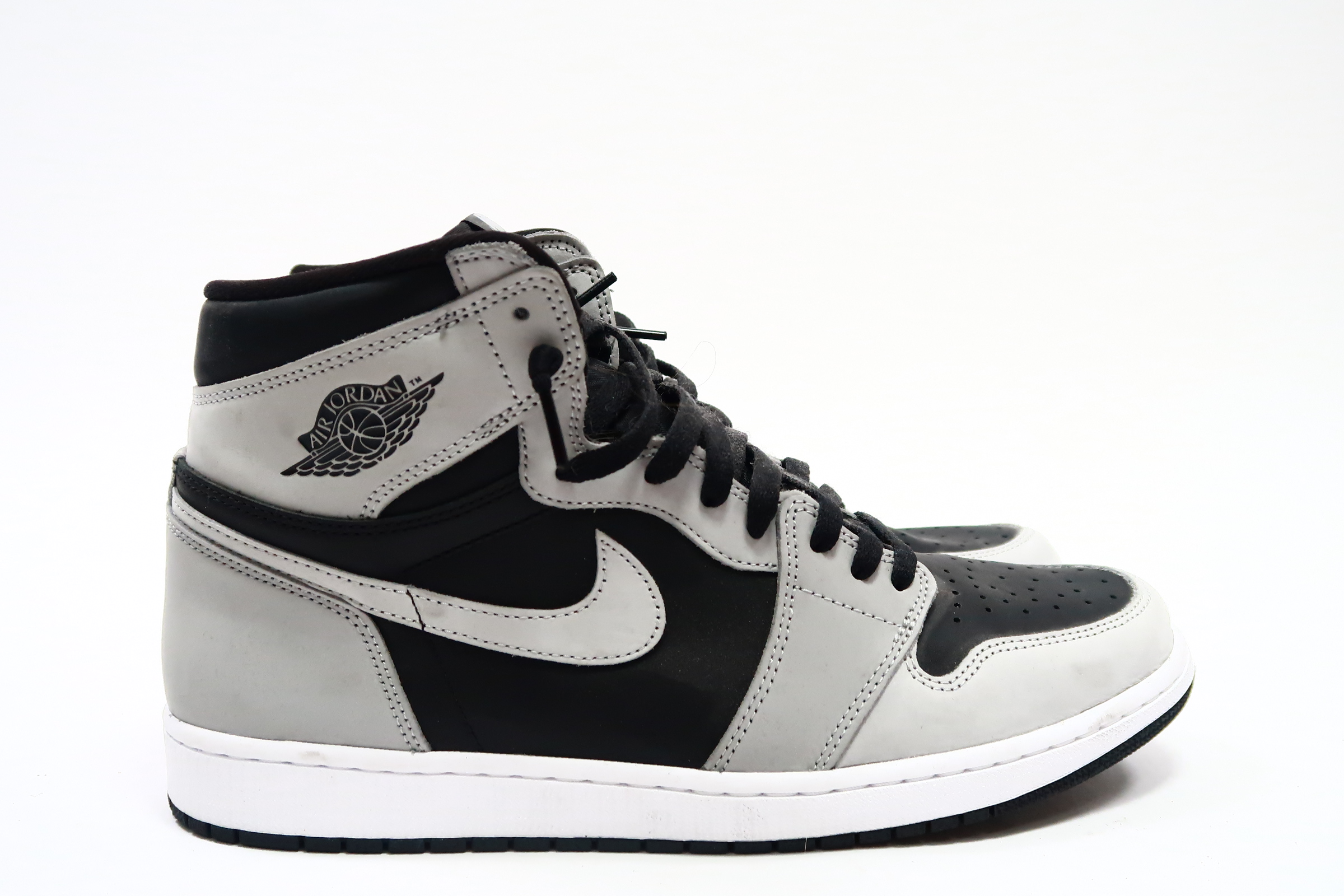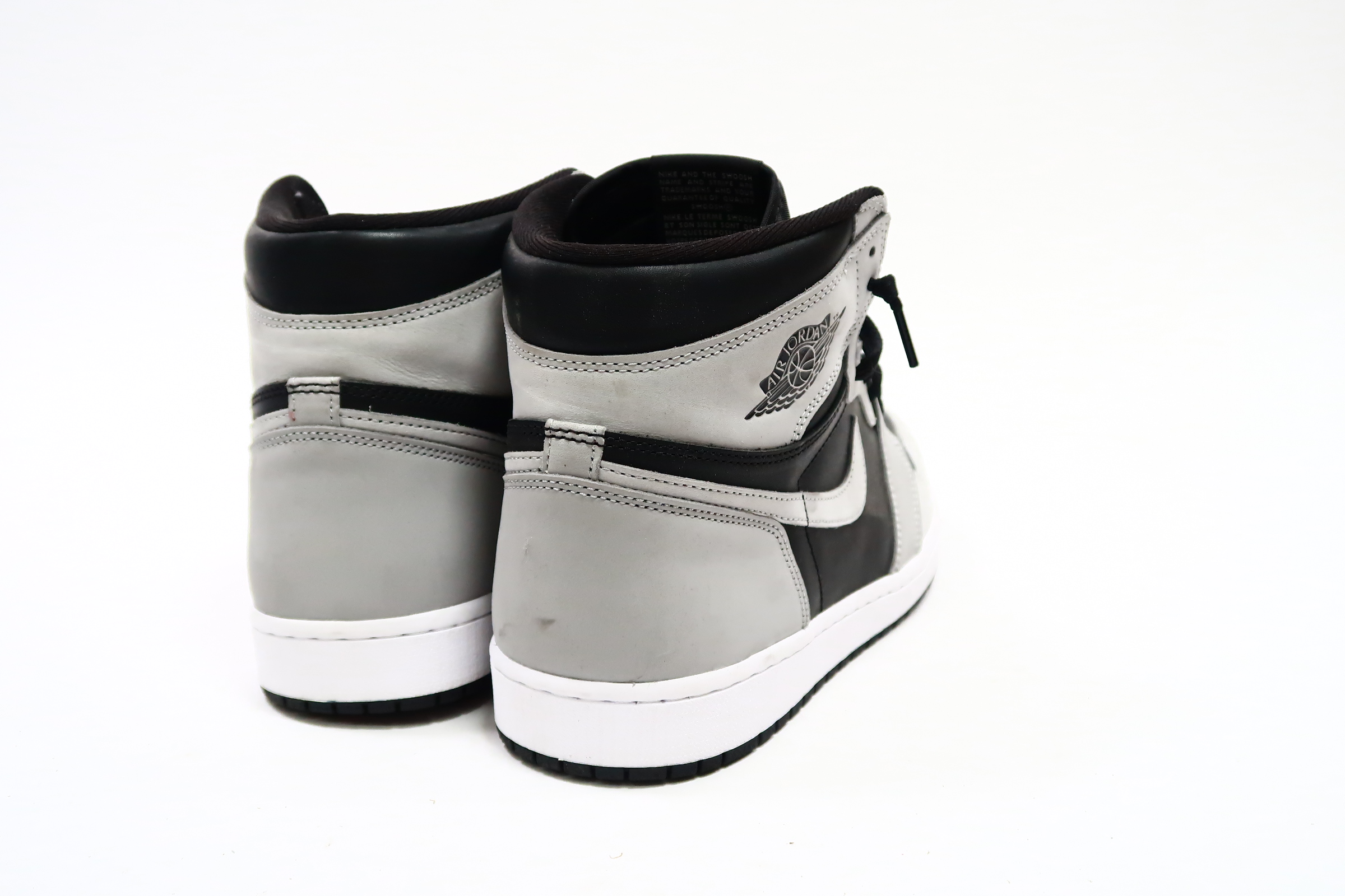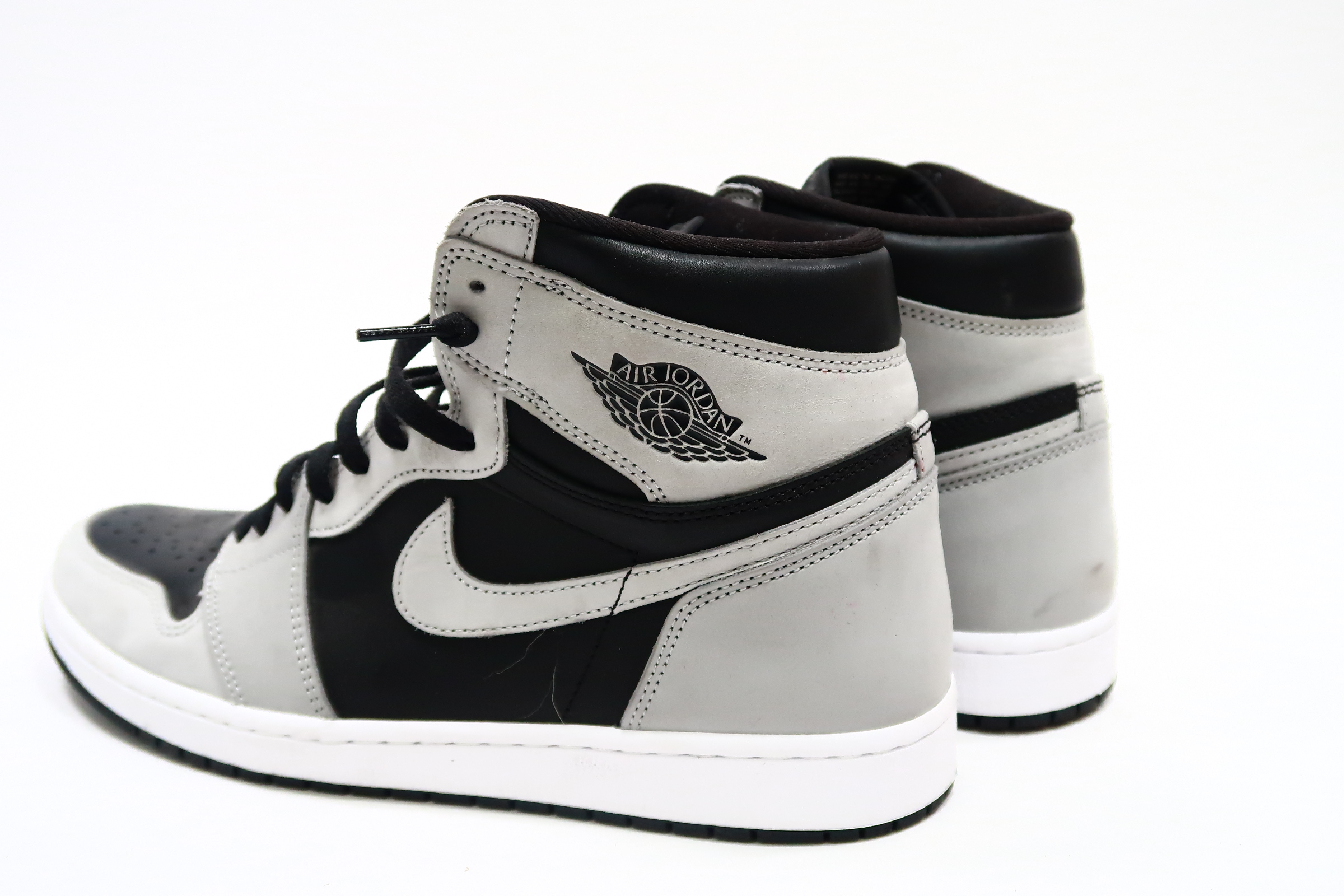 The upper of the Air Jordan 1 Shadow 2.0 is made of a black leather base with Light Smoke Grey overlays. A classic Wings logo appears on the lateral ankle wrap while a woven Nike Air label is stitched atop the tongue to complete the look.