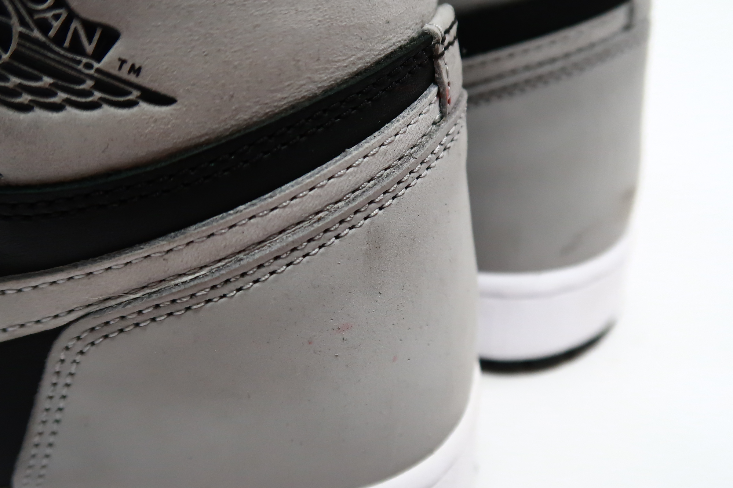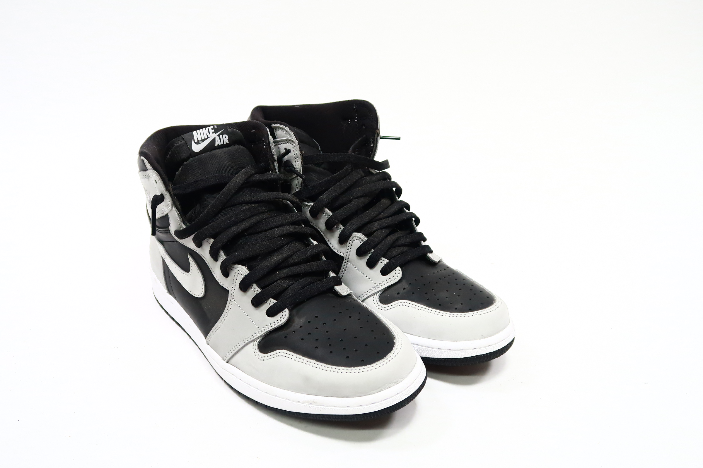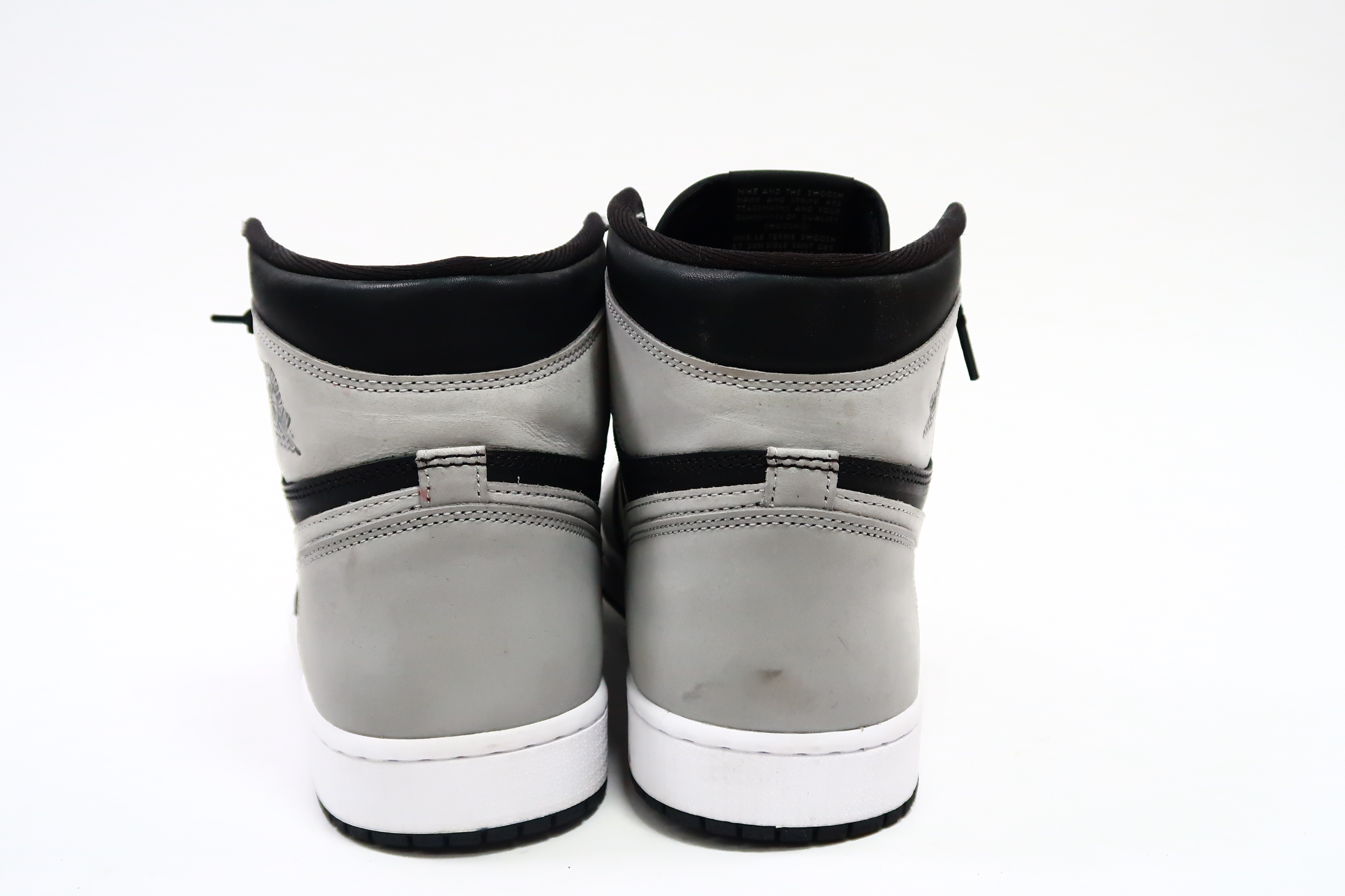 The upper of the Air Jordan 1 Shadow 2.0 is made of a black leather base with Light Smoke Grey overlays. A classic Wings logo appears on the lateral ankle wrap while a woven Nike Air label is stitched atop the tongue to complete the look.