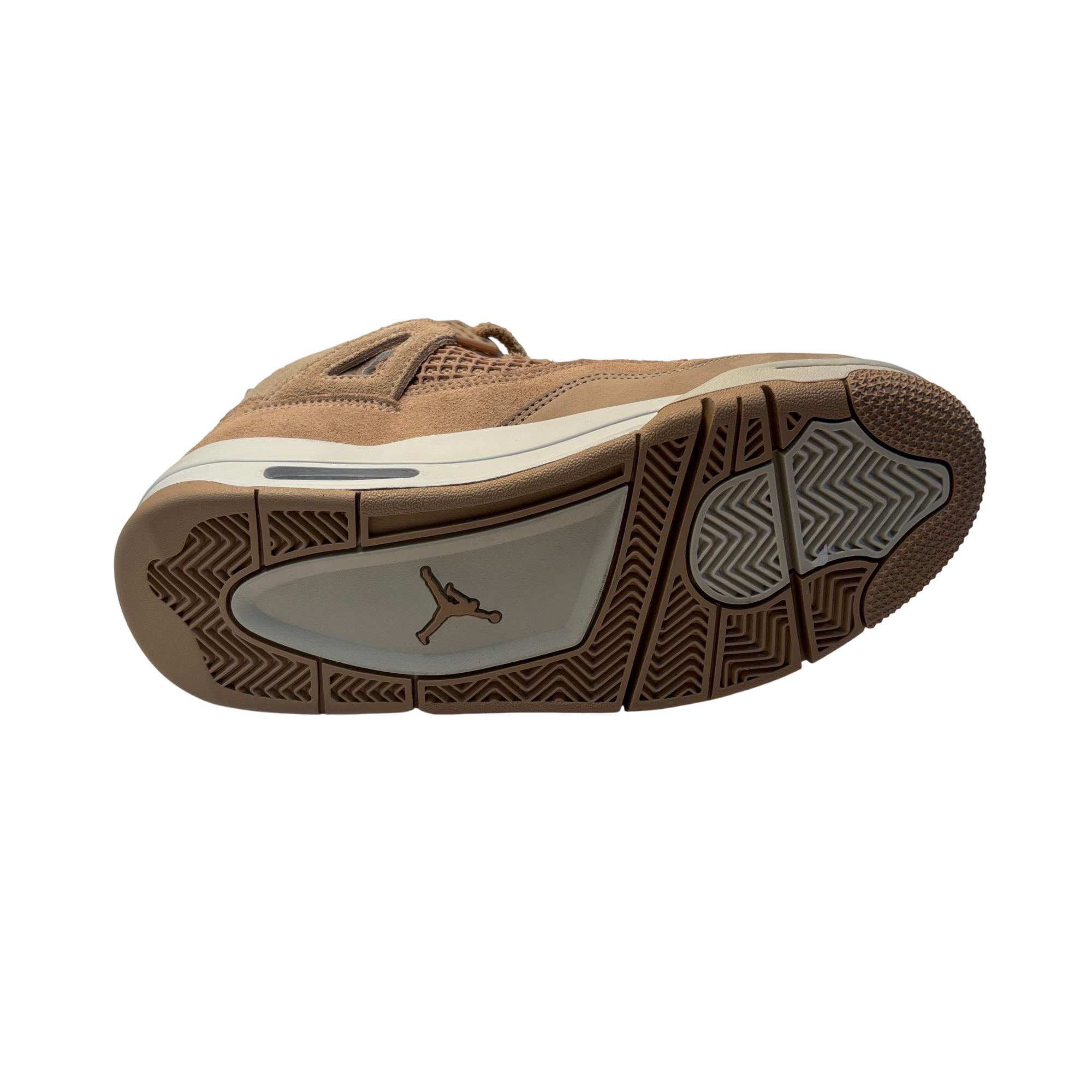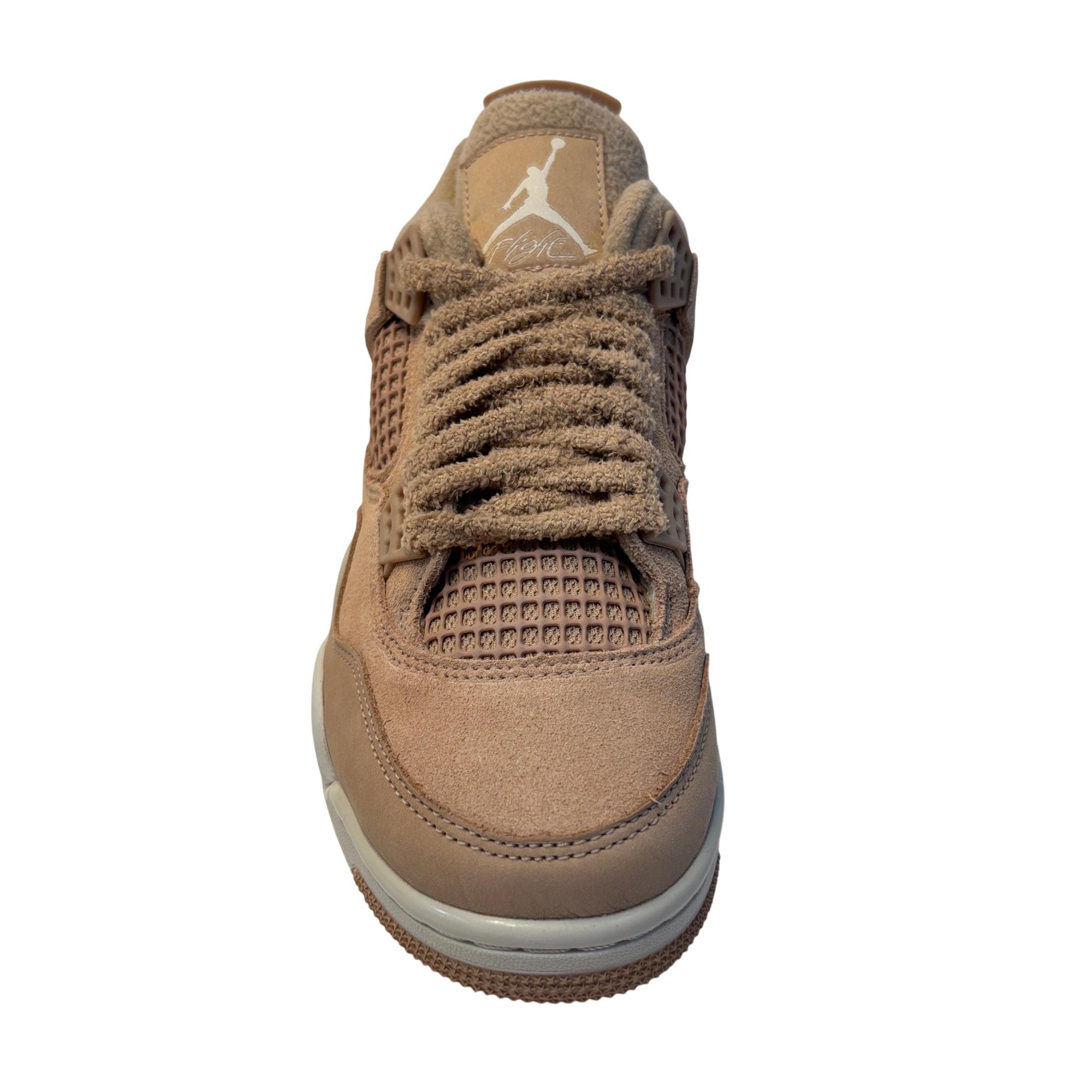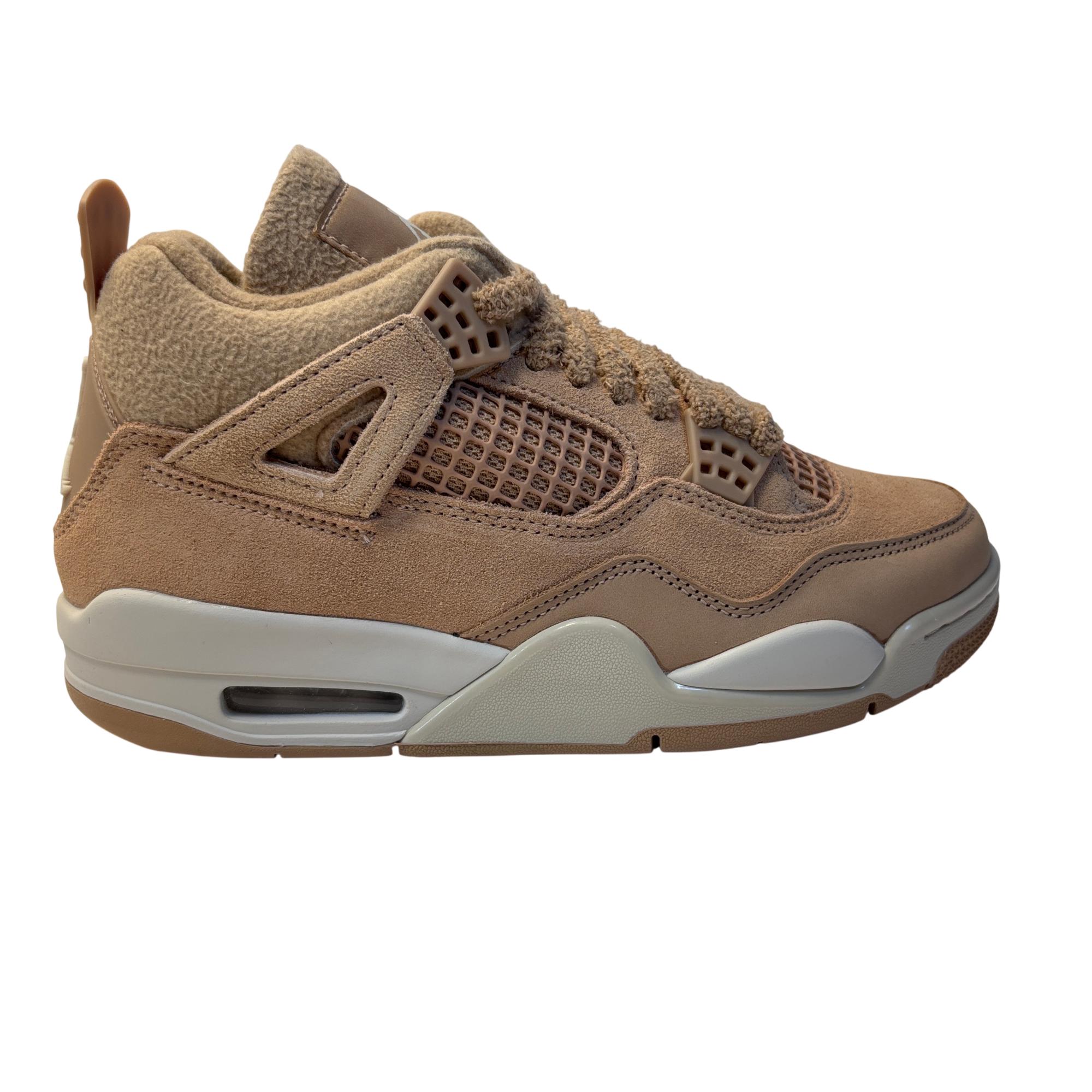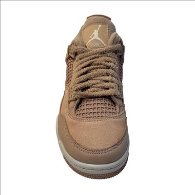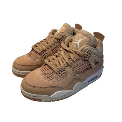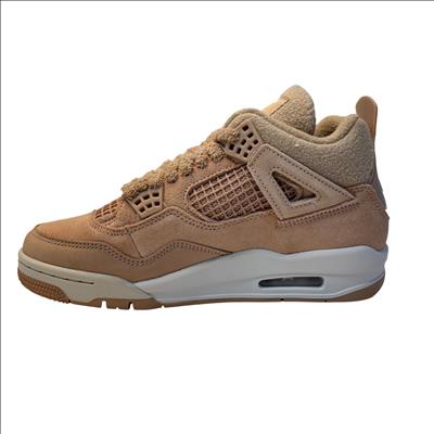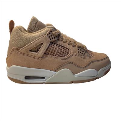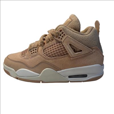 The Nike Air Jordan 4 Retro Cozy Girl sneakers feature a stylish beige colorway combining rubber, mesh, and fleece materials for a comfortable and breathable fit. These sneakers showcase a modern design inspired by classic basketball footwear, offering versatile performance for casual and athletic wear.