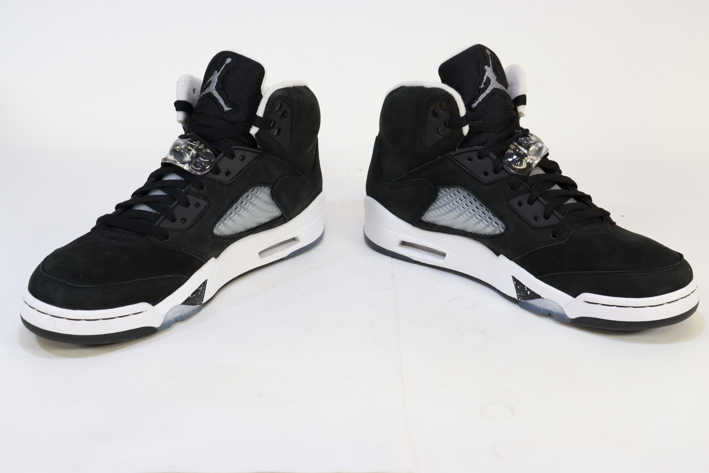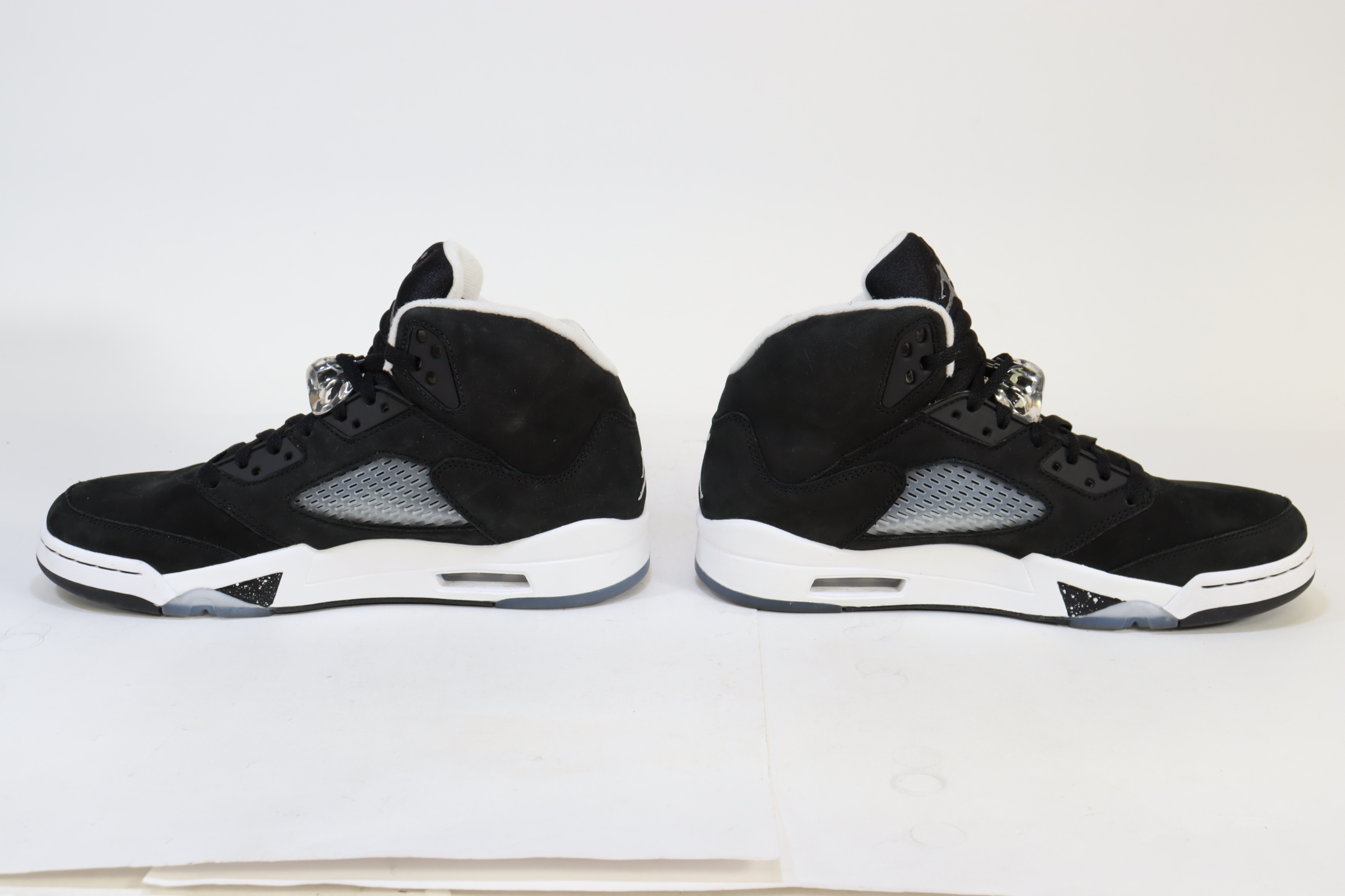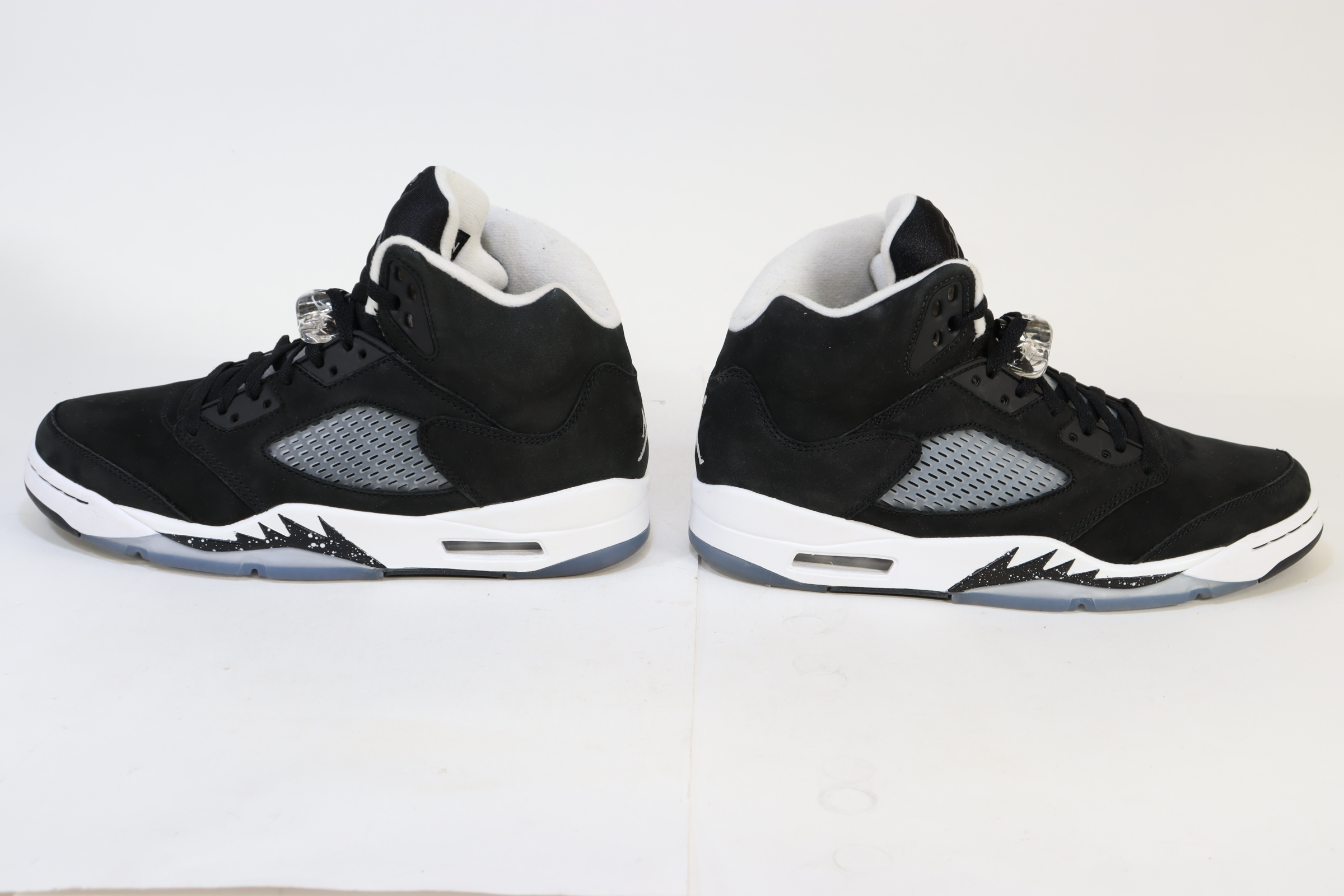 An all-black suede upper and between a white midsole, a black and white speckled shark-tooth design along the midsole resembles the night sky and its stars. An icy outsole completes the look, recalling the sneaker's OG place in history—the Air Jordan 5 was the first Jordan Brand signature sneaker to feature a translucent sole.