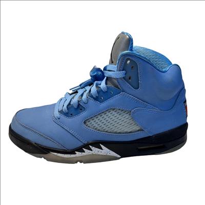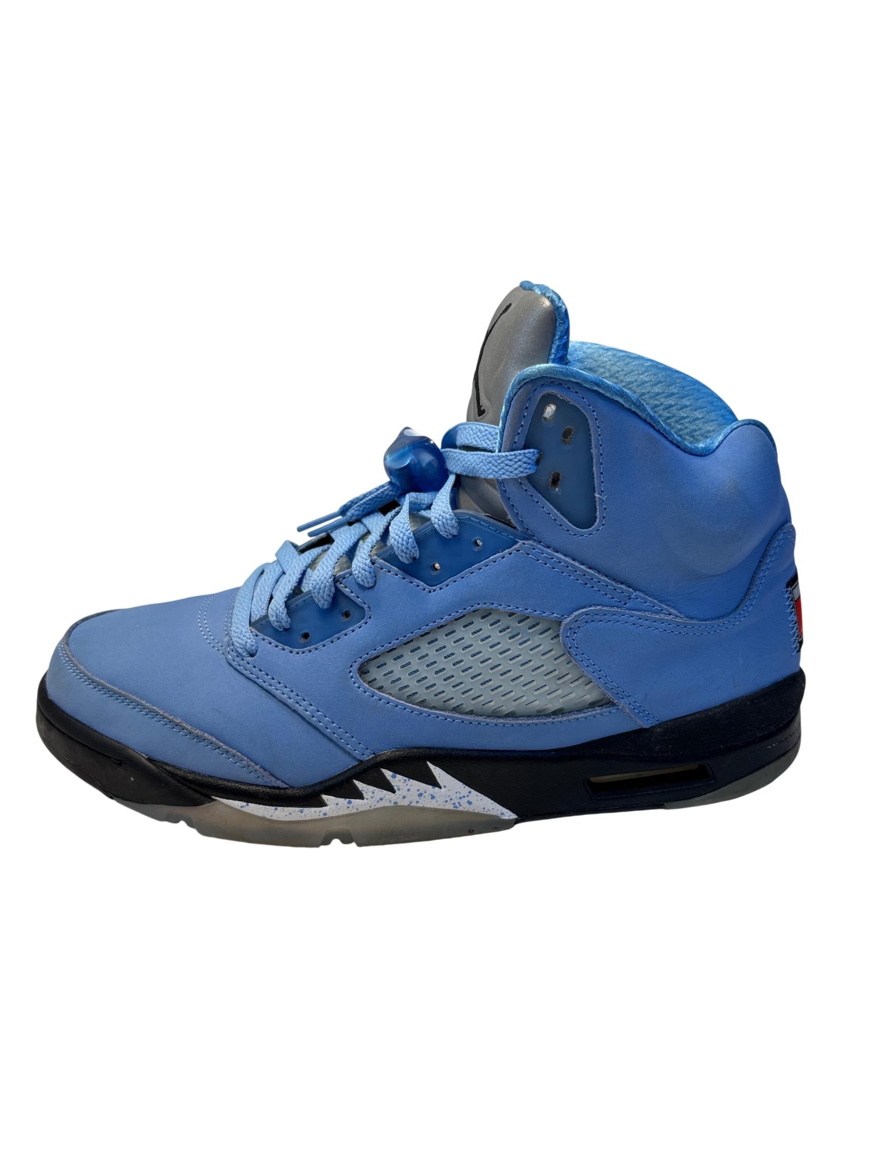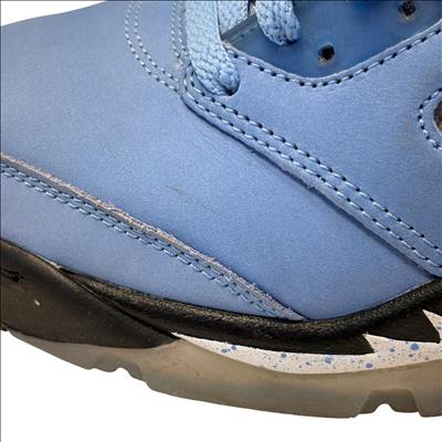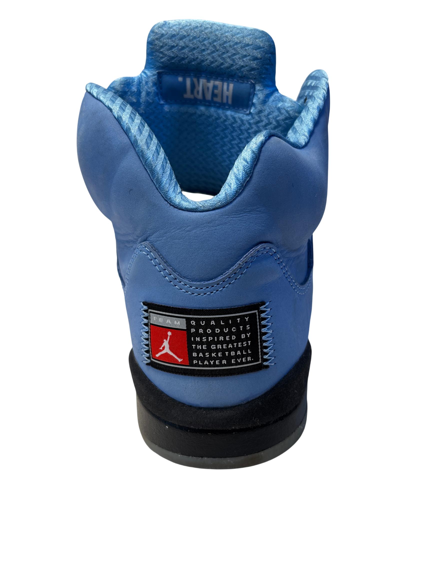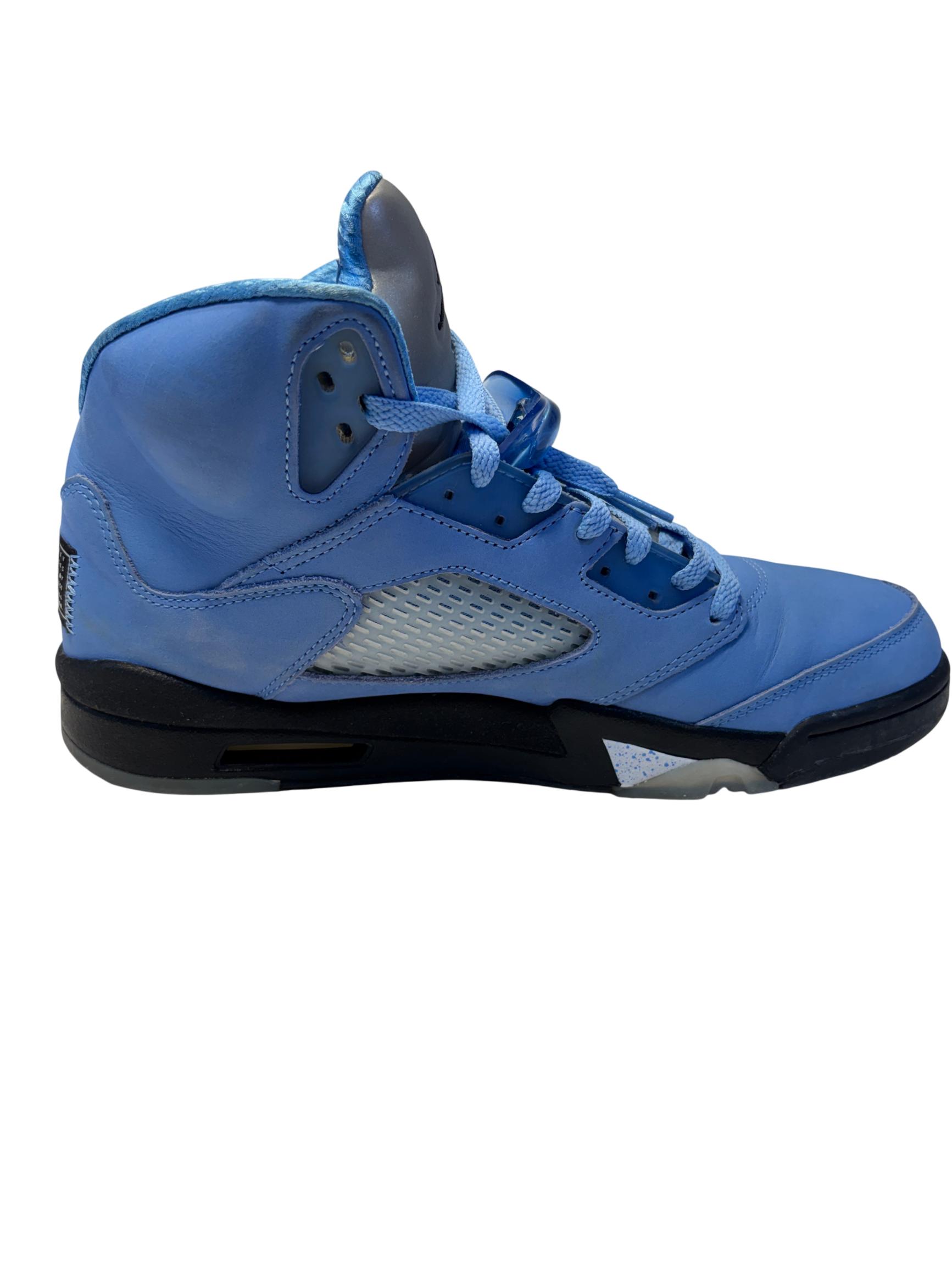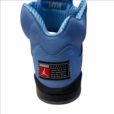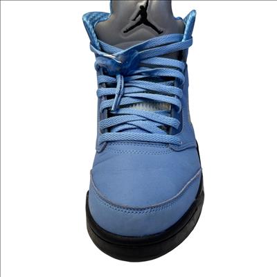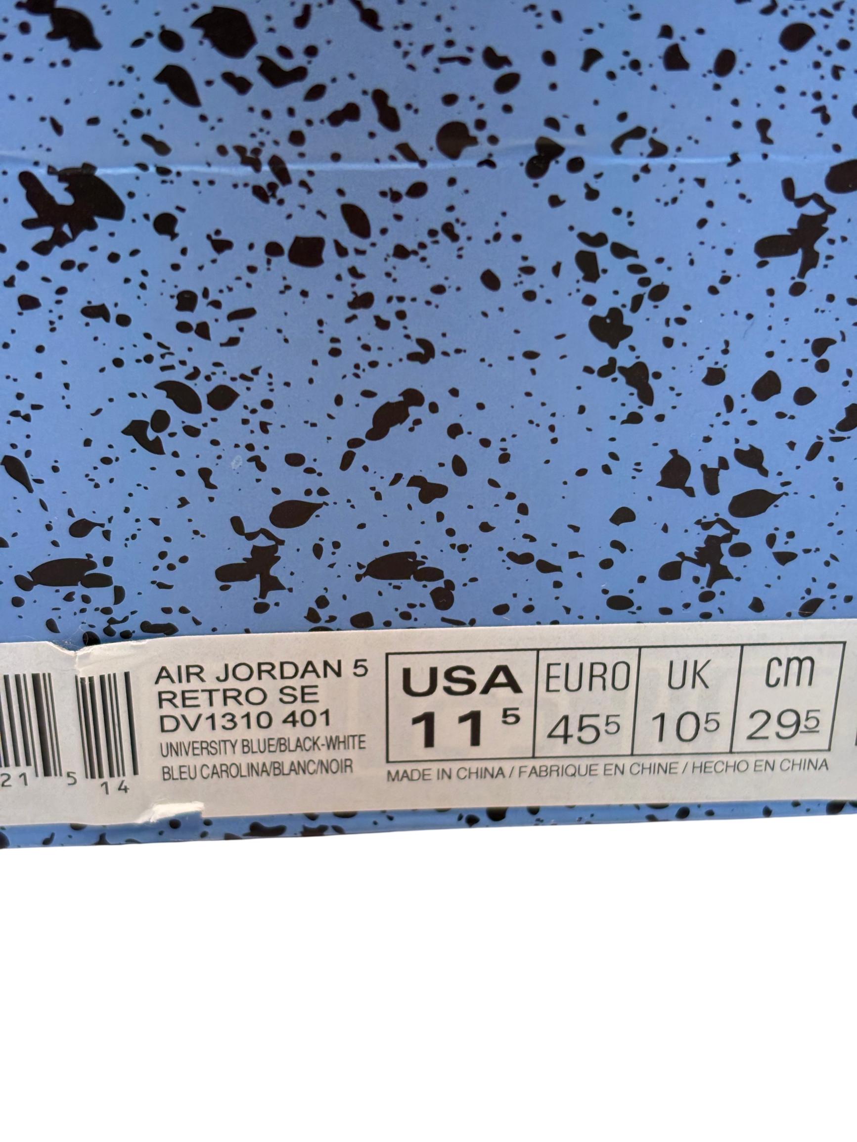 The Nike Air Jordan 5 Retro SE UNC features a striking cobalt blue upper paired with a contrasting black and grey sole, embodying classic sneaker design with modern style. These high-top sneakers showcase detailed craftsmanship and vibrant electric blue tones, making them ideal for sneaker enthusiasts and collectors seeking iconic basketball footwear.