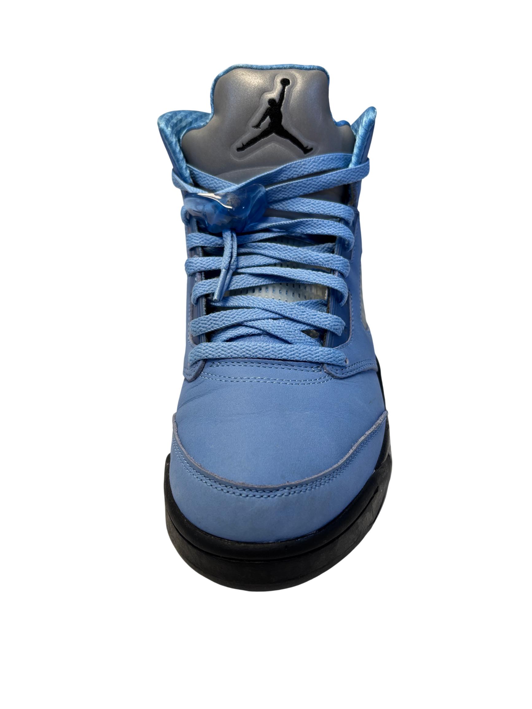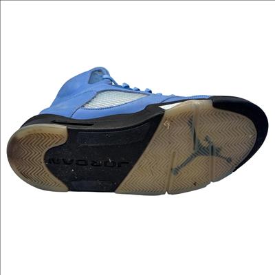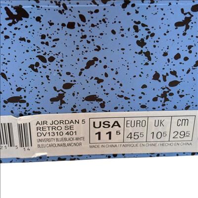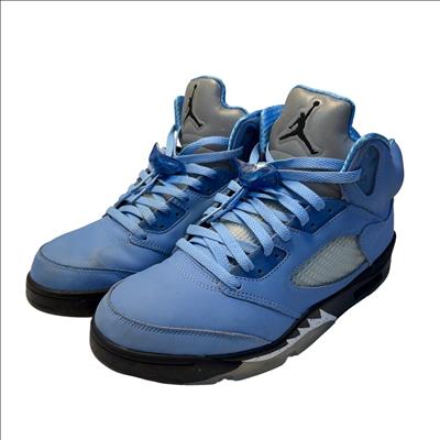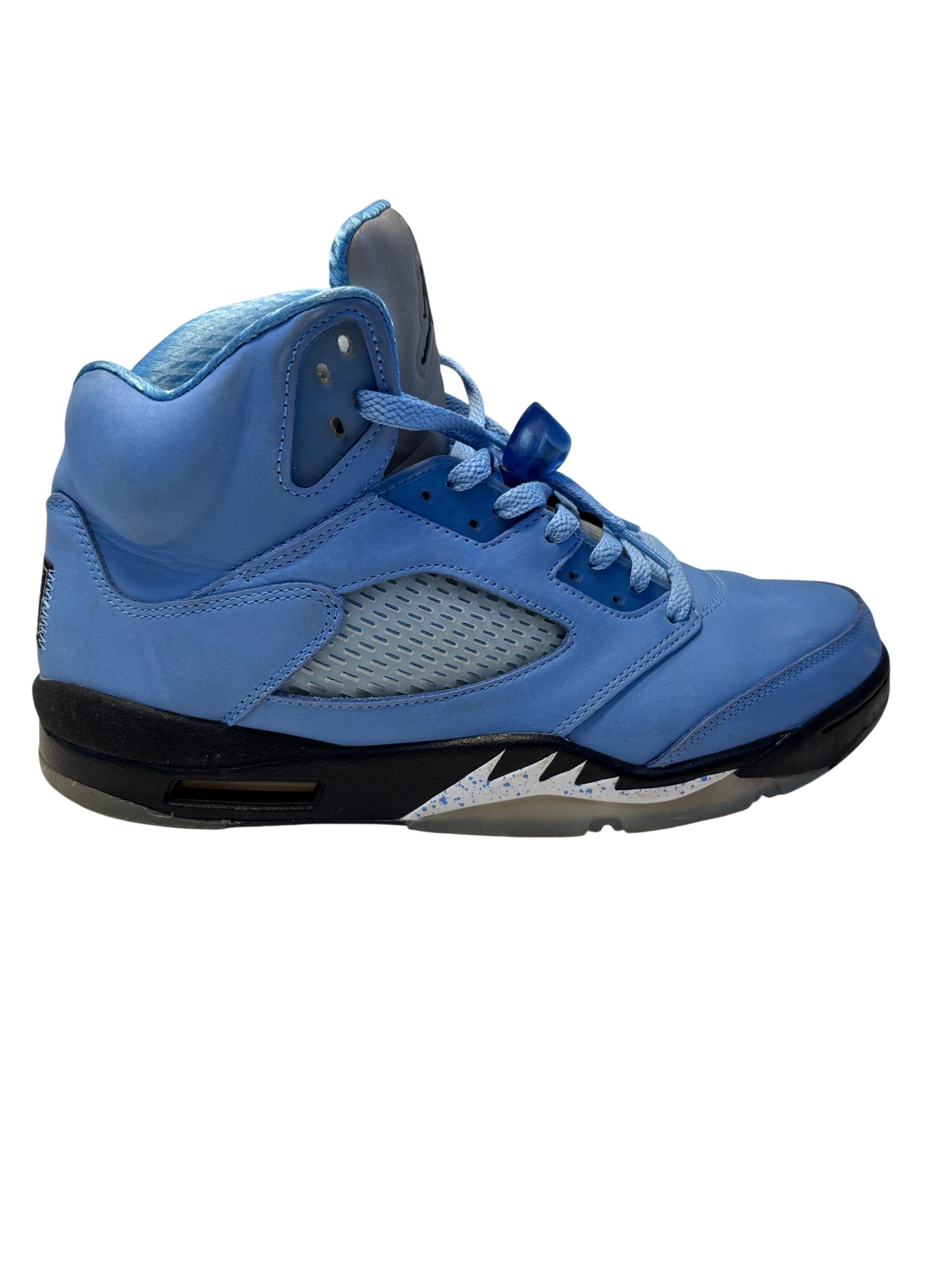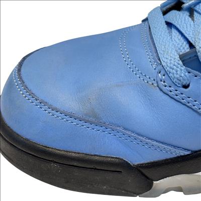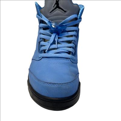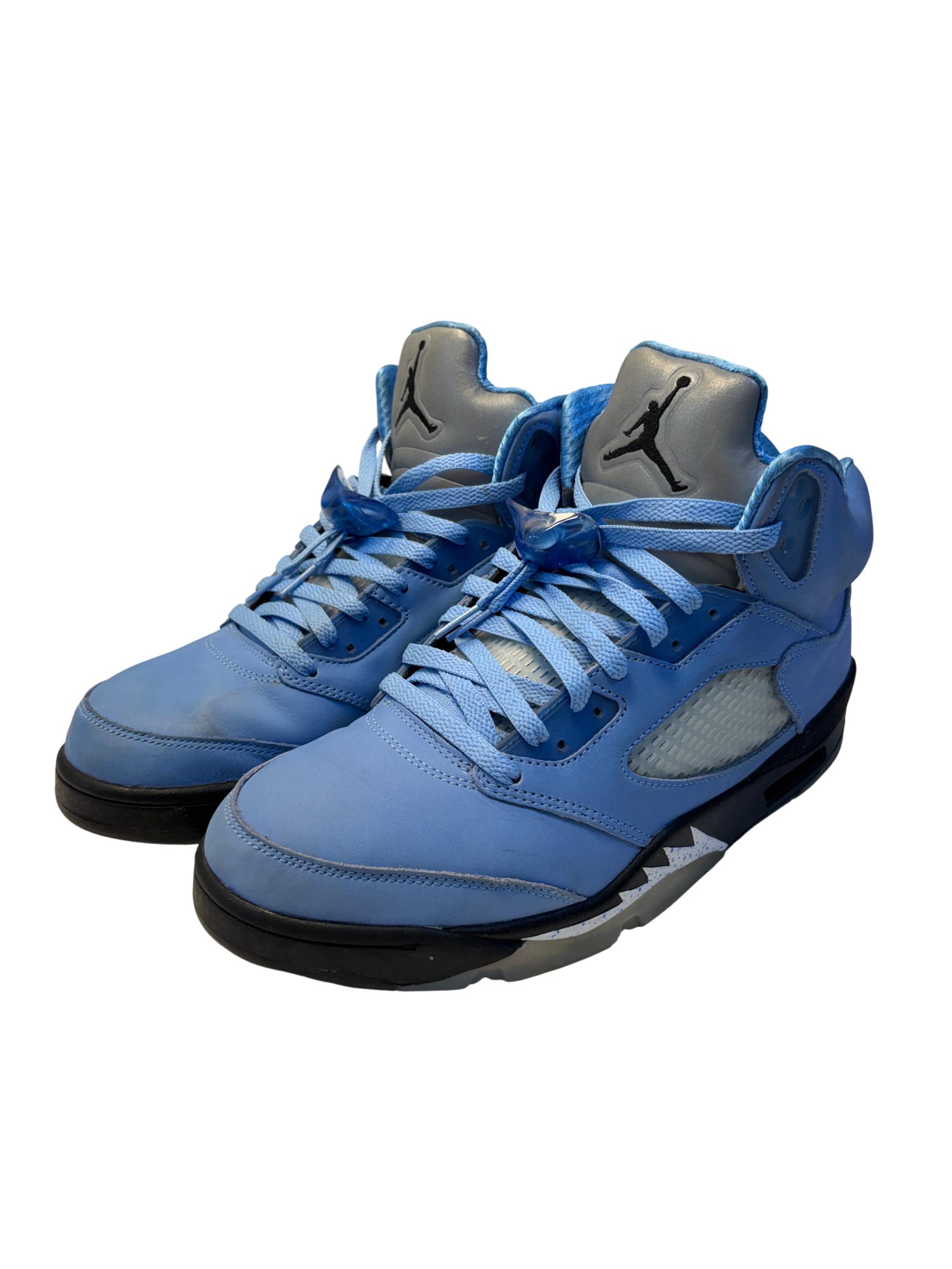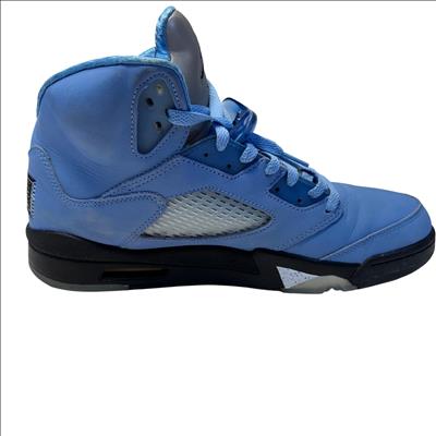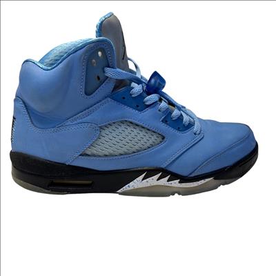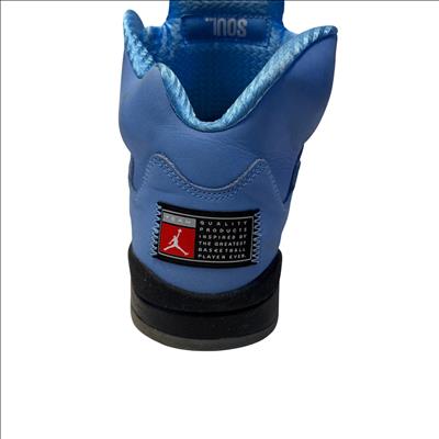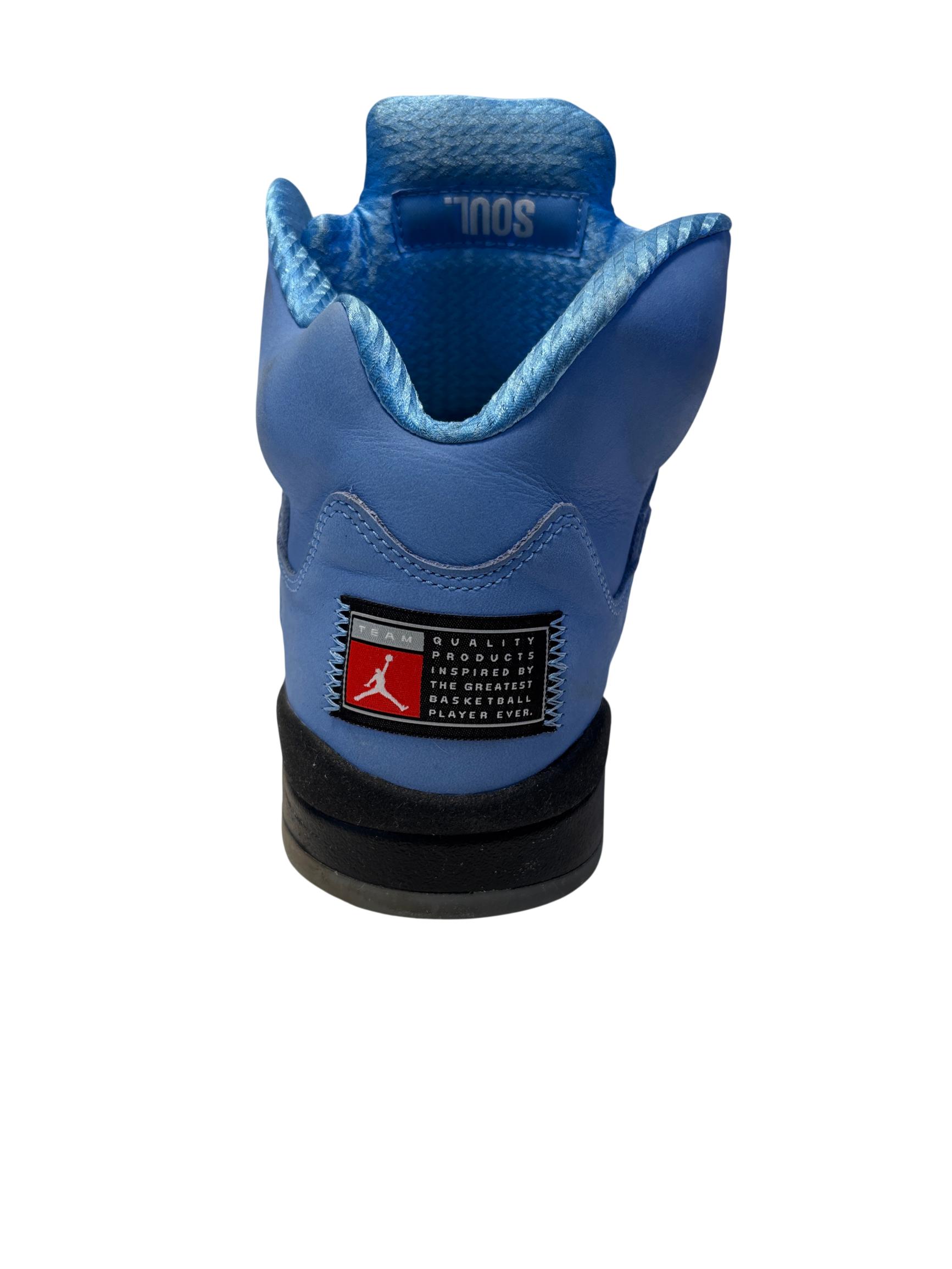 The Nike Air Jordan 5 Retro SE UNC features a striking cobalt blue upper paired with a contrasting black and grey sole, embodying classic sneaker design with modern style. These high-top sneakers showcase detailed craftsmanship and vibrant electric blue tones, making them ideal for sneaker enthusiasts and collectors seeking iconic basketball footwear.