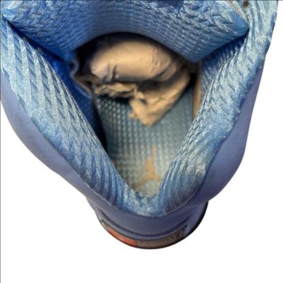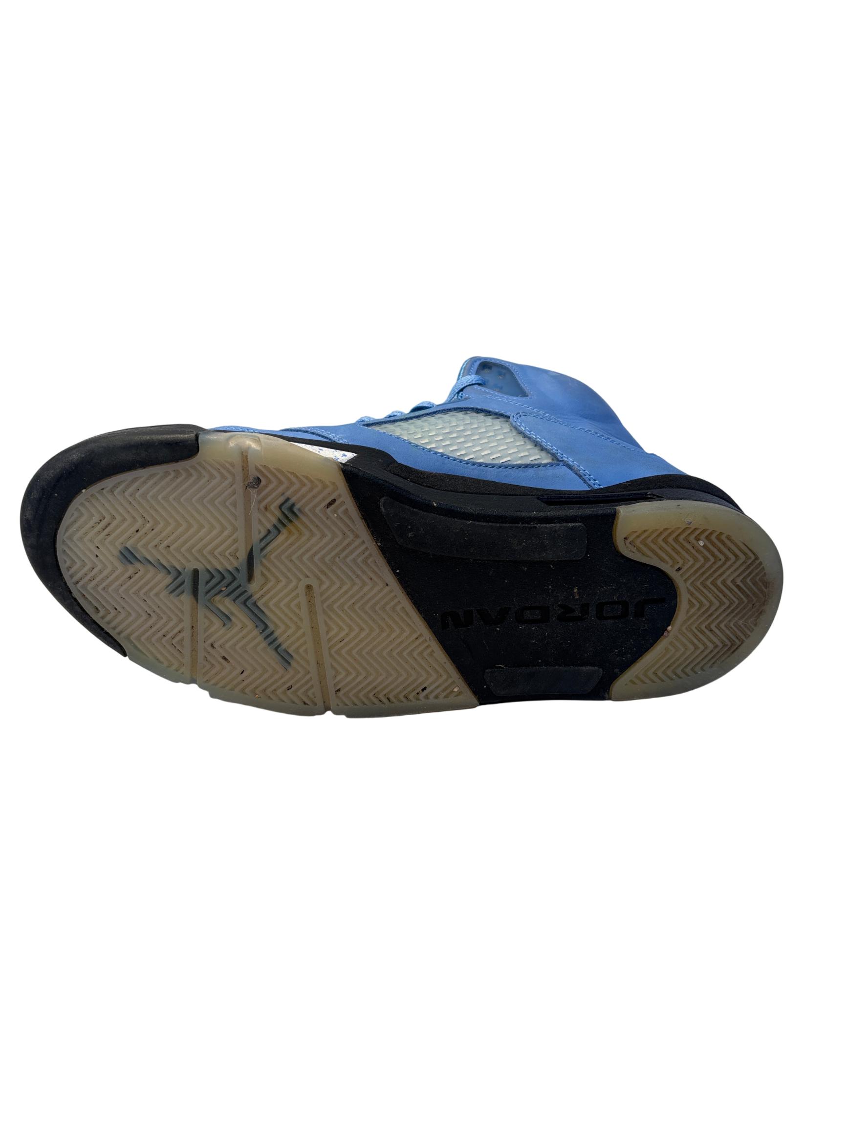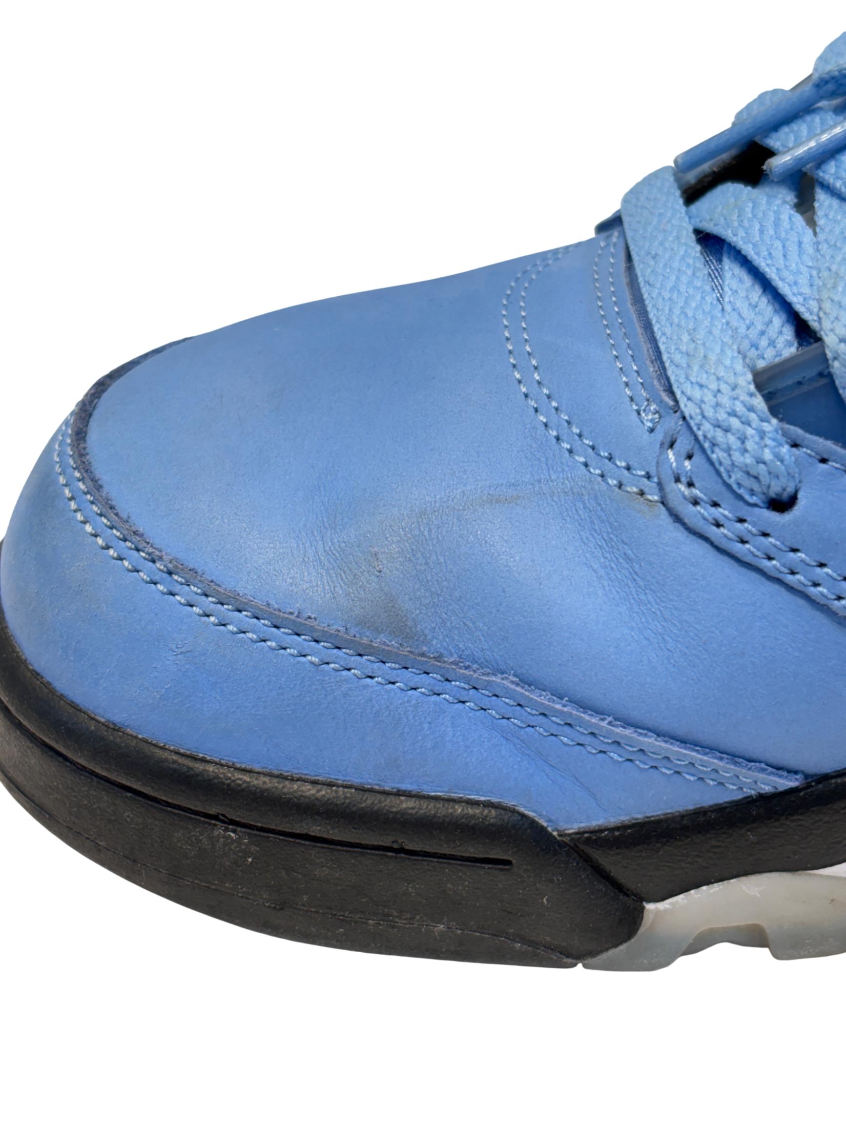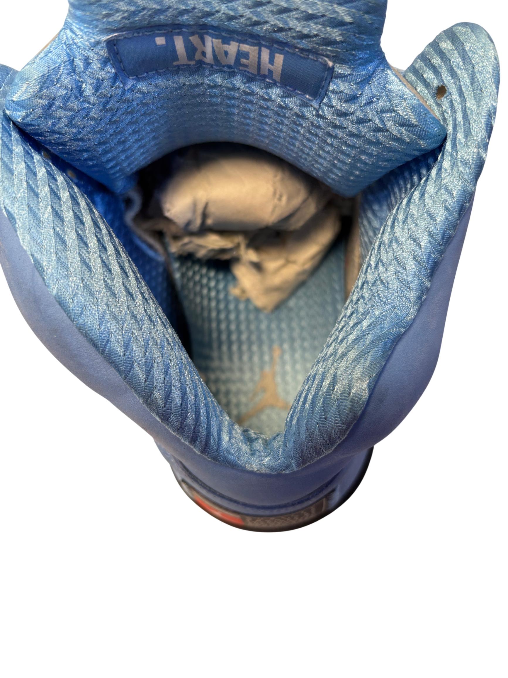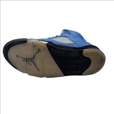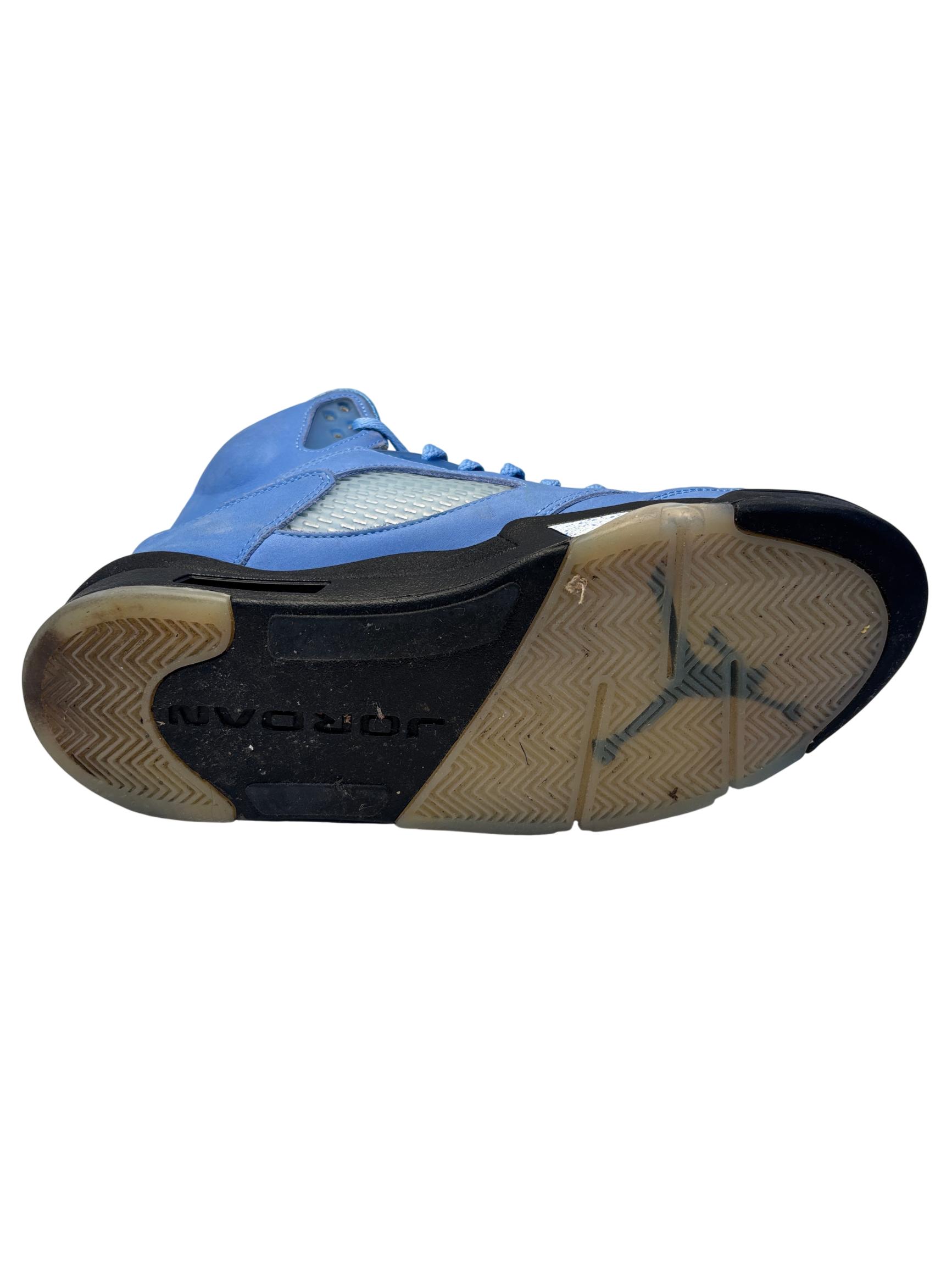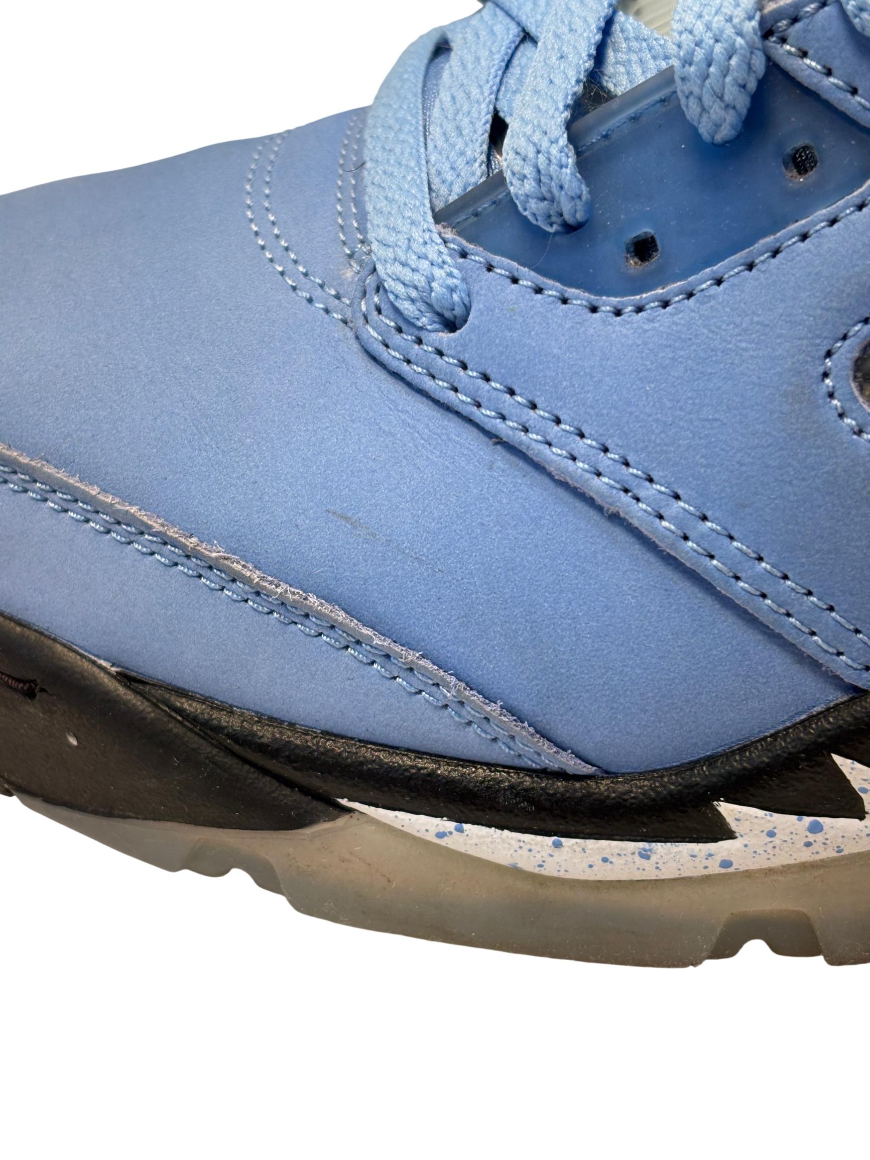 The Nike Air Jordan 5 Retro SE UNC features a striking cobalt blue upper paired with a contrasting black and grey sole, embodying classic sneaker design with modern style. These high-top sneakers showcase detailed craftsmanship and vibrant electric blue tones, making them ideal for sneaker enthusiasts and collectors seeking iconic basketball footwear.