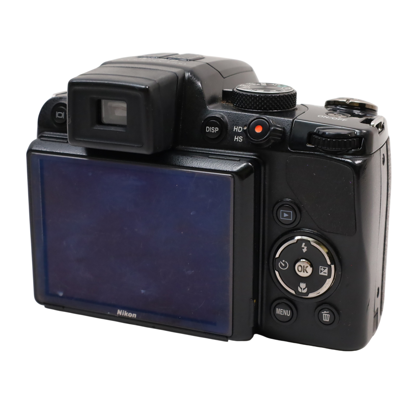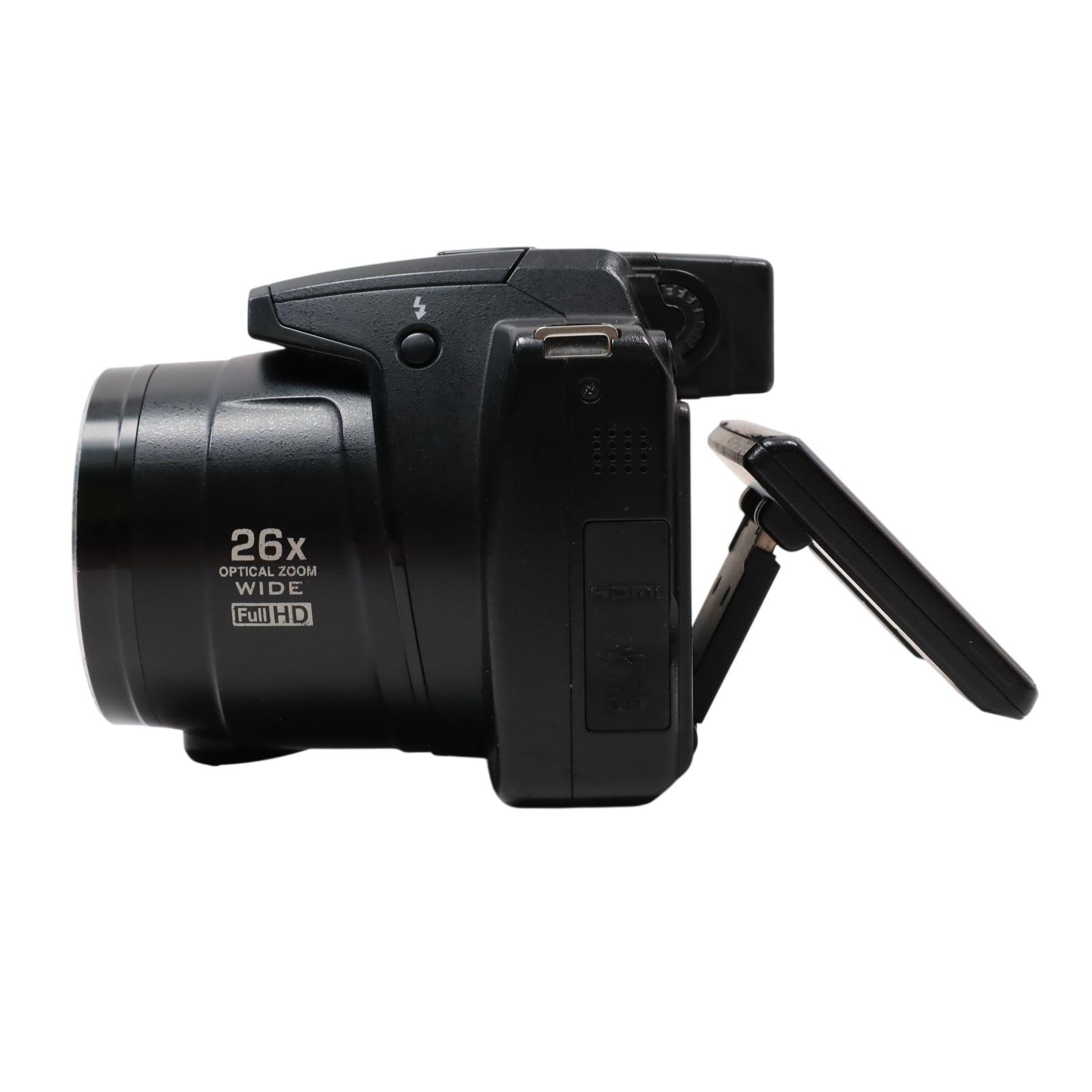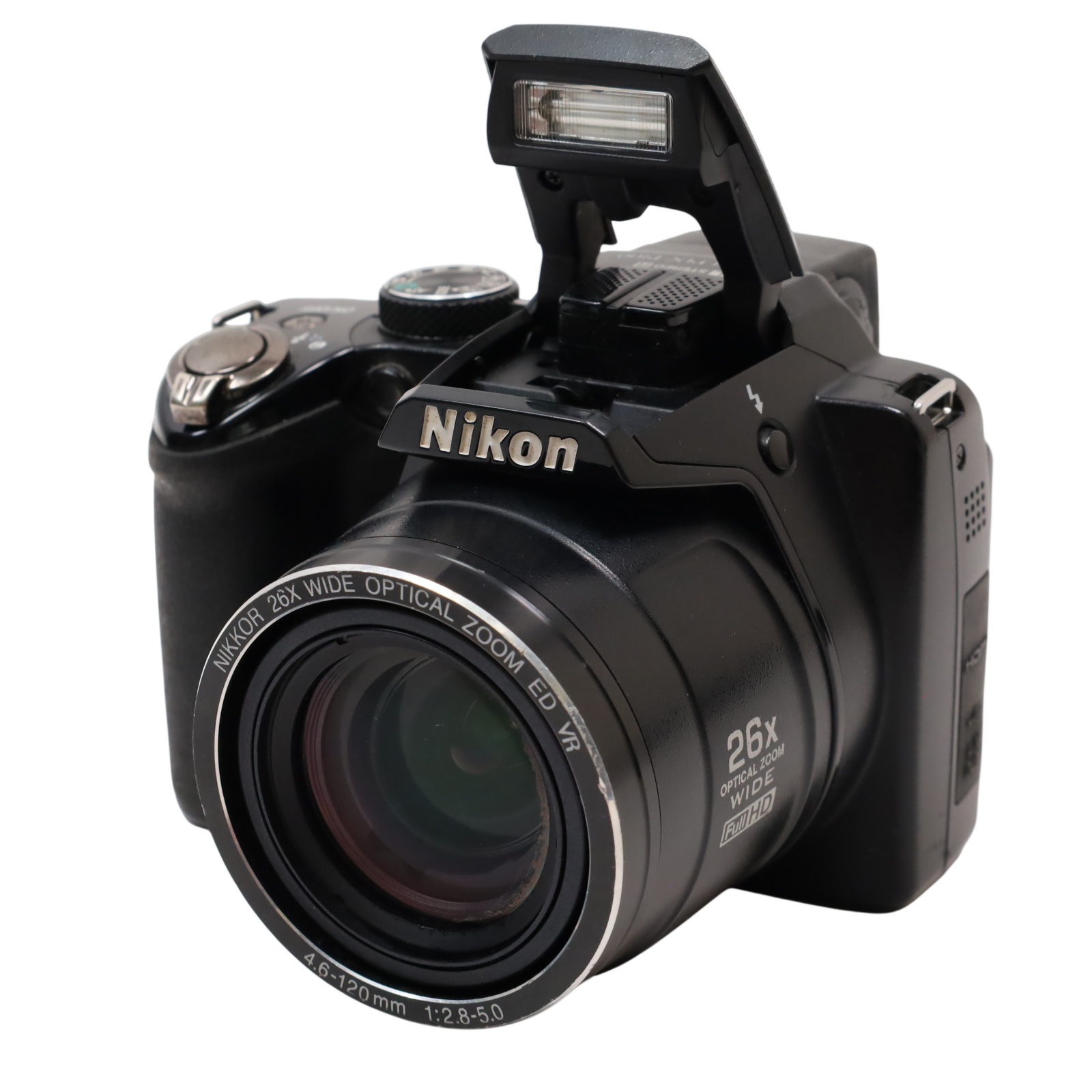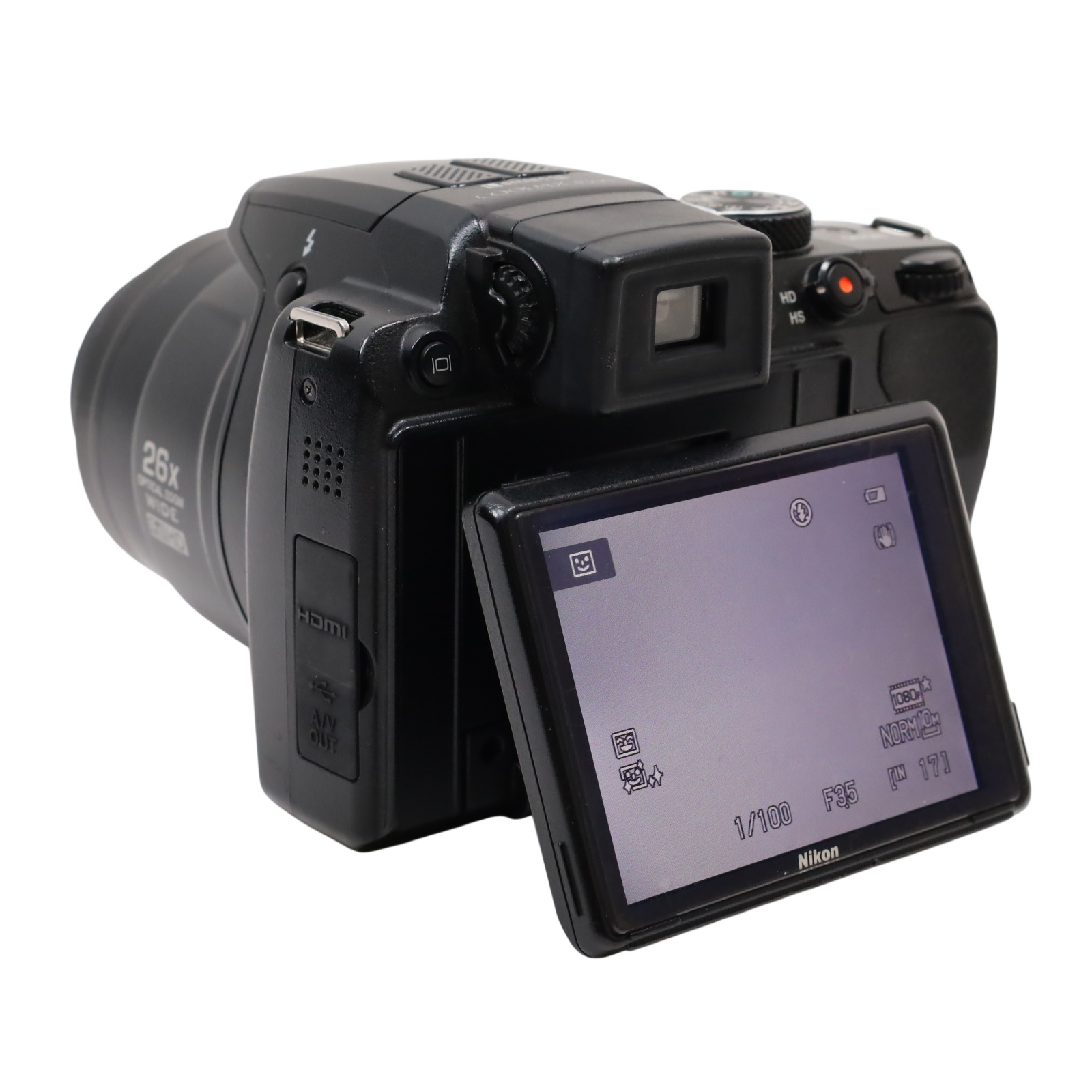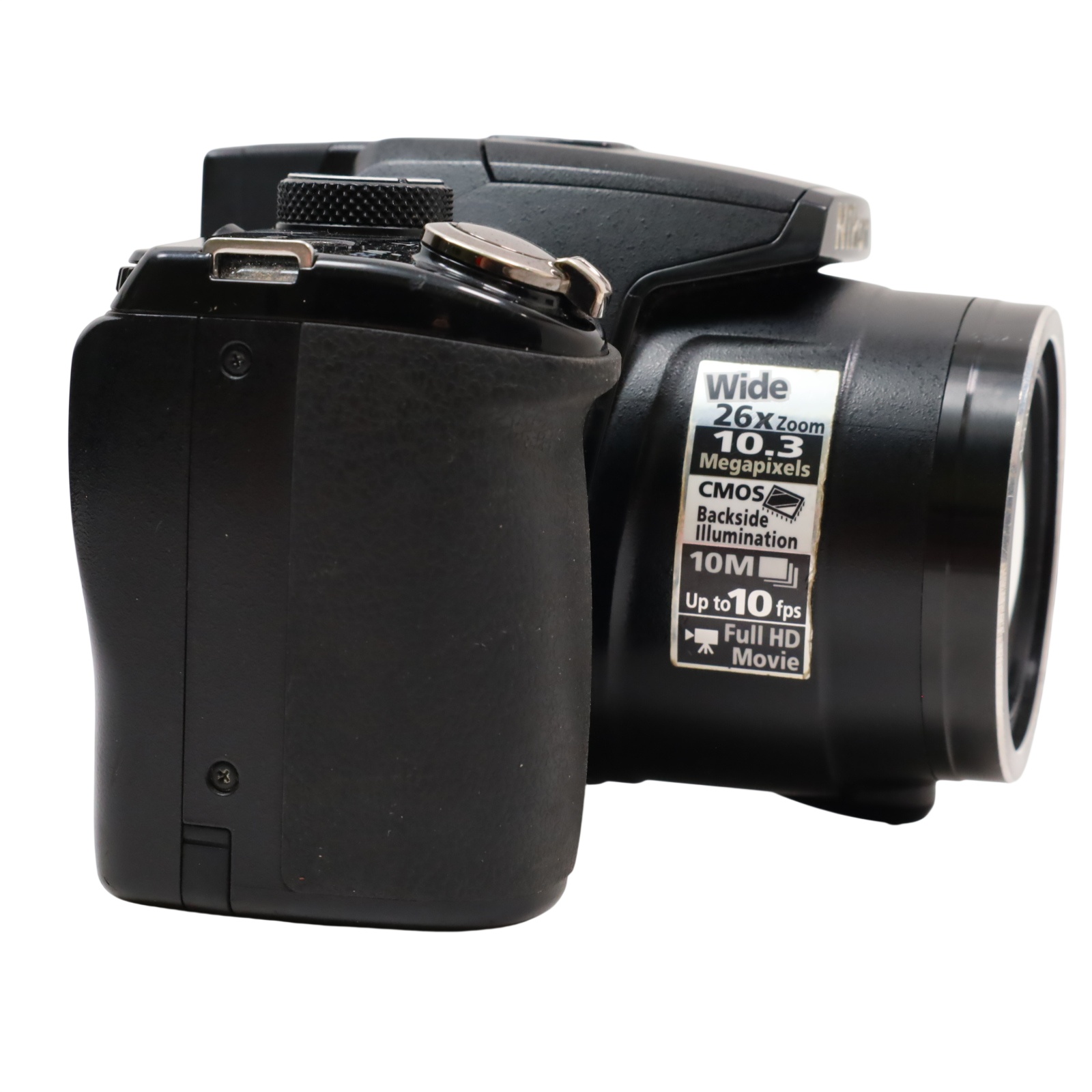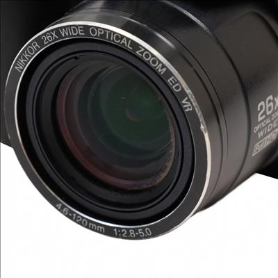 A bridge-style digital camera featuring a 10.3-megapixel backside-illuminated CMOS sensor and a zoom lens with an equivalent focal range of 26mm to 678mm. Continuous shooting speeds reach up to 10 frames per second at full resolution, with the ability to capture approximately 120 frames per second at reduced resolution for motion subjects. Video recording supports full 1080p HD at 30 fps with stereo sound and provides an HDMI output for external display. Image composition is facilitated by a 3.0-inch LCD displaying 460,000 dots, accompanied by an optical viewfinder. The unit incorporates a vibration reduction stabilization system utilizing sensor shift and motion detection to reduce shake, supporting ISO sensitivities up to 3200 at full resolution. Shooting controls include Program, Aperture Priority, Shutter Priority, and Manual exposure modes. Additional functions cover Backlit Scene HDR processing, macro focusing distances as close as 0.4 inches, and automated image selection tools.