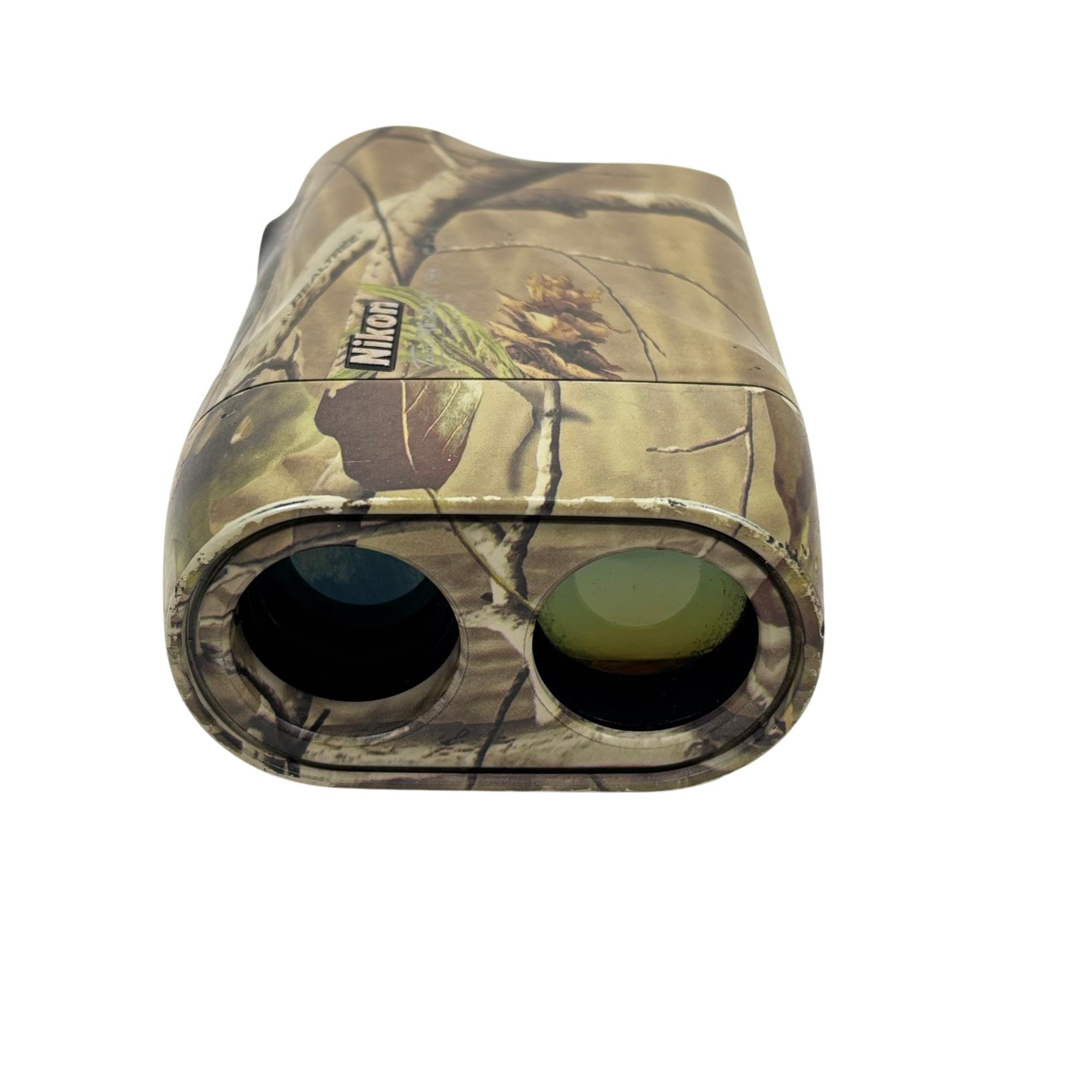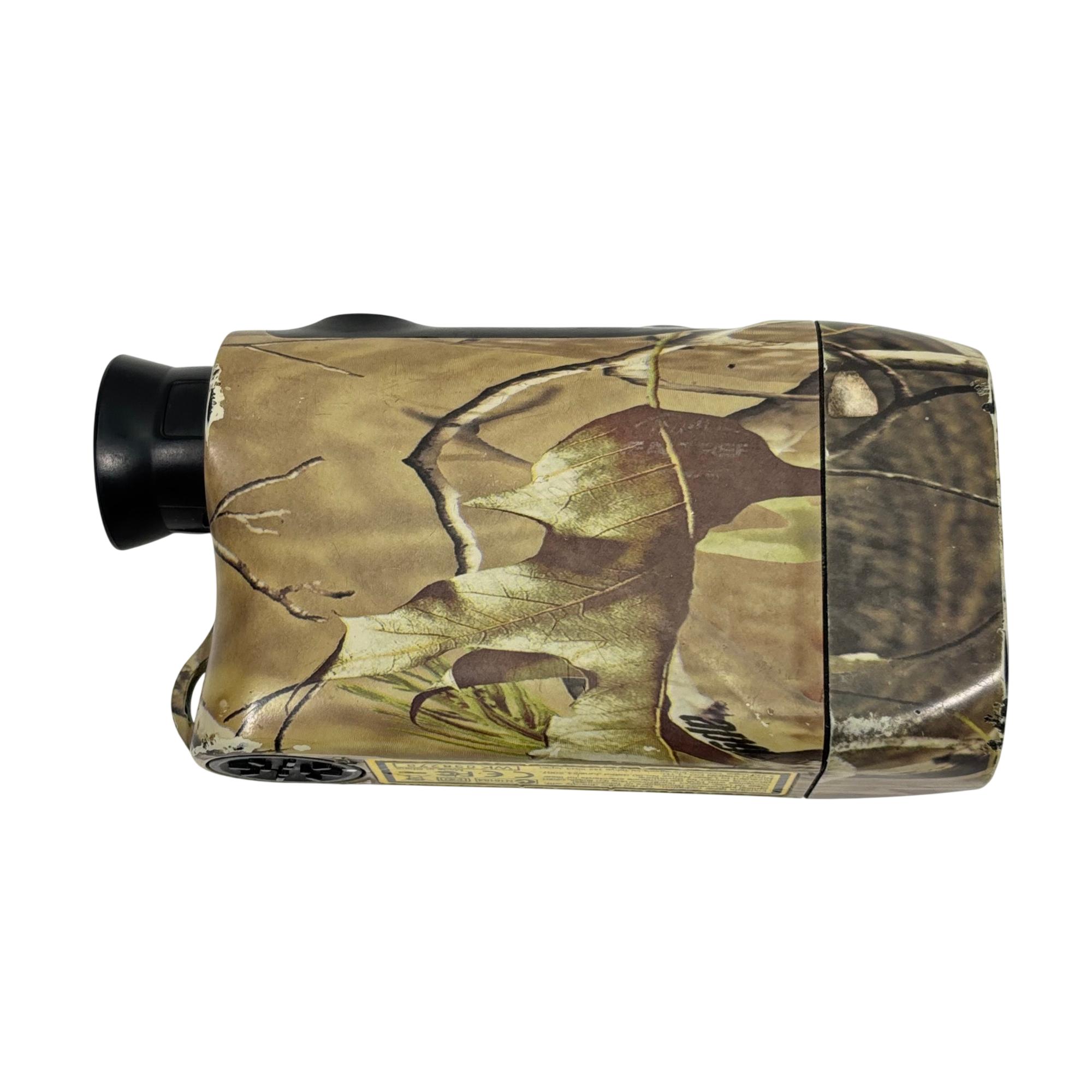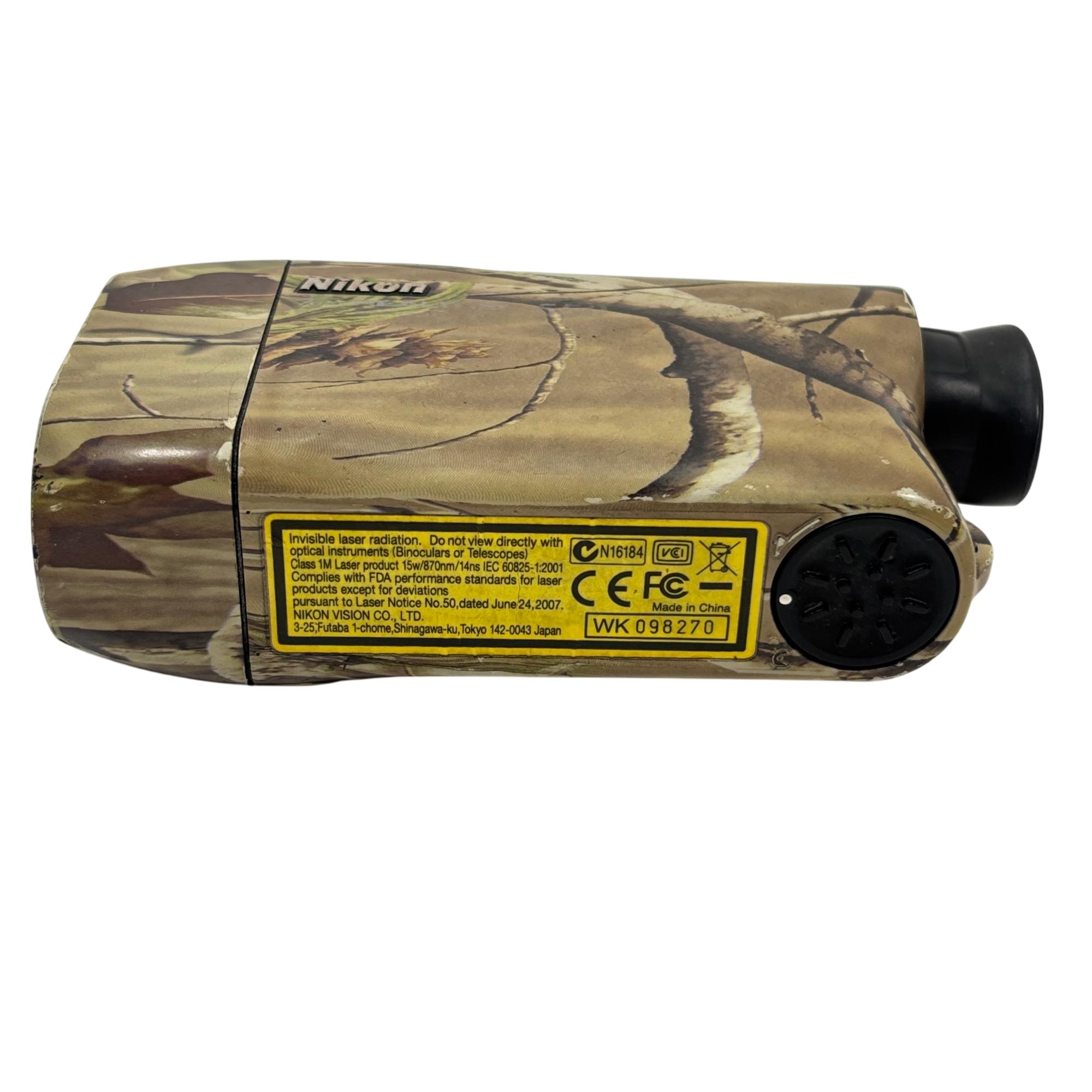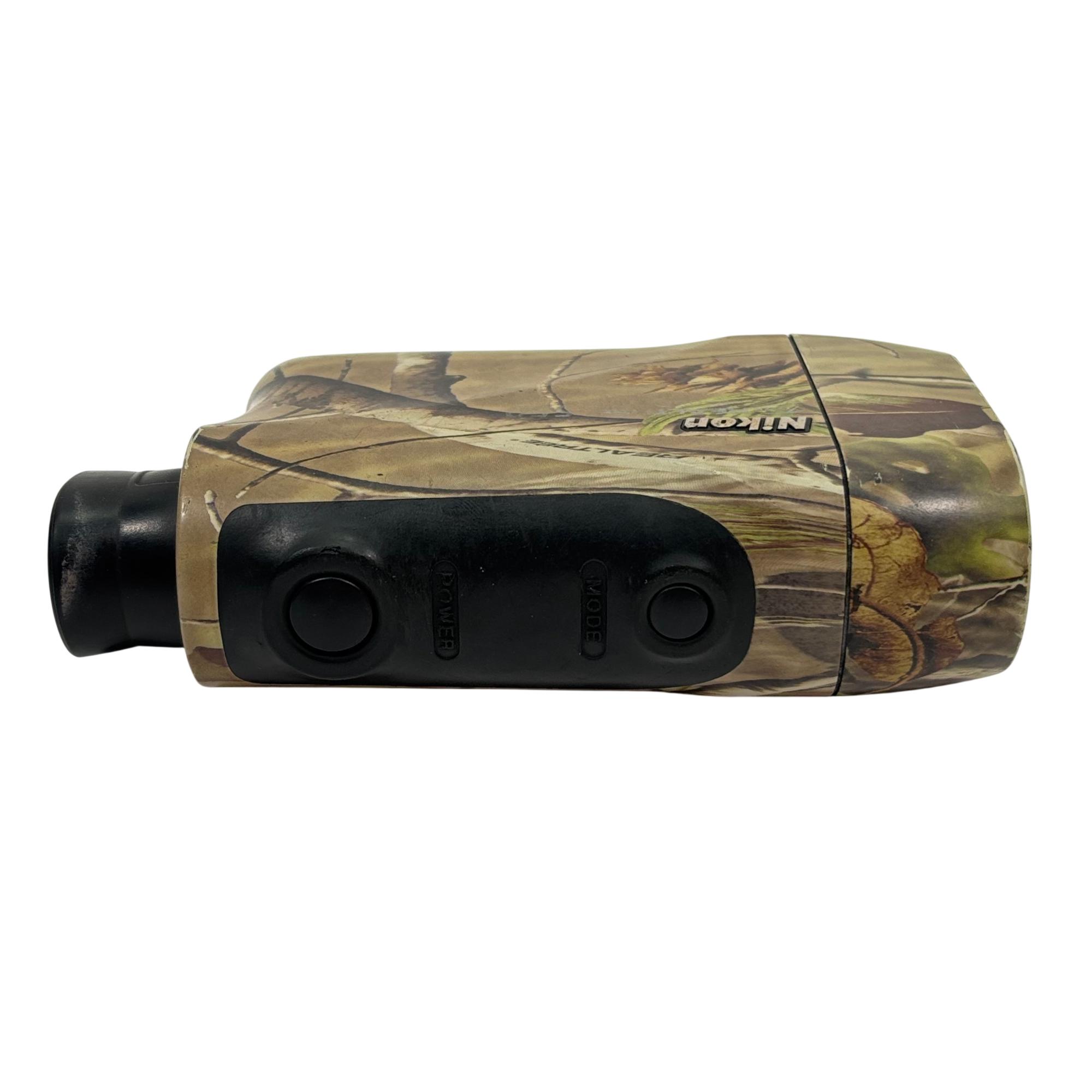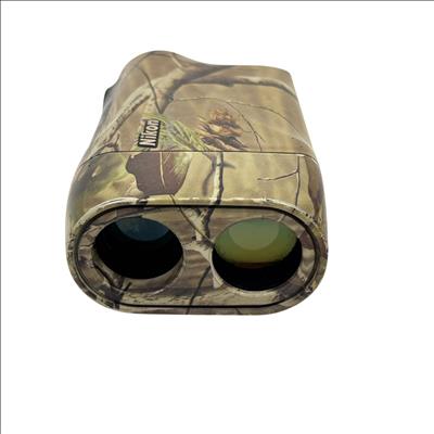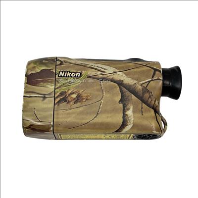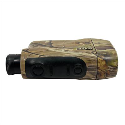 The Nikon Team REALTREE 550 Laser Rangefinder is a waterproof and fogproof "vertical" style rangefinder intended for use primarily by hunters. It offers distance measurement ranging of up to 550 yards (or 500 meters) depending upon lighting conditions and the target's natural reflectivity, and uses a distance priority target system so that if you're ensconced in brush it will ignore these foreground targets and display the distance of the further recognized object. The REALTREE 550's streamlined shape, comfortable 6x magnification, and compact 21mm objective diameter allow it to be easily carried and operated with a single hand. A practical choice for a hunting rangefinder made by a quality sport optics company.