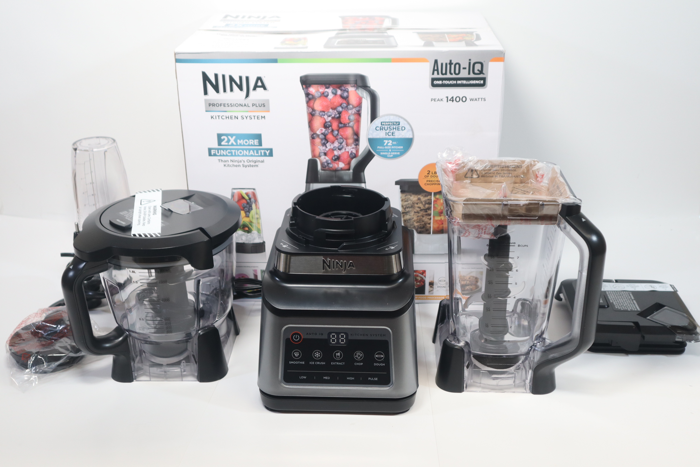 The Ninja Professional Plus Kitchen System with Auto-iQ features a new modern design and more functionality than Ninja's original Professional Kitchen System. Ninja Total Crushing Blades and Pro Extractor Blades Assembly give you perfectly crushed ice for your smoothies, frozen drinks, and nutrient extractions. The 72 oz. Total Crushing Pitcher is great for making large batches for the whole family with 1400 peak watts of professional power. Plus, its single-serve cup with spout lid makes it easy to take delicious, nutrient-rich smoothies on the go. But don’t just stop at drinks—the 64 oz. processor bowl provides precision processing for even chopping, smooth purees, and up to 2 lbs. of dough. Auto-iQ Technology provides preset programs that do the work for you, no guesswork required.