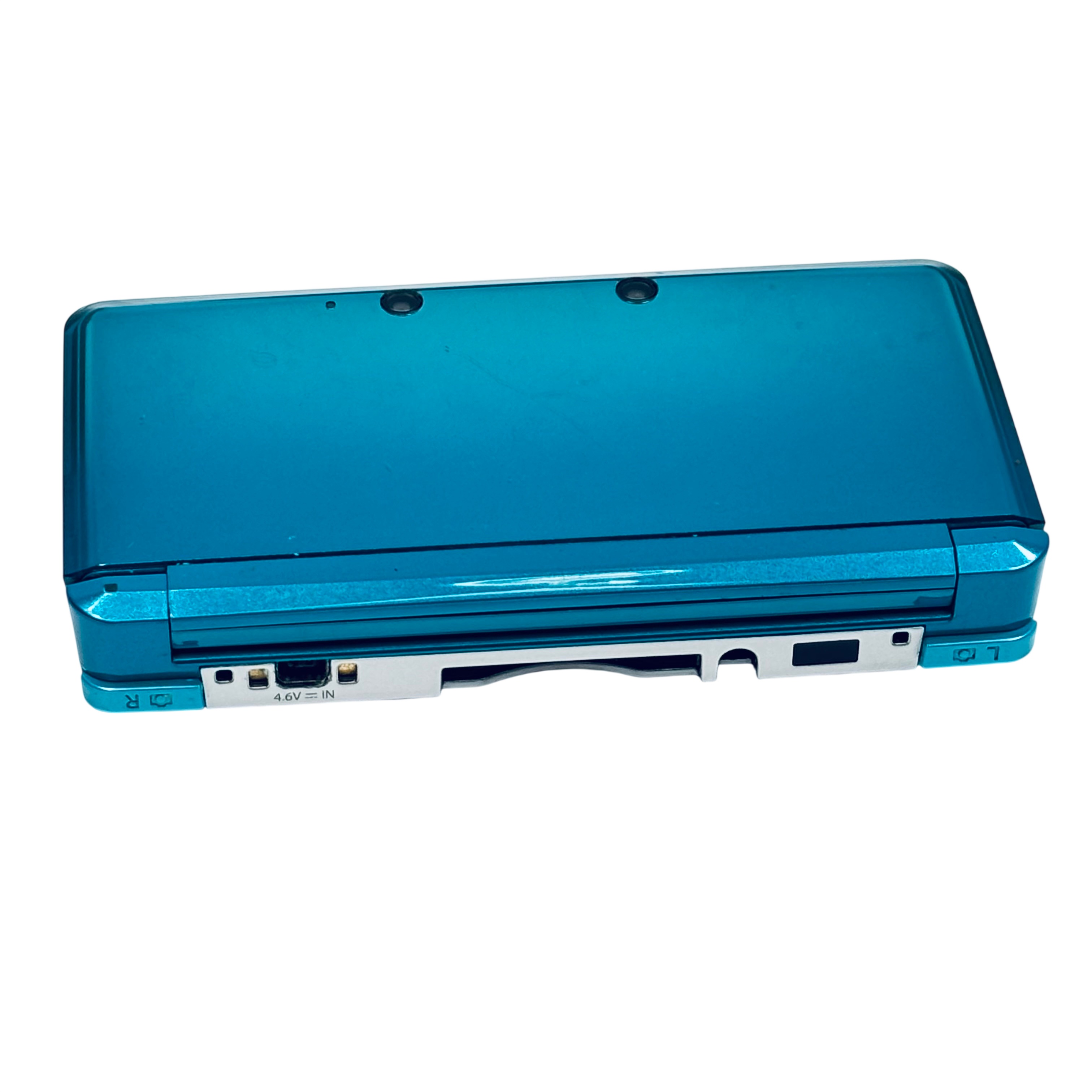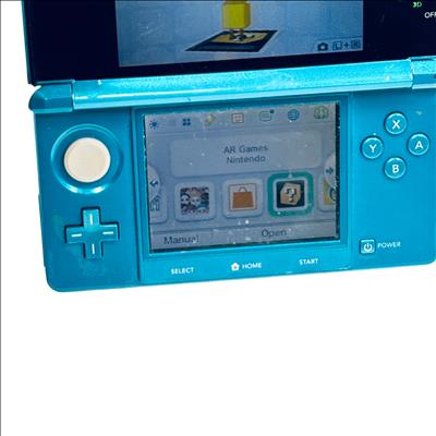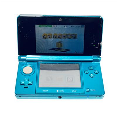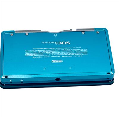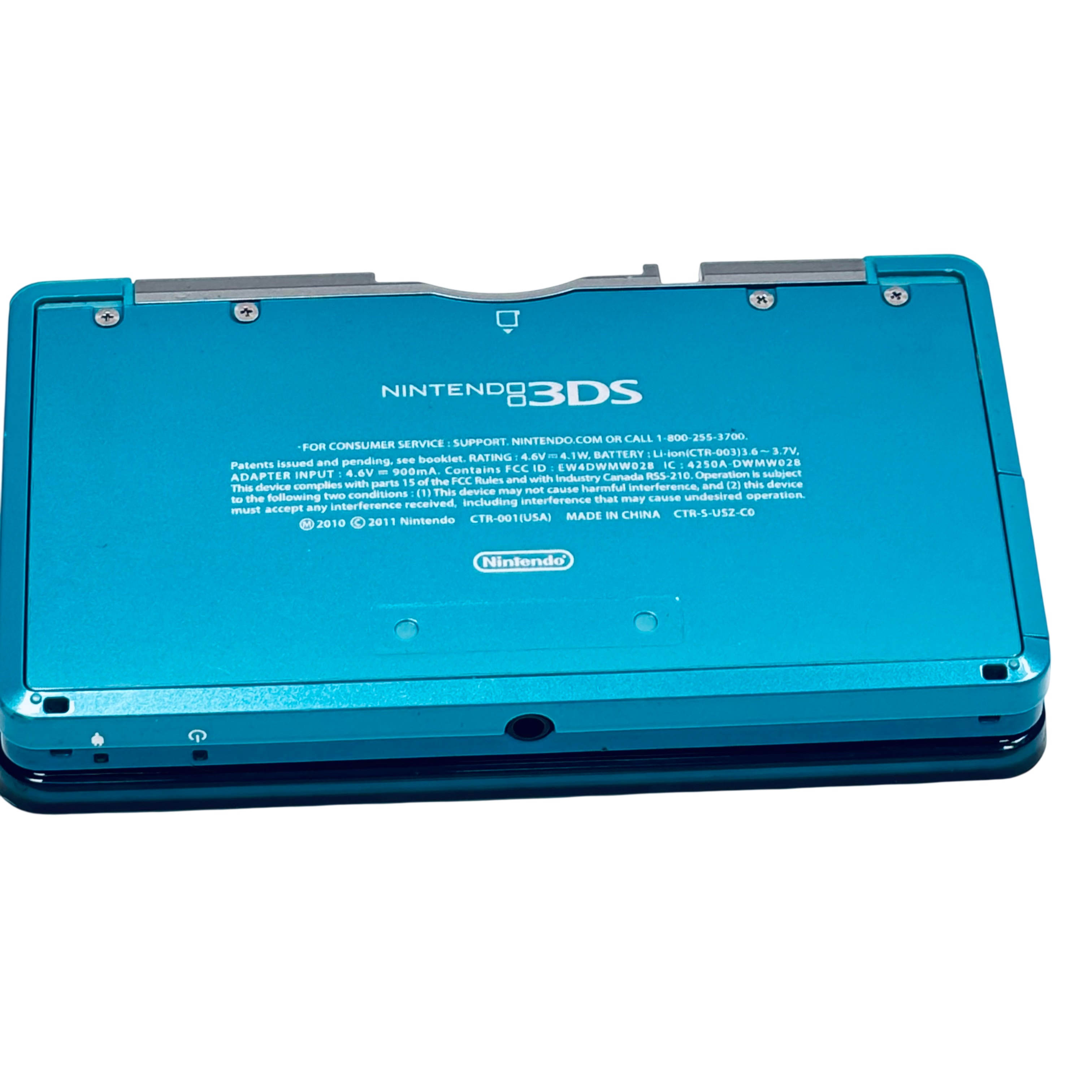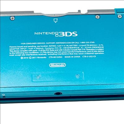 Nintendo CTR-001 Teal Nintendo 3DS System is a portable handheld gaming console featuring dual screens with a 3D stereoscopic top display and a touch-sensitive bottom screen. This model includes built-in Wi-Fi connectivity, support for AR Games, and uses a rechargeable lithium-ion battery with a 4.6V adapter input. The teal-colored console comes with a charger and a protective carrying case, making it ideal for gaming on the go. Compact and lightweight, it measures approximately 5.31 inches in length, 3.54 inches in width, and 0.94 inches in height, weighing just 0.35 pounds.