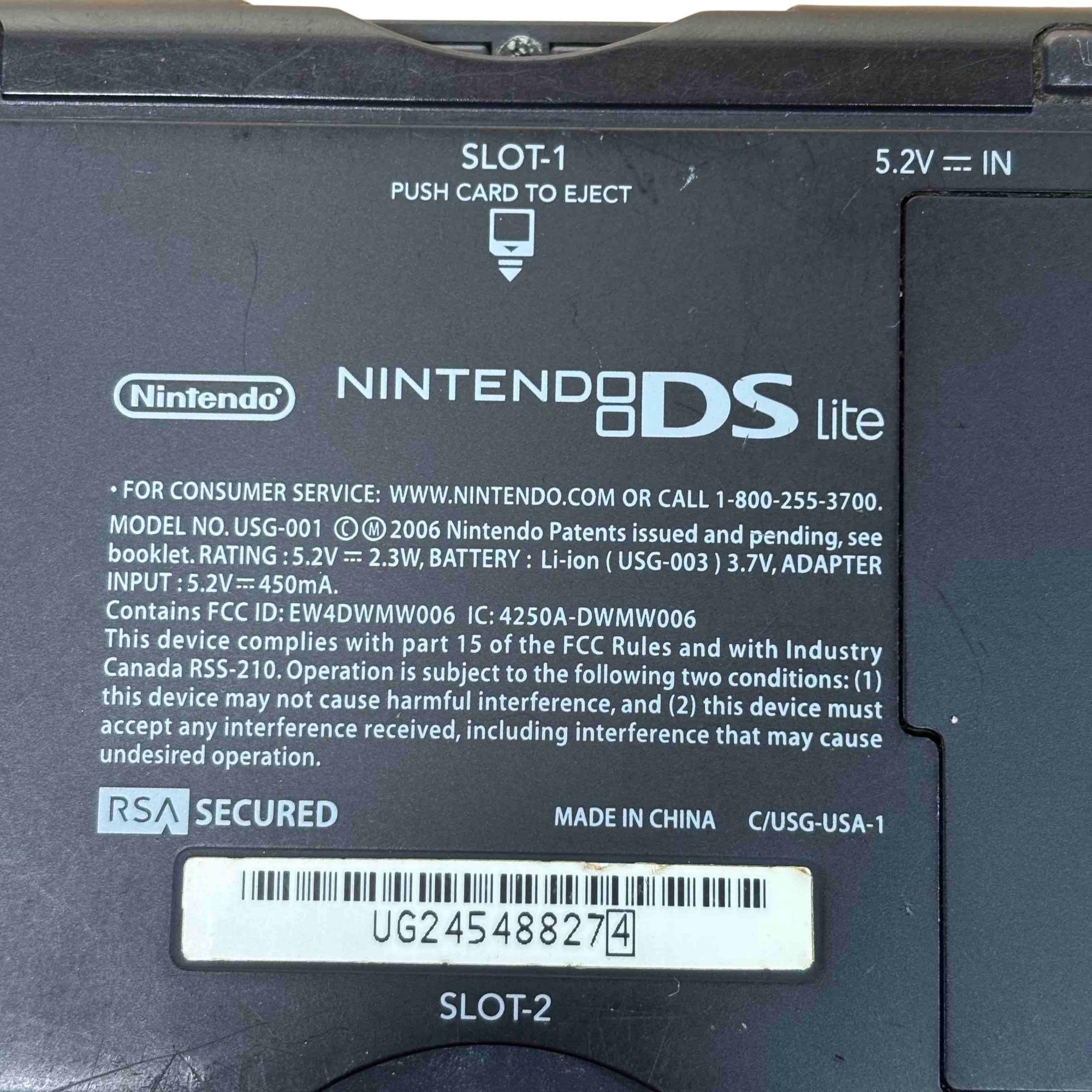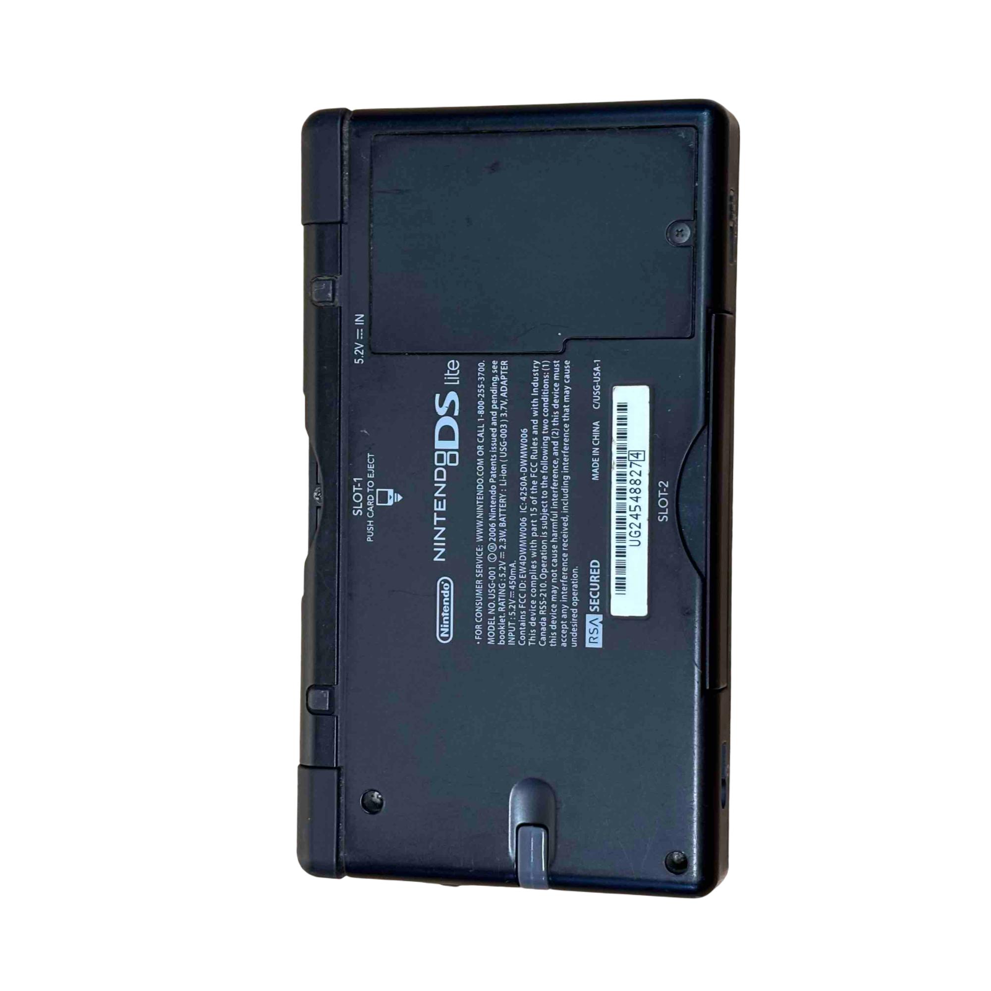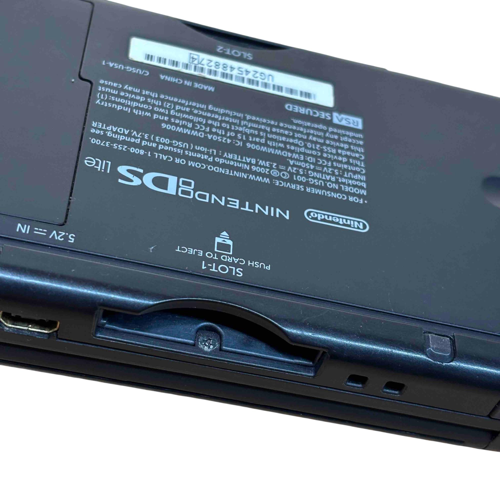 The Nintendo DS Lite (USG-001) is a handheld game console featuring dual 3-inch screens with a resolution of 256x192 pixels each. It is powered by dual processors (67 MHz ARM946E-S and 33 MHz ARM7TDMI) and has 4 MB of PSRAM. The console includes a touch screen, microphone, and wireless connectivity for multiplayer gaming. It measures 133mm wide, 73.9mm tall, and 21.5mm deep, and weighs approximately 218 grams.