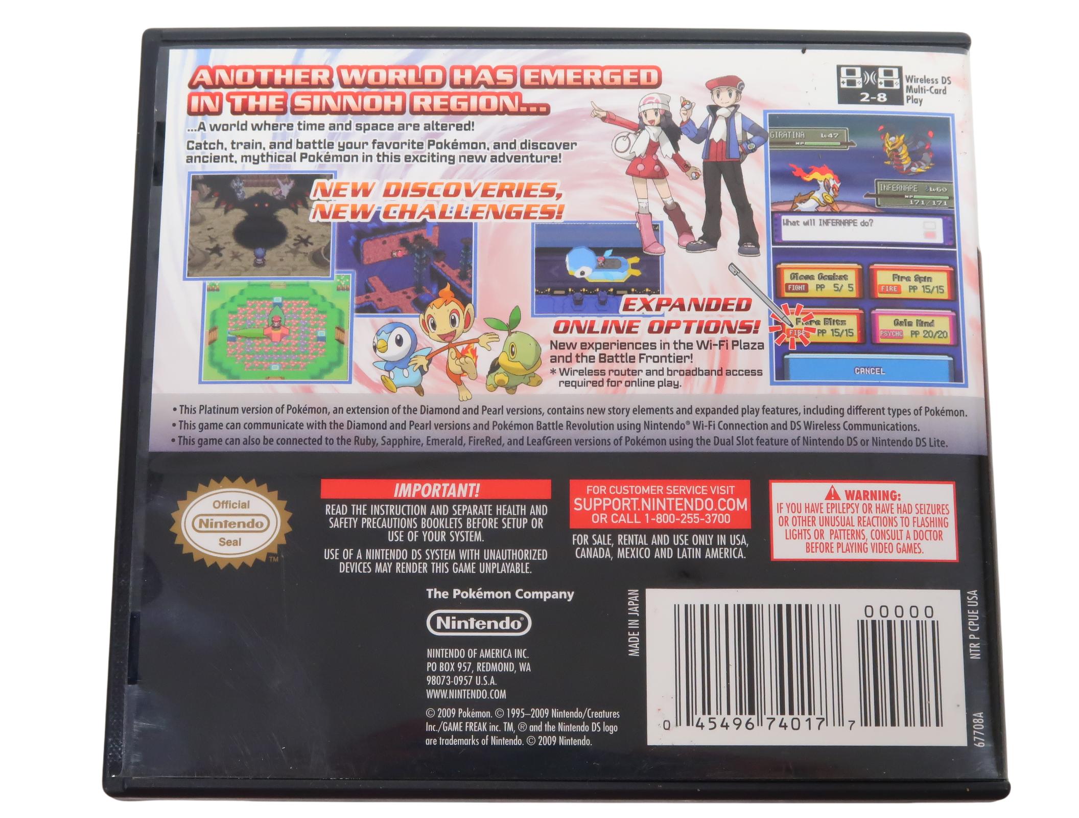 Pokémon Platinum features a new story full of adventure, never-before-seen forms of powerful Pokémon--including the legendary Giratina’s Origin Forme--and the Distortion World, a mysterious new world that suddenly appears in the Sinnoh region. In addition, with Pokémon Platinum up to 20 players can interact with other Pokémon fans from around the world in the new Wi-Fi Plaza, featuring mini-games and activities. Players can also enjoy the new features in the Global Terminal, such as posting battle videos using the new “Vs. Recorder.” In addition, Pokémon Platinum features a new Battle Frontier, where the toughest Trainers can test their skills in new ways.