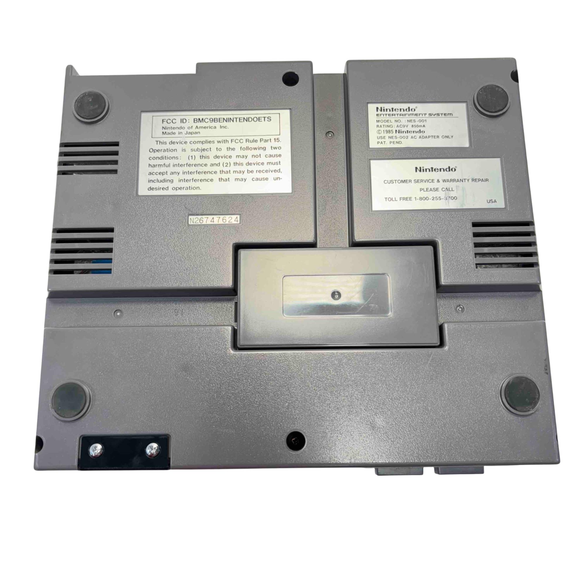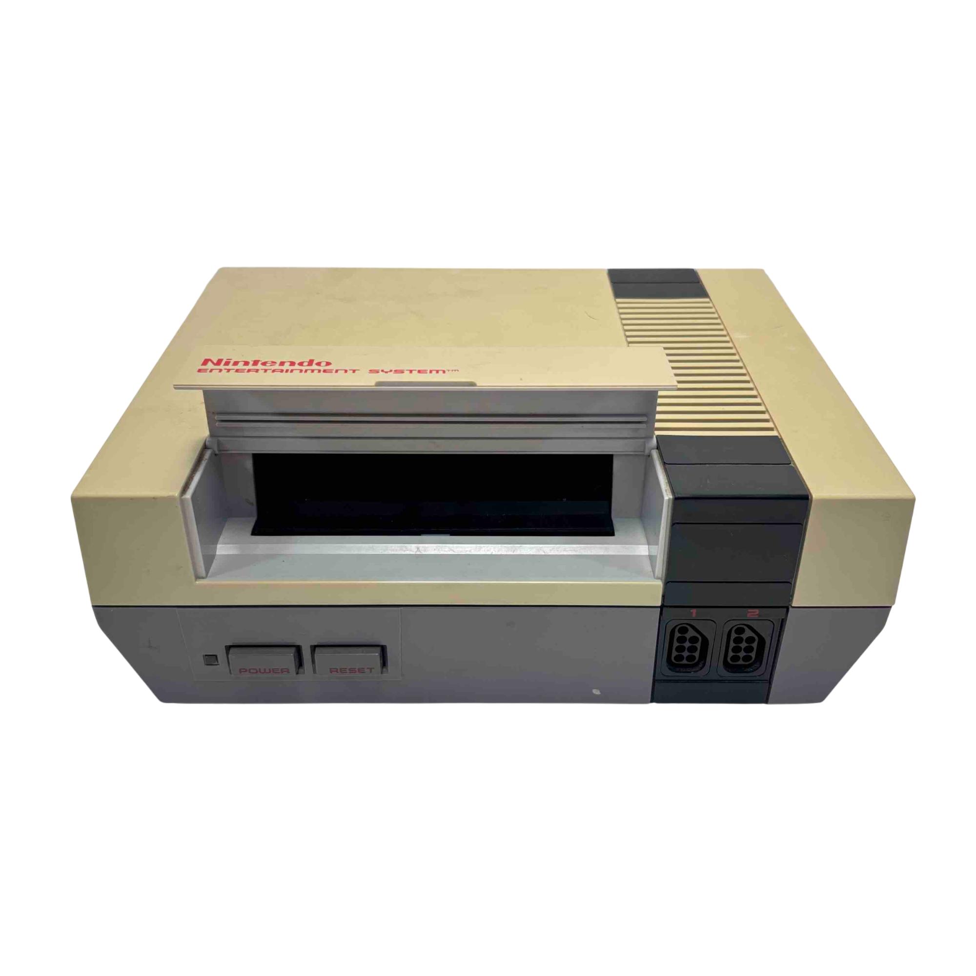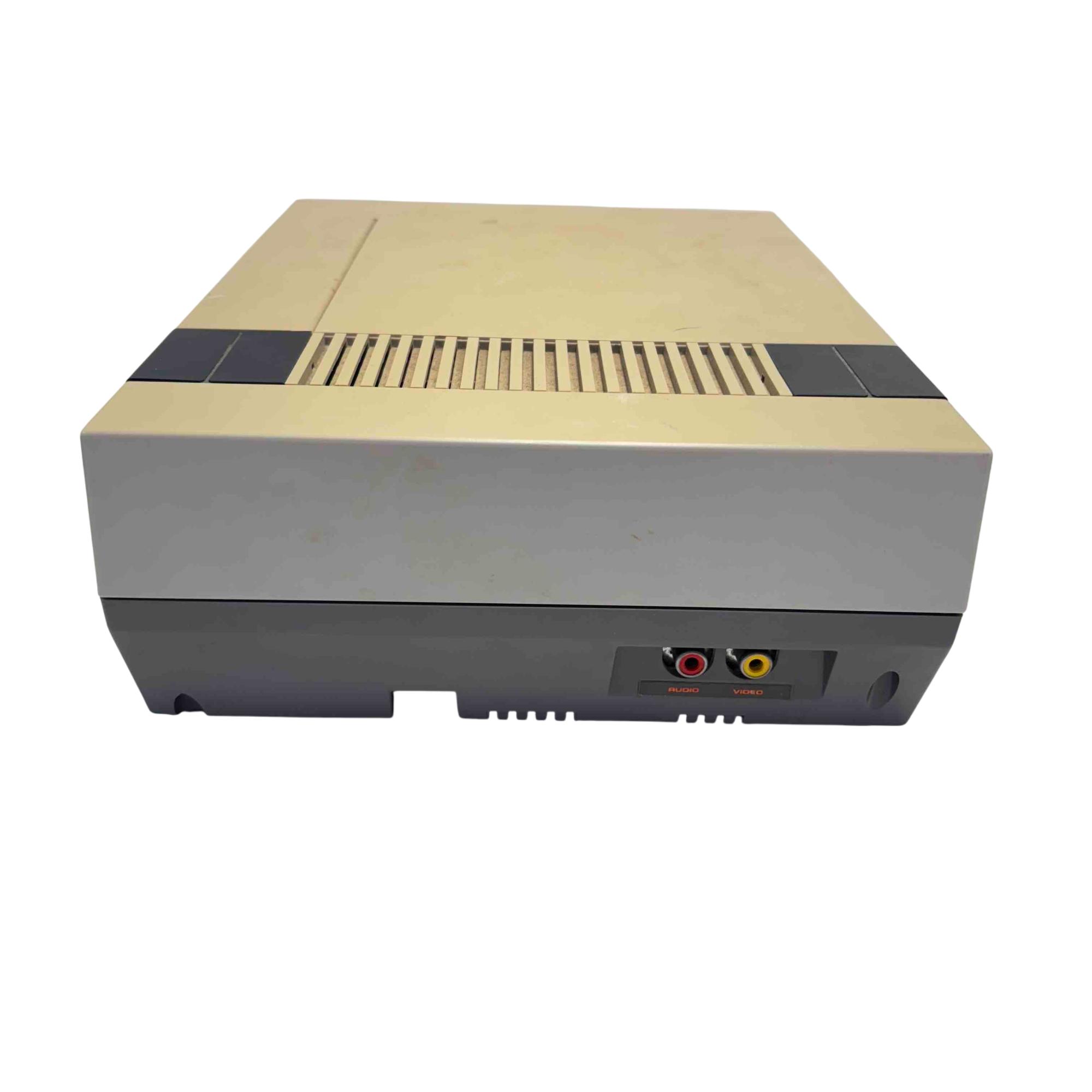 Nintendo Entertainment System NES-001 Console (Original NES, 1985) with 2 Controllers and Cables is a classic rectangular video game console featuring a black and grey base with a front-loading cartridge slot. This vintage gaming system includes two wired controllers and all necessary cables for connection, making it an ideal choice for retro gaming enthusiasts. Designed for authentic 8-bit gameplay, this iconic Nintendo console remains a sought-after collectors item.